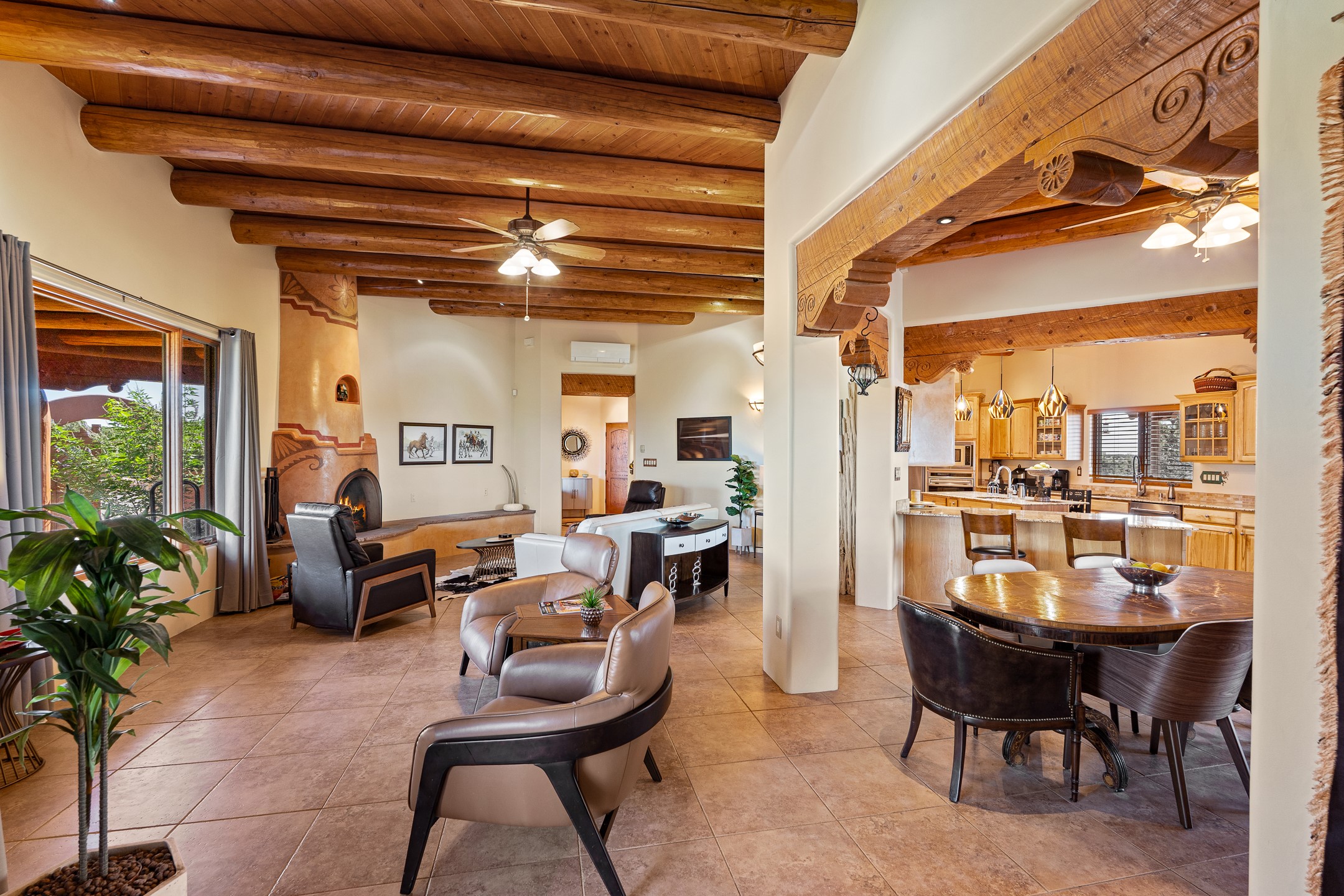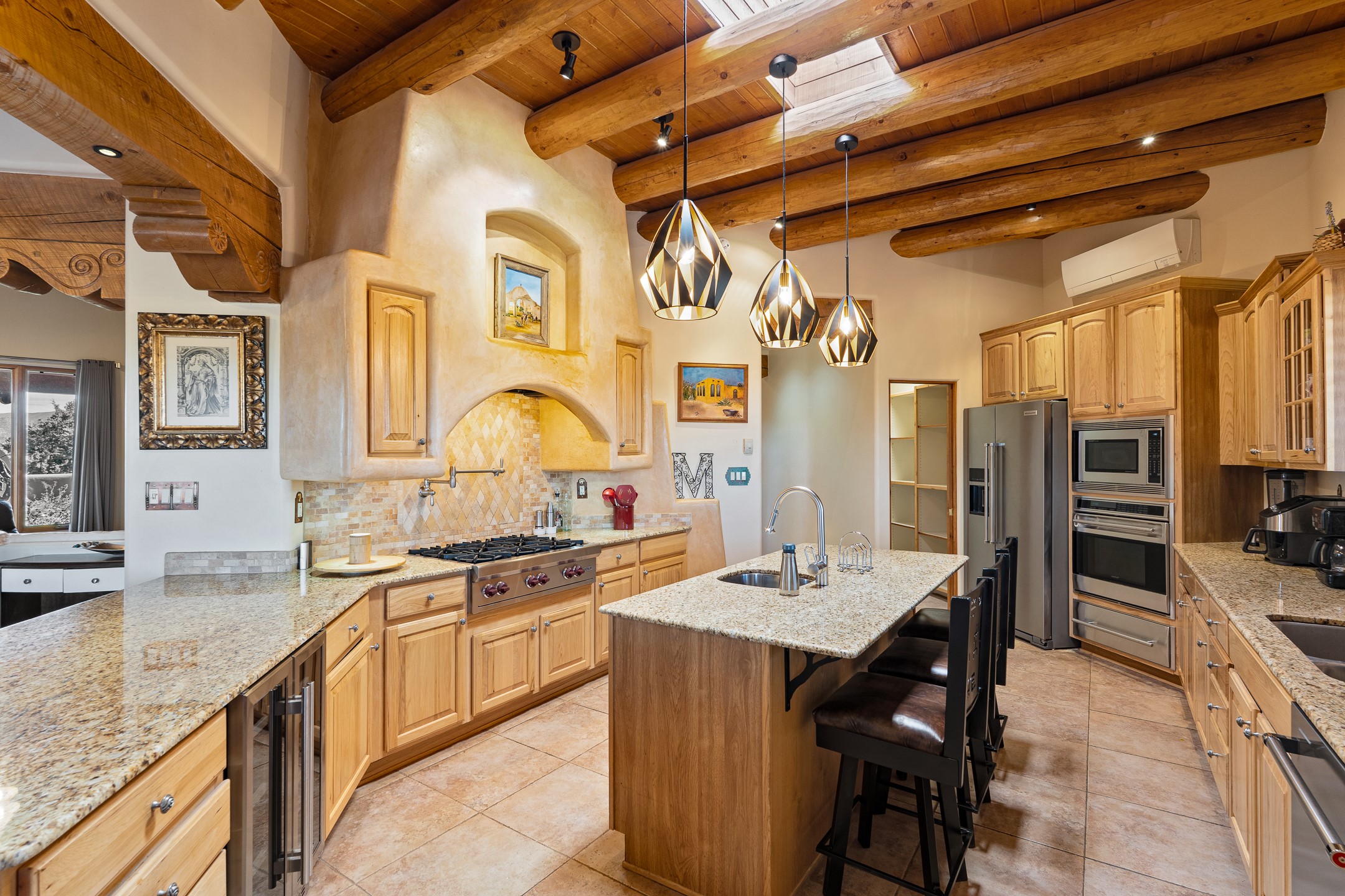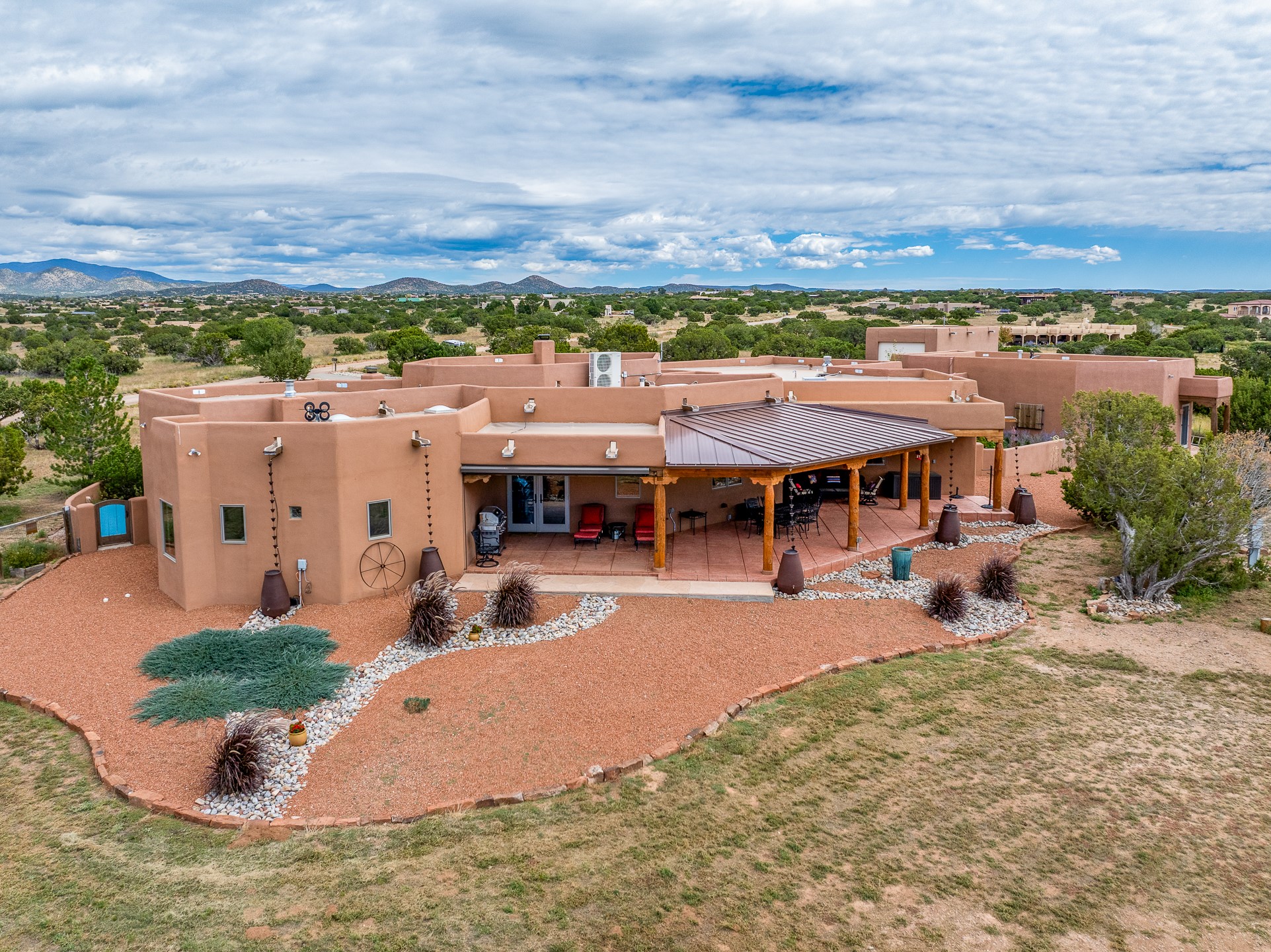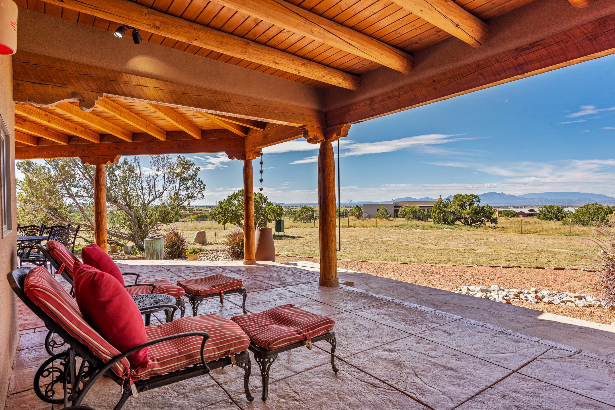 Wishing for a HOUSE/GUESTHOUSE/and a 5-CAR GARAGE with an additional RV GARAGE on 5 acres? Your wish has been granted! Just 20 minutes from downtown Santa Fe, this beautifully sited single-level property offers sweeping mountain views, abundant garage space, and classic regional charm. The 5-acre parcel (with acre fenced) includes a 2,548 sq. ft. 3BD/2.5BA main residence and a connected 698 sq. ft. 1BD/1BA guest house--ideal for guests and flexible use.The property features an attached/heated 3-car garage, an attached 2-car garage (connected to the guest house), and a heated/cooled RV garage, perfect for a hobbyist, car enthusiast or artist! The main residence captures expansive views of the Sangre de Cristo, Jemez, and Ortiz mountain ranges from a deep East-facing portal and a new 900 sq. ft. West-facing portal. The living room features a custom plastered and hand-painted kiva fireplace and beautifully hand-carved corbels. The kitchen is outfitted with granite countertops, a 6-burner Wolf range with a potfiller, two ovens (one convection microwave), warming drawer, a KitchenAid refrigerator, and an extra dual temp beverage refrigerator. The kitchen island has a second sink and seating for three. The breakfast bar with seating for 2 or 3 persons, creates an open flow to the dining area. The private primary suite enjoys a sitting area, east portal access, two walk-in closets, a soaking tub beside a gas fireplace, and a walk-in shower. The 2 guest bedrooms share a bathroom and have excellent separation from the main living areas. A breezeway connects the guest house, which enjoys its own patio and a beautifully maintained vegetable garden--perfect for those wanting to grow fresh greens. Additional features include in-floor radiant heating, natural gas, 8 mini-splits, Eldorado community water. Horses are also allowed. A rare opportunity for peaceful country living with city conveniences--this home blends beauty, functionality, and flexibility in one stunning package.