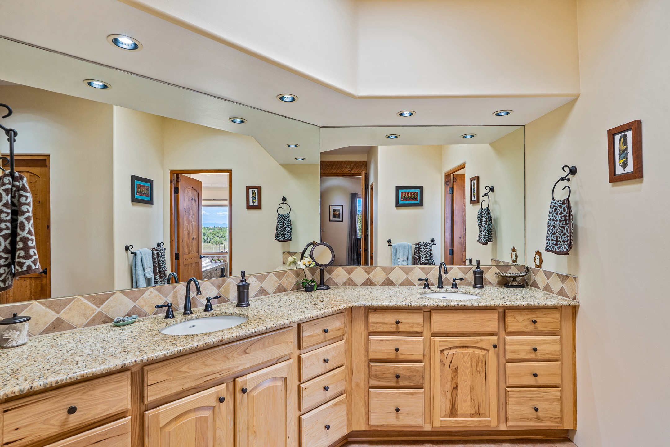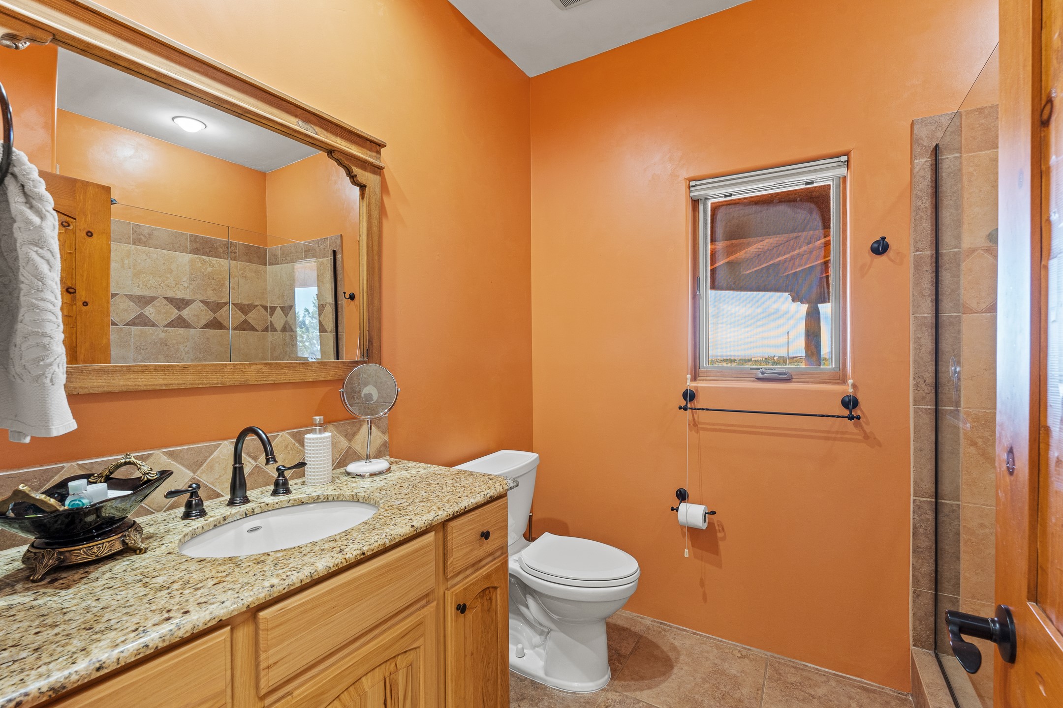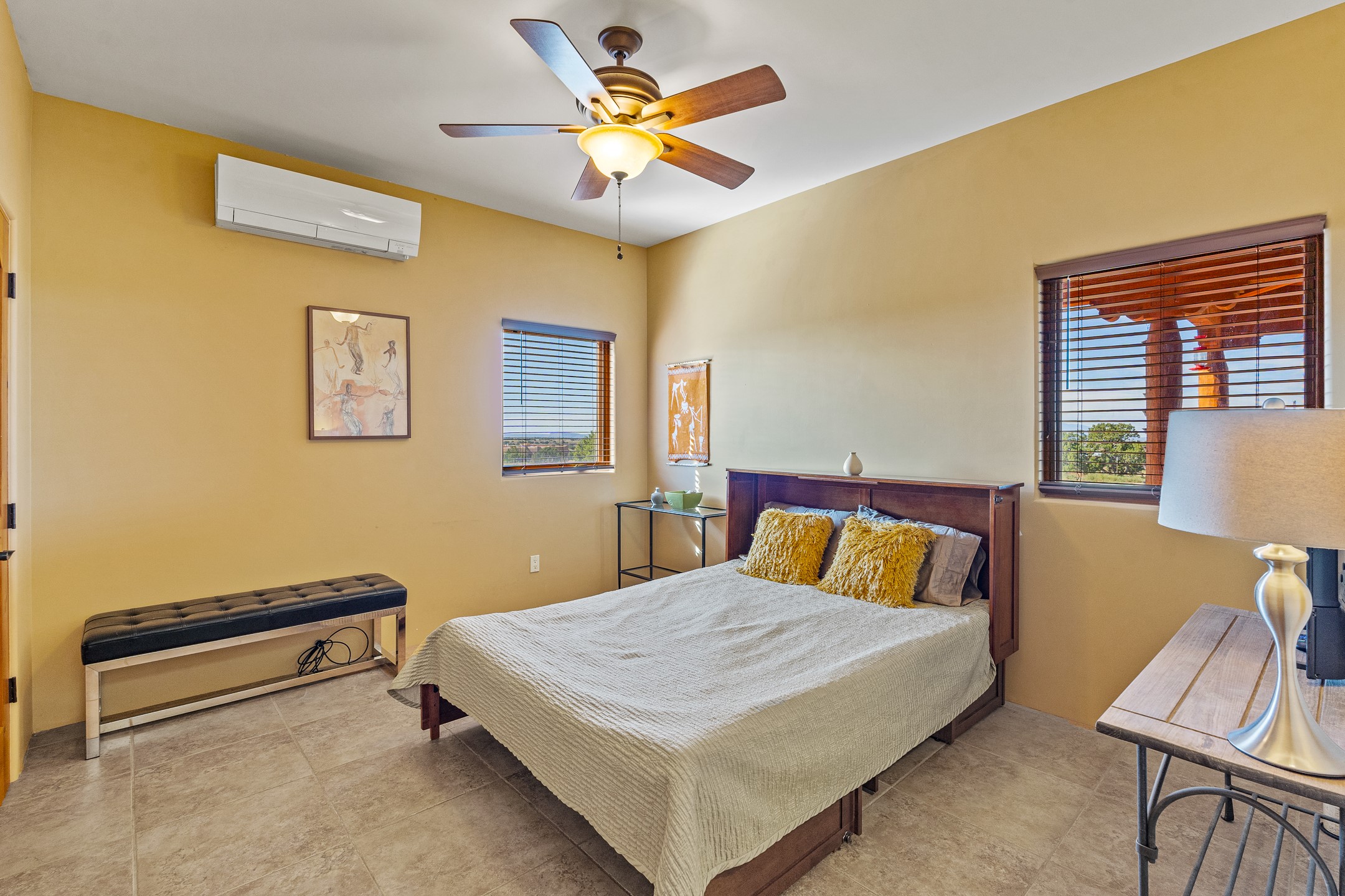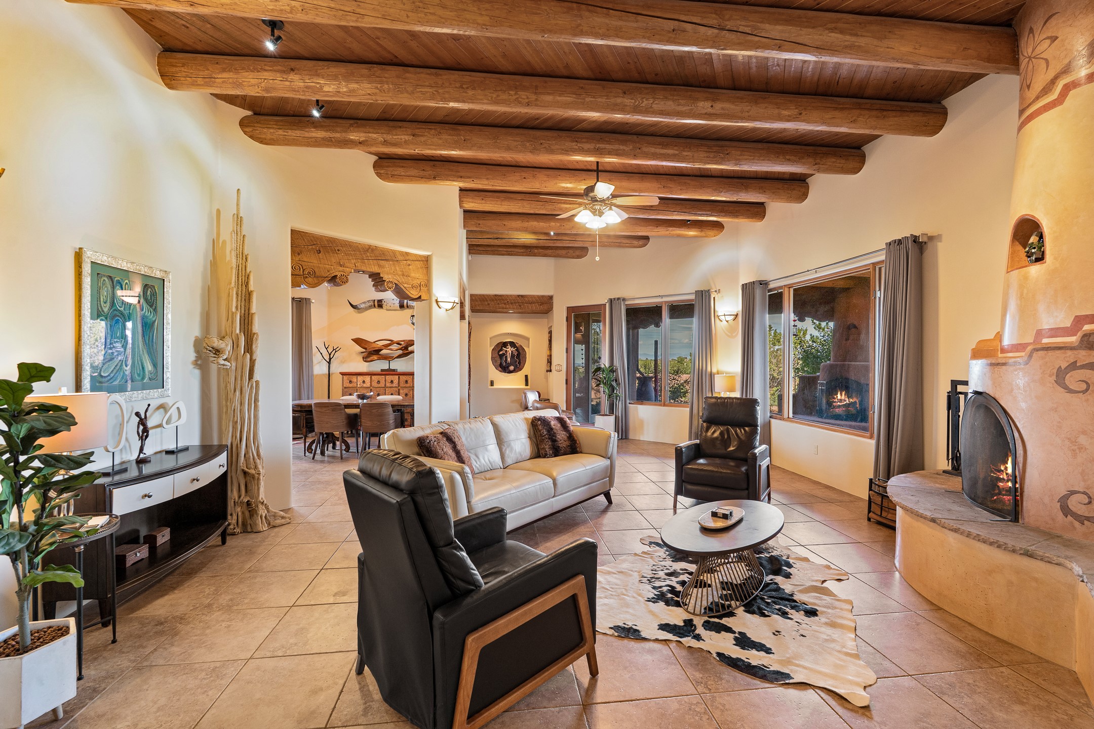 Wishing for a HOUSE/GUESTHOUSE/and a 5-CAR GARAGE with an additional RV GARAGE on 5 acres? Your wish has been granted! Just 20 minutes from downtown Santa Fe, this beautifully sited single-level property offers sweeping mountain views, abundant garage space, and classic regional charm. The 5-acre parcel (with acre fenced) includes a 2,548 sq. ft. 3BD/2.5BA main residence and a connected 698 sq. ft. 1BD/1BA guest house--ideal for guests and flexible use.The property features an attached/heated 3-car garage, an attached 2-car garage (connected to the guest house), and a heated/cooled RV garage, perfect for a hobbyist, car enthusiast or artist! The main residence captures expansive views of the Sangre de Cristo, Jemez, and Ortiz mountain ranges from a deep East-facing portal and a new 900 sq. ft. West-facing portal. The living room features a custom plastered and hand-painted kiva fireplace and beautifully hand-carved corbels. The kitchen is outfitted with granite countertops, a 6-burner Wolf range with a potfiller, two ovens (one convection microwave), warming drawer, a KitchenAid refrigerator, and an extra dual temp beverage refrigerator. The kitchen island has a second sink and seating for three. The breakfast bar with seating for 2 or 3 persons, creates an open flow to the dining area. The private primary suite enjoys a sitting area, east portal access, two walk-in closets, a soaking tub beside a gas fireplace, and a walk-in shower. The 2 guest bedrooms share a bathroom and have excellent separation from the main living areas. A breezeway connects the guest house, which enjoys its own patio and a beautifully maintained vegetable garden--perfect for those wanting to grow fresh greens. Additional features include in-floor radiant heating, natural gas, 8 mini-splits, Eldorado community water. Horses are also allowed. A rare opportunity for peaceful country living with city conveniences--this home blends beauty, functionality, and flexibility in one stunning package.