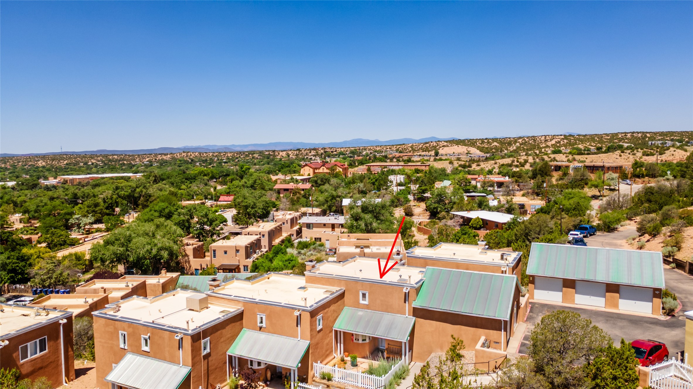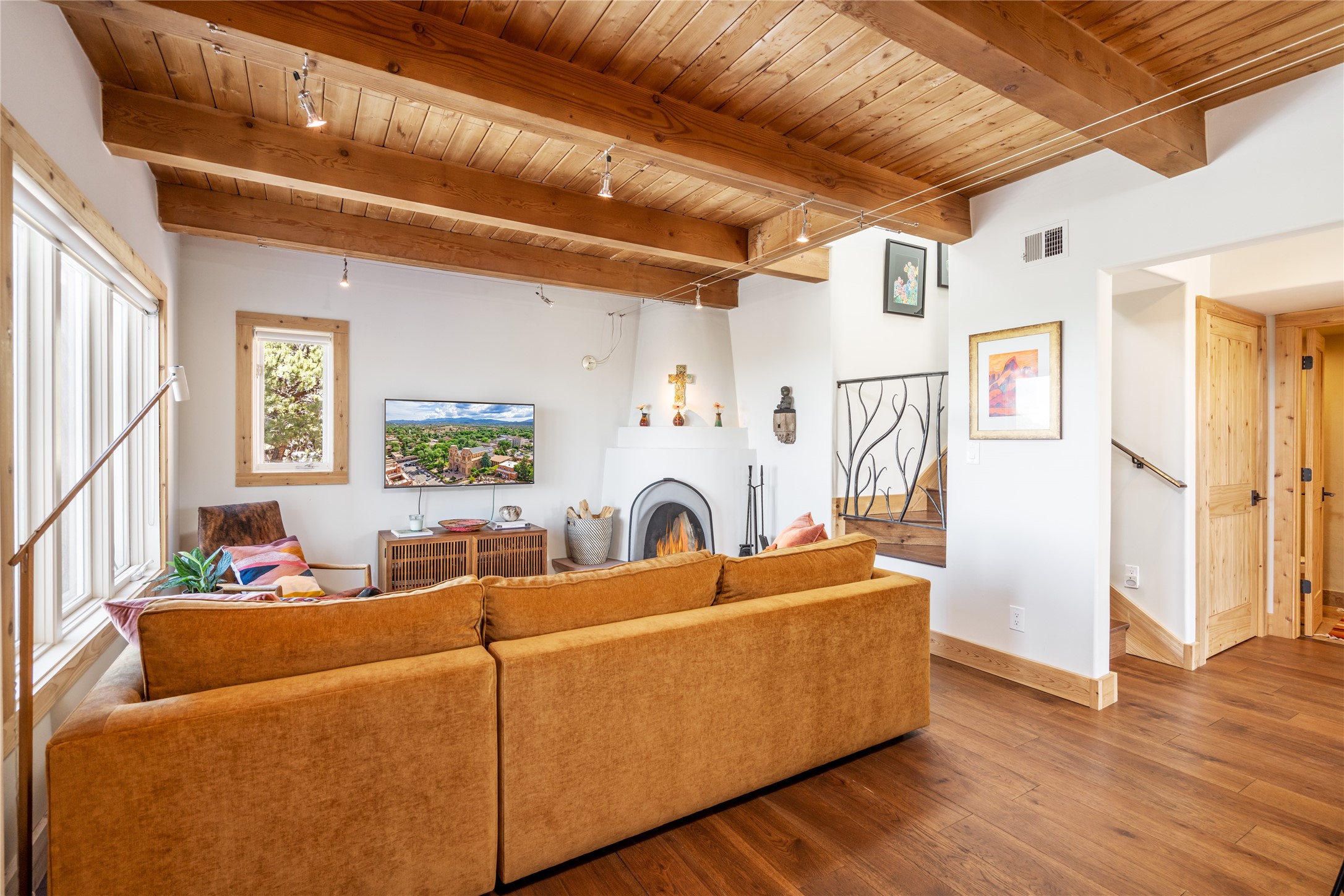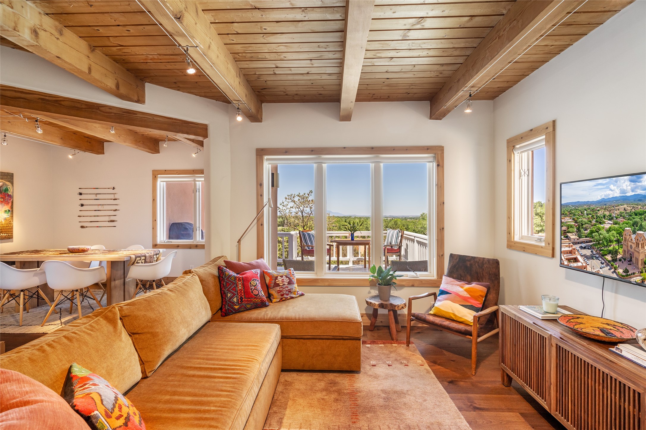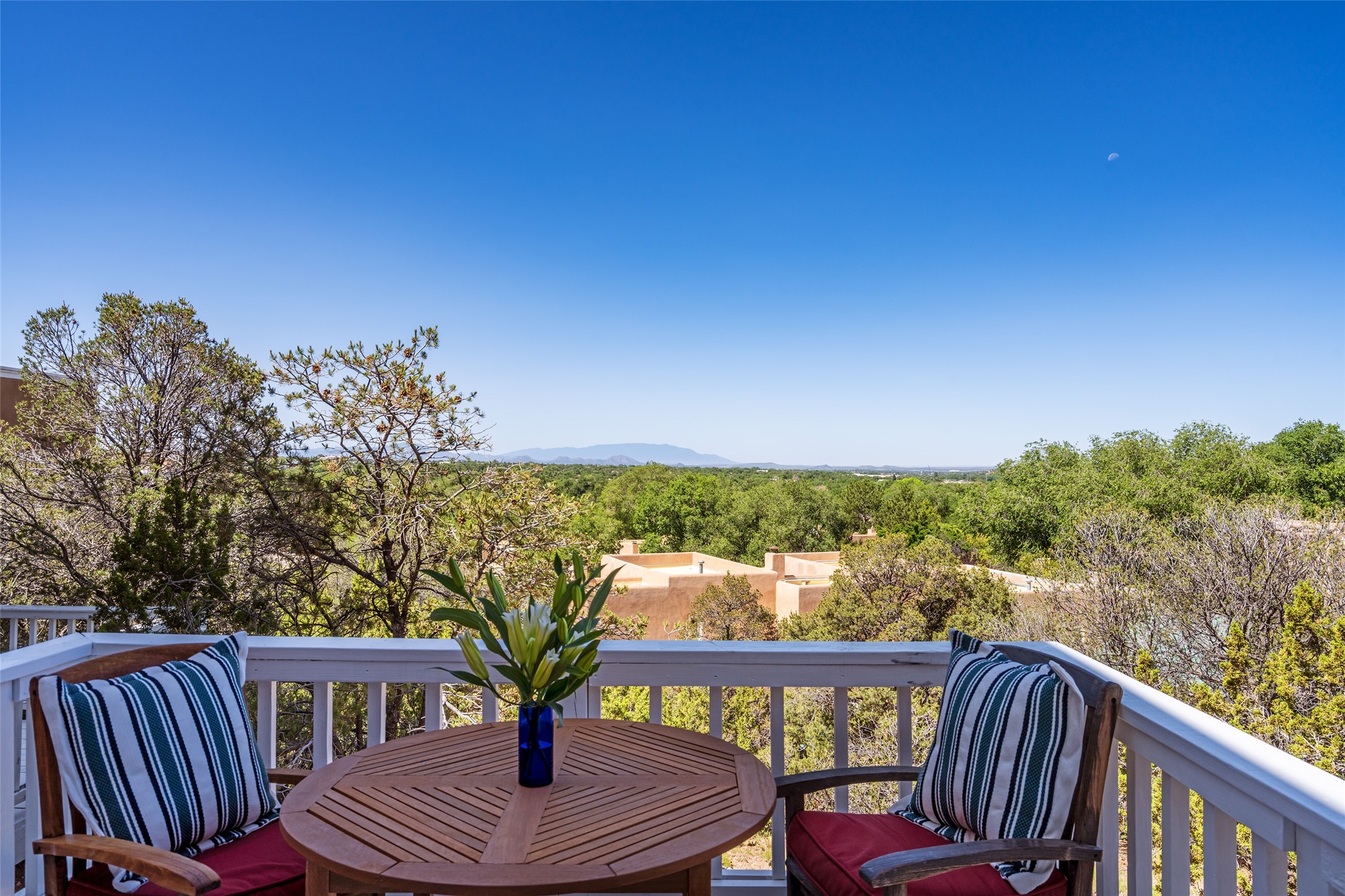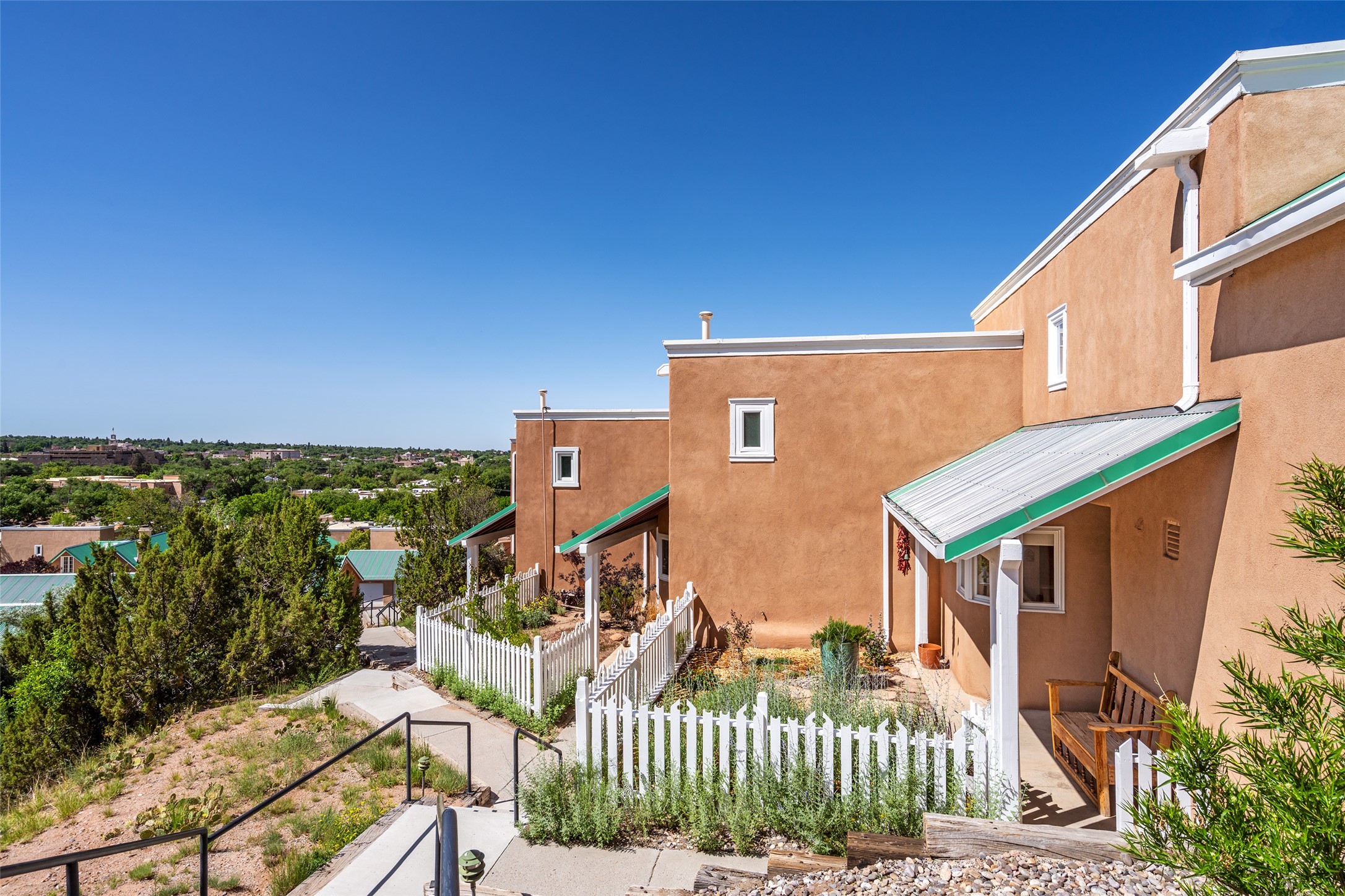 Wonderful VIEWS from this Pueblo de Rosario condo near the Santa Fe Plaza. This two story, two bedroom; 2 1/2 bath condo was remodeled with a fresh look about 10 years ago. Brand new membrane roof in April 2025. Engineered wood flooring, walnut kitchen cabinets, and newer interior pine doors. Stainless Bosch kitchen appliances with a Liebherr refrigerator and quartz countertops. Full bathroom upstairs features teak cabinets and marble. Primary bathroom has hickory cabintets, granite counter tops and travertine flooring. Half bath downstairs has a stone sink, venetian plaster walls, glass mosaic tile and travertine flooring. Stackable washer/dryer upstairs. One kiva fireplace in the living area. Lovely front area with views of the Cathedral and an outdoor deck off the dining area to enjoy the big Sandia - western views. Detached one car garage with cabinet storage. Community pool to enjoy the Santa Fe summers and a year around community hot tub. This unit is perfect for a "lock and leave" situation. Wonderful location and just less than one mile to the Santa Fe Plaza, restaurants, shops, galleries and an easy drive to the Santa Fe Ski Basin.