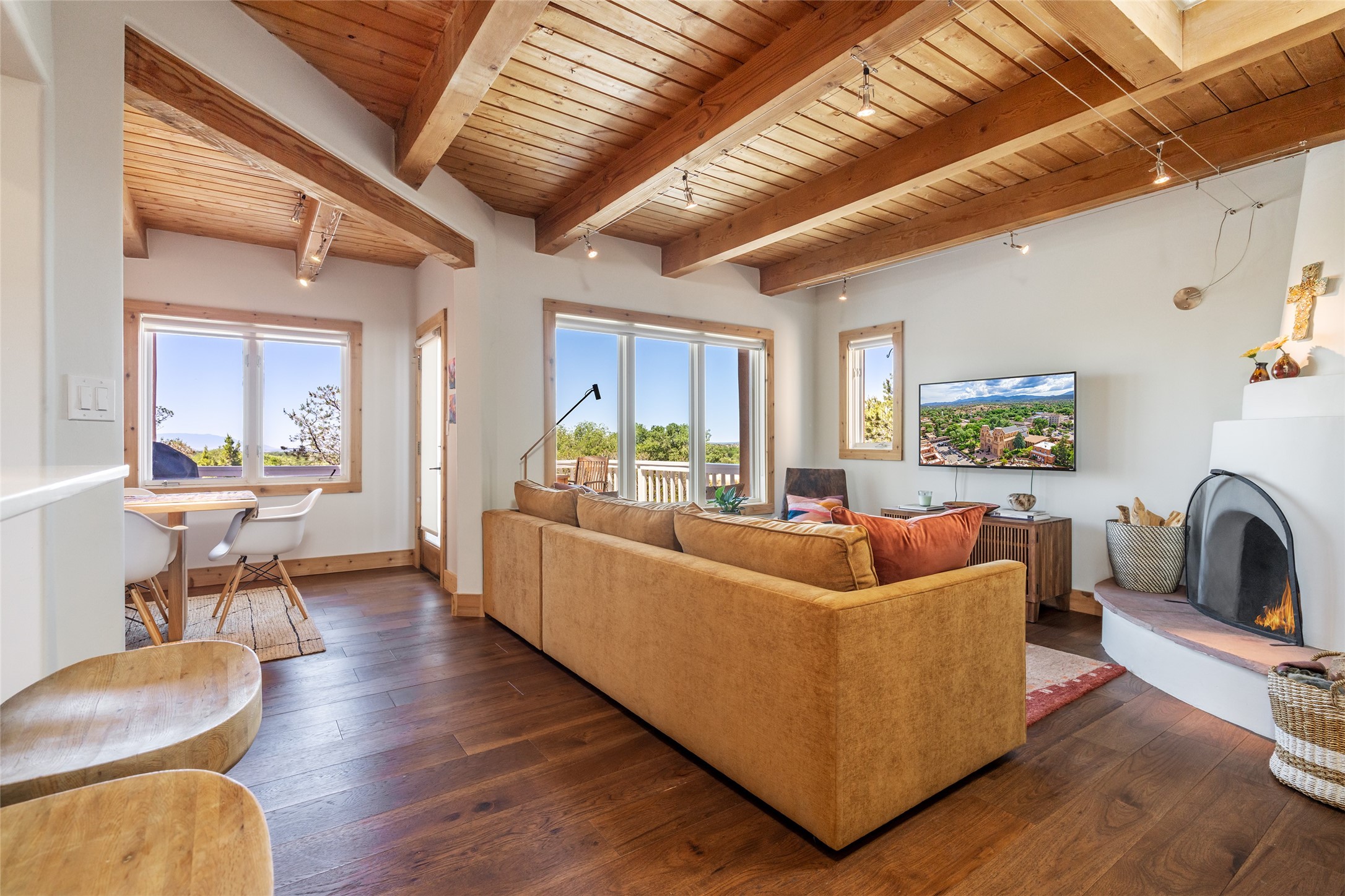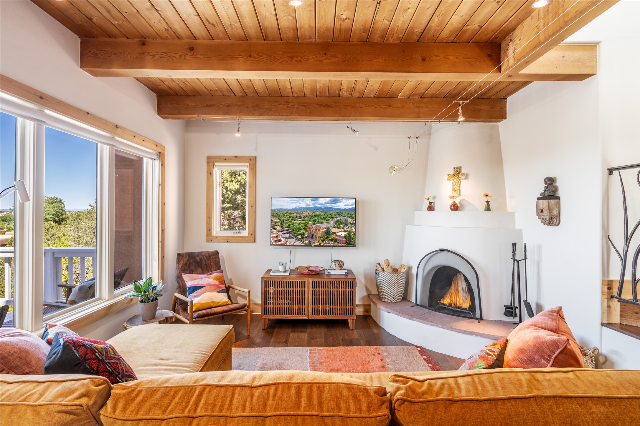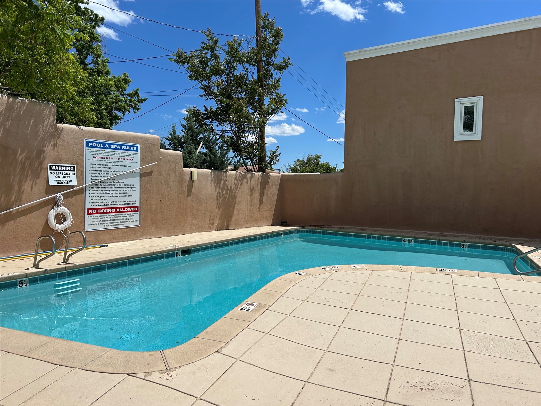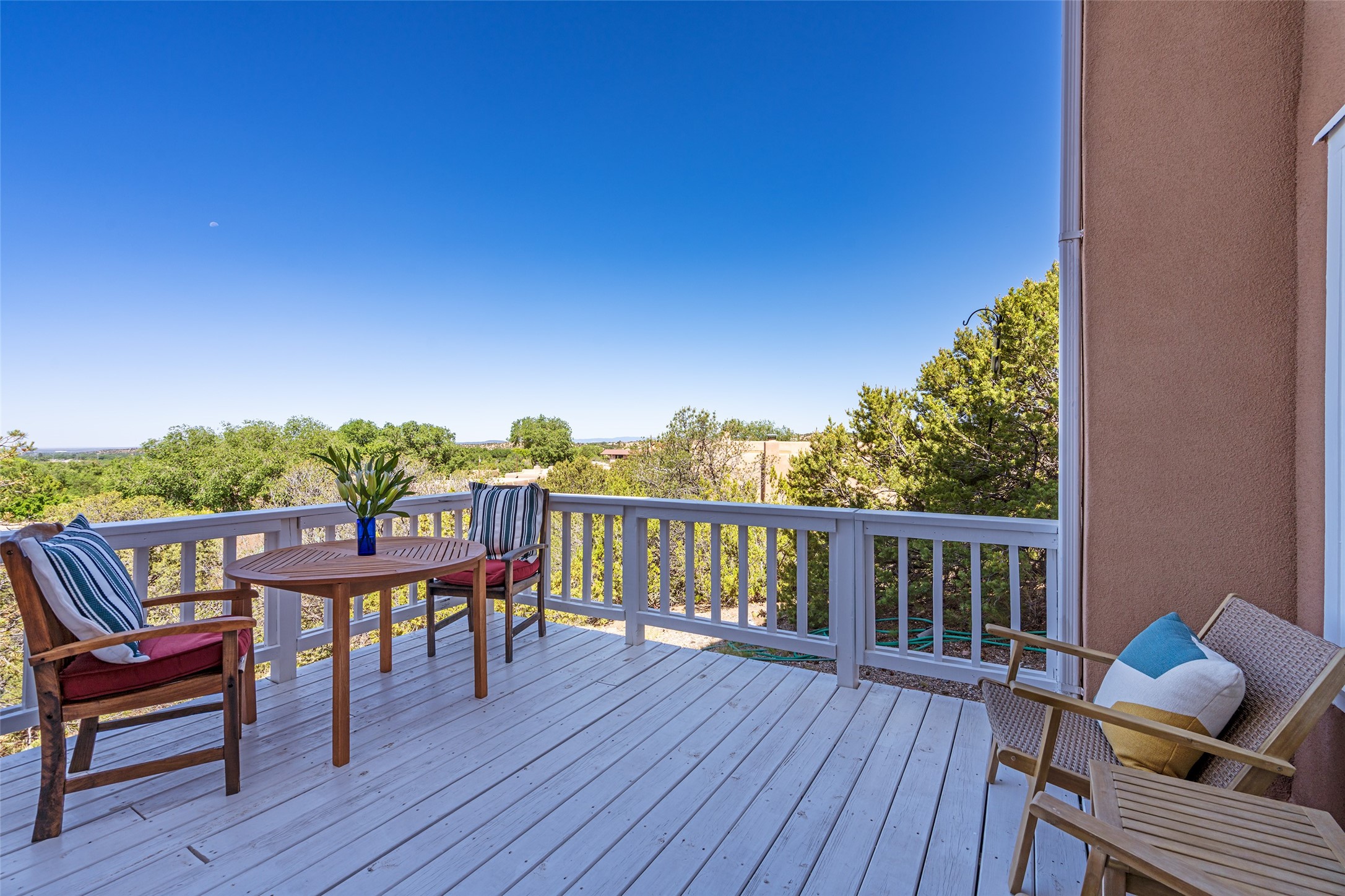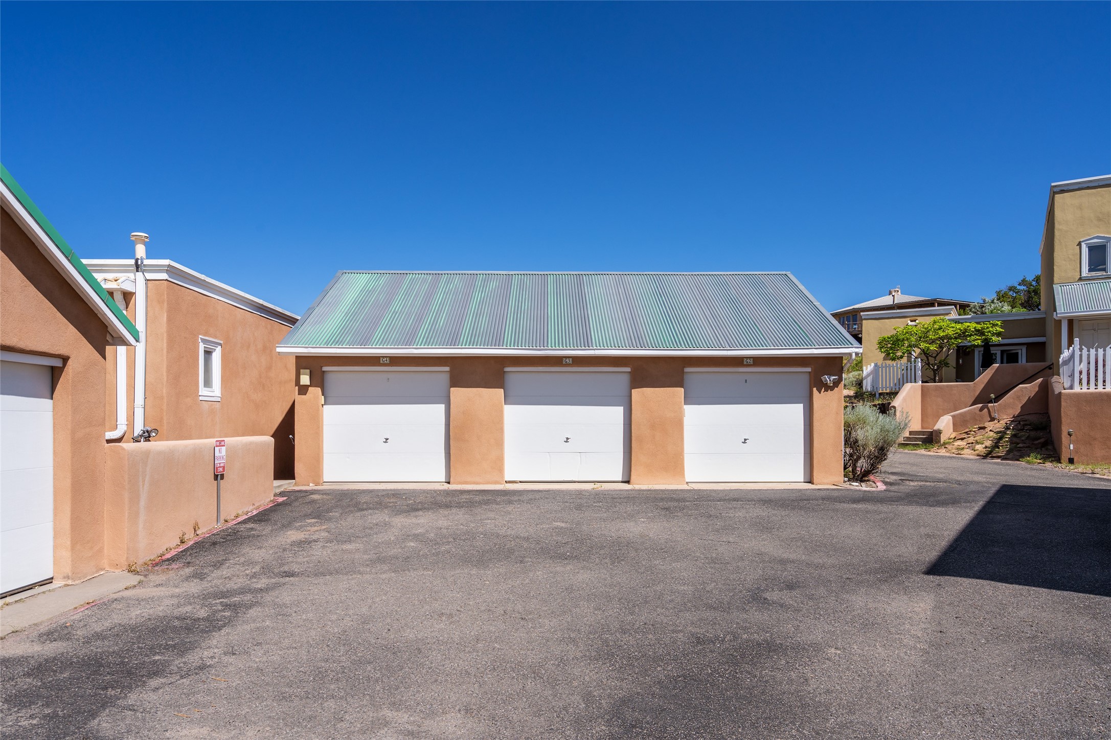 Wonderful VIEWS from this Pueblo de Rosario condo near the Santa Fe Plaza. This two story, two bedroom; 2 1/2 bath condo was remodeled with a fresh look about 10 years ago. Brand new membrane roof in April 2025. Engineered wood flooring, walnut kitchen cabinets, and newer interior pine doors. Stainless Bosch kitchen appliances with a Liebherr refrigerator and quartz countertops. Full bathroom upstairs features teak cabinets and marble. Primary bathroom has hickory cabintets, granite counter tops and travertine flooring. Half bath downstairs has a stone sink, venetian plaster walls, glass mosaic tile and travertine flooring. Stackable washer/dryer upstairs. One kiva fireplace in the living area. Lovely front area with views of the Cathedral and an outdoor deck off the dining area to enjoy the big Sandia - western views. Detached one car garage with cabinet storage. Community pool to enjoy the Santa Fe summers and a year around community hot tub. This unit is perfect for a "lock and leave" situation. Wonderful location and just less than one mile to the Santa Fe Plaza, restaurants, shops, galleries and an easy drive to the Santa Fe Ski Basin.