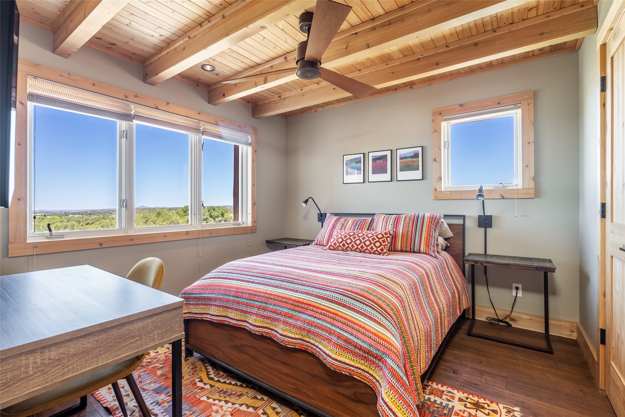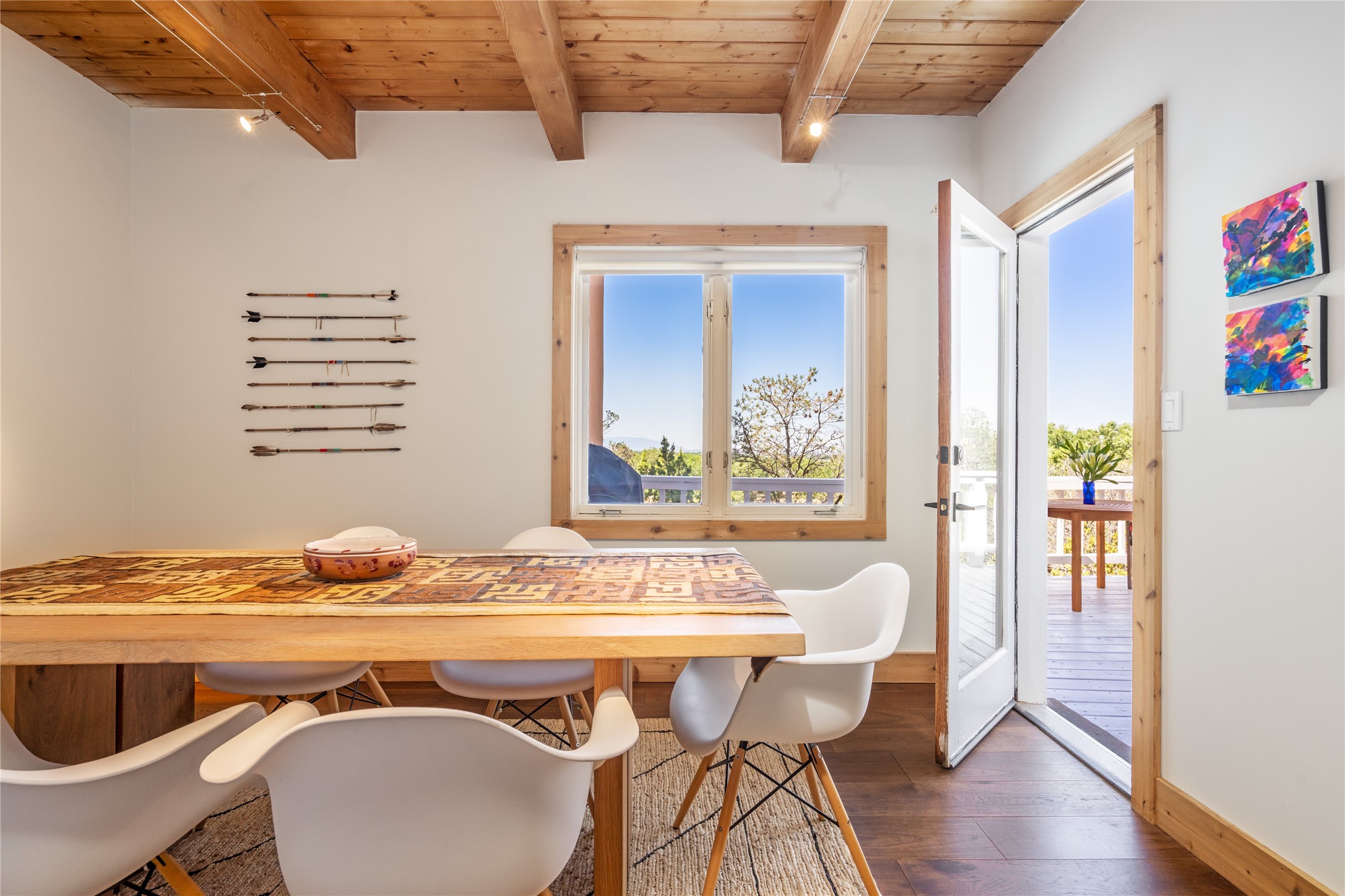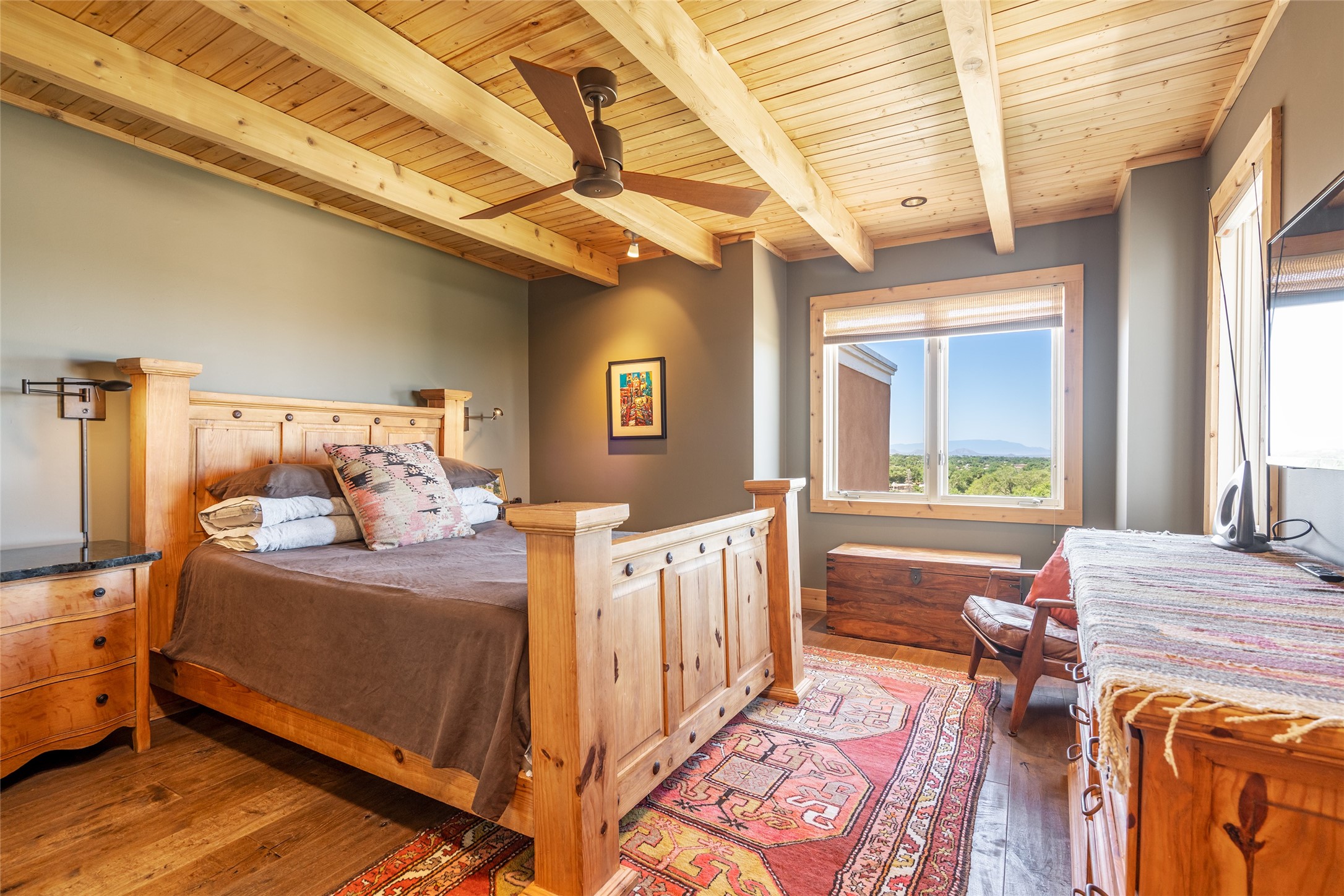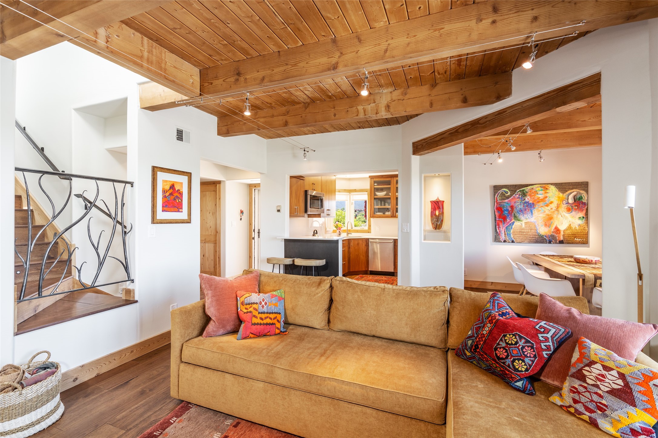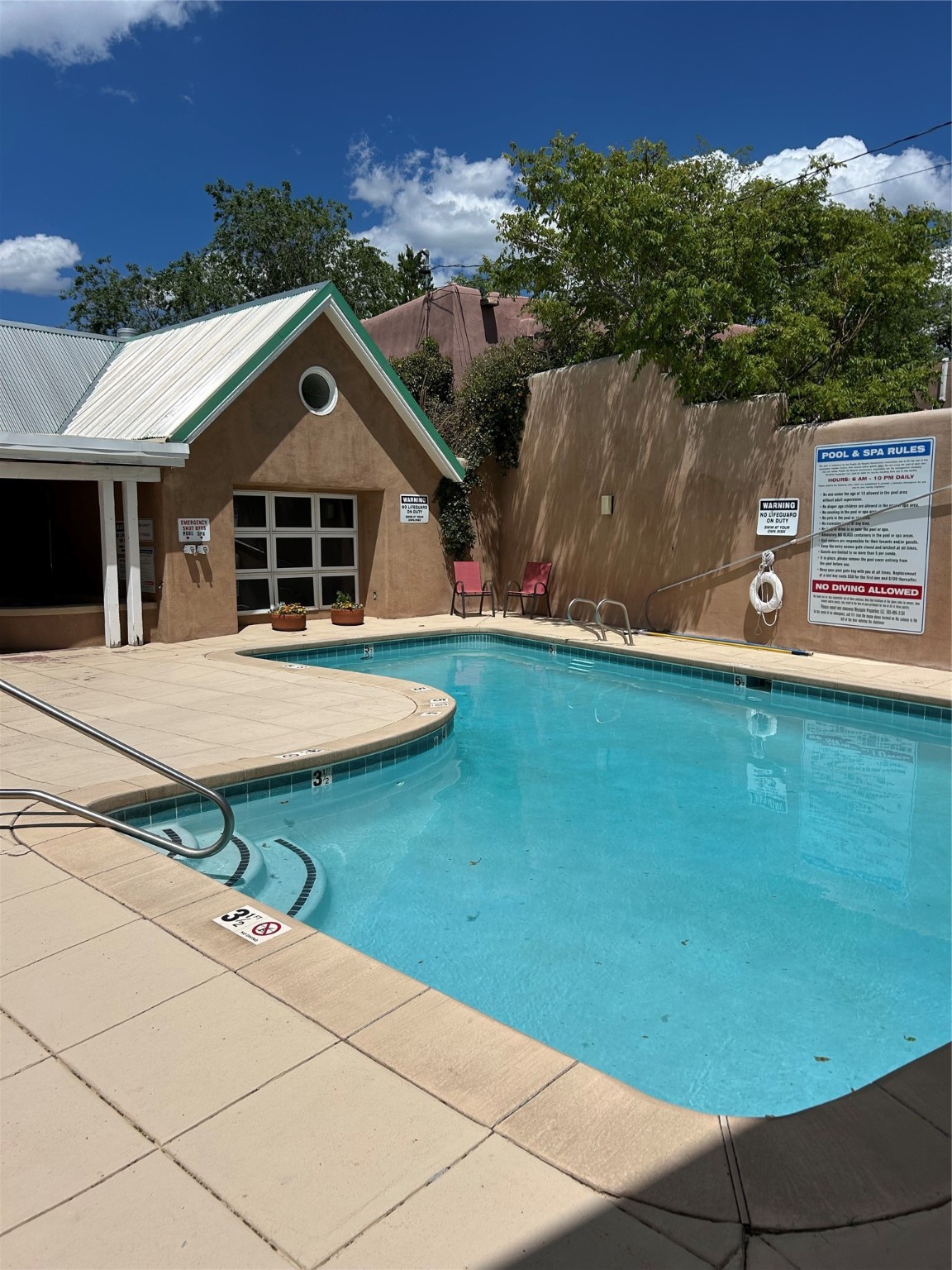 Wonderful VIEWS from this Pueblo de Rosario condo near the Santa Fe Plaza. This two story, two bedroom; 2 1/2 bath condo was remodeled with a fresh look about 10 years ago. Brand new membrane roof in April 2025. Engineered wood flooring, walnut kitchen cabinets, and newer interior pine doors. Stainless Bosch kitchen appliances with a Liebherr refrigerator and quartz countertops. Full bathroom upstairs features teak cabinets and marble. Primary bathroom has hickory cabintets, granite counter tops and travertine flooring. Half bath downstairs has a stone sink, venetian plaster walls, glass mosaic tile and travertine flooring. Stackable washer/dryer upstairs. One kiva fireplace in the living area. Lovely front area with views of the Cathedral and an outdoor deck off the dining area to enjoy the big Sandia - western views. Detached one car garage with cabinet storage. Community pool to enjoy the Santa Fe summers and a year around community hot tub. This unit is perfect for a "lock and leave" situation. Wonderful location and just less than one mile to the Santa Fe Plaza, restaurants, shops, galleries and an easy drive to the Santa Fe Ski Basin.