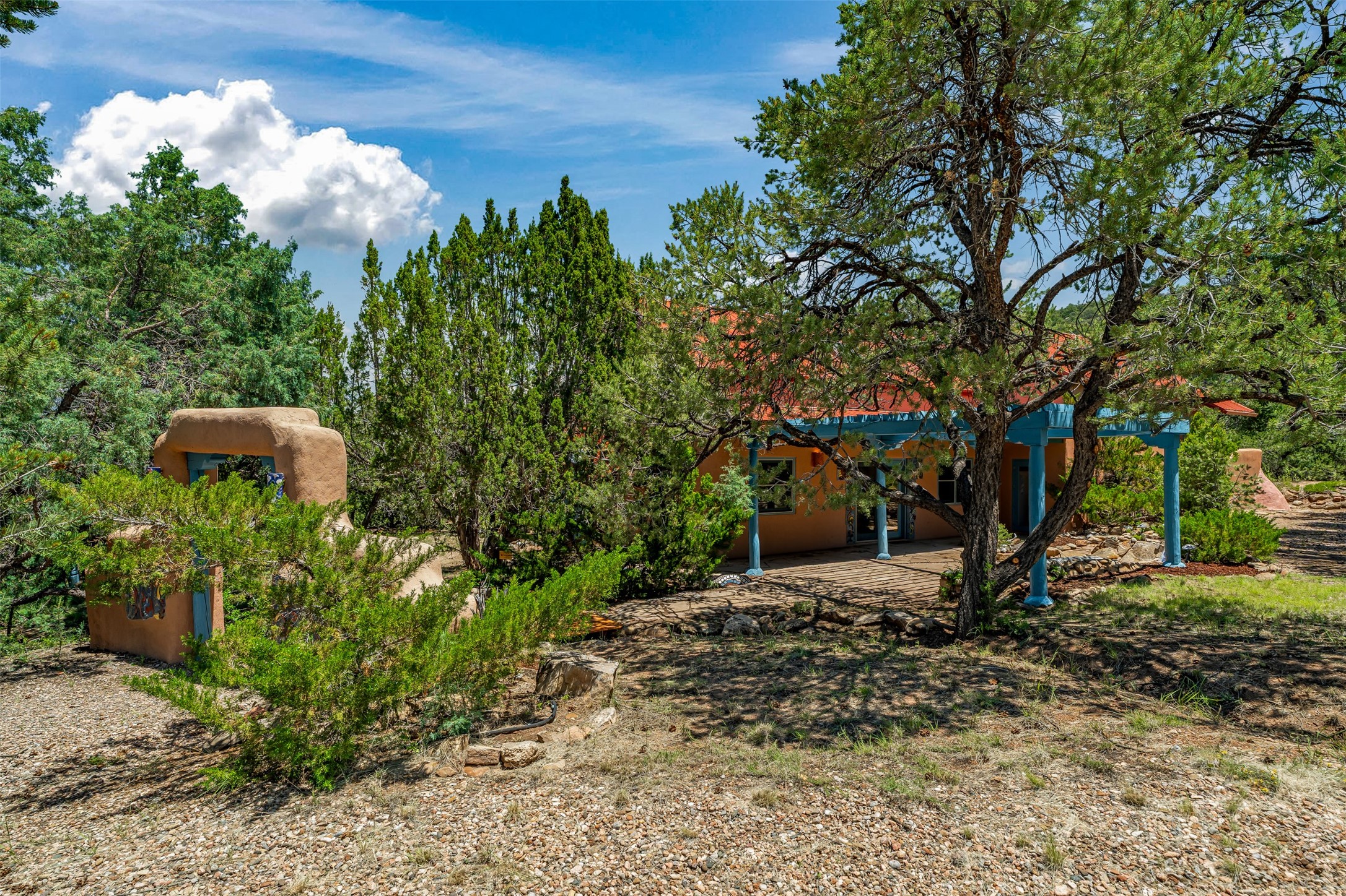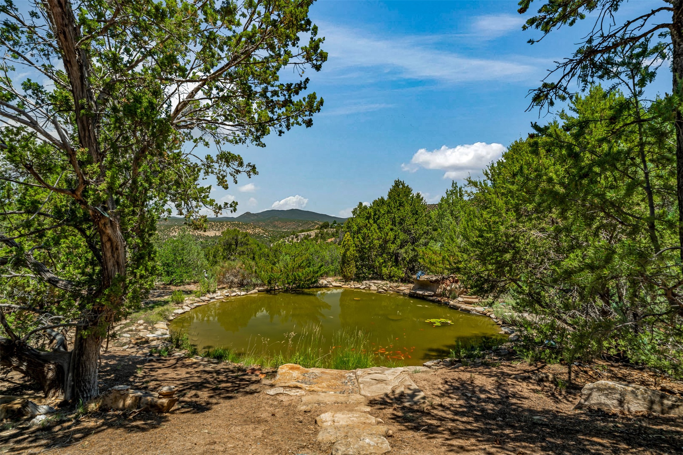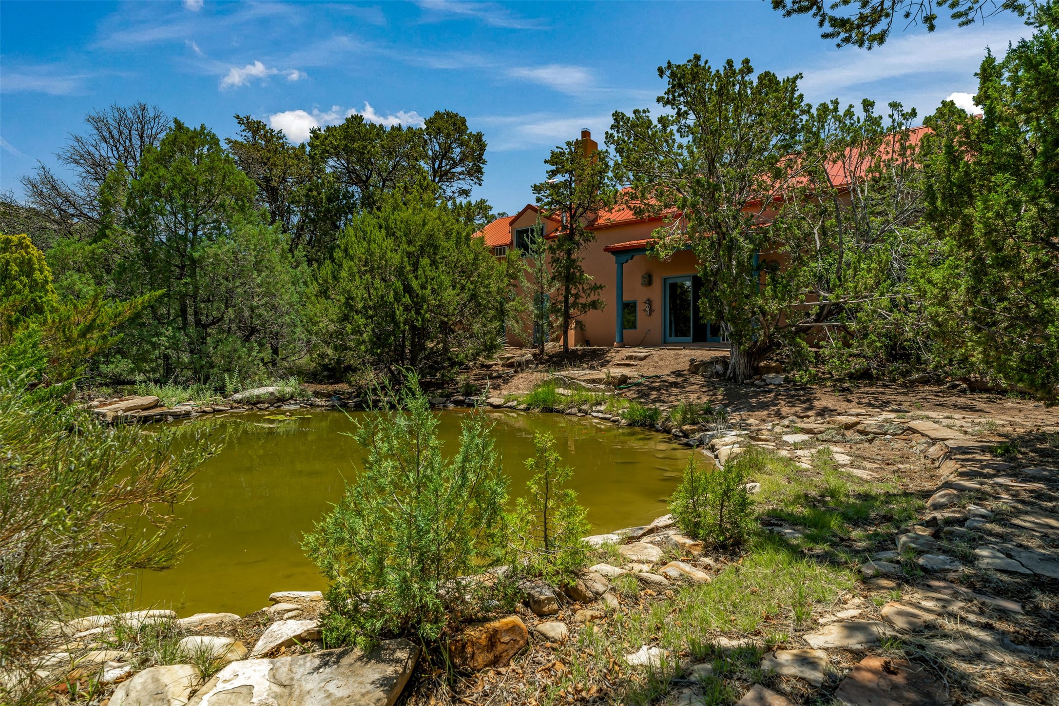 Nestled in the serene hills of Caoncito, this 3-bed, 2-bath Rastra home sits on 5.99 private wooded acres with a thriving koi pond, private well, and sweeping Sangre de Cristo views -- offering a rare value-add opportunity.Owner-built and on the market for the first time since 1998, this home blends craftsmanship and artistic detail throughout. Soaring ceilings, a striking fireplace, and expansive windows define the main living space, while a lofted study/library offers a quiet retreat. The home was intentionally designed to be divided into two living areas, with pre-installed utility connections ready to support the setup.A workroom with slop sink, two storage sheds -- including one with an electrical backup generator -- add functionality. With a new septic system recently installed and an updated well system, this property offers a strong infrastructure base to build upon.Just 10 minutes to Eldorado and 25 to downtown Santa Fe, with nearby trails and 100 mbps internet available. A peaceful retreat and a rare chance to add real value.