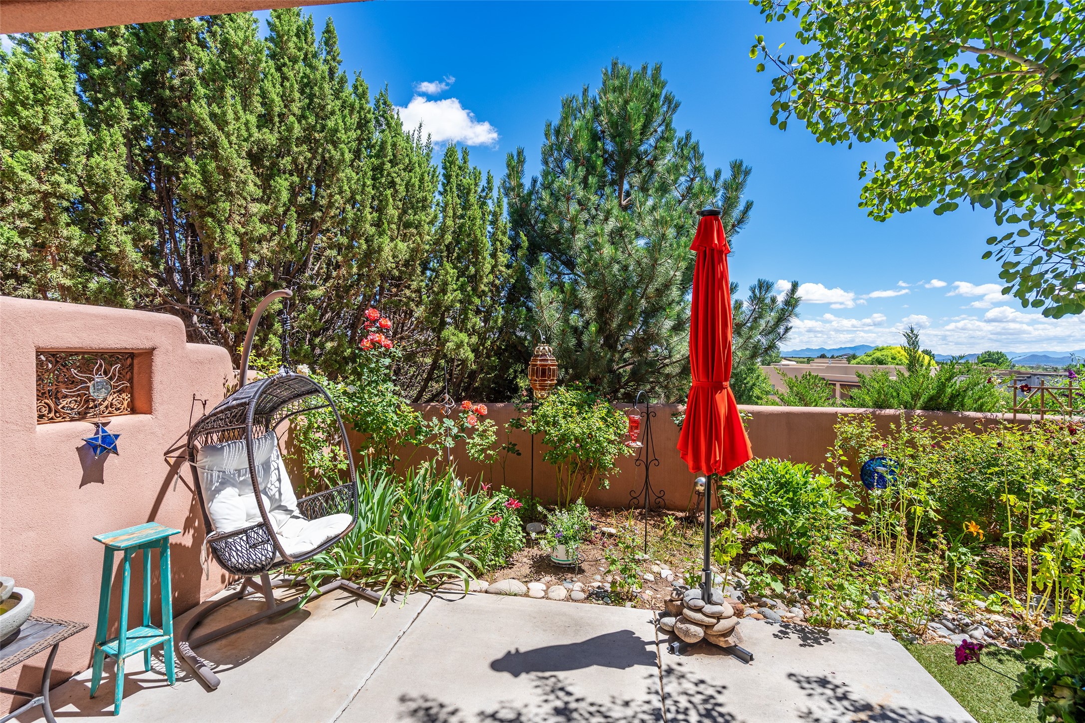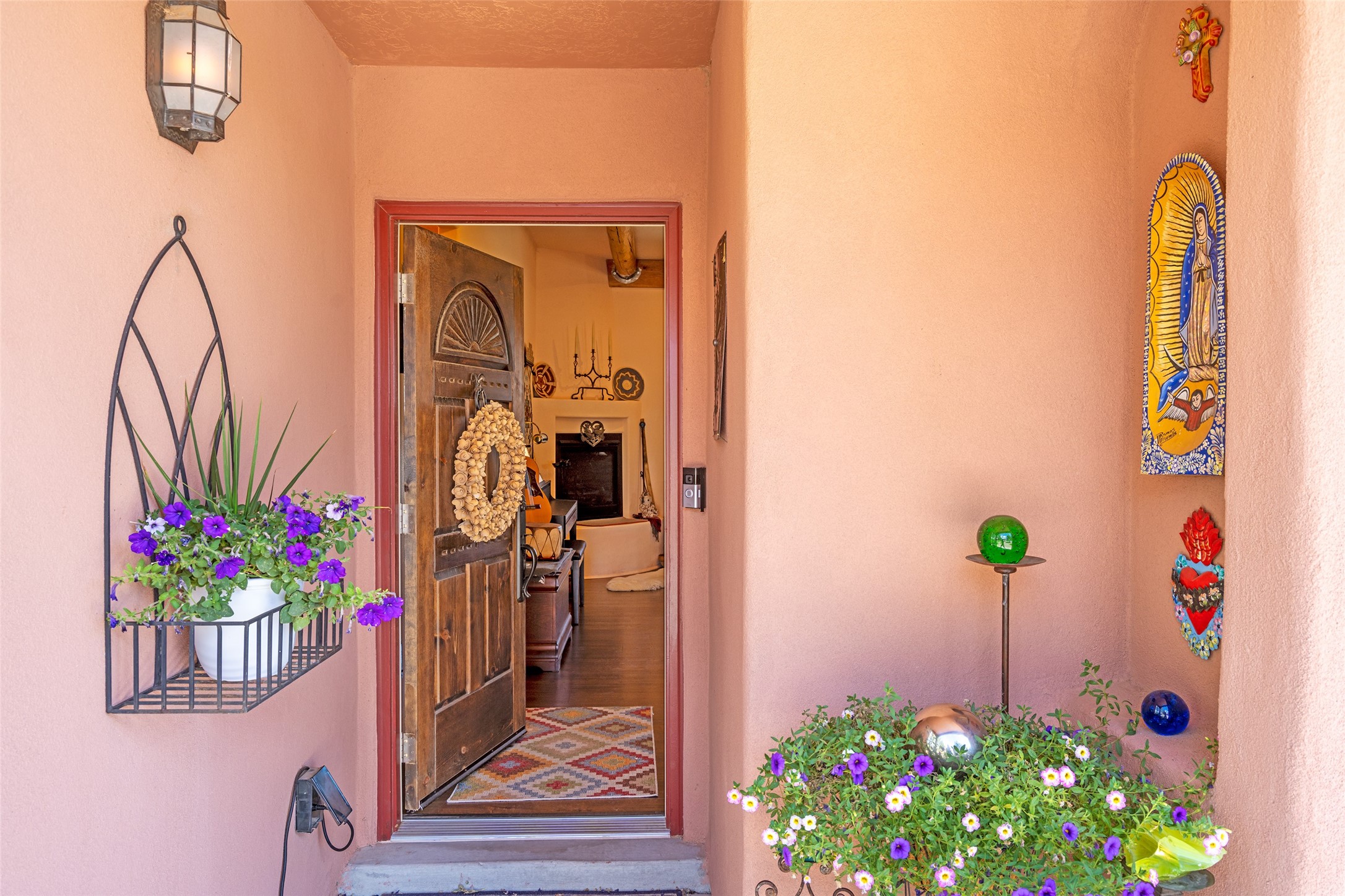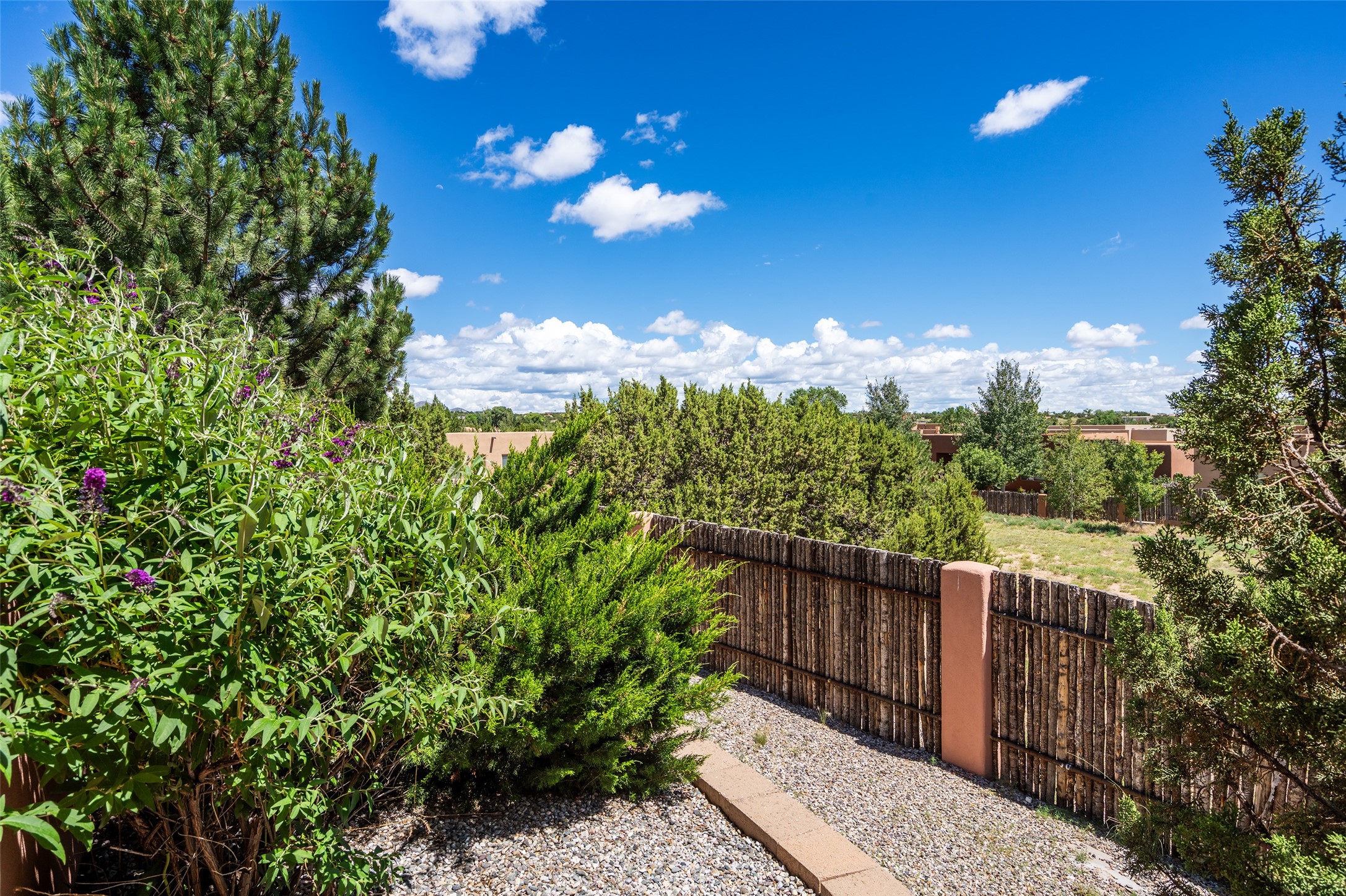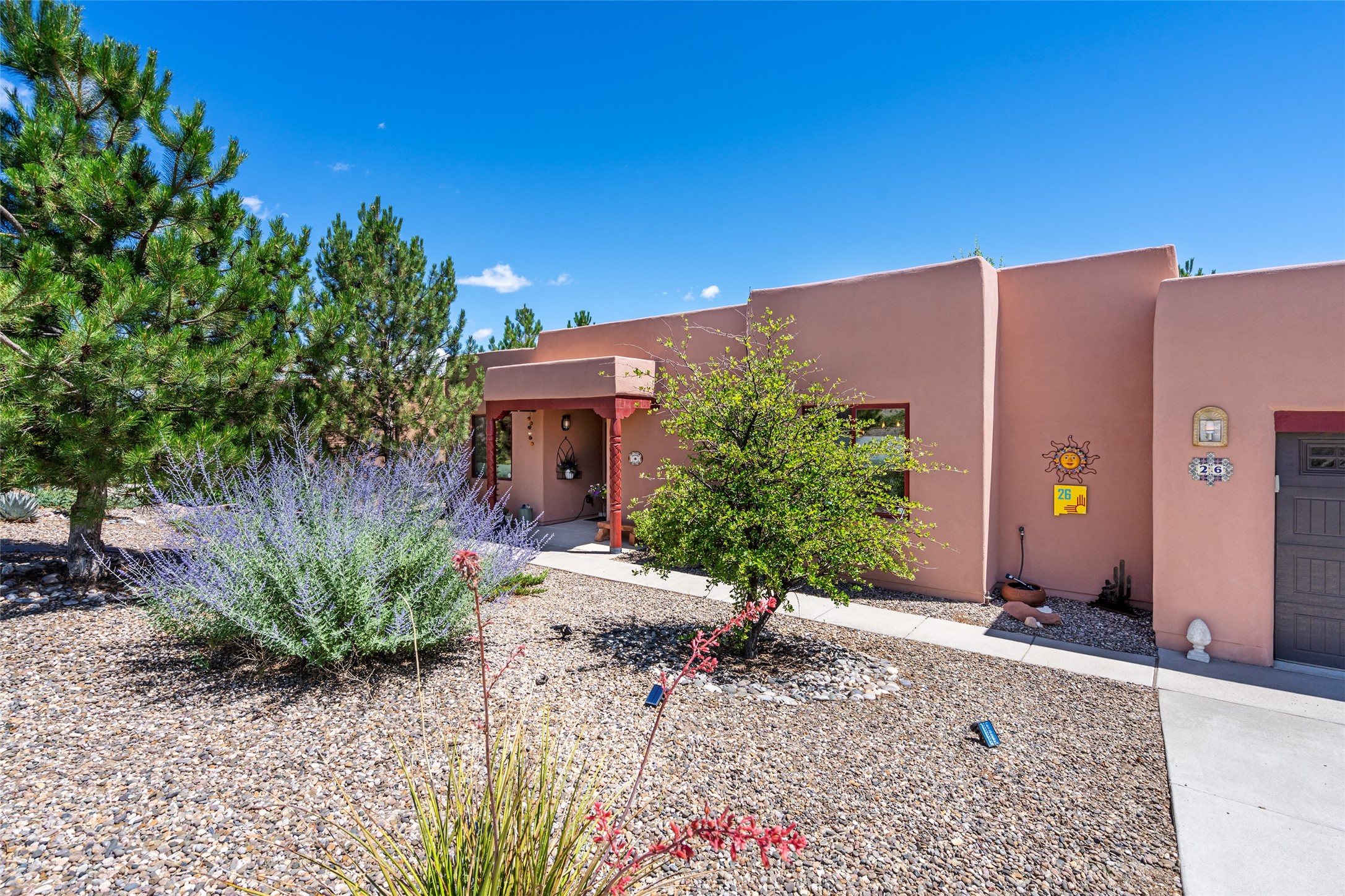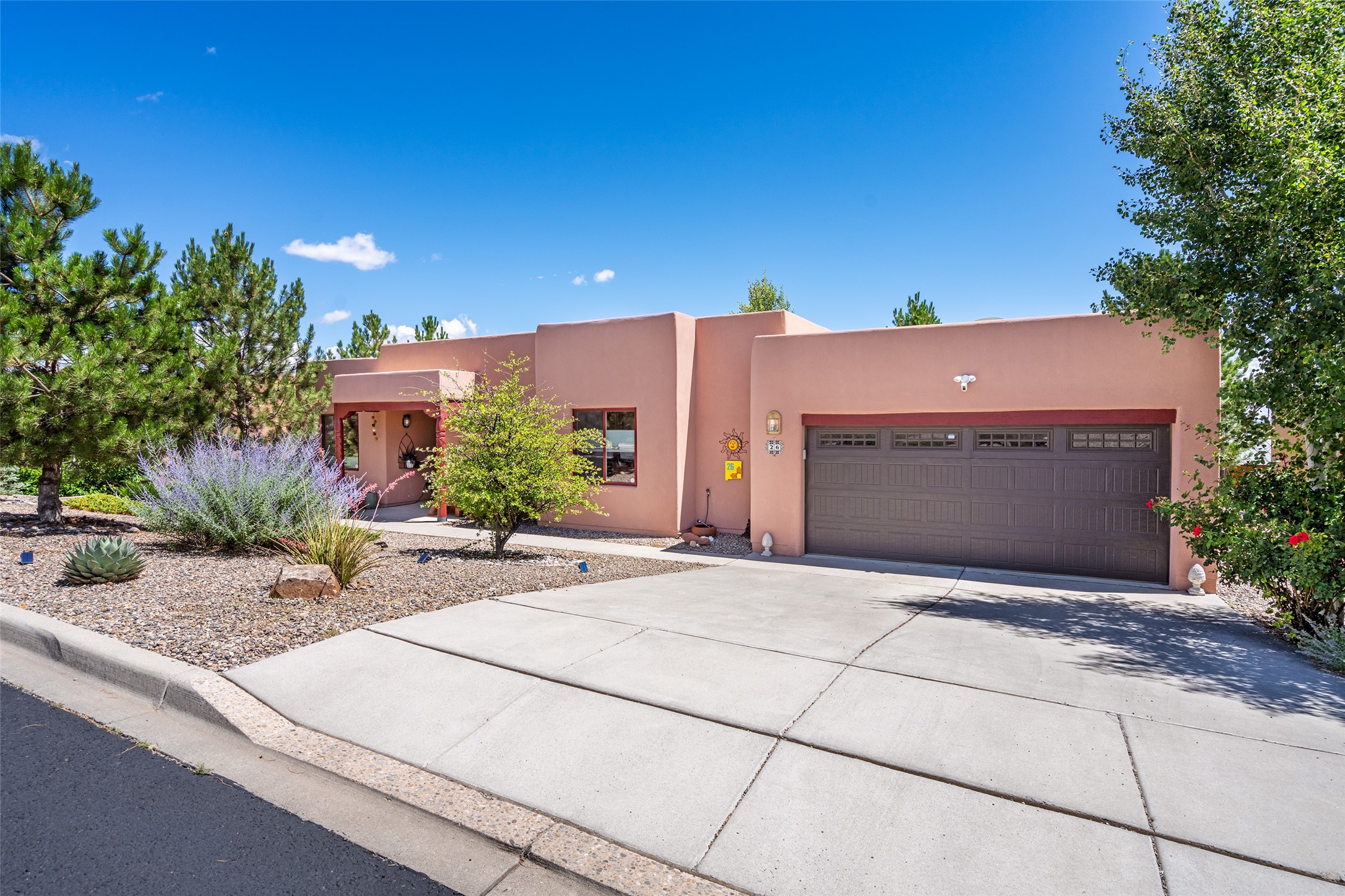 This is a beautifully maintained and loved home. It has that magical feel of Santa Fe without the super high price.There are views out the back of the Sandia Mountains, and it feels very private. The backyard is separated into two areas for easier care. There are lots of flowers! The living room is spacious and had Vigas added to enhance the appeal of the room. The Primary Bedroom is separate from the other bedrooms for added privacy. There are fantastic views of the backyard and beyond in the Primary as well as the Primary Bathroom. Beautiful Spanish tiles throughout the wet areas add a colorful and classic style. There are also vinyl (dark wood style) floors that look fantastic, will last for a very long time and are easy to care for. Drainage plan designed by builder - Garage concrete pad is raised 2 inches for drainage protection from driveway. Water is routed to the right of the property and drains away. Current owner has lived in the house for 8 years and through some major rainstorms with no issues. Come see this beautiful home today!