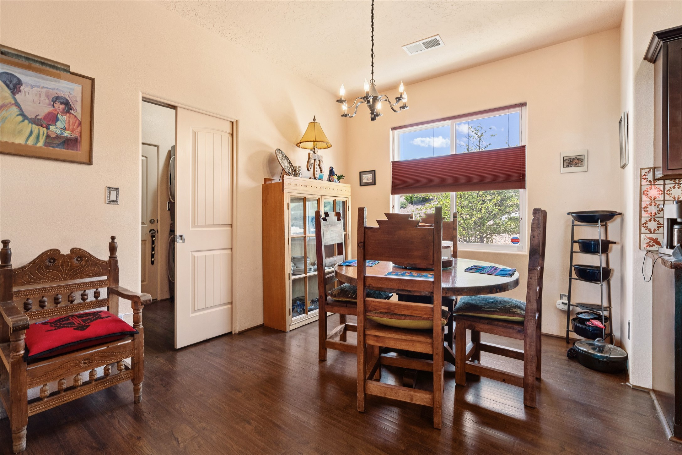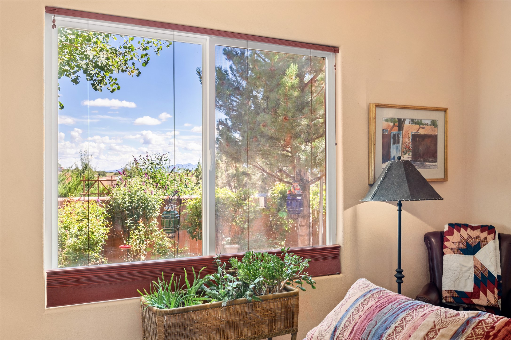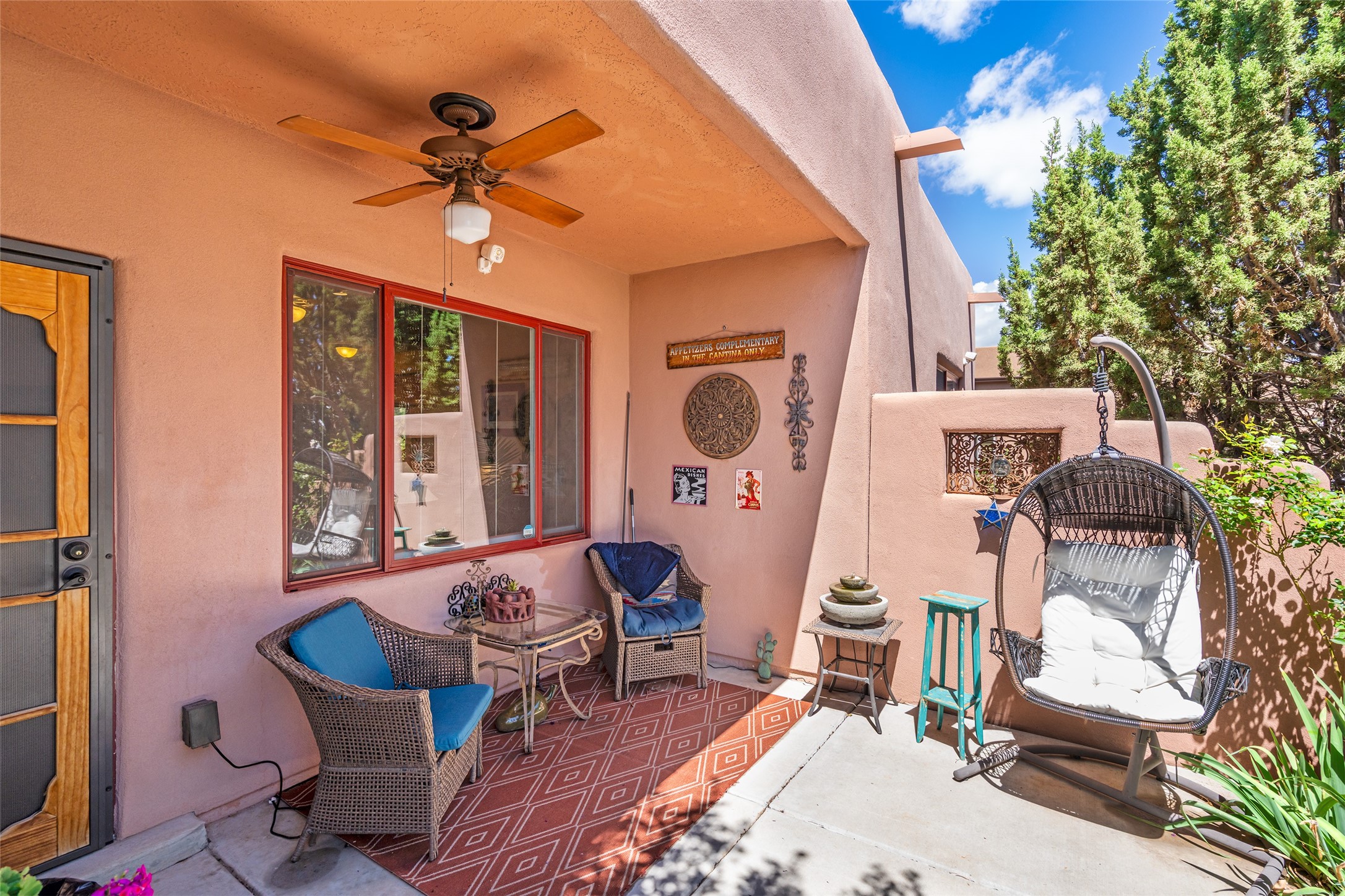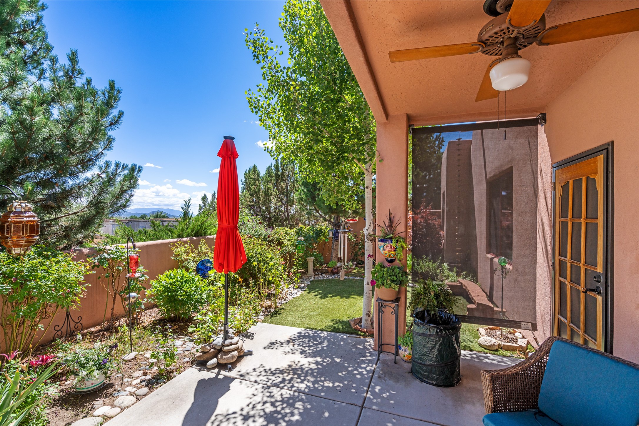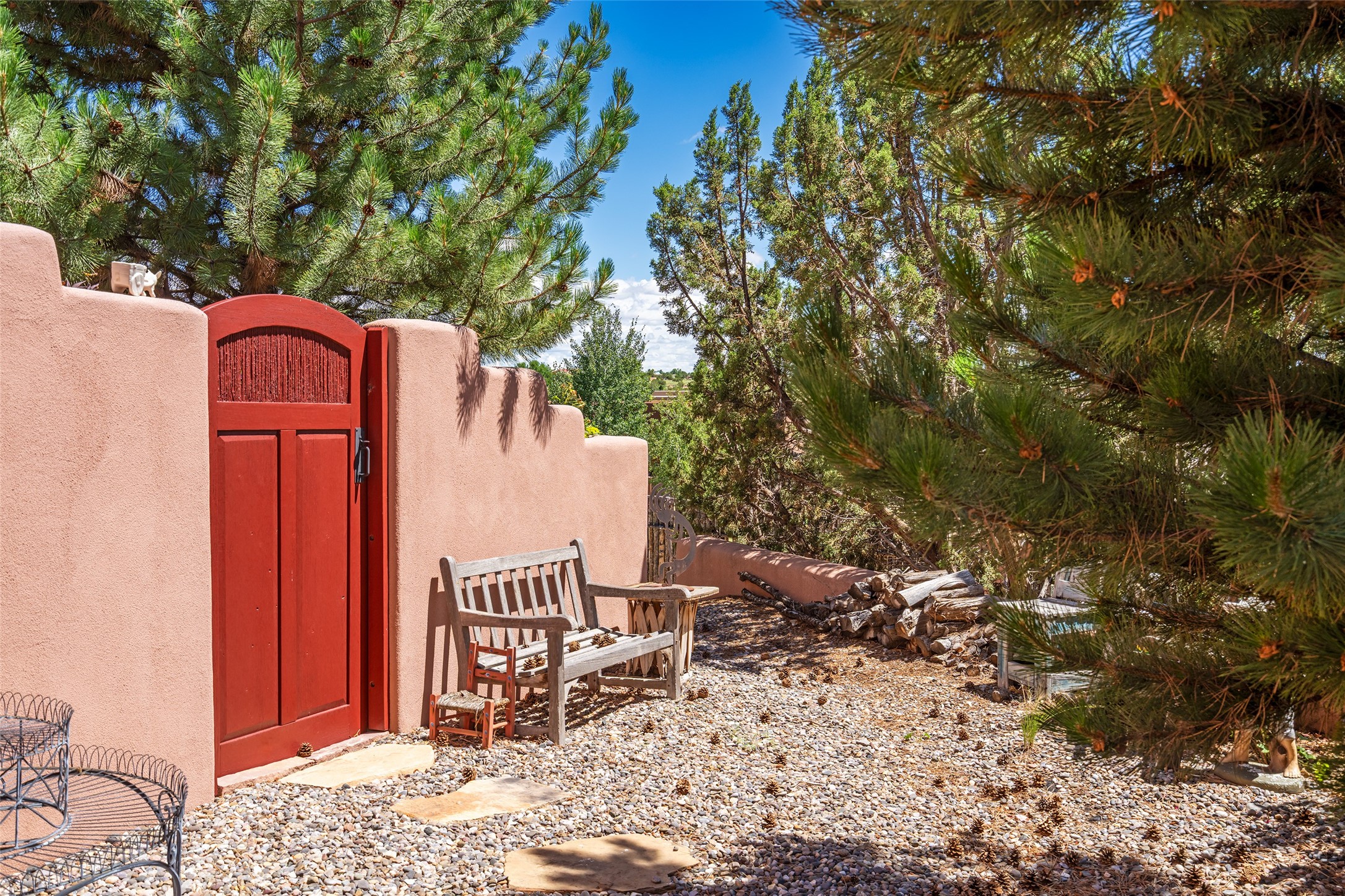 This is a beautifully maintained and loved home. It has that magical feel of Santa Fe without the super high price.There are views out the back of the Sandia Mountains, and it feels very private. The backyard is separated into two areas for easier care. There are lots of flowers! The living room is spacious and had Vigas added to enhance the appeal of the room. The Primary Bedroom is separate from the other bedrooms for added privacy. There are fantastic views of the backyard and beyond in the Primary as well as the Primary Bathroom. Beautiful Spanish tiles throughout the wet areas add a colorful and classic style. There are also vinyl (dark wood style) floors that look fantastic, will last for a very long time and are easy to care for. Drainage plan designed by builder - Garage concrete pad is raised 2 inches for drainage protection from driveway. Water is routed to the right of the property and drains away. Current owner has lived in the house for 8 years and through some major rainstorms with no issues. Come see this beautiful home today!