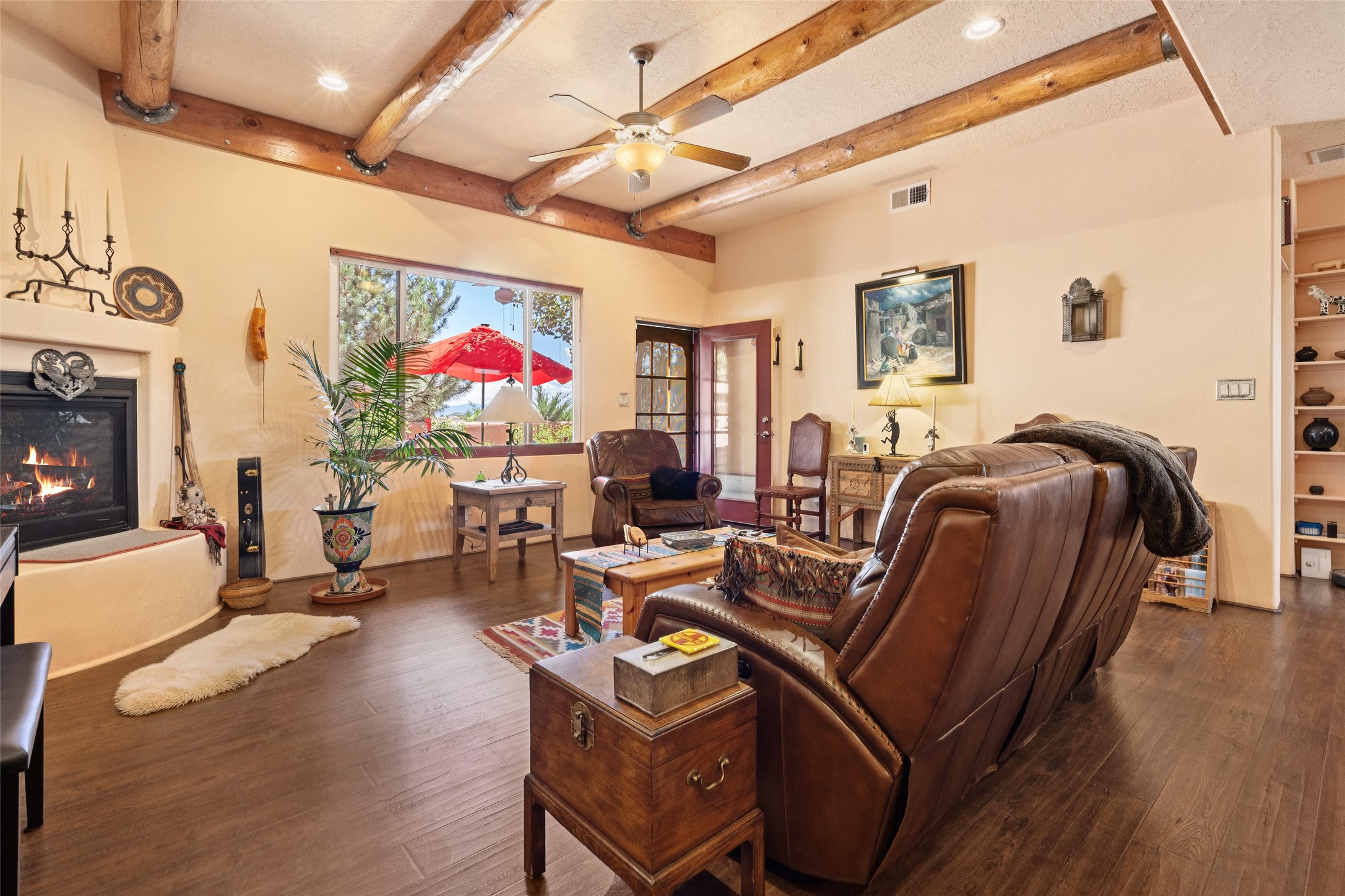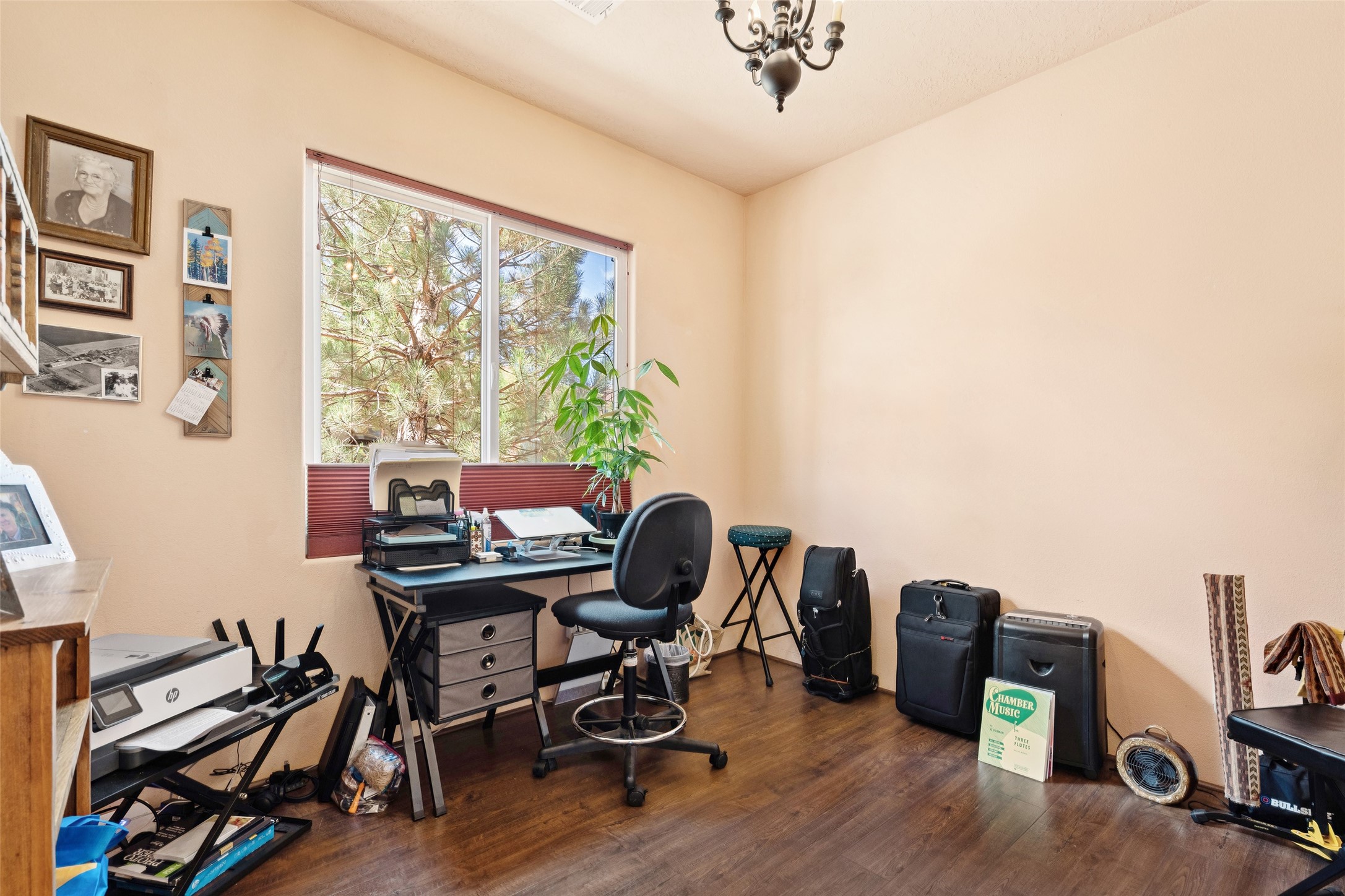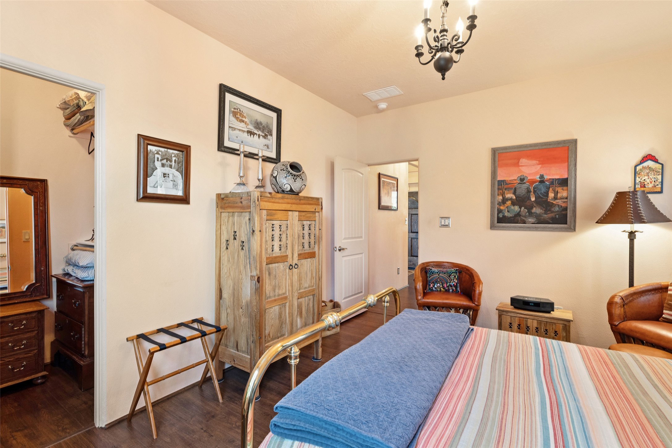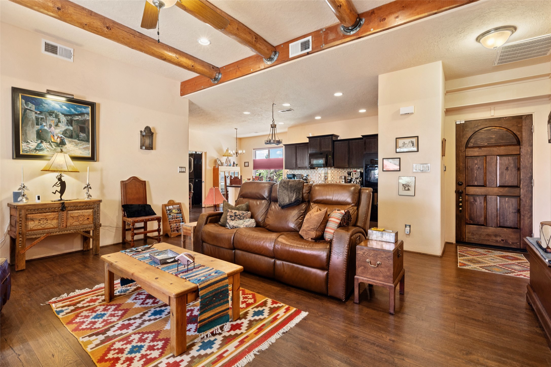 This is a beautifully maintained and loved home. It has that magical feel of Santa Fe without the super high price.There are views out the back of the Sandia Mountains, and it feels very private. The backyard is separated into two areas for easier care. There are lots of flowers! The living room is spacious and had Vigas added to enhance the appeal of the room. The Primary Bedroom is separate from the other bedrooms for added privacy. There are fantastic views of the backyard and beyond in the Primary as well as the Primary Bathroom. Beautiful Spanish tiles throughout the wet areas add a colorful and classic style. There are also vinyl (dark wood style) floors that look fantastic, will last for a very long time and are easy to care for. Drainage plan designed by builder - Garage concrete pad is raised 2 inches for drainage protection from driveway. Water is routed to the right of the property and drains away. Current owner has lived in the house for 8 years and through some major rainstorms with no issues. Come see this beautiful home today!