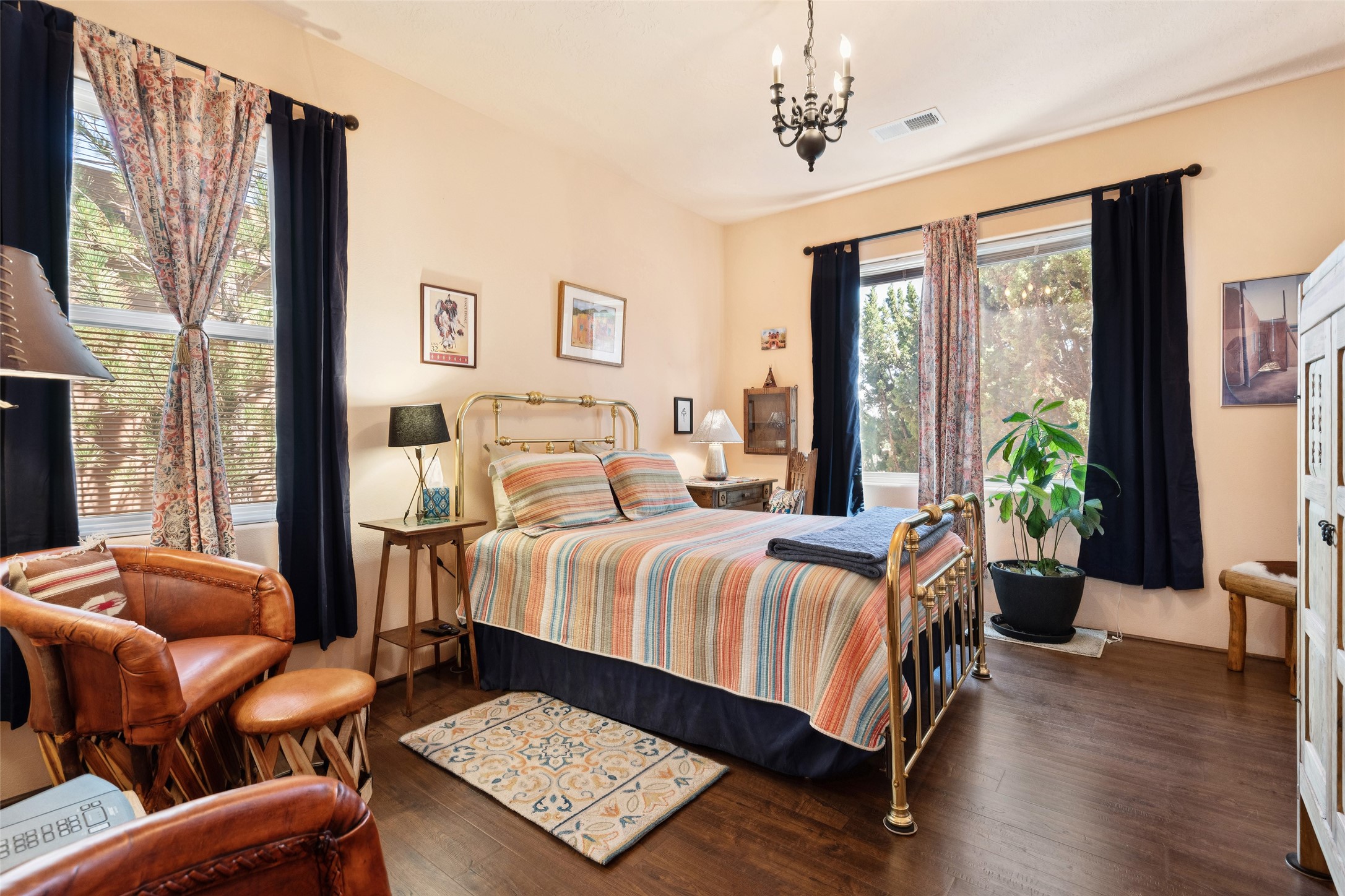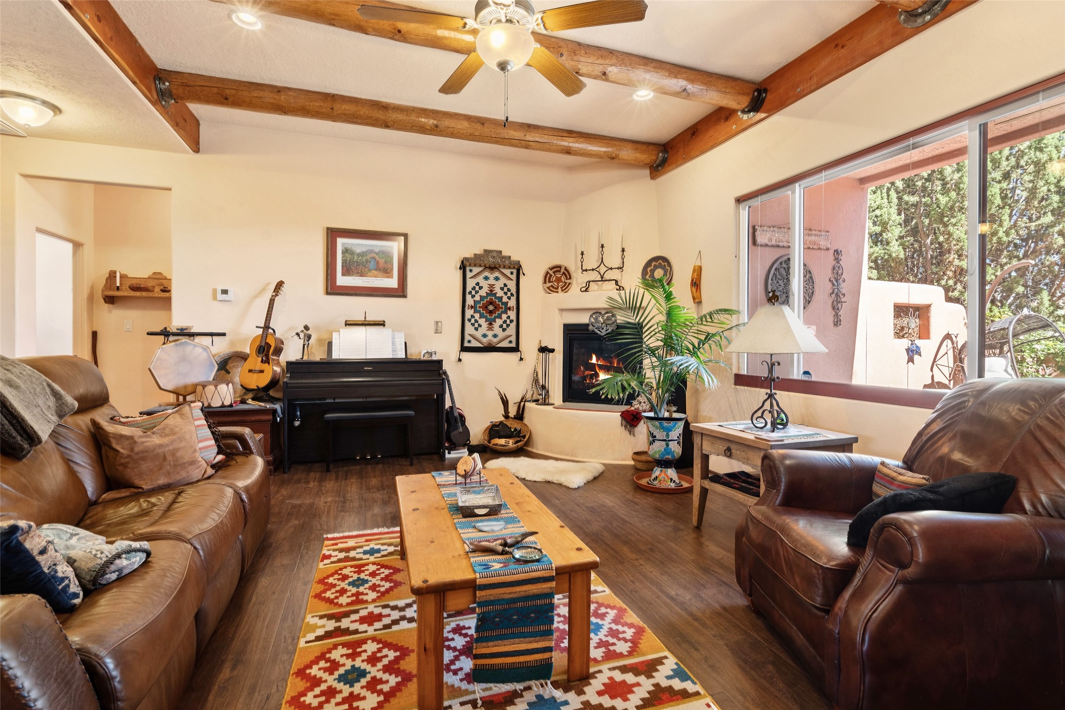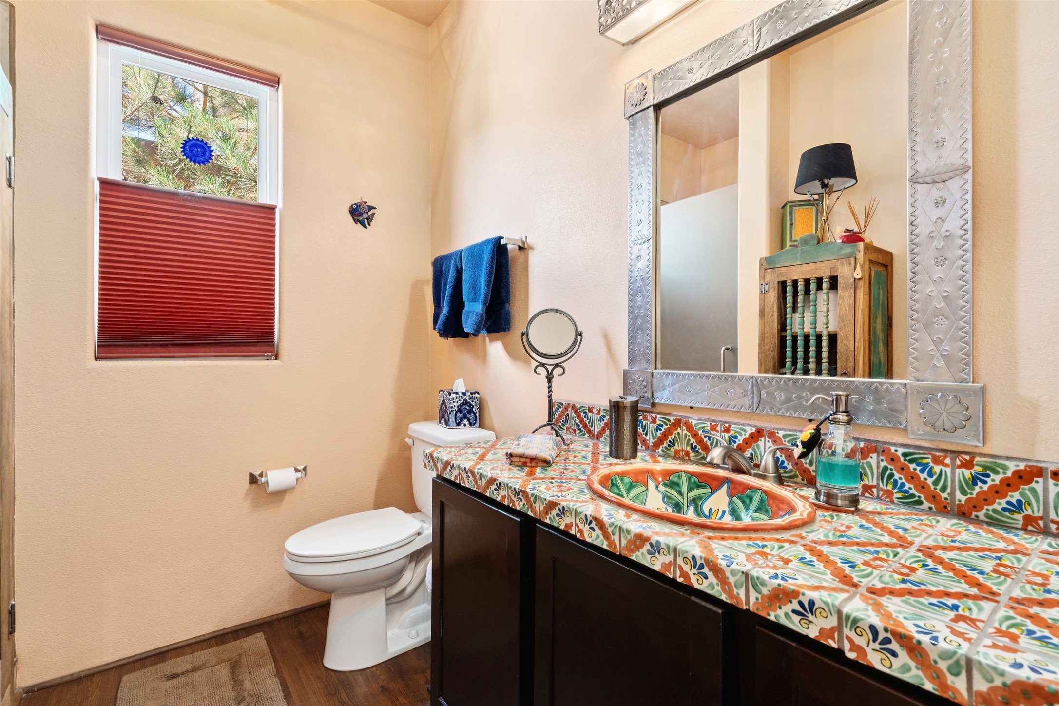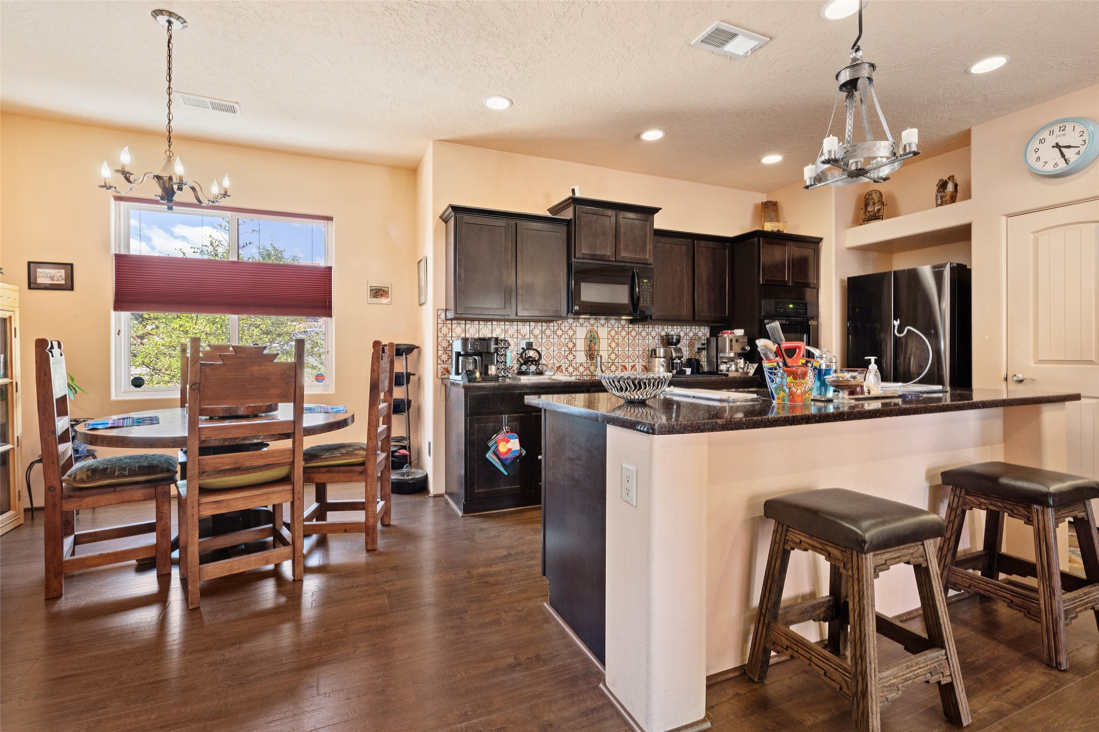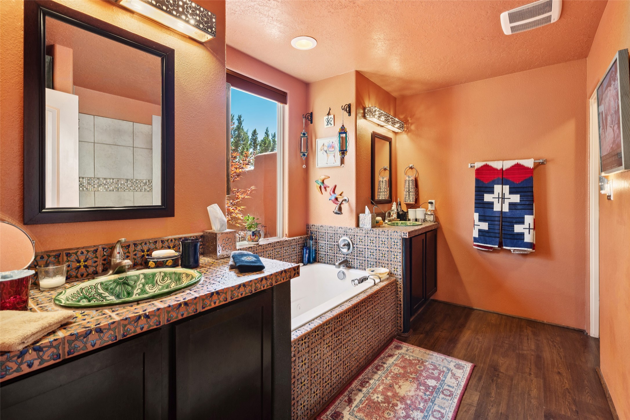 This is a beautifully maintained and loved home. It has that magical feel of Santa Fe without the super high price.There are views out the back of the Sandia Mountains, and it feels very private. The backyard is separated into two areas for easier care. There are lots of flowers! The living room is spacious and had Vigas added to enhance the appeal of the room. The Primary Bedroom is separate from the other bedrooms for added privacy. There are fantastic views of the backyard and beyond in the Primary as well as the Primary Bathroom. Beautiful Spanish tiles throughout the wet areas add a colorful and classic style. There are also vinyl (dark wood style) floors that look fantastic, will last for a very long time and are easy to care for. Drainage plan designed by builder - Garage concrete pad is raised 2 inches for drainage protection from driveway. Water is routed to the right of the property and drains away. Current owner has lived in the house for 8 years and through some major rainstorms with no issues. Come see this beautiful home today!