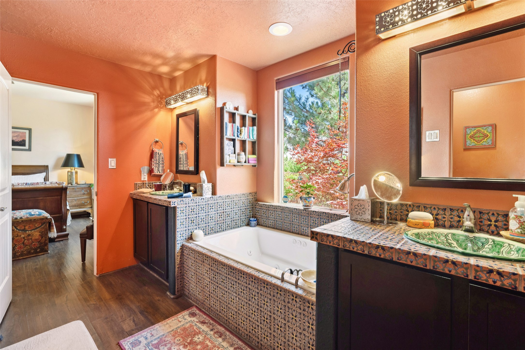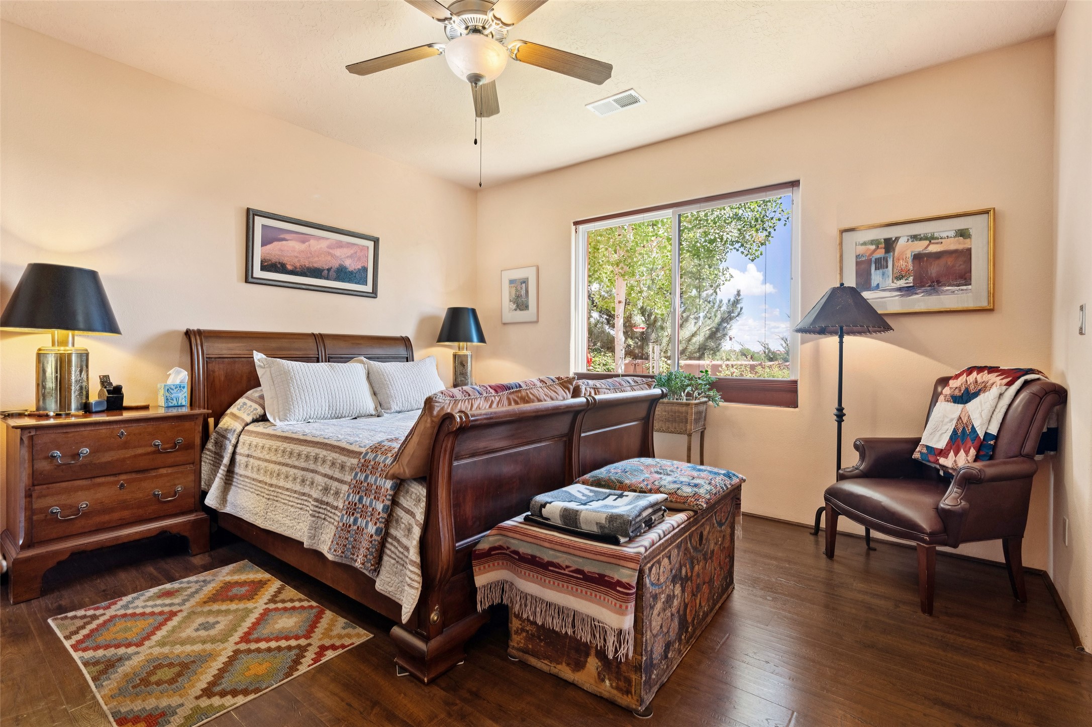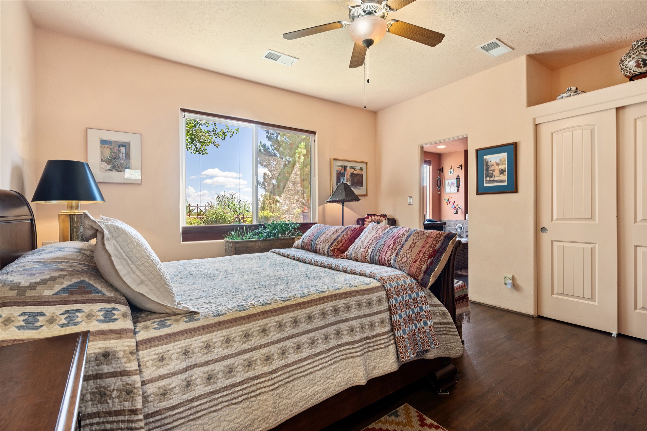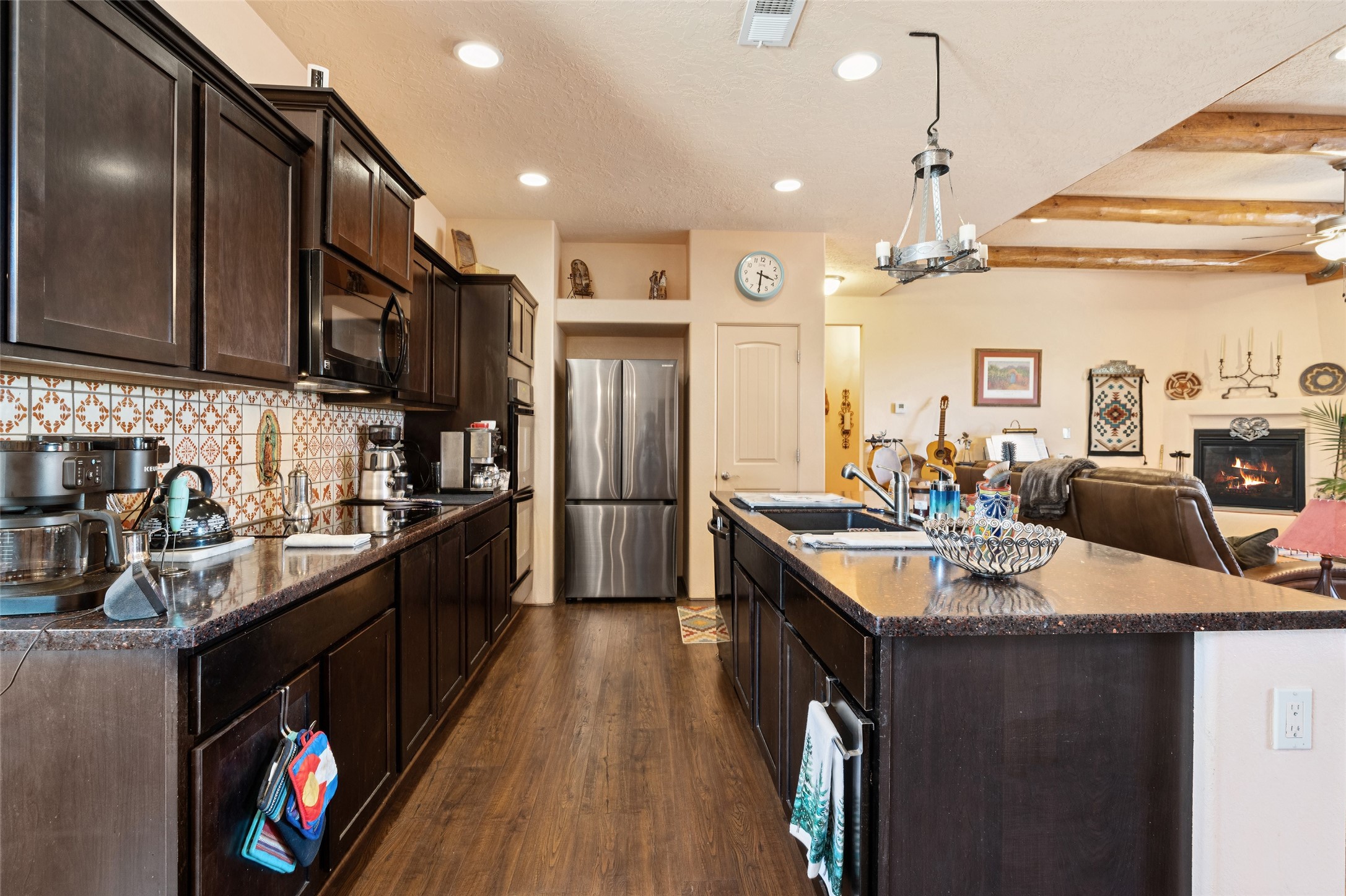 This is a beautifully maintained and loved home. It has that magical feel of Santa Fe without the super high price.There are views out the back of the Sandia Mountains, and it feels very private. The backyard is separated into two areas for easier care. There are lots of flowers! The living room is spacious and had Vigas added to enhance the appeal of the room. The Primary Bedroom is separate from the other bedrooms for added privacy. There are fantastic views of the backyard and beyond in the Primary as well as the Primary Bathroom. Beautiful Spanish tiles throughout the wet areas add a colorful and classic style. There are also vinyl (dark wood style) floors that look fantastic, will last for a very long time and are easy to care for. Drainage plan designed by builder - Garage concrete pad is raised 2 inches for drainage protection from driveway. Water is routed to the right of the property and drains away. Current owner has lived in the house for 8 years and through some major rainstorms with no issues. Come see this beautiful home today!