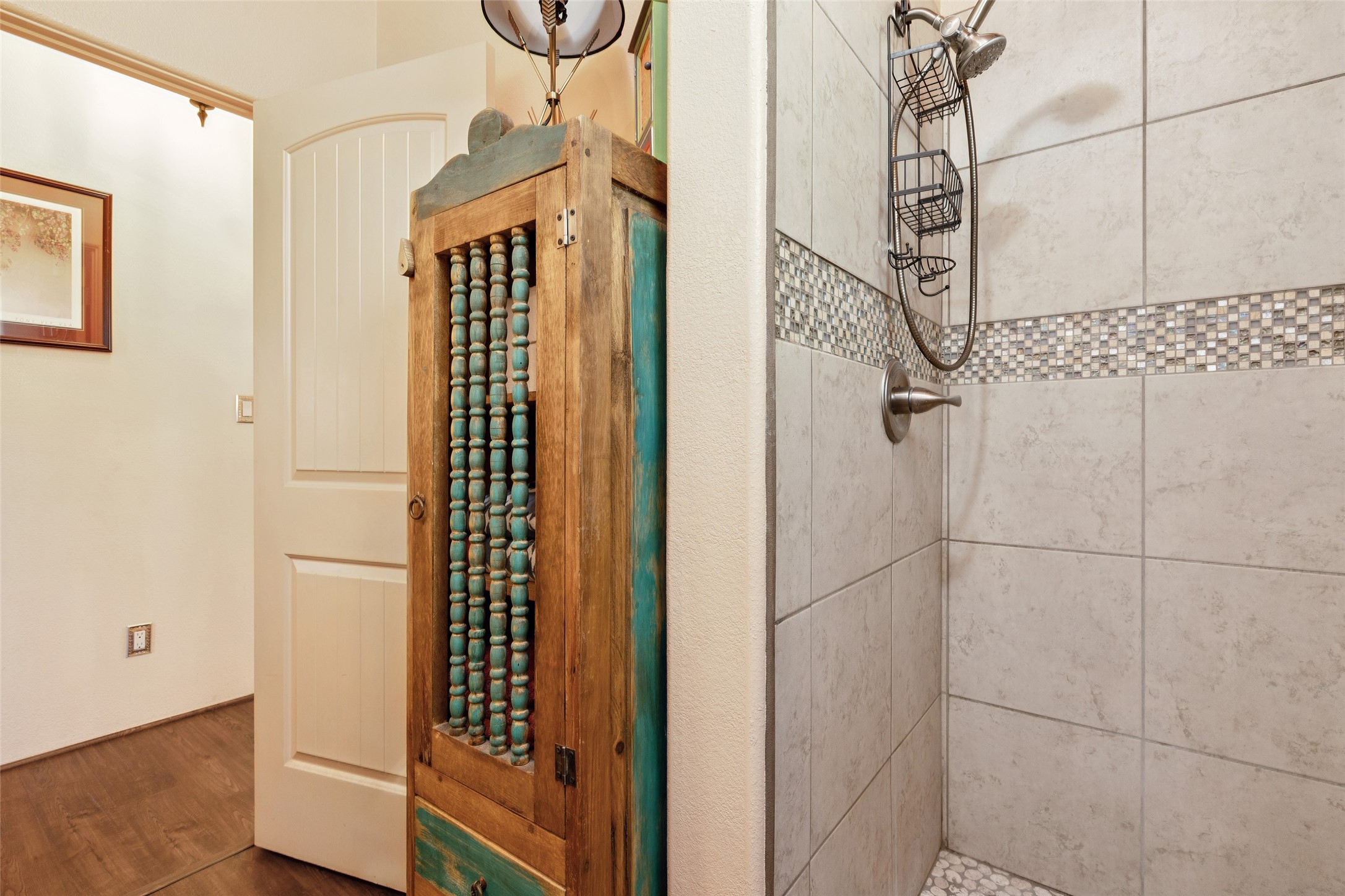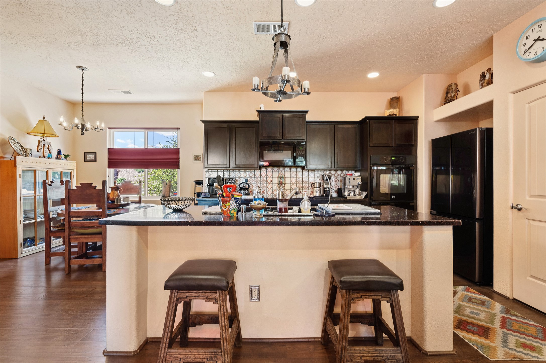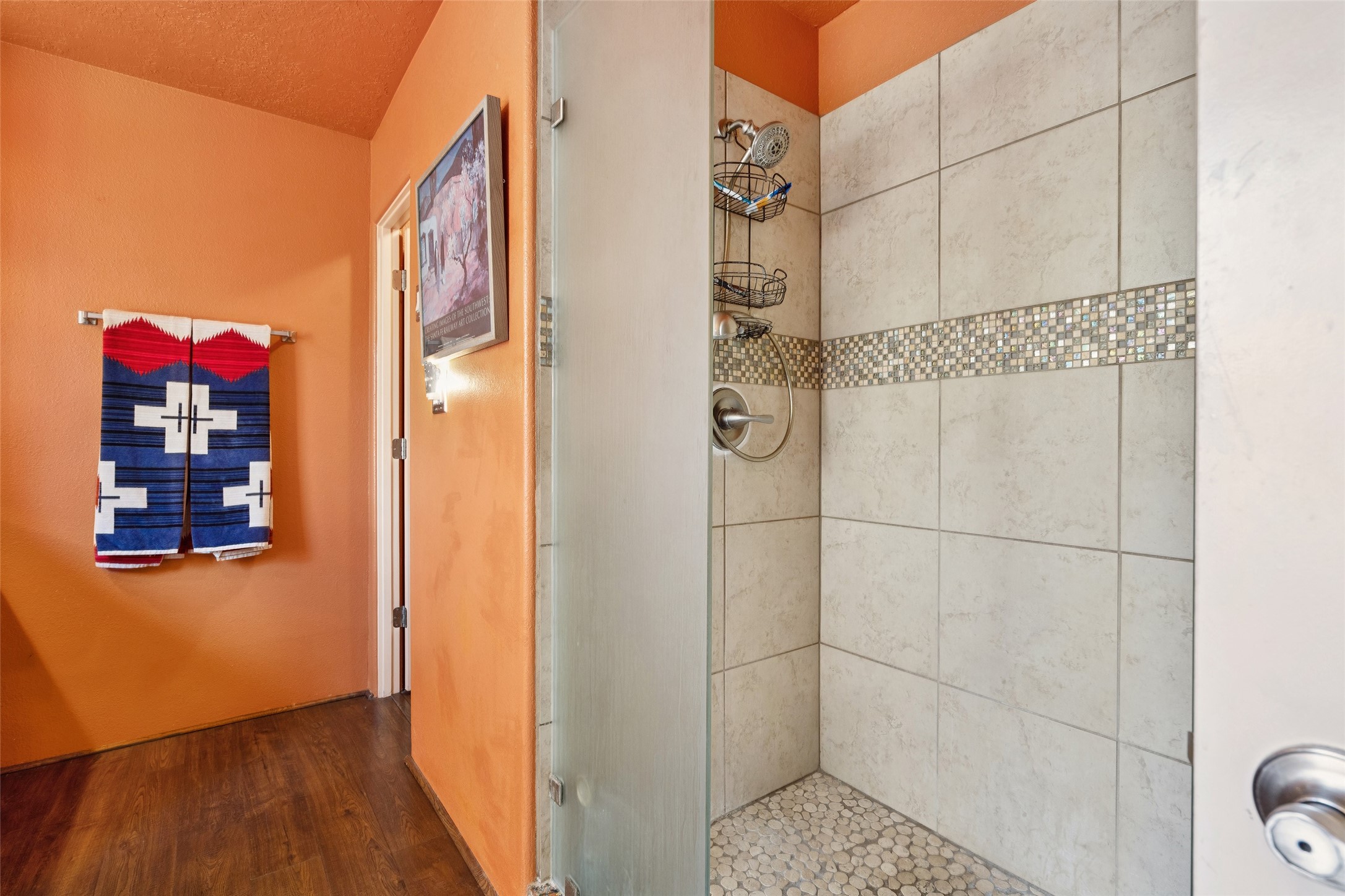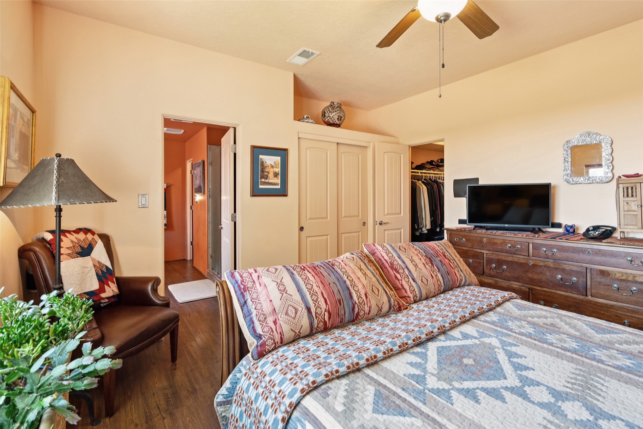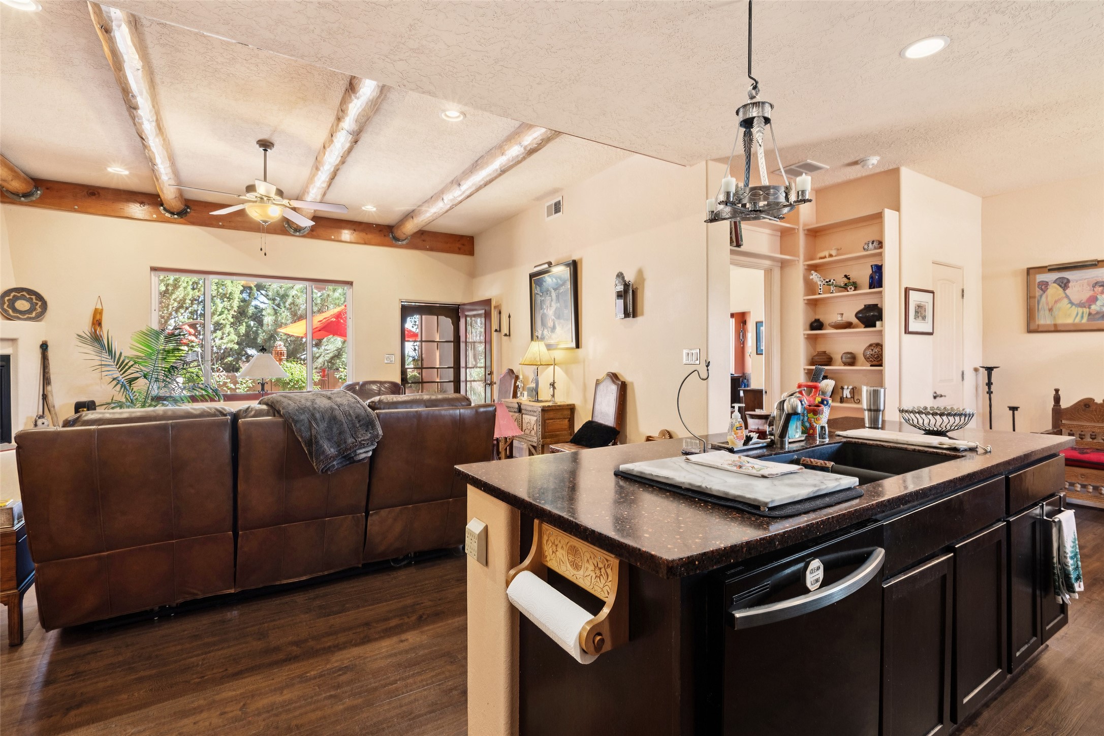 This is a beautifully maintained and loved home. It has that magical feel of Santa Fe without the super high price.There are views out the back of the Sandia Mountains, and it feels very private. The backyard is separated into two areas for easier care. There are lots of flowers! The living room is spacious and had Vigas added to enhance the appeal of the room. The Primary Bedroom is separate from the other bedrooms for added privacy. There are fantastic views of the backyard and beyond in the Primary as well as the Primary Bathroom. Beautiful Spanish tiles throughout the wet areas add a colorful and classic style. There are also vinyl (dark wood style) floors that look fantastic, will last for a very long time and are easy to care for. Drainage plan designed by builder - Garage concrete pad is raised 2 inches for drainage protection from driveway. Water is routed to the right of the property and drains away. Current owner has lived in the house for 8 years and through some major rainstorms with no issues. Come see this beautiful home today!