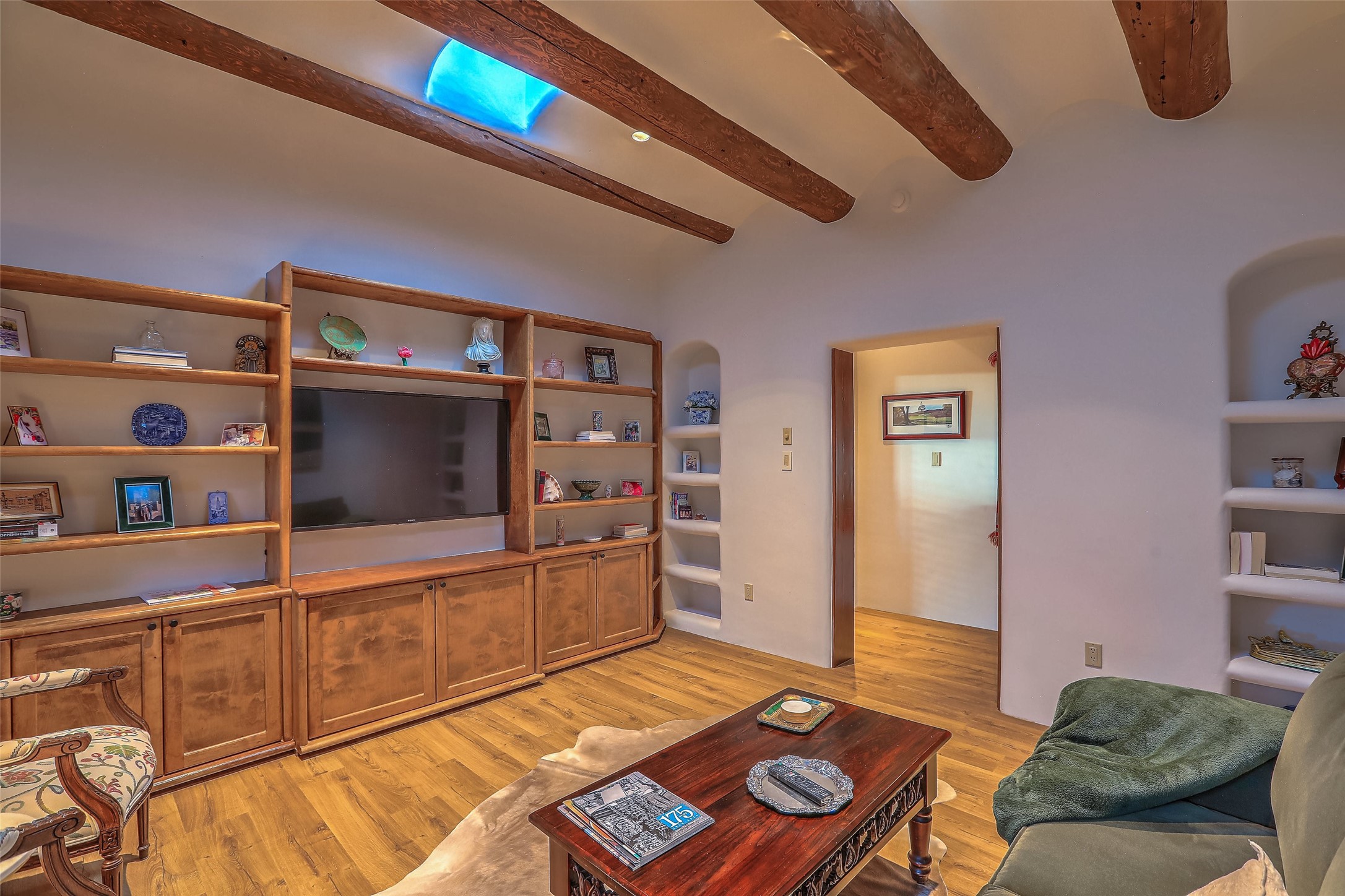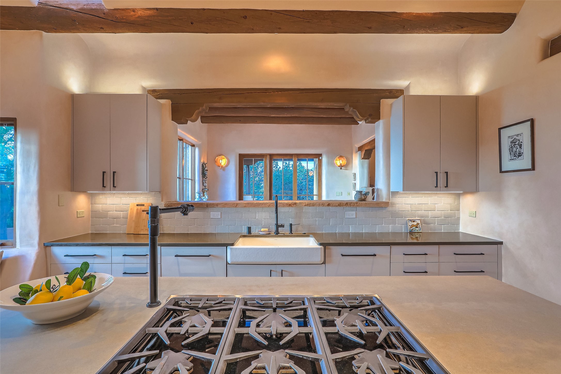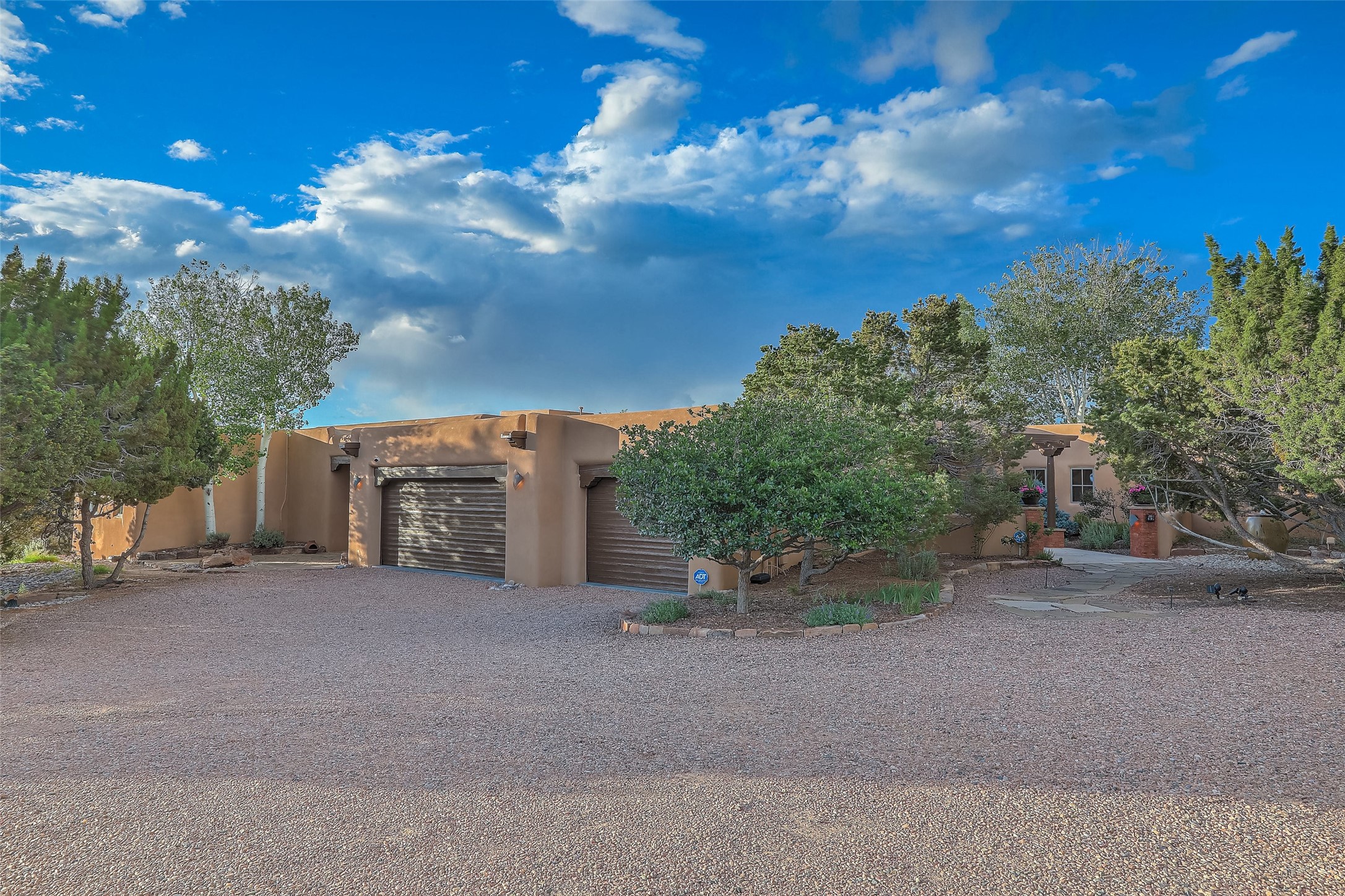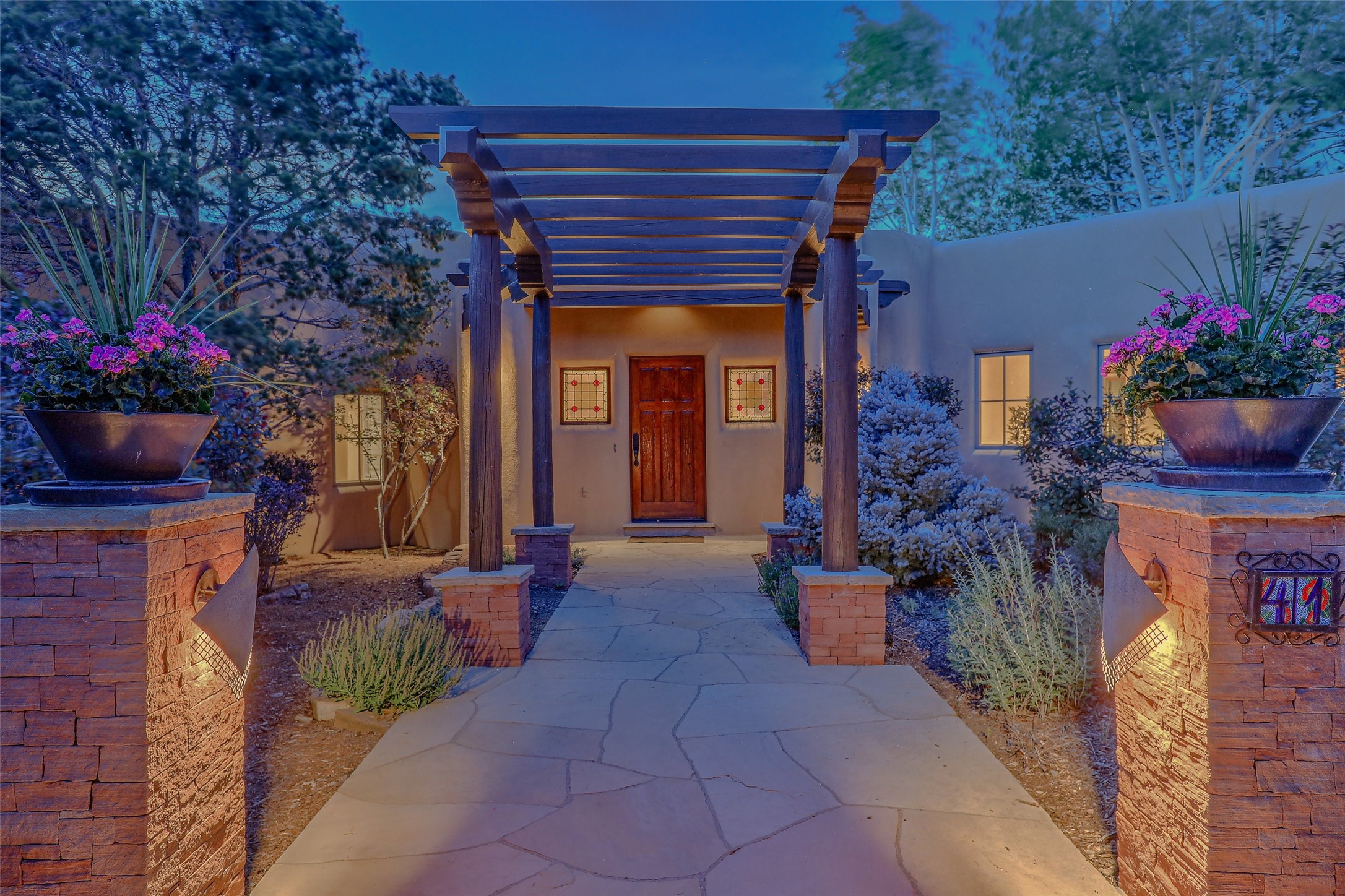 A past Showcase winner of the Grand Haciendas Parade of Homes, this newly upgraded Las Campanas beauty is luxurious and lovingly maintained. Impeccably remodeled with elegant and thoughtful upgrades and finishes throughout. Entering on a curving driveway this home is set back from the road and is extremely private. Mature trees and lovingly cared for yard and grounds. The views of Los Alamos and of the Jemez mountains and sunset views are breathtaking and always unique. This split 3 bedroom suite home has the Master Bedroom in a private wing with an adjacent den. Each bedroom has access to a private outdoor sitting area. The newer, beautiful contemporary kitchen with breakfast nook, has newer Thermador appliances. Bright inside with plaster walls and high viga ceilings throughout and the home includes travertine tile floors and quartz countertops. Ready for the new owner to enjoy this breathtaking Santa Fe home oasis. The dining and living room areas have easy access to a fabulous portal for outdoor al fresco enjoyment and relaxation with a fireplace and built-in outdoor gas grill. Adjacent areas thoughtfully designed outside patio spaces for additional enjoyment of Santa Fe's lovely starry night skies. Fountains and carefully cared for landscaping also surround the home. High quality Sonas sound technology system. About 866sf 3 car garage with cedar storage closet. Approximately 612sf total outdoor portal spaces which are comprised of 5 covered portals. On demand hot water system with a newer Kinetico whole house water softener system. About 10 minutes to town. We look forward to showing you this home, and we welcome you to come and see this distinguished home soon!
