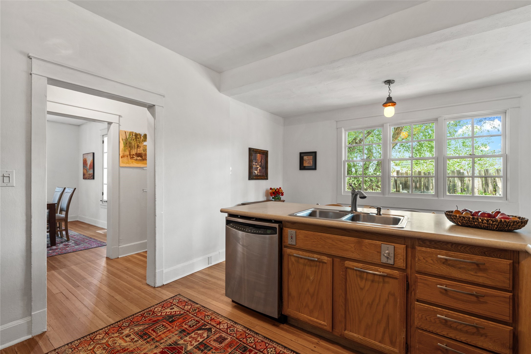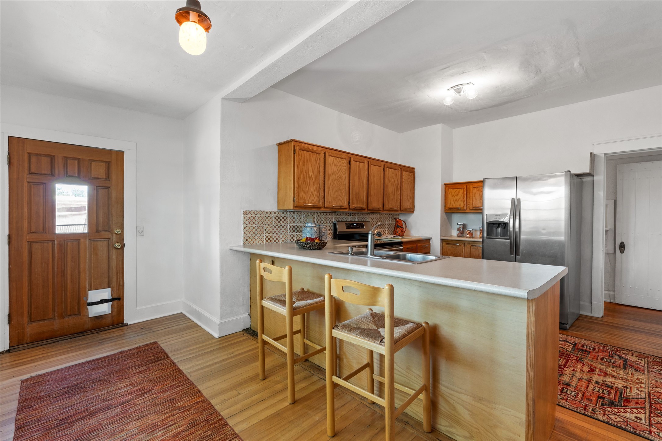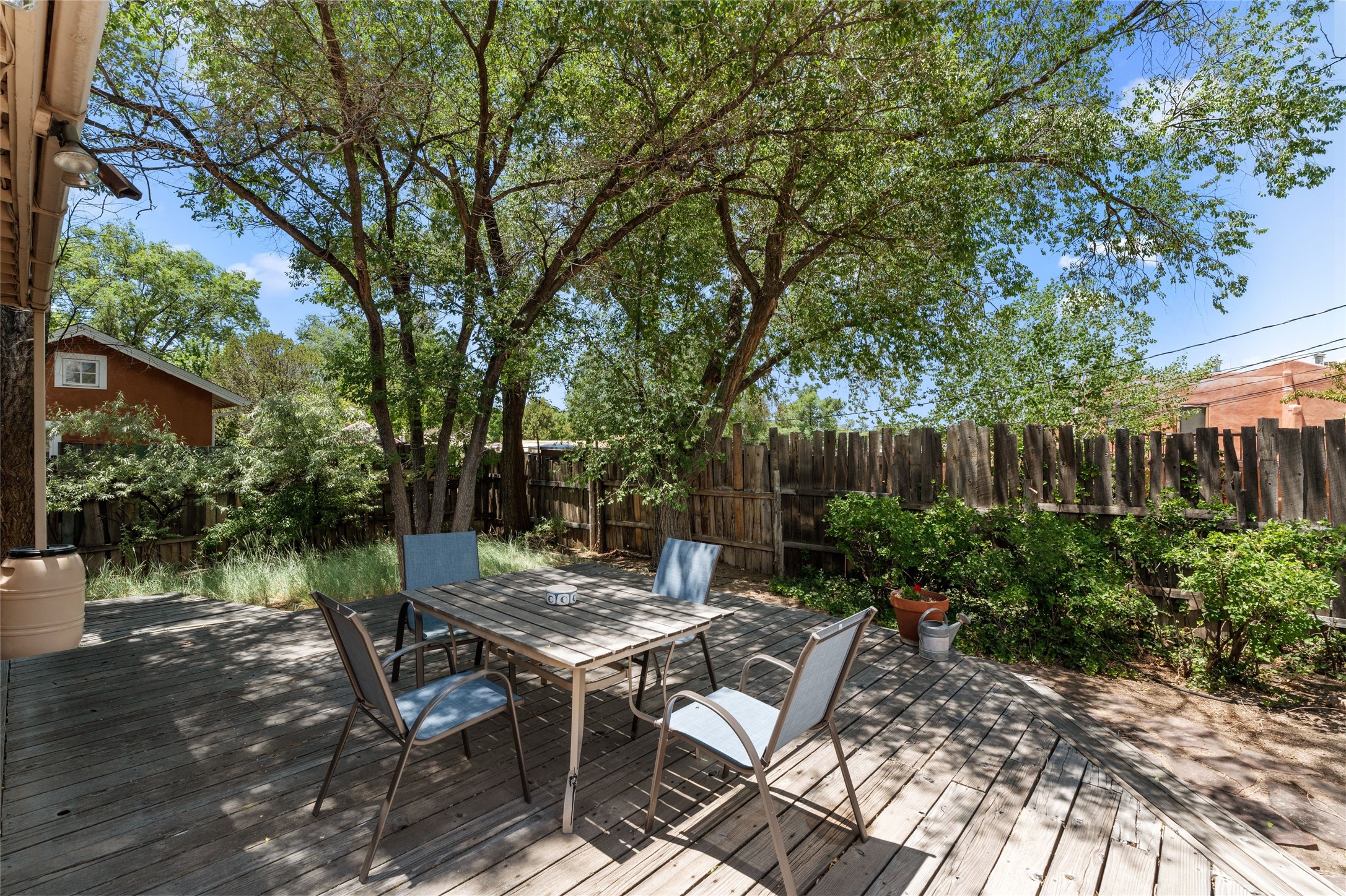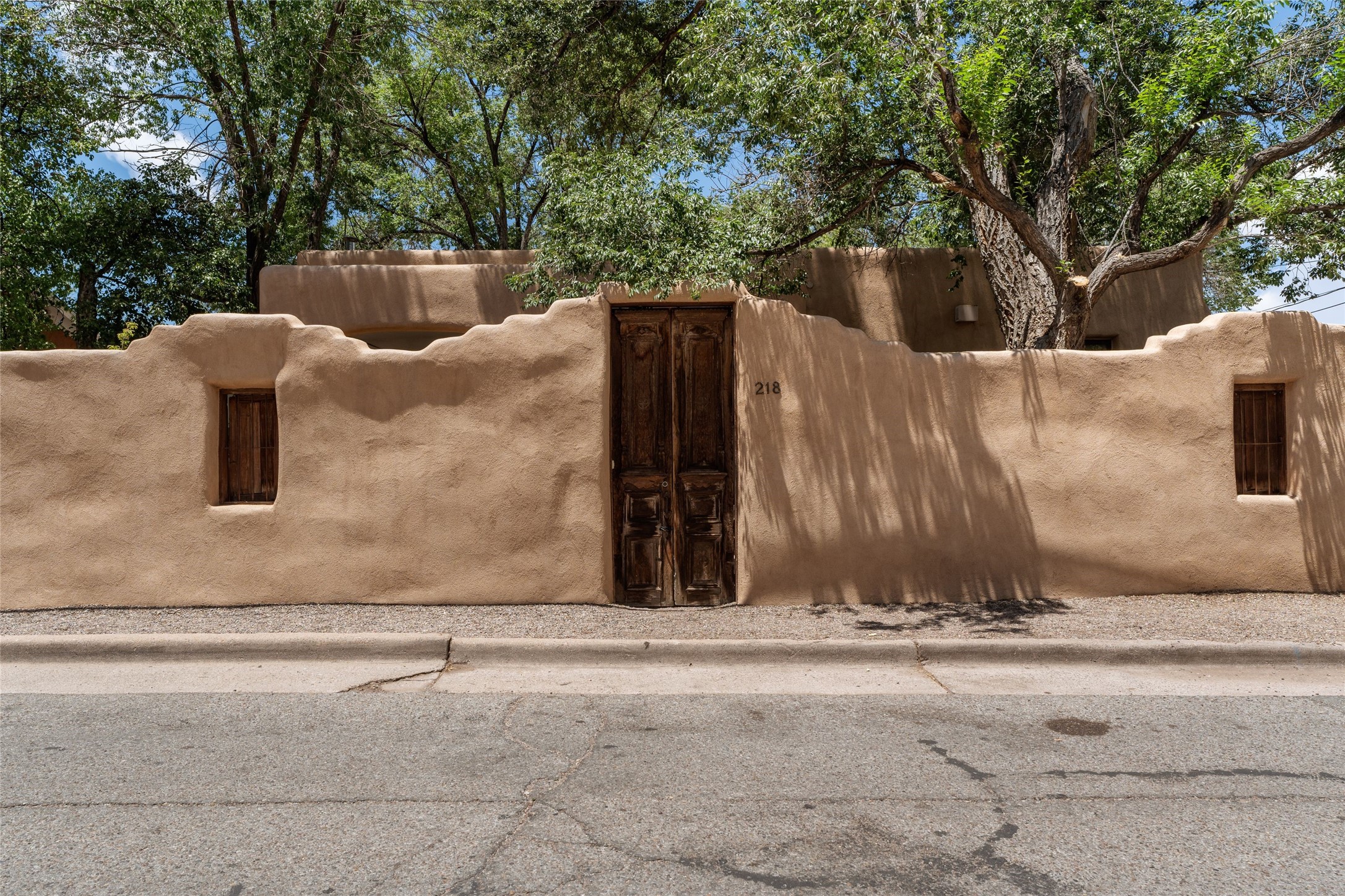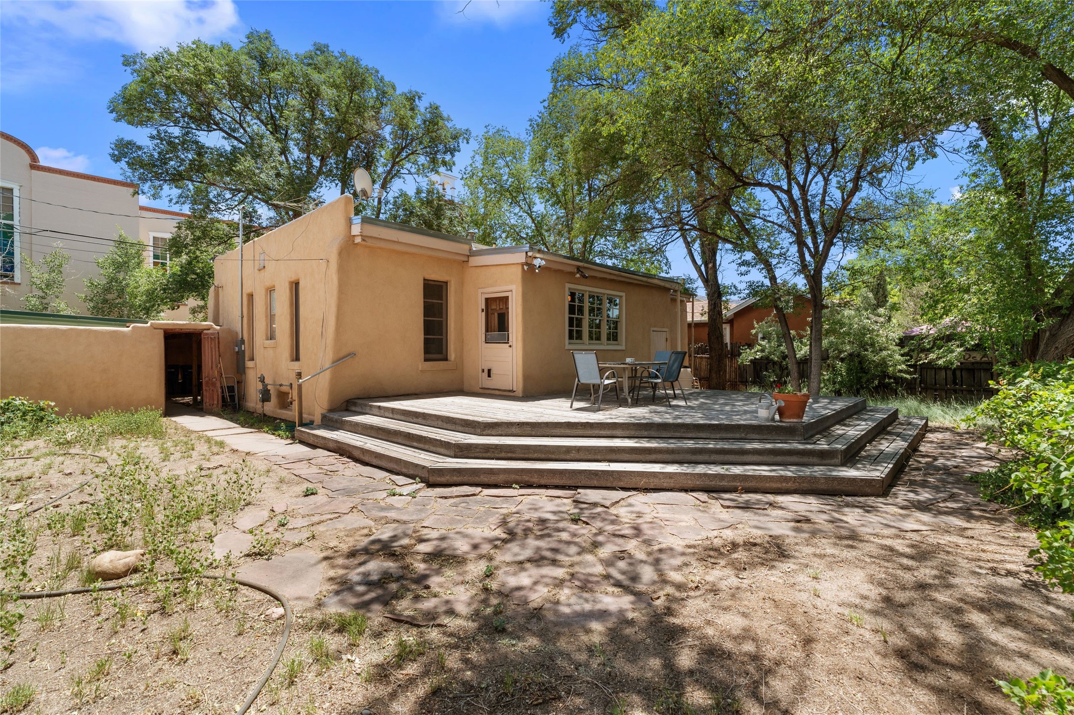 Be in the middle of it all! Iconic Santa Fe home in the Guadalupe District. A few easy blocks from the Historic Santa Fe Plaza and even closer to the Santa Fe Railyard Arts District and Farmer's Market. Seventy-five steps to the nearest coffee shop, 50 steps to the nearest restaurant. The house is light and airy with beautiful windows in every room still sporting their original 1930's brass hardware. The home has an open living and dining area with pocket doors, and a fireplace with Vermont Castings wood stove insert. The spacious kitchen looks out on the peaceful back yard and large, partially shaded redwood deck. There are two bedrooms and a large bathroom with both a shower and an elegant claw footed tub. Throughout the house there are wood floors including the kitchen and bathroom. The property is private, surrounded by a gated partial adobe wall and coyote fences with two covered off street parking spaces within the walled area. This super location is verry walkable, close to art galleries, shopping grocery stores museums, parks and access to Santa Fe's trail system--the best of Santa Fe is right out your front door from this lovely home, such a rare opportunity.
