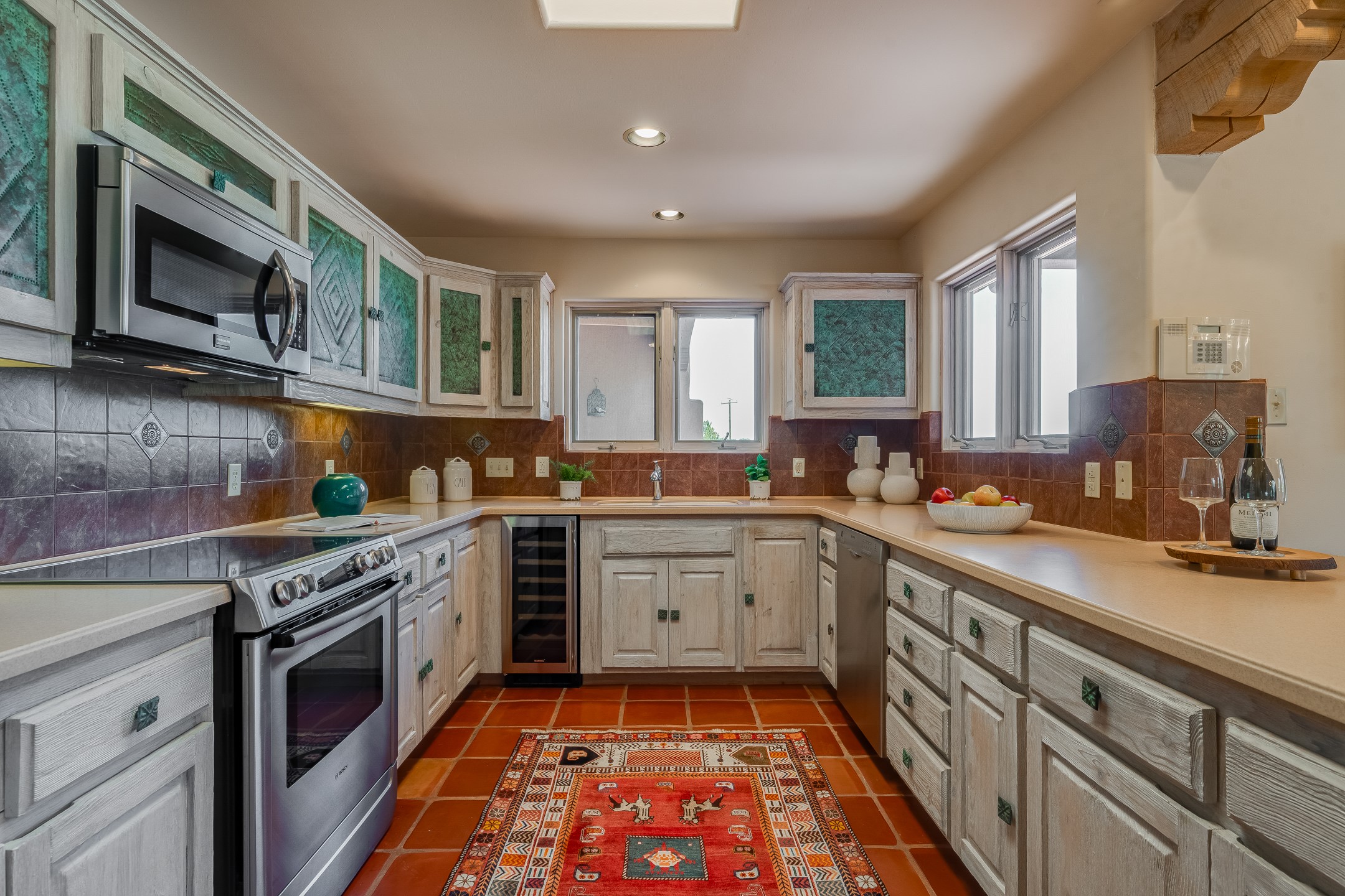 Southwestern charm meets modern comfort and functionality with this home with 3 peaceful acres with tranquil views of both sunrise and sunsets. This lovely property offers the best of rural living just minutes from the amenities of town. The home's open living area is warm and inviting, featuring Saltillo tile floors, high ceilings, and a traditional kiva fireplace--the perfect space to relax or entertain. The large master suite is a private sanctuary with its own sitting area and a second kiva fireplace, offering the kind of comfort and space that's rare to find. A separate bonus room with its own bath adds incredible flexibility--ideal as a guest suite, private office, or artist's studio. Additional features include community water, radiant in-floor heating, natural gas, and mini-split units for cooling, ensuring comfort year-round. Located in the Eldorado school system, this home offers a rare blend of privacy, convenience, and natural beauty. Home has been pre-inspected. If you have horses to bring, this property delivers with a two-stall barn, a half-acre turnout, and direct access to an easement which can be used for riding. Whether you want to saddle up or just take a peaceful hike, you can head out your back door.