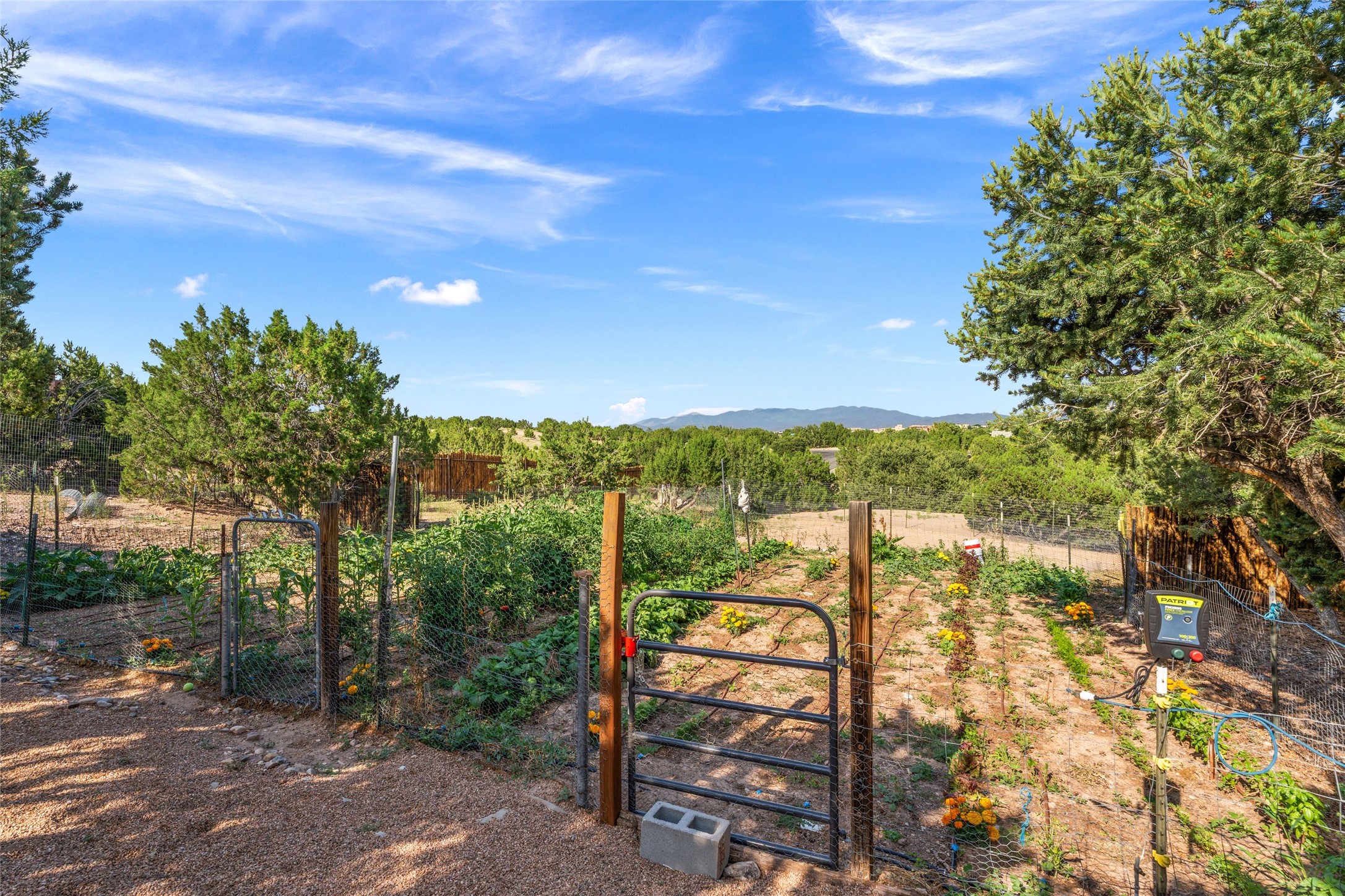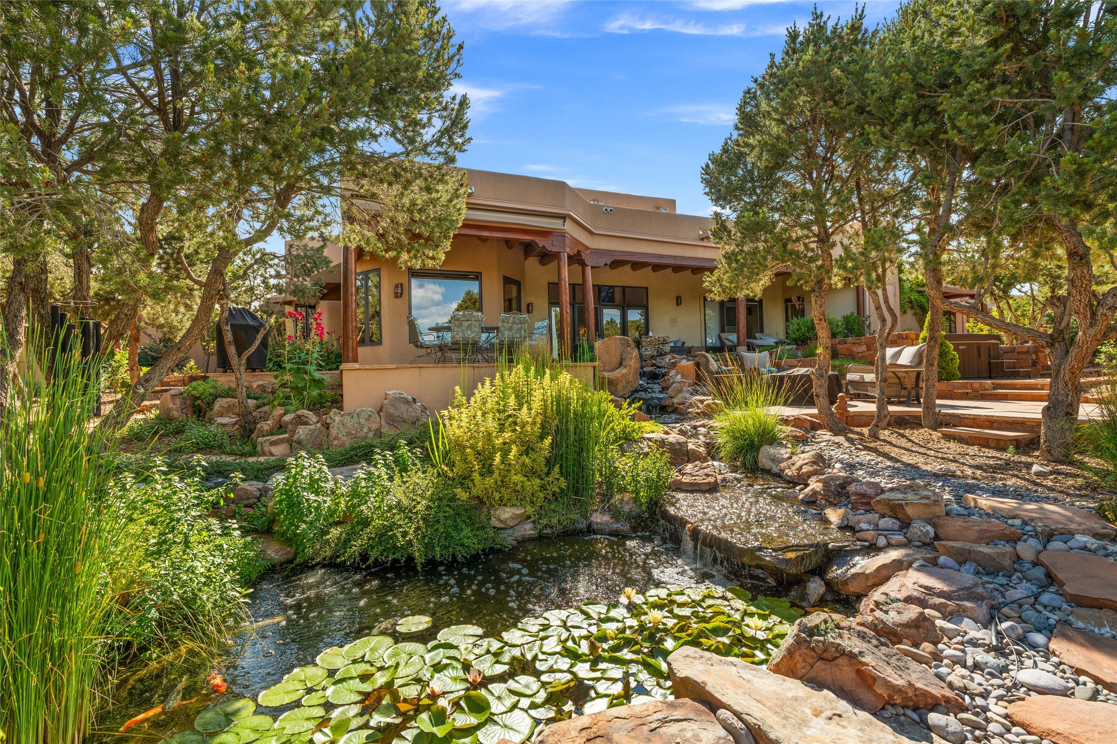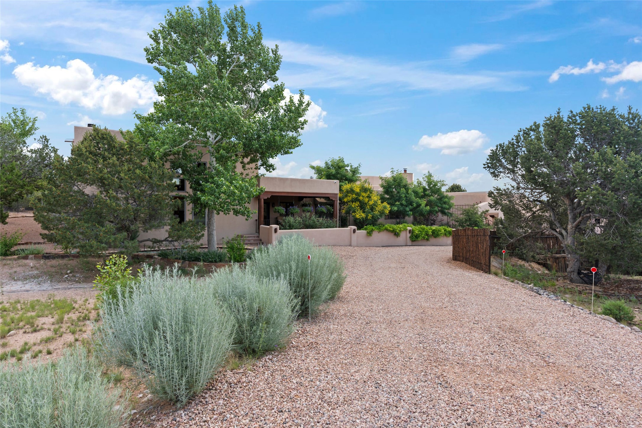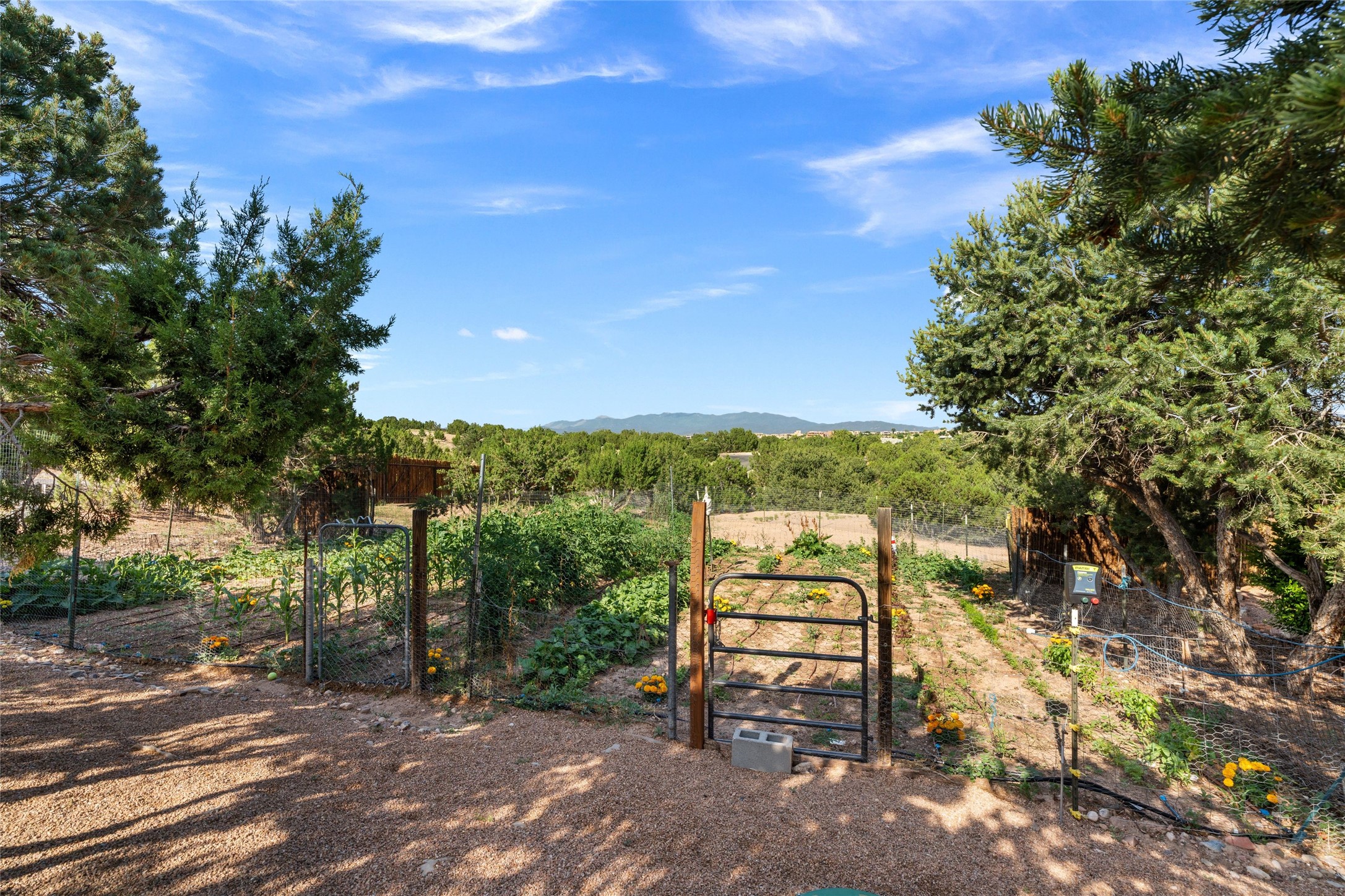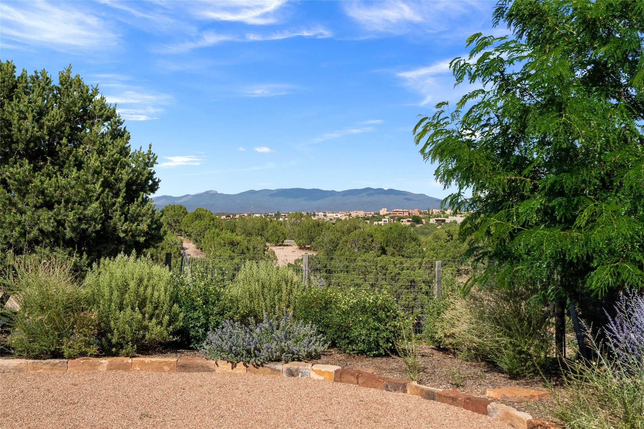 A true Santa Fe masterpiece, this luxurious estate seamlessly blends art, architecture, and nature on a serene 2.46-acre lot with breathtaking views of the Sangre de Cristo mountains. Designed for comfort, sustainability, and inspired living, this extraordinary property offers every amenity for the discerning homeowner.Notable features include double and single-car garages plus a large RV garage, ideal for car enthusiasts, adventure seekers or workshop. The 62-panel solar system and five 2,500-gallon interconnected buried cisterns support an eco-conscious lifestyle, while the extensive drip irrigation system nourishes a lush 1,000 sq. ft. irrigated vegetable garden, orchard (peach, apple, and plum trees), a berry patch bursting with blueberries, blackberries, and raspberries.Enjoy miles of hiking, biking, and horseback riding trails just across the street, or relax in your private oasis with green space bordering the eastern edge of the property, a tranquil water feature with Koi pond, and multiple covered outdoor entertaining spaces, including a plumbed gas fire pit and a fully insulated hot tub.Inside, comfort and luxury abound with radiant floor heating throughout, mini-split systems for cooling, and a security system with cameras. The heart of the home is the spectacular Great Hall, anchored by a gas fireplace, and offering soaring ceilings and an atmosphere of timeless elegance and opening to outdoor spaces. Additional highlights include a top-of-the-line chef's kitchen, butler's pantry, and a quilting/art studio.The estate also includes a charming 2-bedroom guest house and a spacious 2-bedroom studio, also with Sangre de Cristo mountains views. Perfect for guests, extended family, or creative workspaces.There is ample parking for guests and extra vehicles, this estate is ideal for entertaining or enjoying peaceful privacy and solitude. A rare opportunity to own a truly magical home that celebrates the best of indoor-outdoor living in Santa Fe.