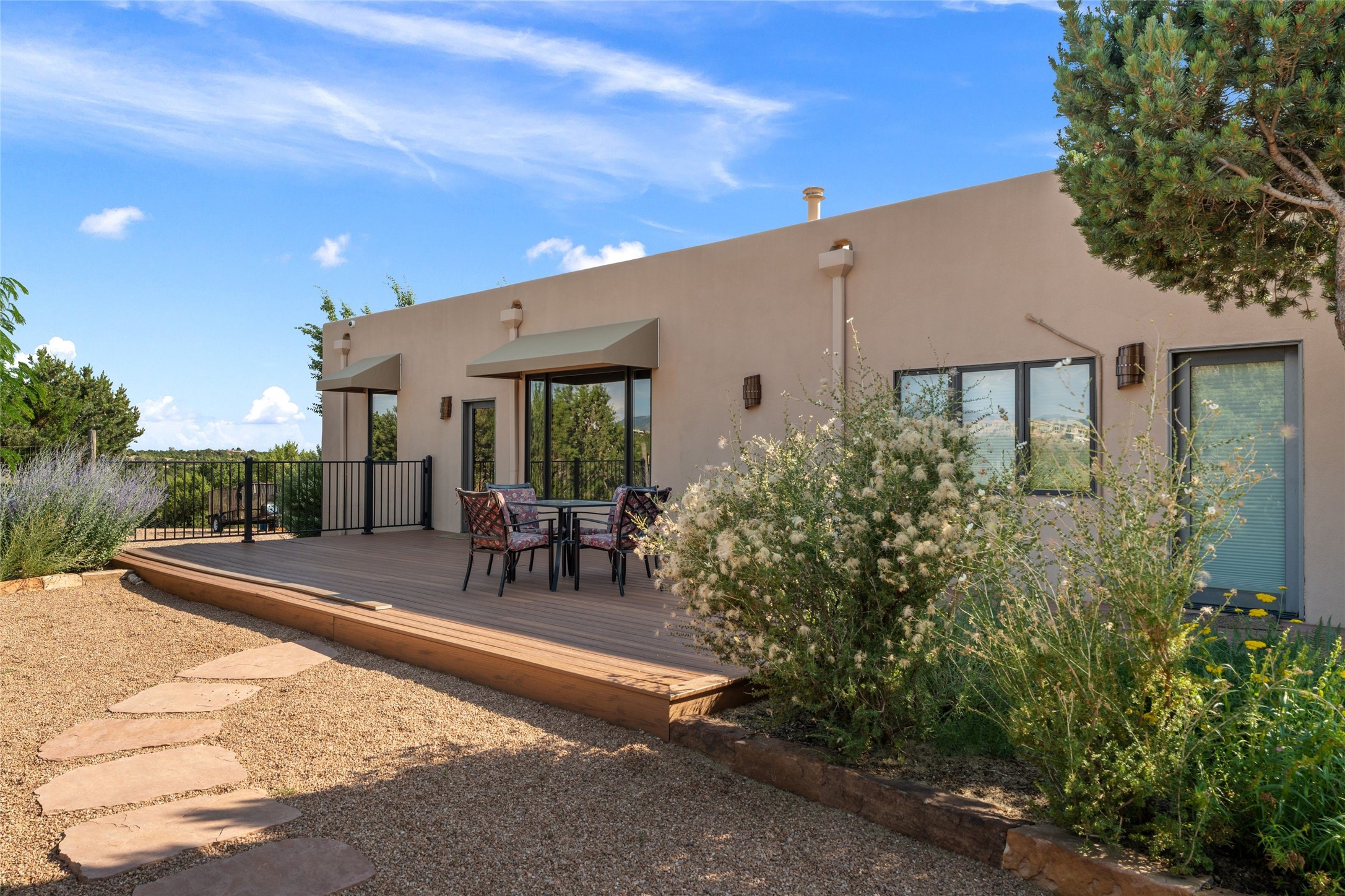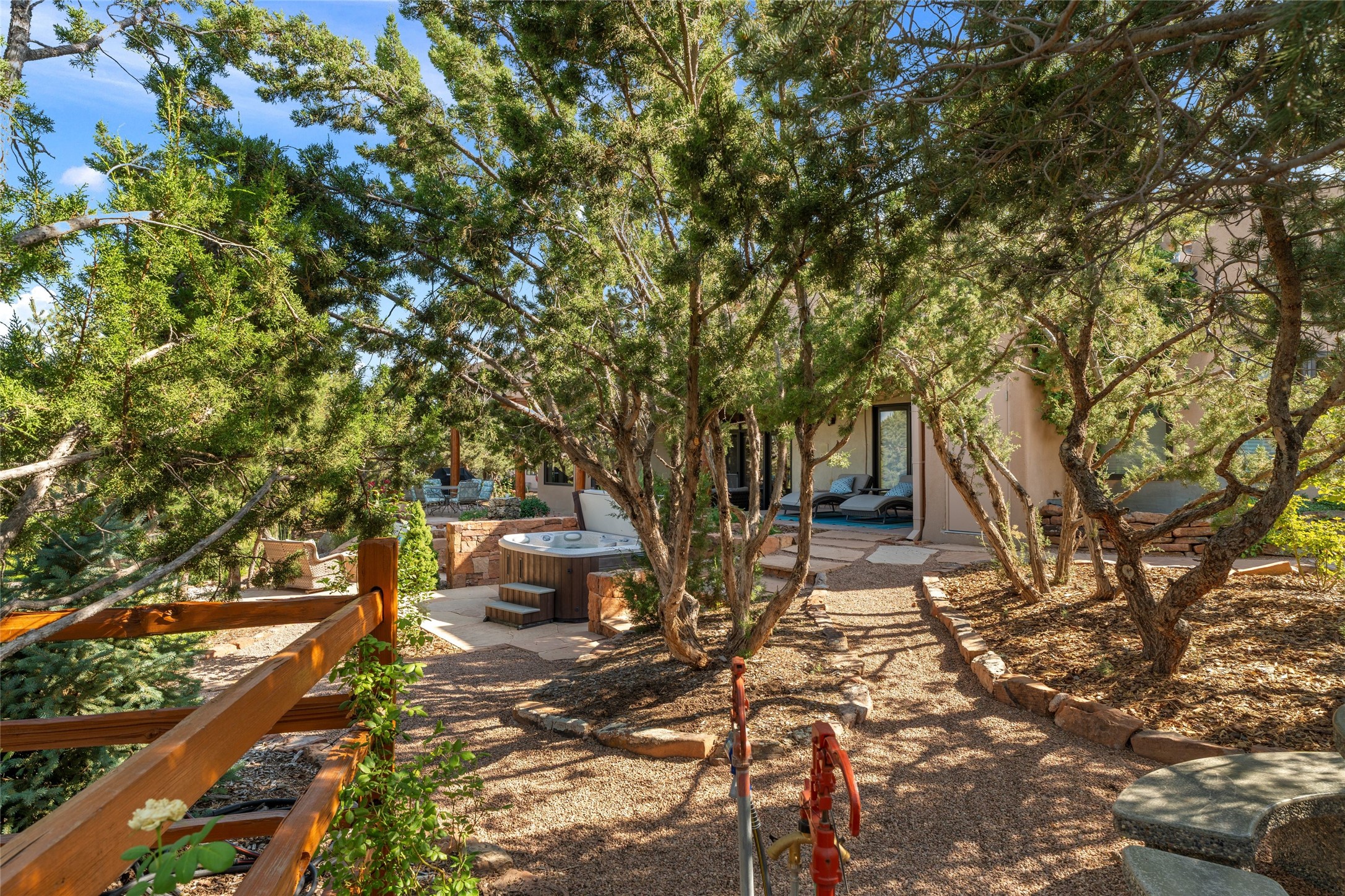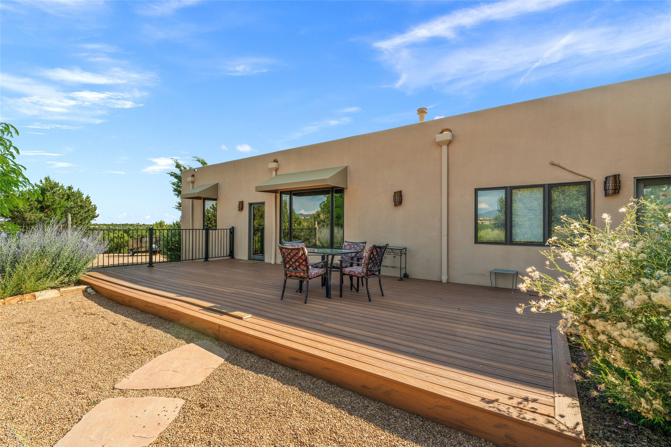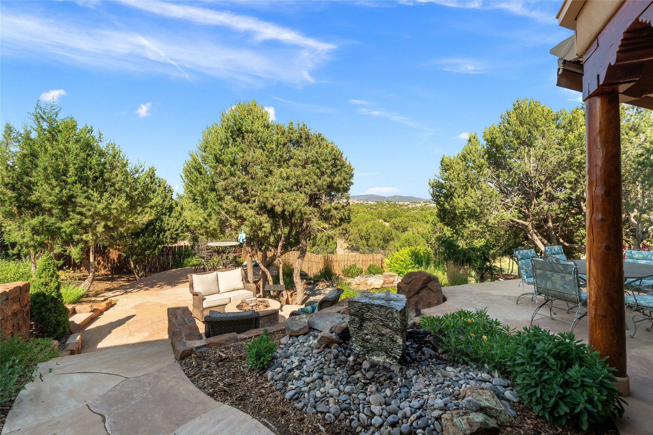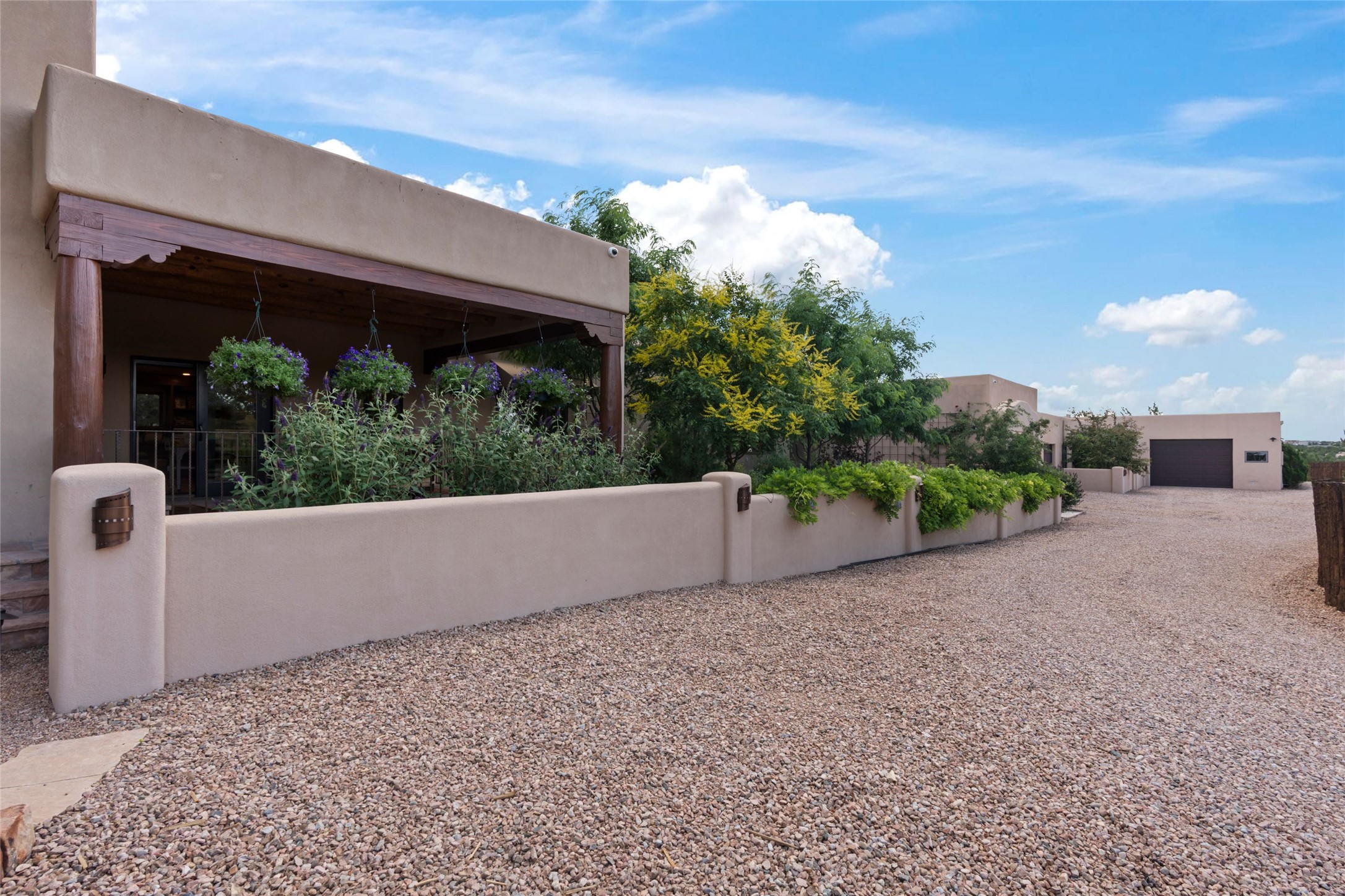 A true Santa Fe masterpiece, this luxurious estate seamlessly blends art, architecture, and nature on a serene 2.46-acre lot with breathtaking views of the Sangre de Cristo mountains. Designed for comfort, sustainability, and inspired living, this extraordinary property offers every amenity for the discerning homeowner.Notable features include double and single-car garages plus a large RV garage, ideal for car enthusiasts, adventure seekers or workshop. The 62-panel solar system and five 2,500-gallon interconnected buried cisterns support an eco-conscious lifestyle, while the extensive drip irrigation system nourishes a lush 1,000 sq. ft. irrigated vegetable garden, orchard (peach, apple, and plum trees), a berry patch bursting with blueberries, blackberries, and raspberries.Enjoy miles of hiking, biking, and horseback riding trails just across the street, or relax in your private oasis with green space bordering the eastern edge of the property, a tranquil water feature with Koi pond, and multiple covered outdoor entertaining spaces, including a plumbed gas fire pit and a fully insulated hot tub.Inside, comfort and luxury abound with radiant floor heating throughout, mini-split systems for cooling, and a security system with cameras. The heart of the home is the spectacular Great Hall, anchored by a gas fireplace, and offering soaring ceilings and an atmosphere of timeless elegance and opening to outdoor spaces. Additional highlights include a top-of-the-line chef's kitchen, butler's pantry, and a quilting/art studio.The estate also includes a charming 2-bedroom guest house and a spacious 2-bedroom studio, also with Sangre de Cristo mountains views. Perfect for guests, extended family, or creative workspaces.There is ample parking for guests and extra vehicles, this estate is ideal for entertaining or enjoying peaceful privacy and solitude. A rare opportunity to own a truly magical home that celebrates the best of indoor-outdoor living in Santa Fe.