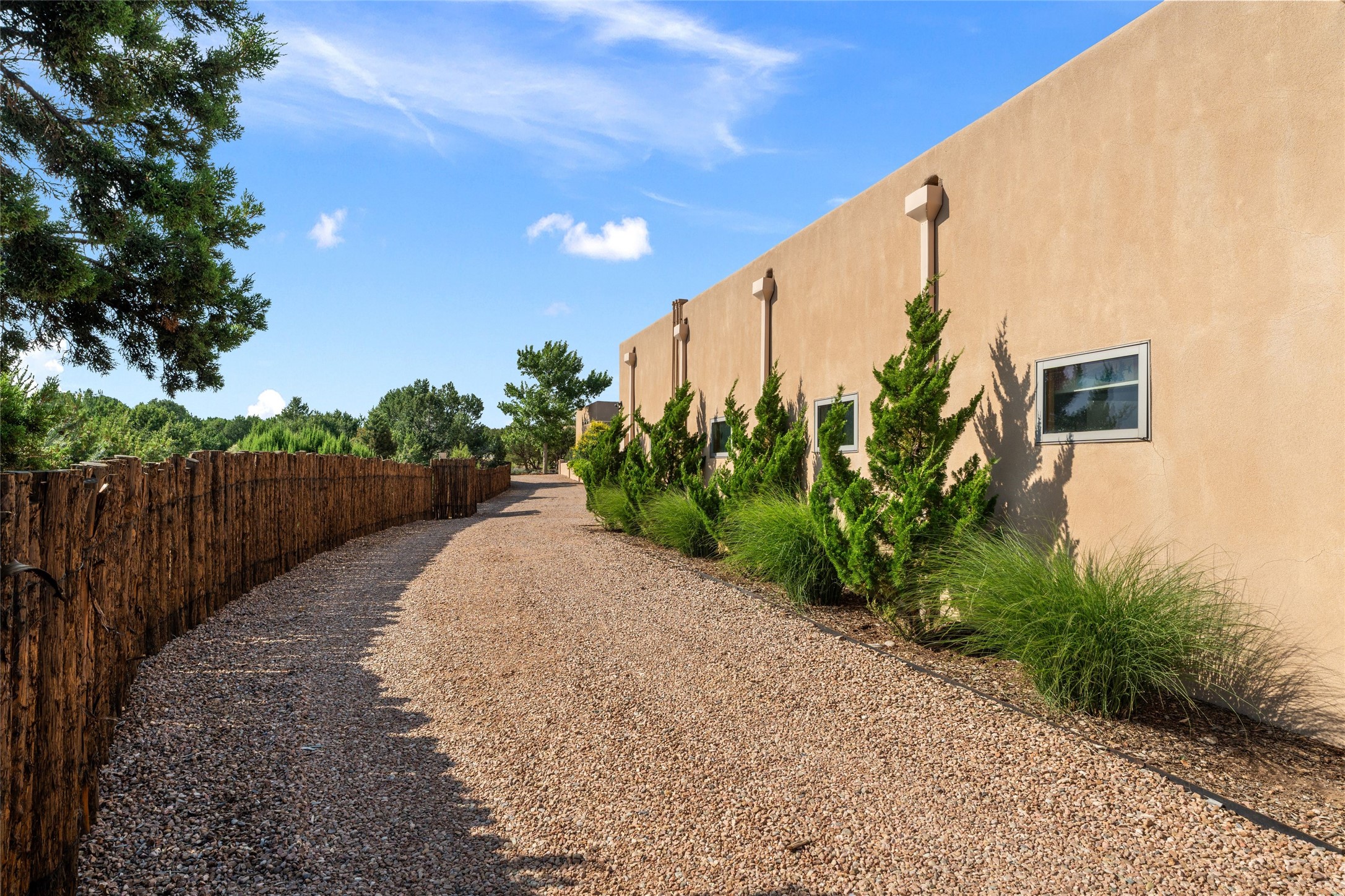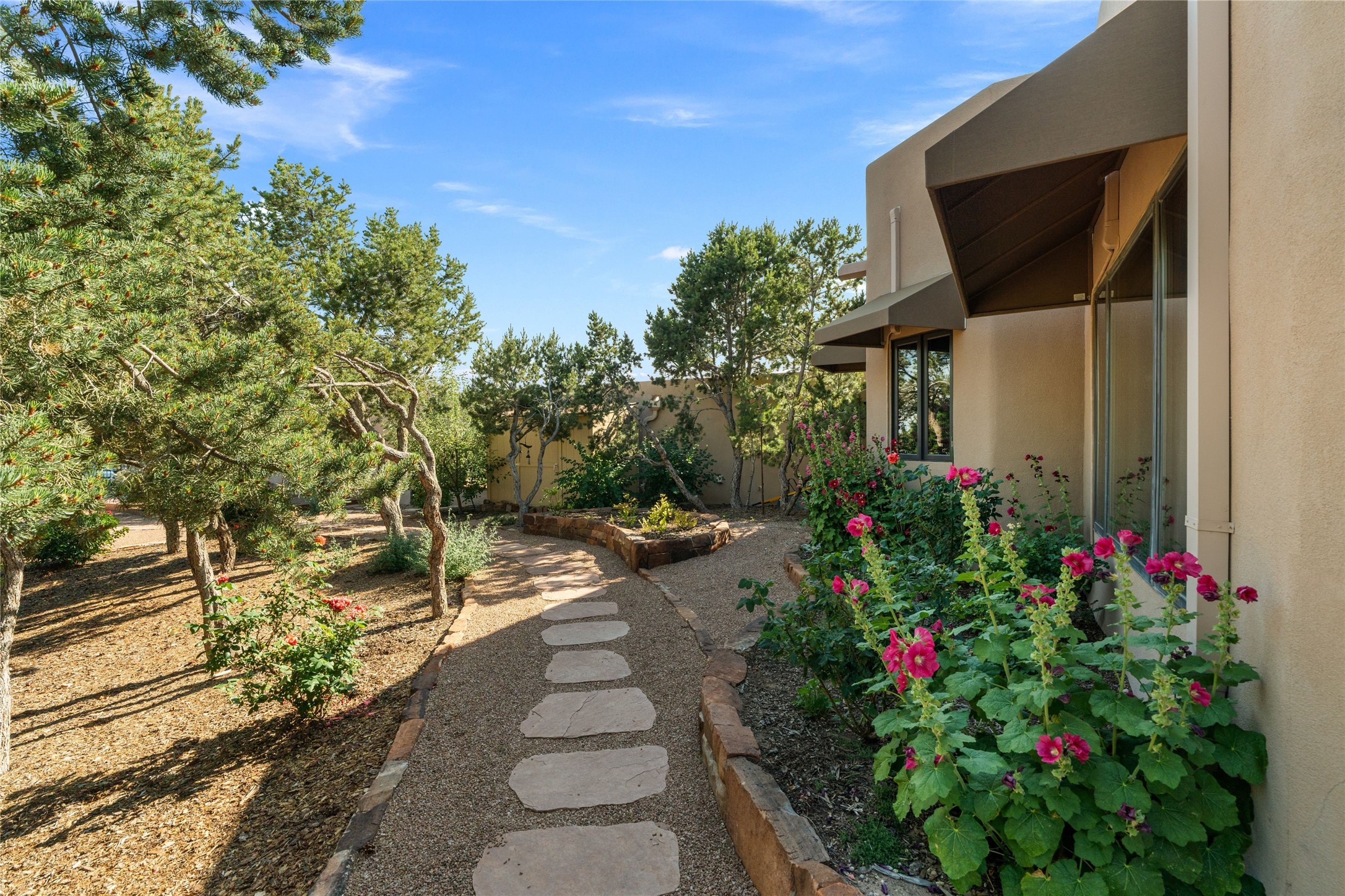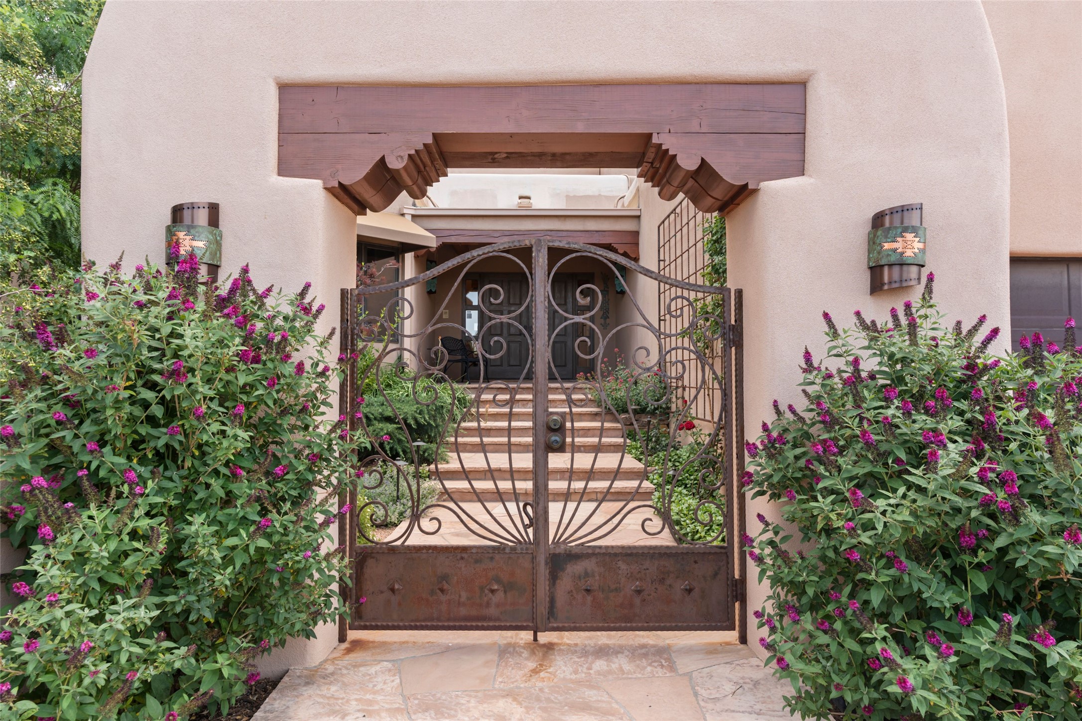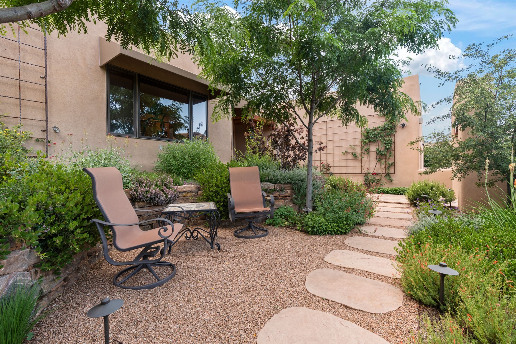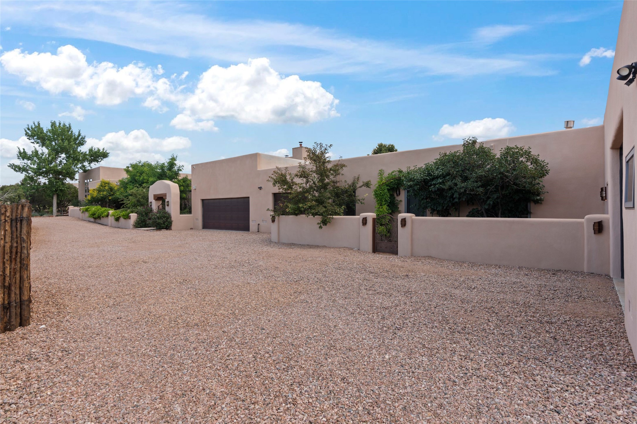A true Santa Fe masterpiece, this luxurious estate seamlessly blends art, architecture, and nature on a serene 2.46-acre lot with breathtaking views of the Sangre de Cristo mountains. Designed for comfort, sustainability, and inspired living, this extraordinary property offers every amenity for the discerning homeowner.Notable features include double and single-car garages plus a large RV garage, ideal for car enthusiasts, adventure seekers or workshop. The 62-panel solar system and five 2,500-gallon interconnected buried cisterns support an eco-conscious lifestyle, while the extensive drip irrigation system nourishes a lush 1,000 sq. ft. irrigated vegetable garden, orchard (peach, apple, and plum trees), a berry patch bursting with blueberries, blackberries, and raspberries.Enjoy miles of hiking, biking, and horseback riding trails just across the street, or relax in your private oasis with green space bordering the eastern edge of the property, a tranquil water feature with Koi pond, and multiple covered outdoor entertaining spaces, including a plumbed gas fire pit and a fully insulated hot tub.Inside, comfort and luxury abound with radiant floor heating throughout, mini-split systems for cooling, and a security system with cameras. The heart of the home is the spectacular Great Hall, anchored by a gas fireplace, and offering soaring ceilings and an atmosphere of timeless elegance and opening to outdoor spaces. Additional highlights include a top-of-the-line chef's kitchen, butler's pantry, and a quilting/art studio.The estate also includes a charming 2-bedroom guest house and a spacious 2-bedroom studio, also with Sangre de Cristo mountains views. Perfect for guests, extended family, or creative workspaces.There is ample parking for guests and extra vehicles, this estate is ideal for entertaining or enjoying peaceful privacy and solitude. A rare opportunity to own a truly magical home that celebrates the best of indoor-outdoor living in Santa Fe.