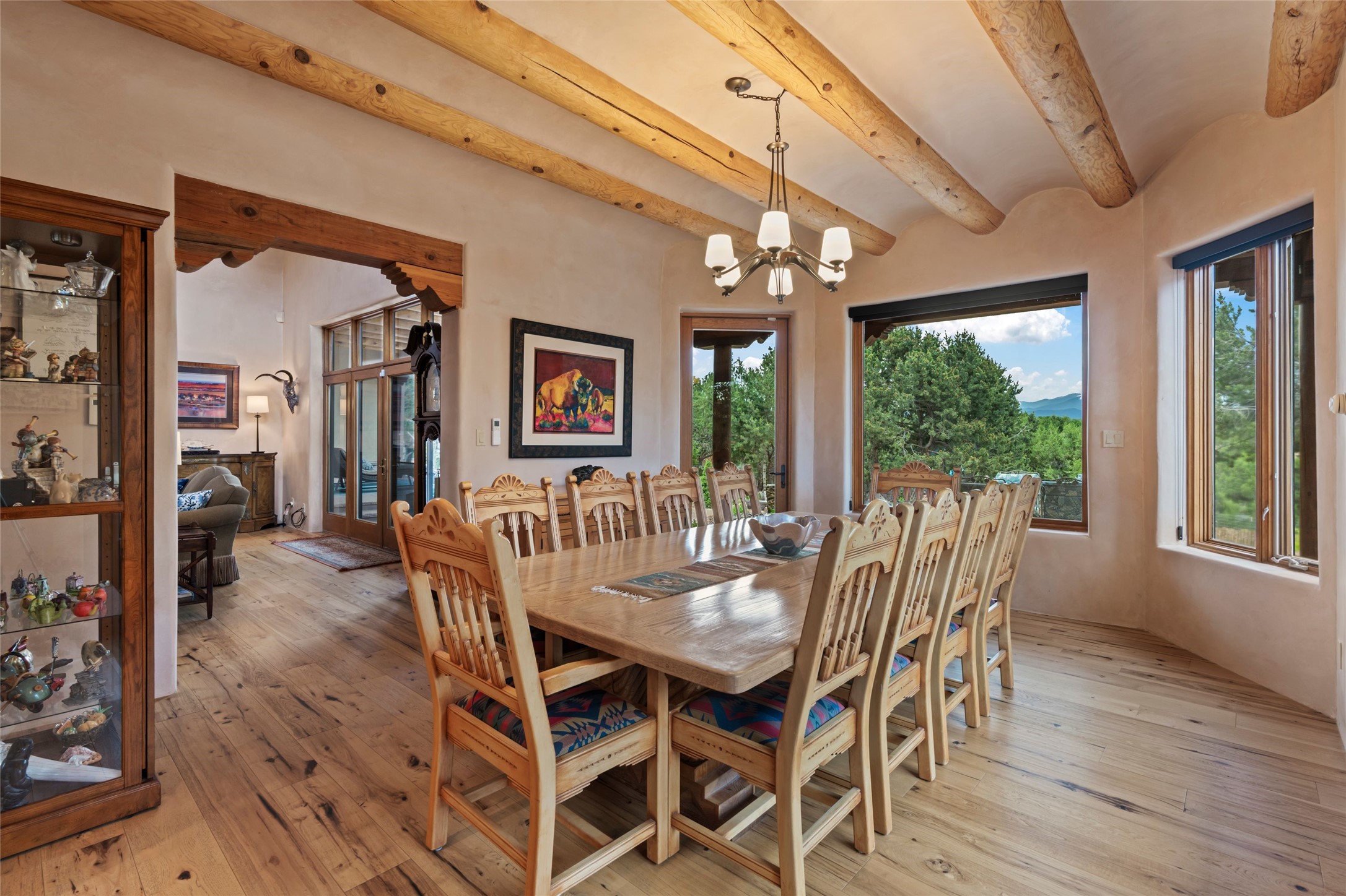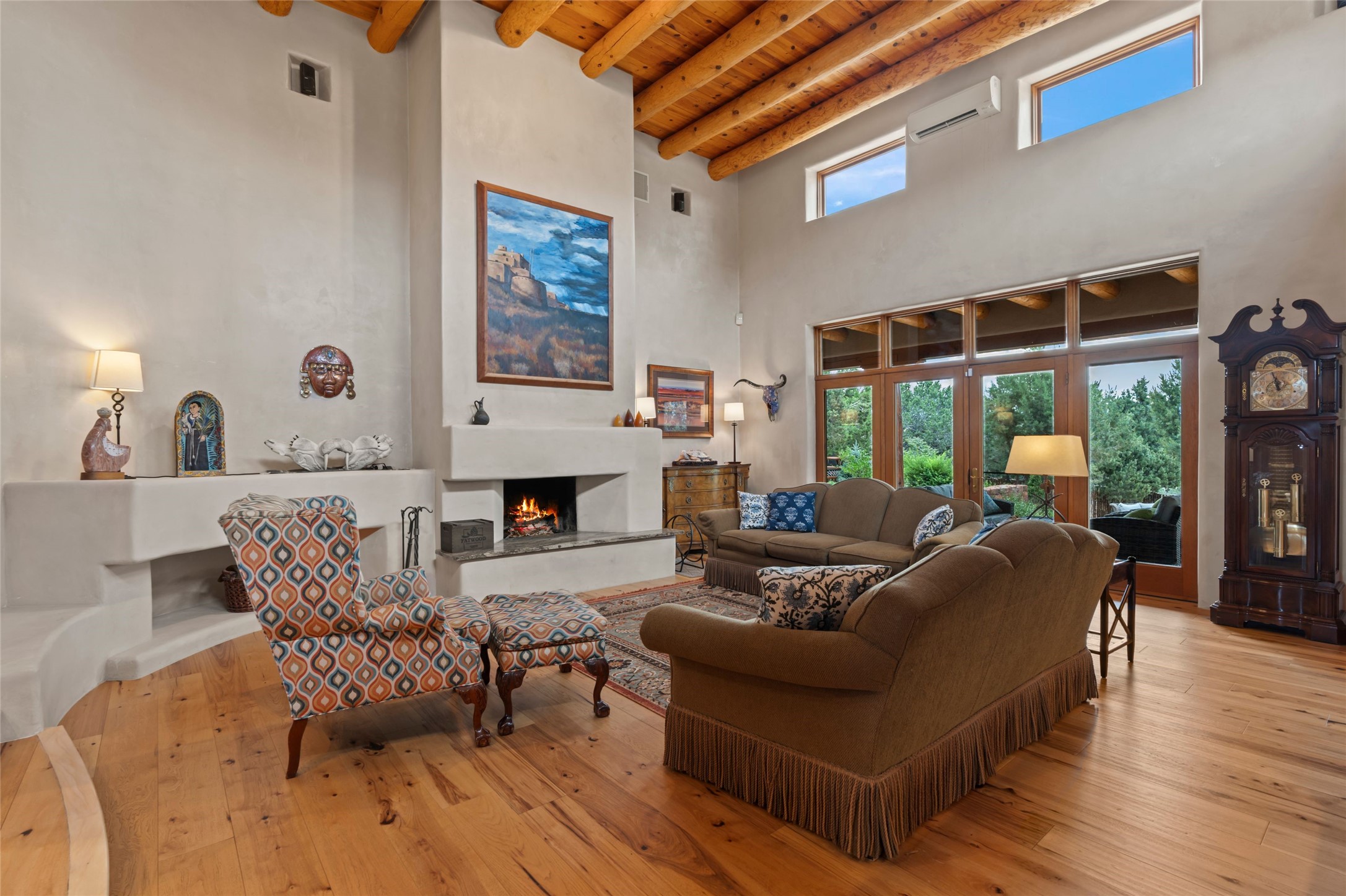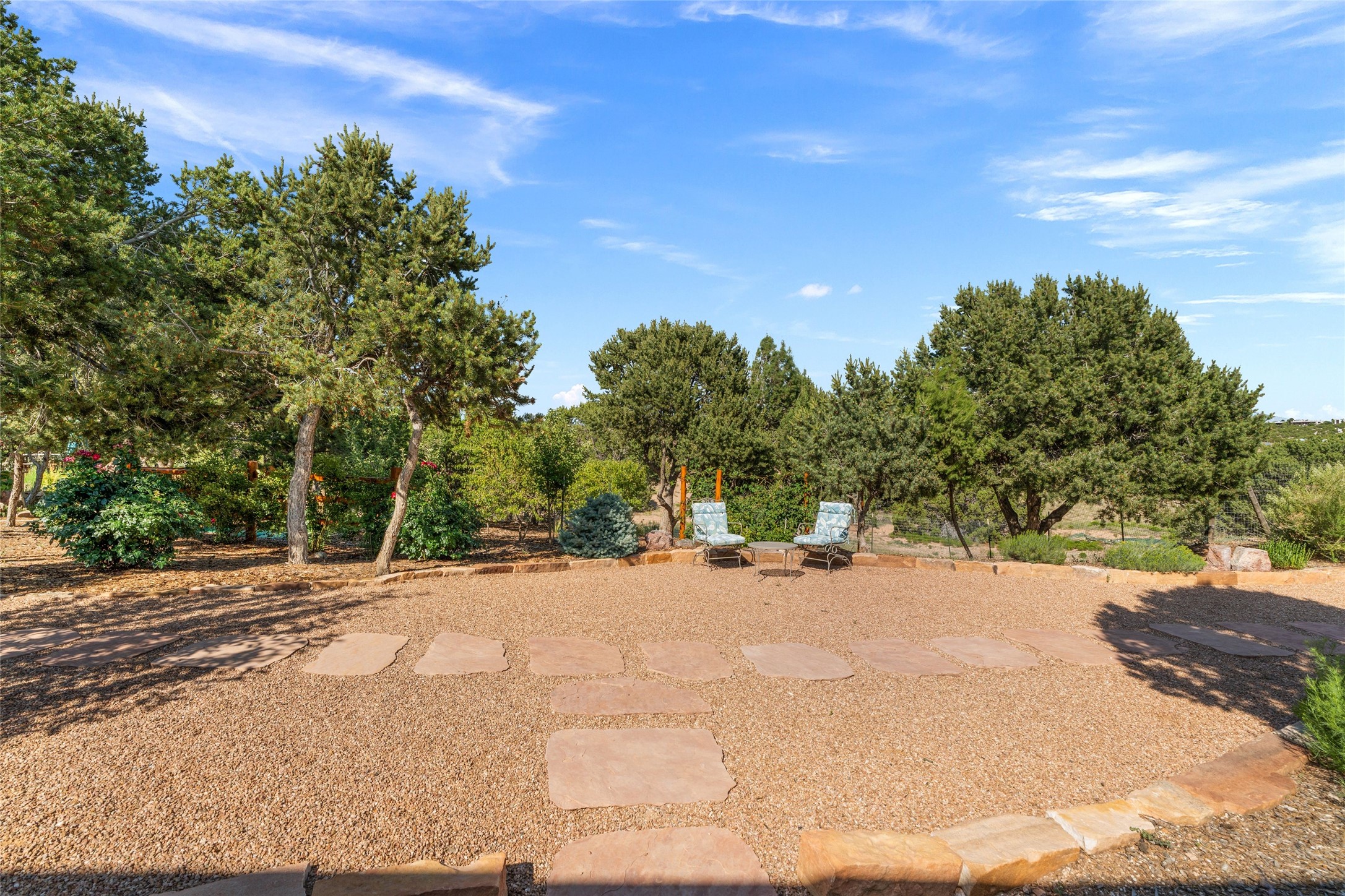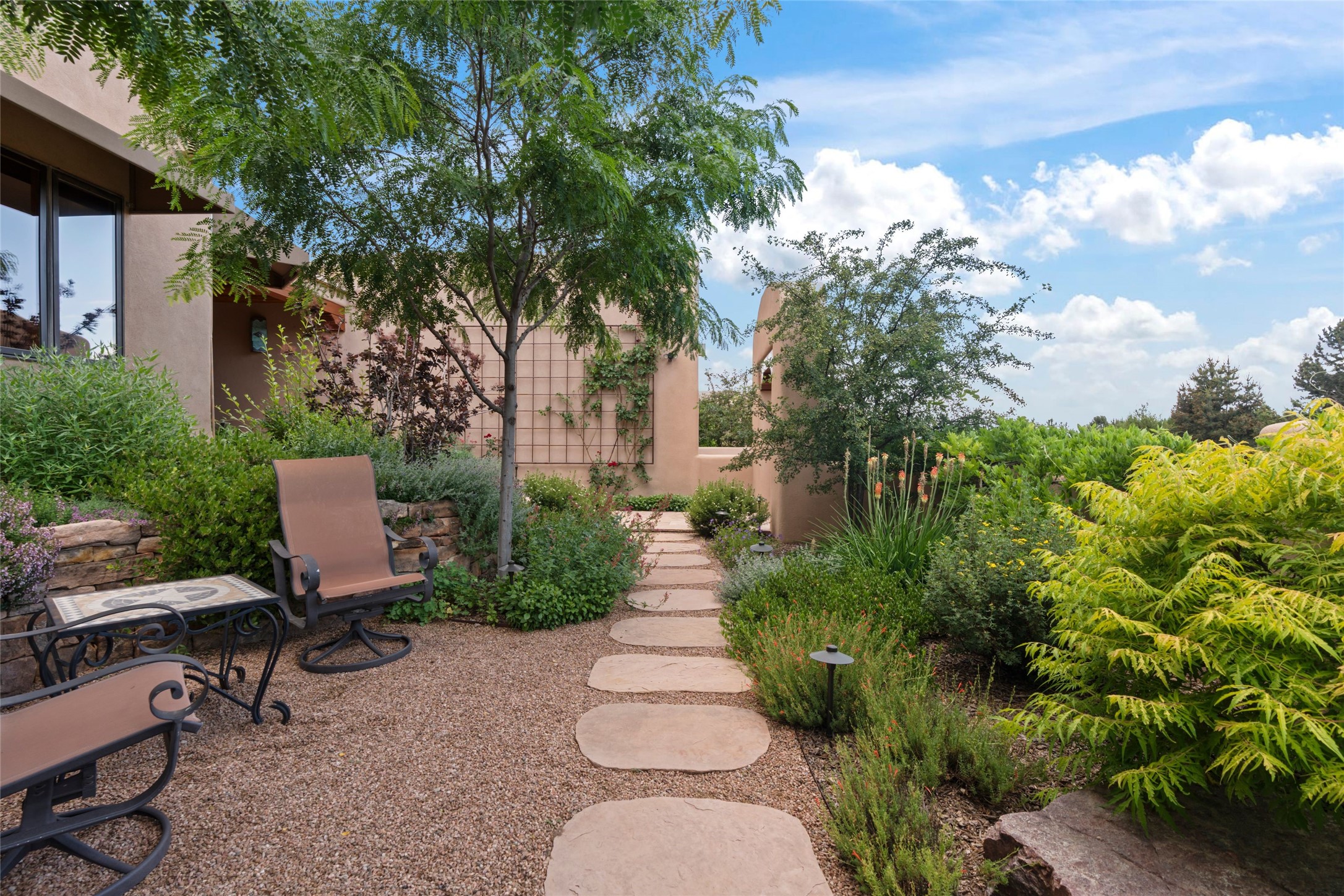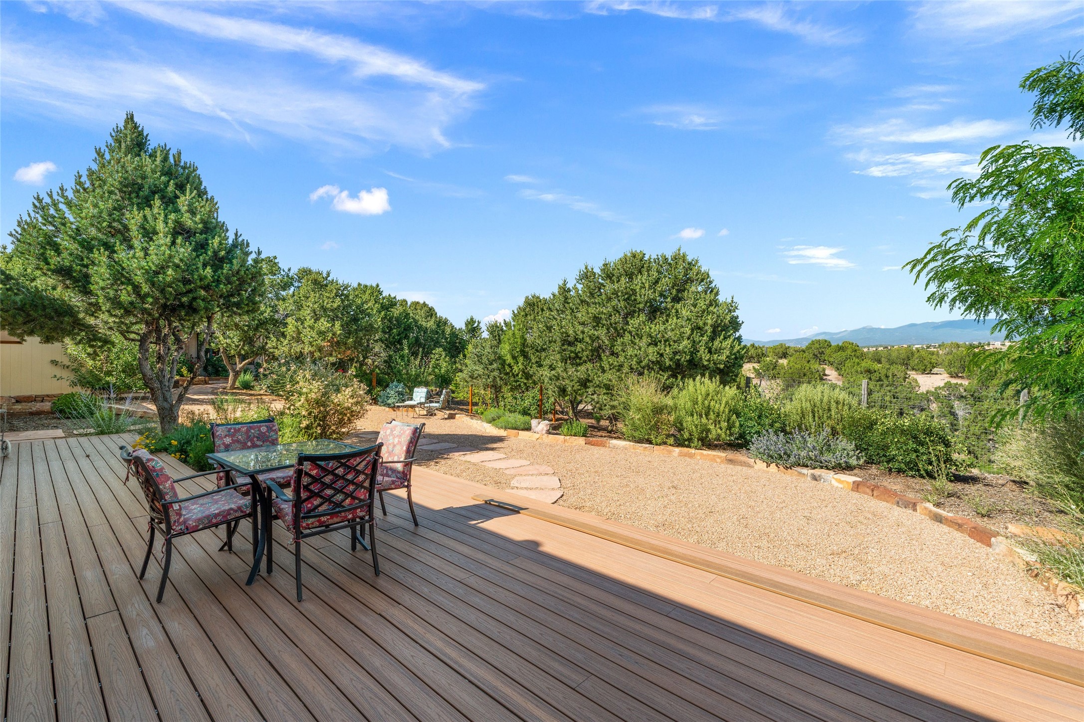 A true Santa Fe masterpiece, this luxurious estate seamlessly blends art, architecture, and nature on a serene 2.46-acre lot with breathtaking views of the Sangre de Cristo mountains. Designed for comfort, sustainability, and inspired living, this extraordinary property offers every amenity for the discerning homeowner.Notable features include double and single-car garages plus a large RV garage, ideal for car enthusiasts, adventure seekers or workshop. The 62-panel solar system and five 2,500-gallon interconnected buried cisterns support an eco-conscious lifestyle, while the extensive drip irrigation system nourishes a lush 1,000 sq. ft. irrigated vegetable garden, orchard (peach, apple, and plum trees), a berry patch bursting with blueberries, blackberries, and raspberries.Enjoy miles of hiking, biking, and horseback riding trails just across the street, or relax in your private oasis with green space bordering the eastern edge of the property, a tranquil water feature with Koi pond, and multiple covered outdoor entertaining spaces, including a plumbed gas fire pit and a fully insulated hot tub.Inside, comfort and luxury abound with radiant floor heating throughout, mini-split systems for cooling, and a security system with cameras. The heart of the home is the spectacular Great Hall, anchored by a gas fireplace, and offering soaring ceilings and an atmosphere of timeless elegance and opening to outdoor spaces. Additional highlights include a top-of-the-line chef's kitchen, butler's pantry, and a quilting/art studio.The estate also includes a charming 2-bedroom guest house and a spacious 2-bedroom studio, also with Sangre de Cristo mountains views. Perfect for guests, extended family, or creative workspaces.There is ample parking for guests and extra vehicles, this estate is ideal for entertaining or enjoying peaceful privacy and solitude. A rare opportunity to own a truly magical home that celebrates the best of indoor-outdoor living in Santa Fe.