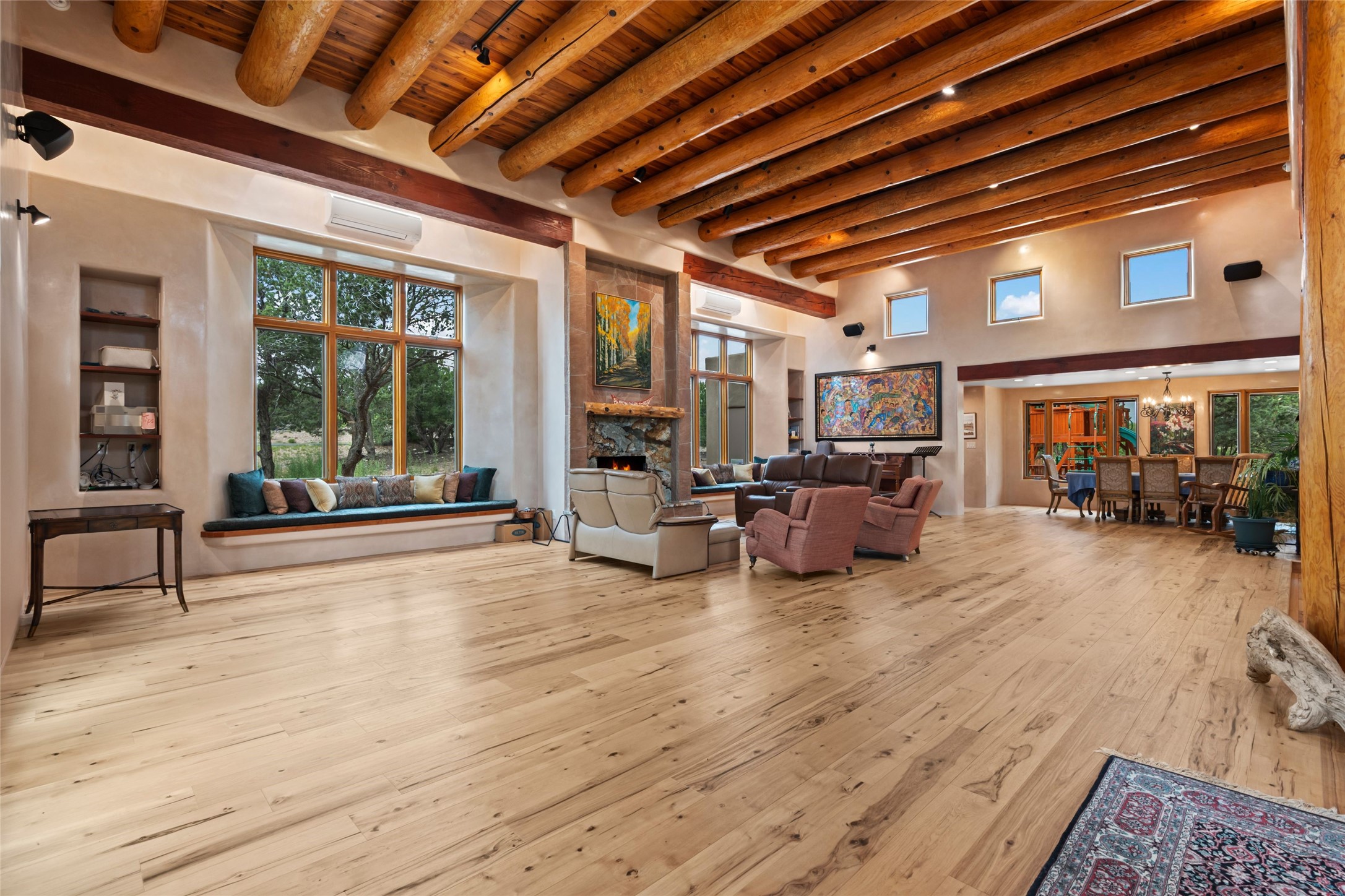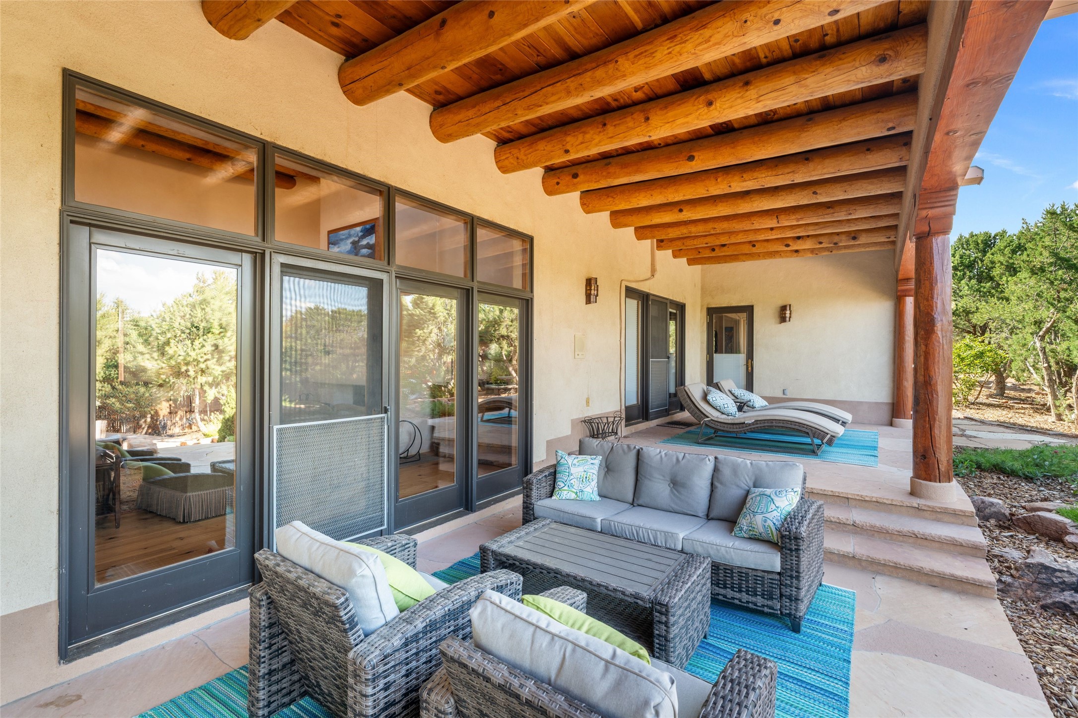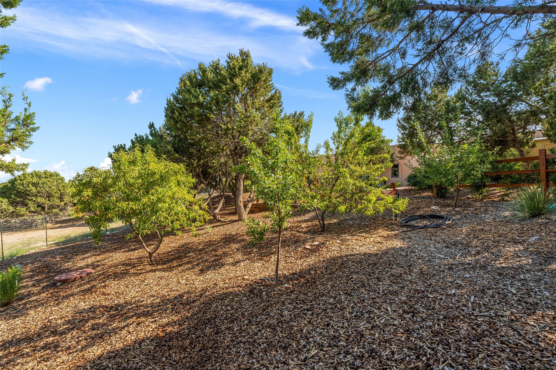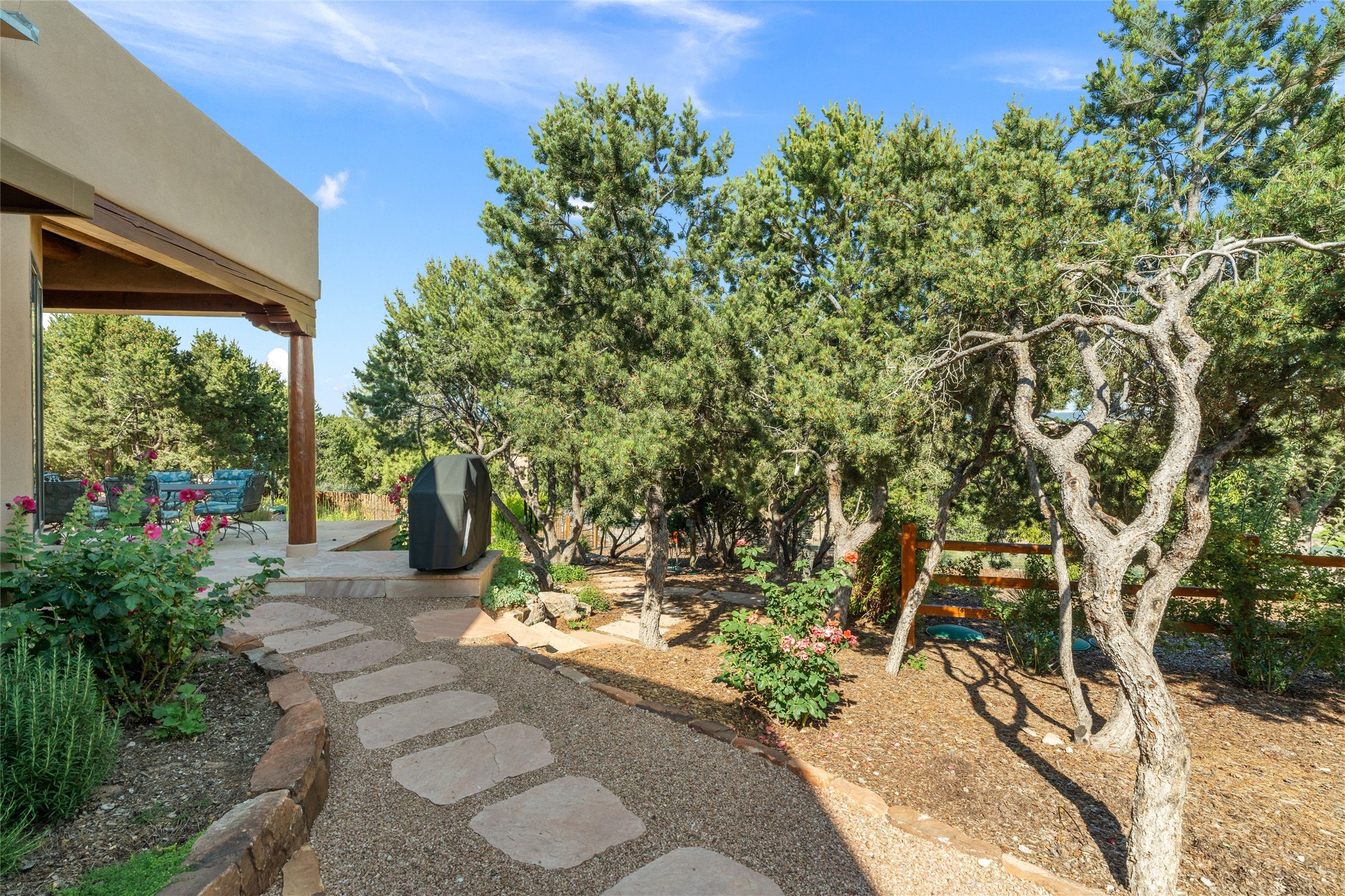 A true Santa Fe masterpiece, this luxurious estate seamlessly blends art, architecture, and nature on a serene 2.46-acre lot with breathtaking views of the Sangre de Cristo mountains. Designed for comfort, sustainability, and inspired living, this extraordinary property offers every amenity for the discerning homeowner.Notable features include double and single-car garages plus a large RV garage, ideal for car enthusiasts, adventure seekers or workshop. The 62-panel solar system and five 2,500-gallon interconnected buried cisterns support an eco-conscious lifestyle, while the extensive drip irrigation system nourishes a lush 1,000 sq. ft. irrigated vegetable garden, orchard (peach, apple, and plum trees), a berry patch bursting with blueberries, blackberries, and raspberries.Enjoy miles of hiking, biking, and horseback riding trails just across the street, or relax in your private oasis with green space bordering the eastern edge of the property, a tranquil water feature with Koi pond, and multiple covered outdoor entertaining spaces, including a plumbed gas fire pit and a fully insulated hot tub.Inside, comfort and luxury abound with radiant floor heating throughout, mini-split systems for cooling, and a security system with cameras. The heart of the home is the spectacular Great Hall, anchored by a gas fireplace, and offering soaring ceilings and an atmosphere of timeless elegance and opening to outdoor spaces. Additional highlights include a top-of-the-line chef's kitchen, butler's pantry, and a quilting/art studio.The estate also includes a charming 2-bedroom guest house and a spacious 2-bedroom studio, also with Sangre de Cristo mountains views. Perfect for guests, extended family, or creative workspaces.There is ample parking for guests and extra vehicles, this estate is ideal for entertaining or enjoying peaceful privacy and solitude. A rare opportunity to own a truly magical home that celebrates the best of indoor-outdoor living in Santa Fe.