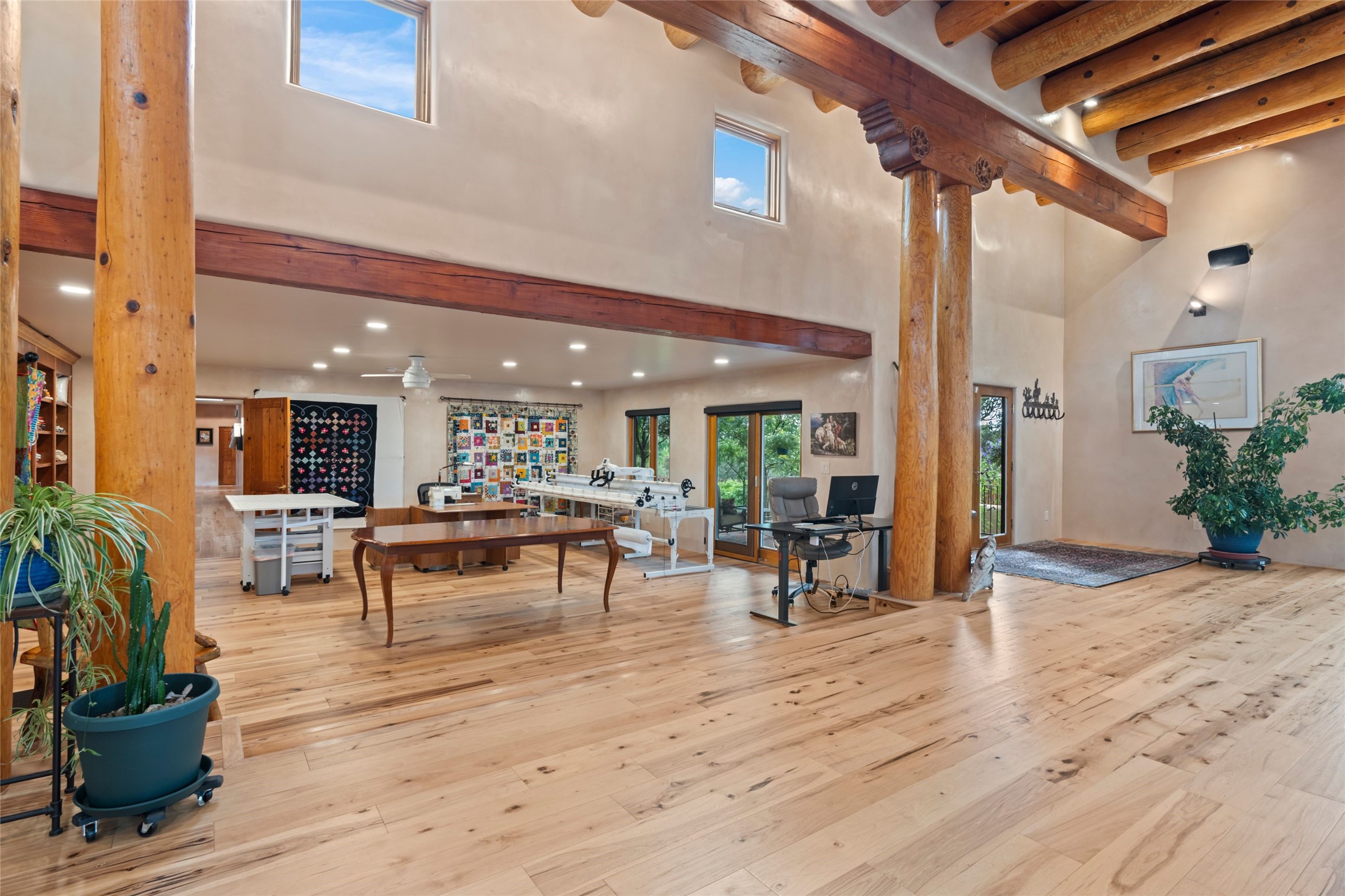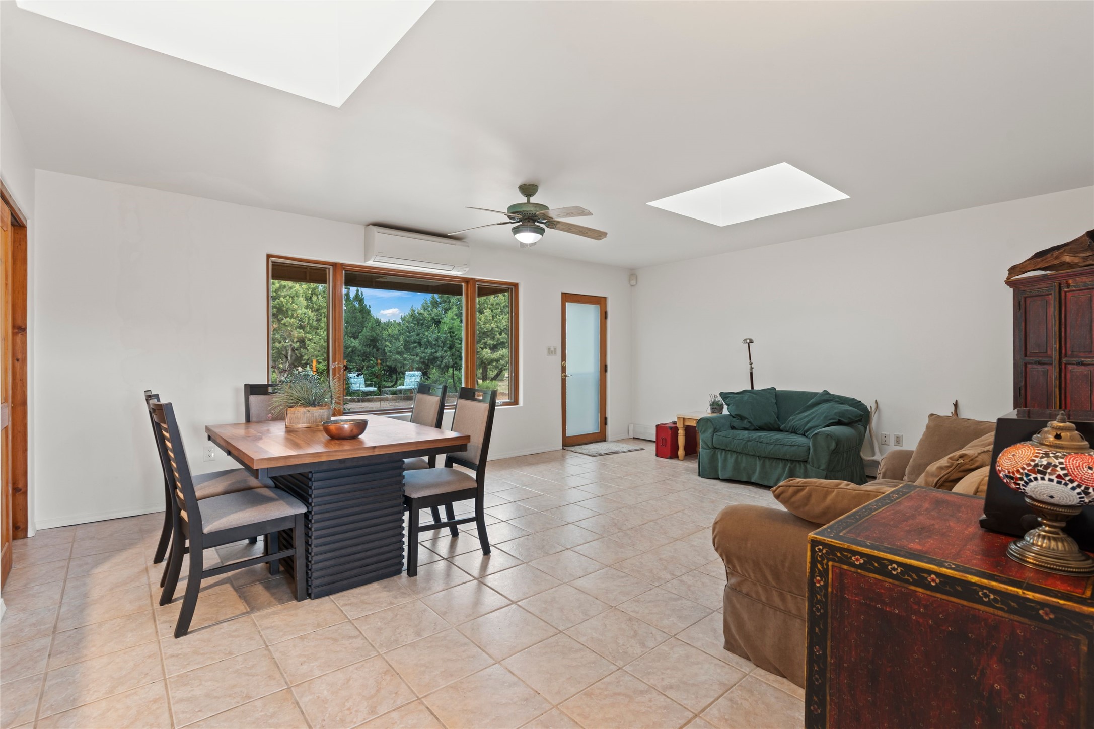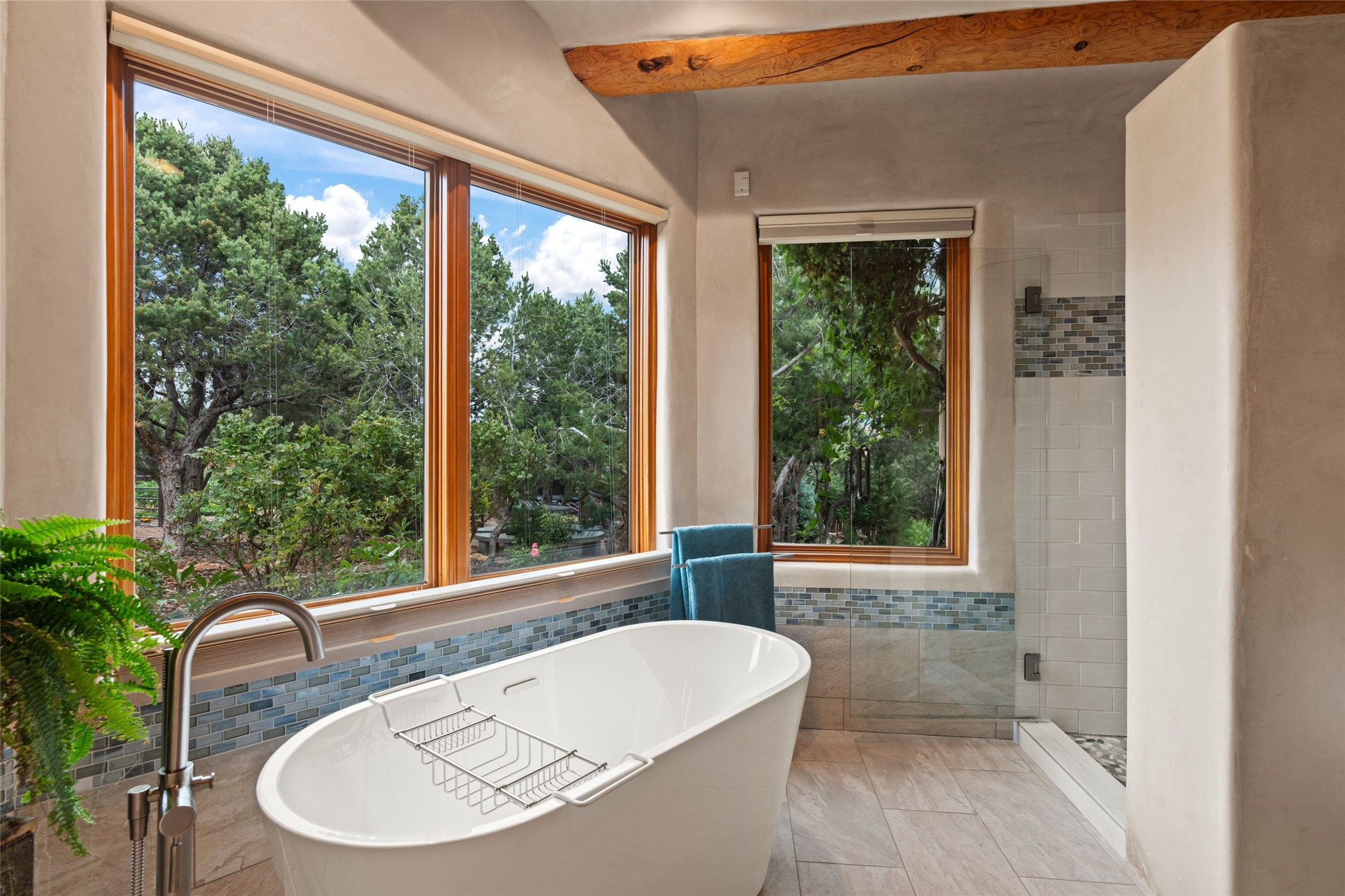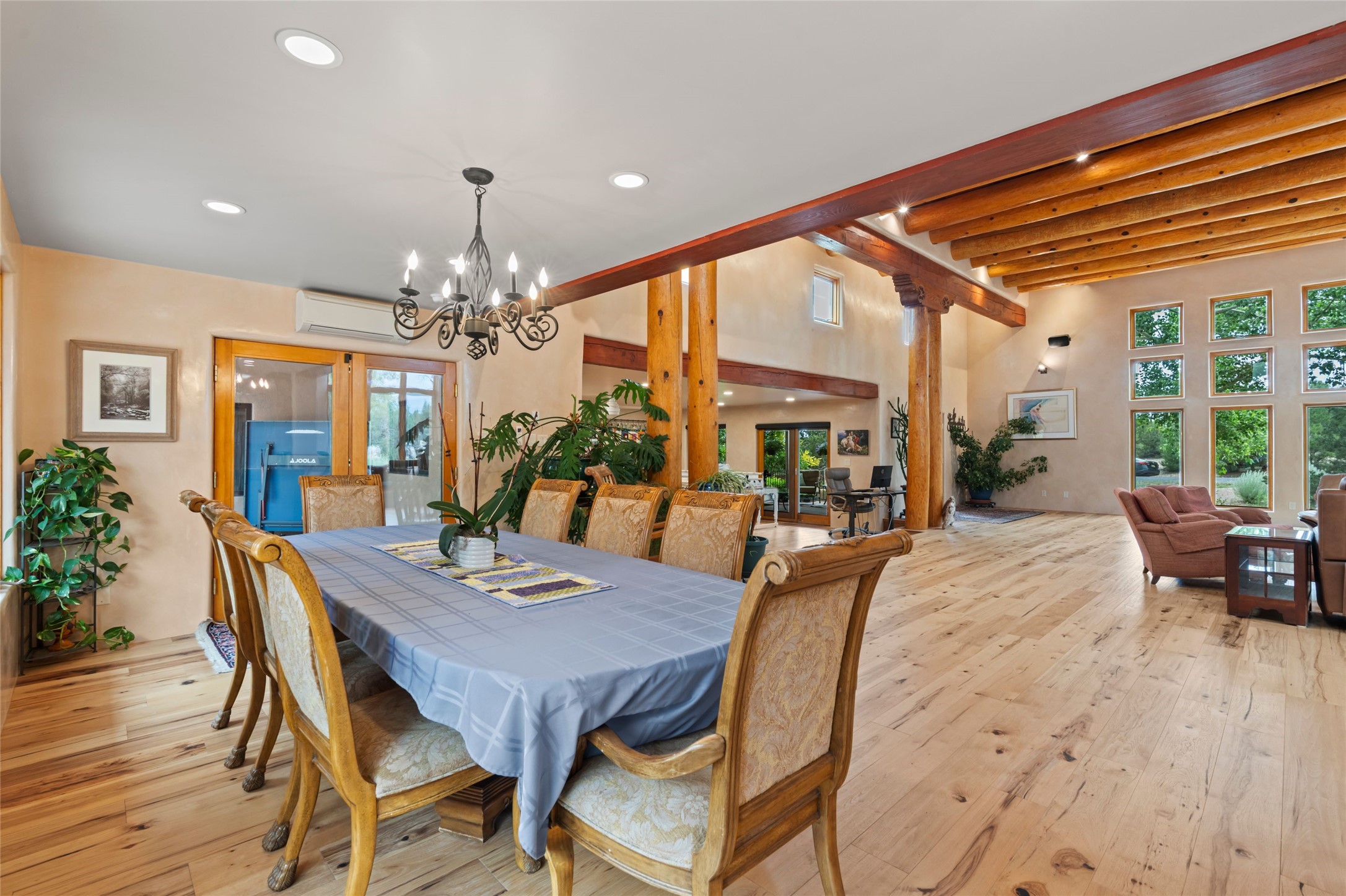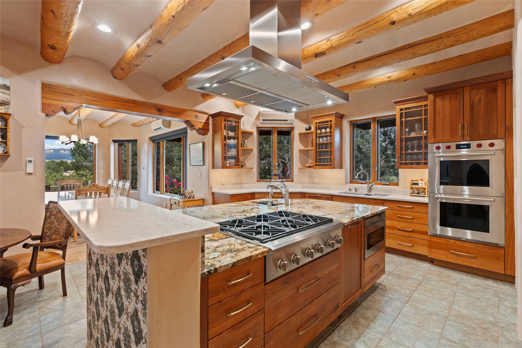 A true Santa Fe masterpiece, this luxurious estate seamlessly blends art, architecture, and nature on a serene 2.46-acre lot with breathtaking views of the Sangre de Cristo mountains. Designed for comfort, sustainability, and inspired living, this extraordinary property offers every amenity for the discerning homeowner.Notable features include double and single-car garages plus a large RV garage, ideal for car enthusiasts, adventure seekers or workshop. The 62-panel solar system and five 2,500-gallon interconnected buried cisterns support an eco-conscious lifestyle, while the extensive drip irrigation system nourishes a lush 1,000 sq. ft. irrigated vegetable garden, orchard (peach, apple, and plum trees), a berry patch bursting with blueberries, blackberries, and raspberries.Enjoy miles of hiking, biking, and horseback riding trails just across the street, or relax in your private oasis with green space bordering the eastern edge of the property, a tranquil water feature with Koi pond, and multiple covered outdoor entertaining spaces, including a plumbed gas fire pit and a fully insulated hot tub.Inside, comfort and luxury abound with radiant floor heating throughout, mini-split systems for cooling, and a security system with cameras. The heart of the home is the spectacular Great Hall, anchored by a gas fireplace, and offering soaring ceilings and an atmosphere of timeless elegance and opening to outdoor spaces. Additional highlights include a top-of-the-line chef's kitchen, butler's pantry, and a quilting/art studio.The estate also includes a charming 2-bedroom guest house and a spacious 2-bedroom studio, also with Sangre de Cristo mountains views. Perfect for guests, extended family, or creative workspaces.There is ample parking for guests and extra vehicles, this estate is ideal for entertaining or enjoying peaceful privacy and solitude. A rare opportunity to own a truly magical home that celebrates the best of indoor-outdoor living in Santa Fe.