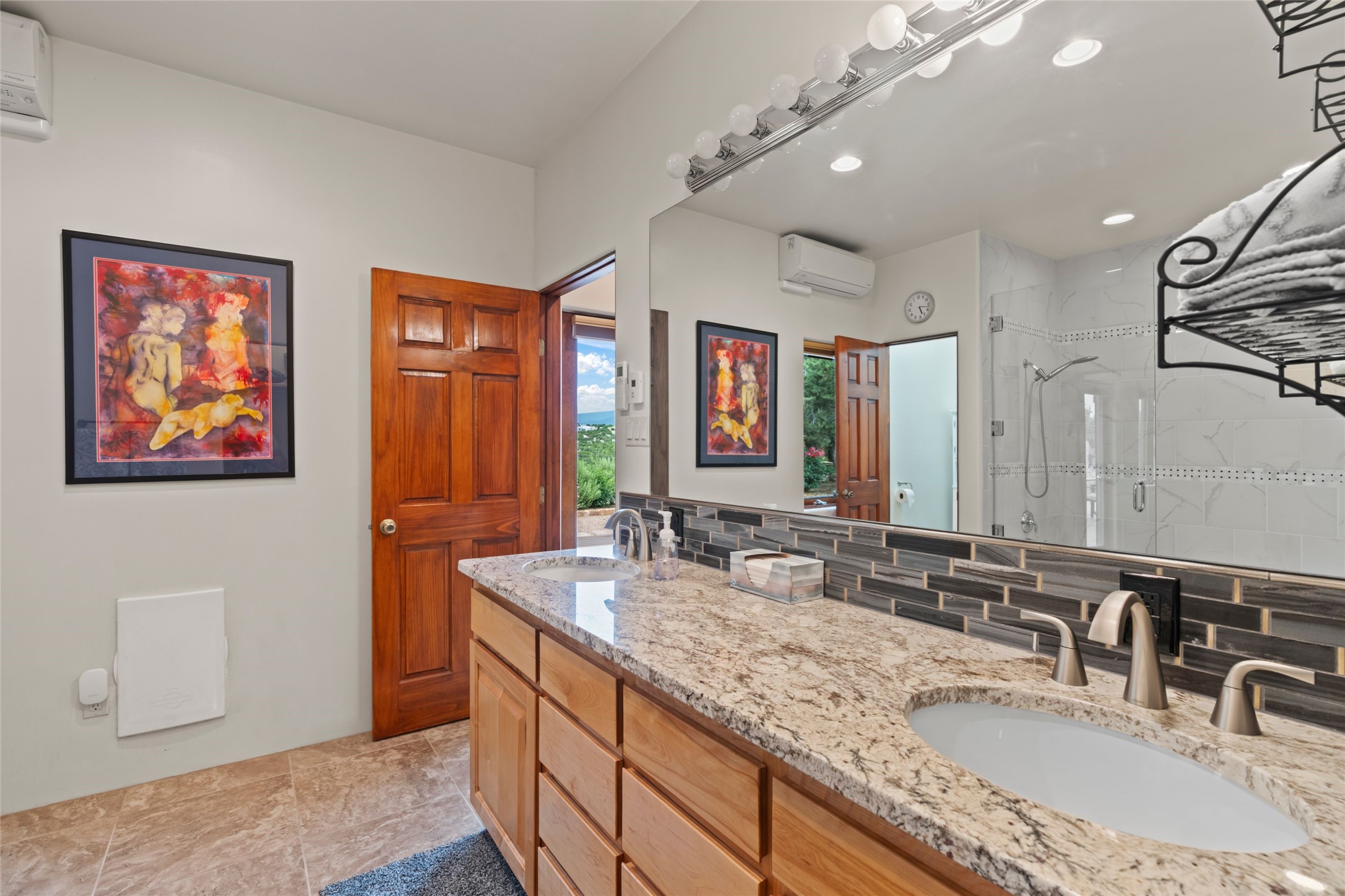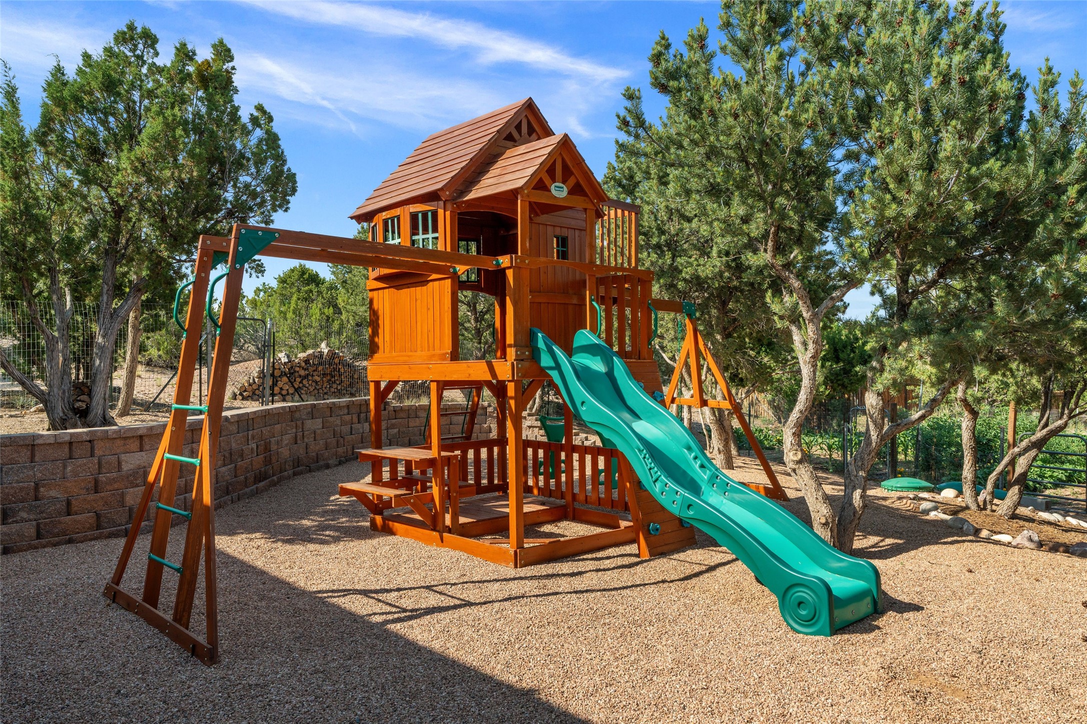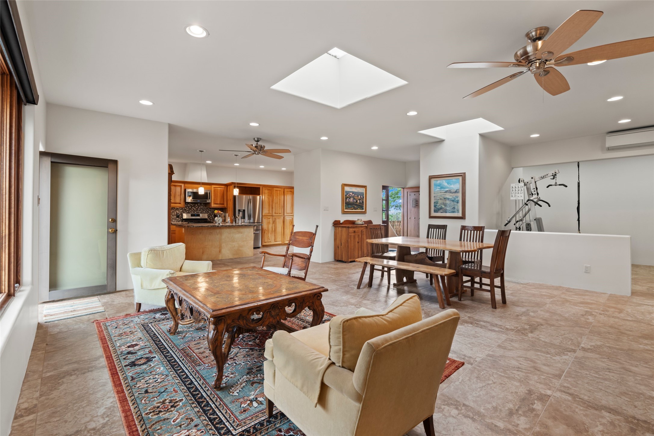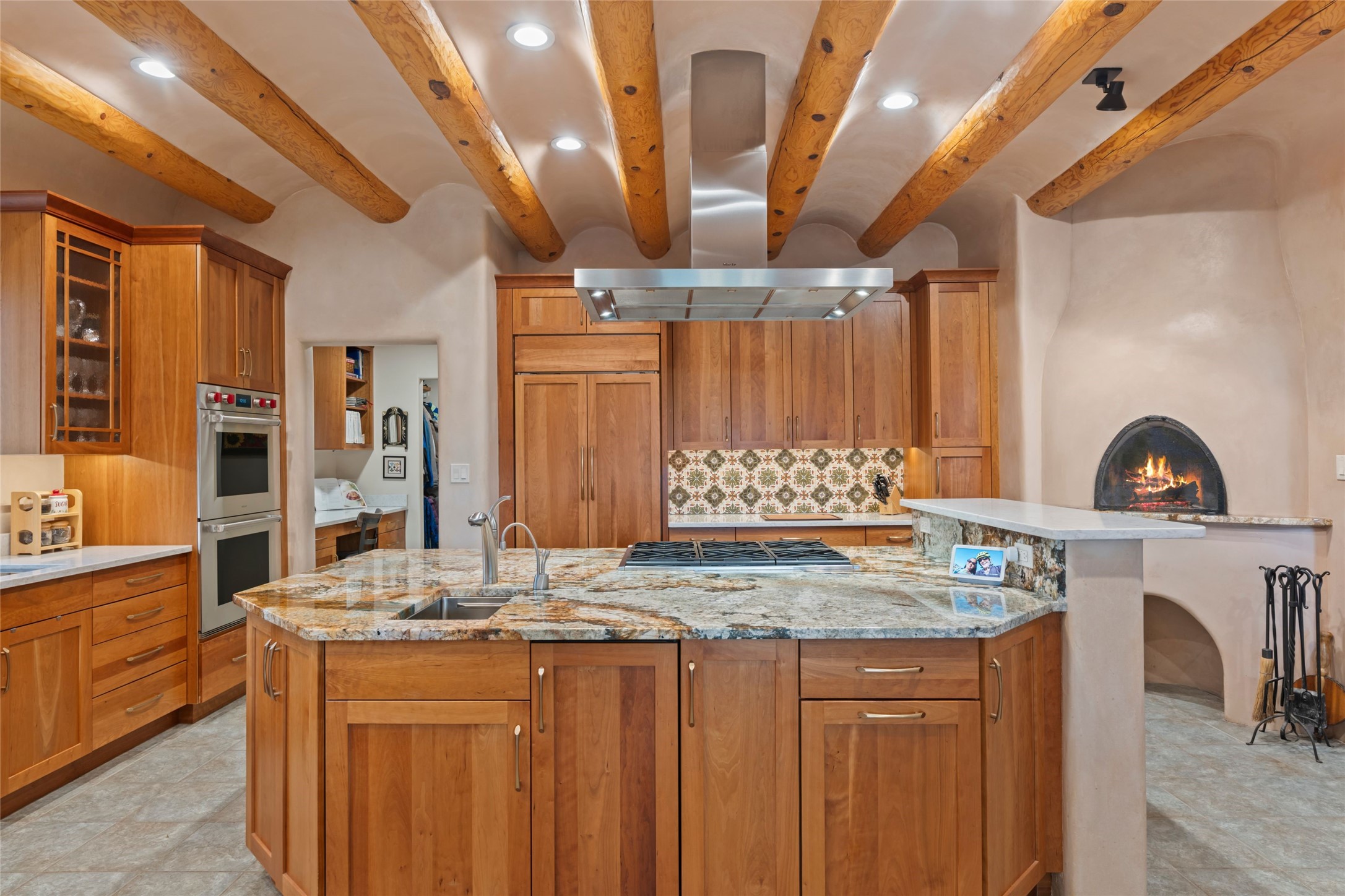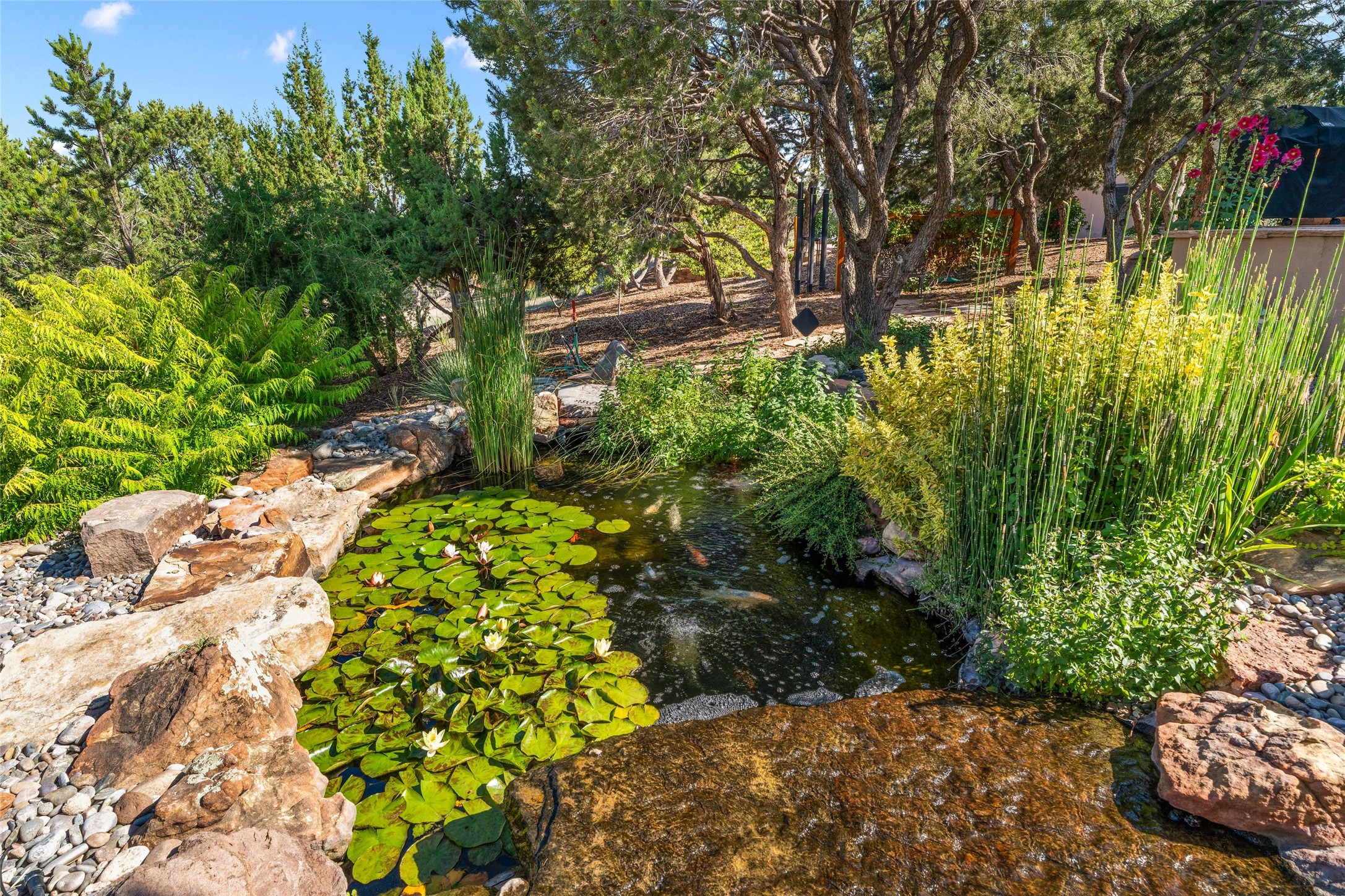 A true Santa Fe masterpiece, this luxurious estate seamlessly blends art, architecture, and nature on a serene 2.46-acre lot with breathtaking views of the Sangre de Cristo mountains. Designed for comfort, sustainability, and inspired living, this extraordinary property offers every amenity for the discerning homeowner.Notable features include double and single-car garages plus a large RV garage, ideal for car enthusiasts, adventure seekers or workshop. The 62-panel solar system and five 2,500-gallon interconnected buried cisterns support an eco-conscious lifestyle, while the extensive drip irrigation system nourishes a lush 1,000 sq. ft. irrigated vegetable garden, orchard (peach, apple, and plum trees), a berry patch bursting with blueberries, blackberries, and raspberries.Enjoy miles of hiking, biking, and horseback riding trails just across the street, or relax in your private oasis with green space bordering the eastern edge of the property, a tranquil water feature with Koi pond, and multiple covered outdoor entertaining spaces, including a plumbed gas fire pit and a fully insulated hot tub.Inside, comfort and luxury abound with radiant floor heating throughout, mini-split systems for cooling, and a security system with cameras. The heart of the home is the spectacular Great Hall, anchored by a gas fireplace, and offering soaring ceilings and an atmosphere of timeless elegance and opening to outdoor spaces. Additional highlights include a top-of-the-line chef's kitchen, butler's pantry, and a quilting/art studio.The estate also includes a charming 2-bedroom guest house and a spacious 2-bedroom studio, also with Sangre de Cristo mountains views. Perfect for guests, extended family, or creative workspaces.There is ample parking for guests and extra vehicles, this estate is ideal for entertaining or enjoying peaceful privacy and solitude. A rare opportunity to own a truly magical home that celebrates the best of indoor-outdoor living in Santa Fe.