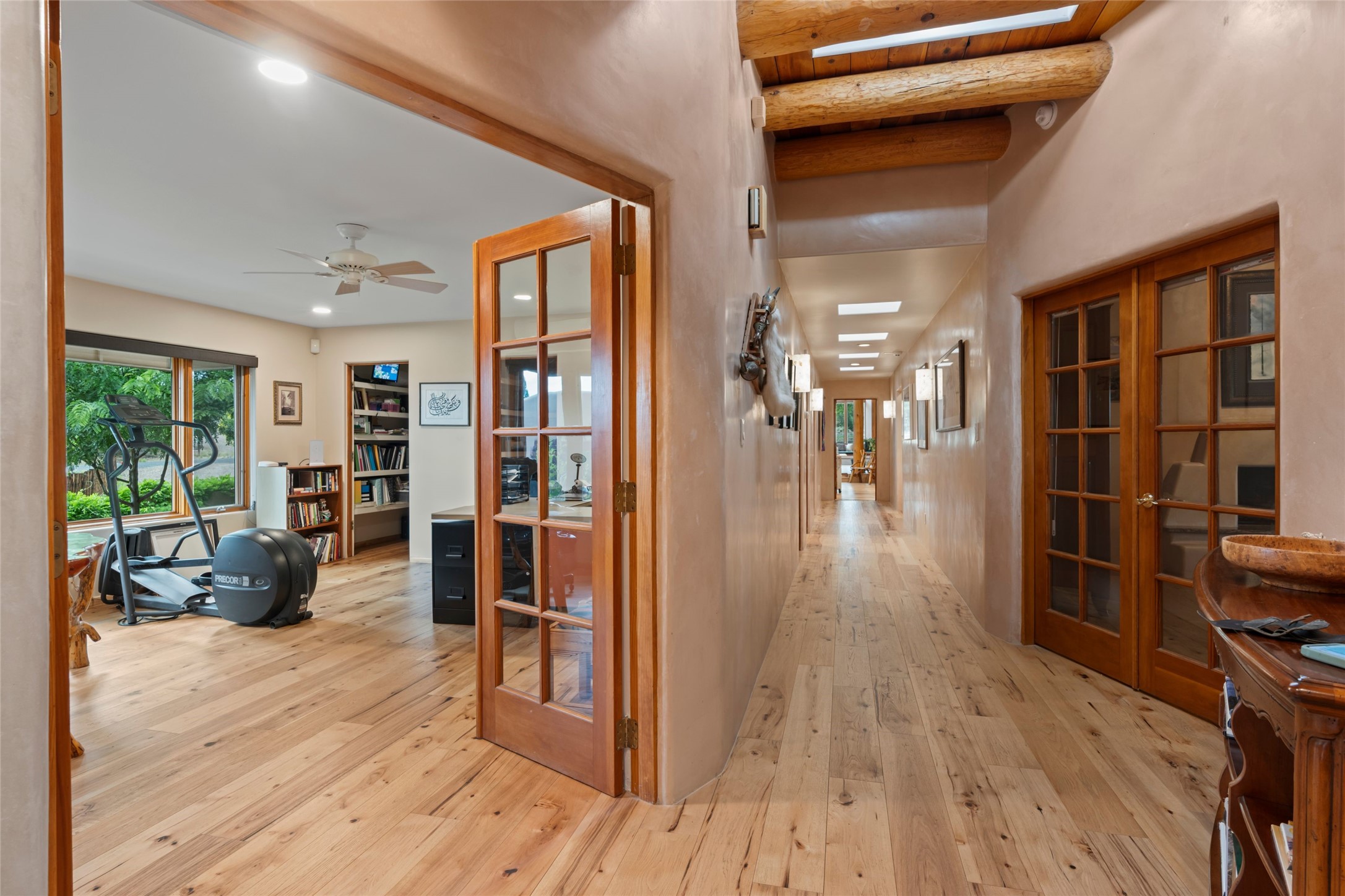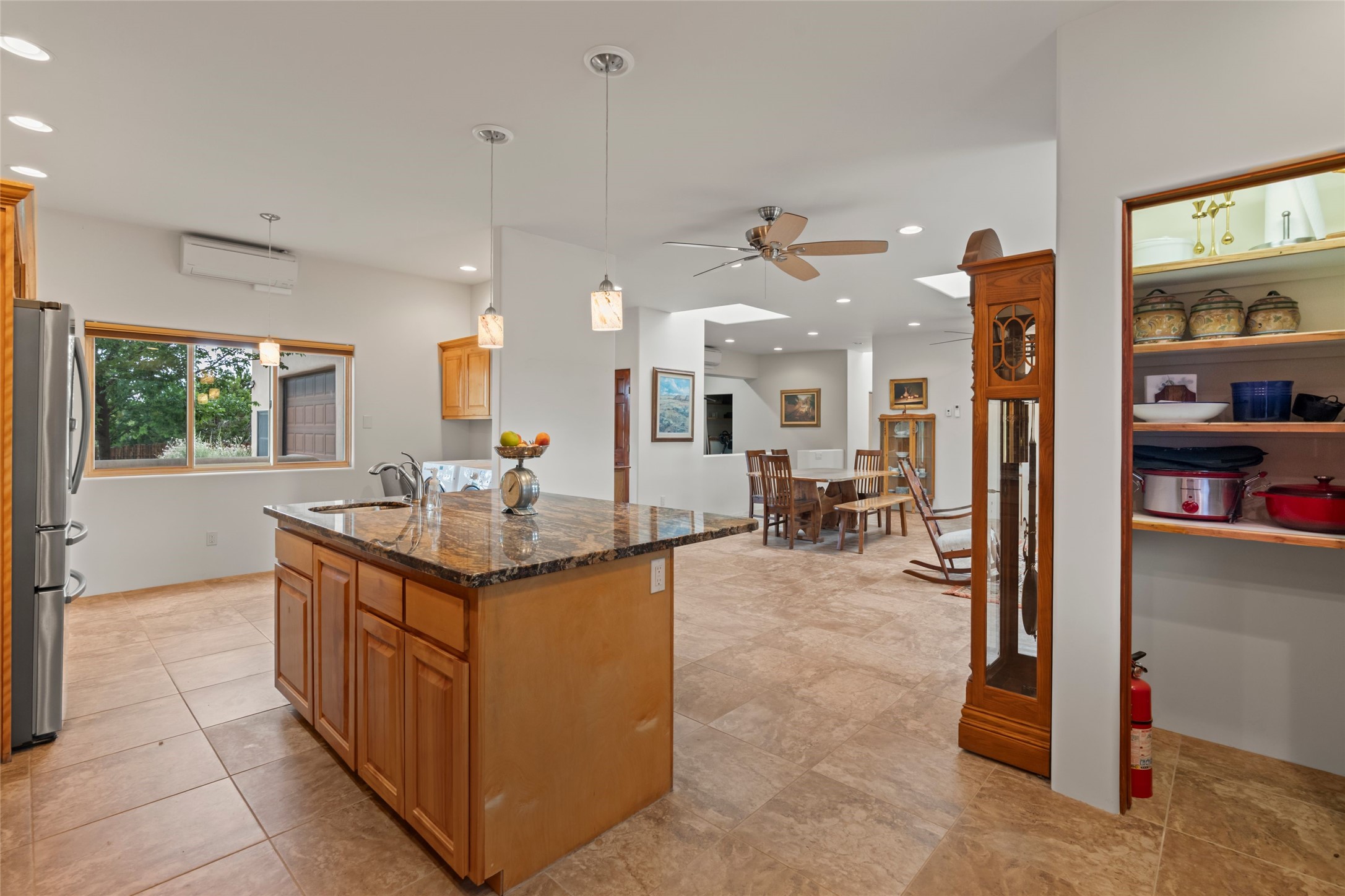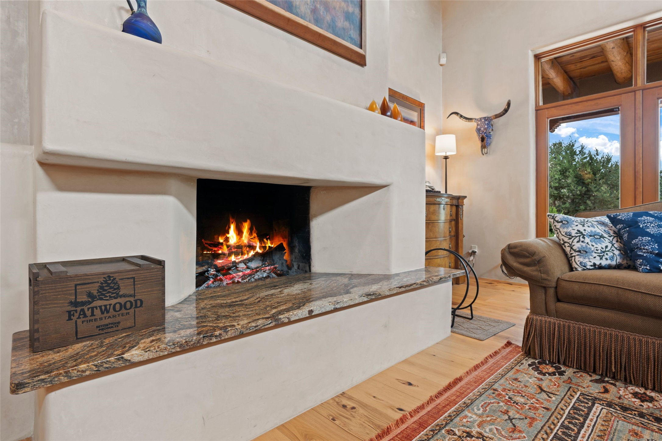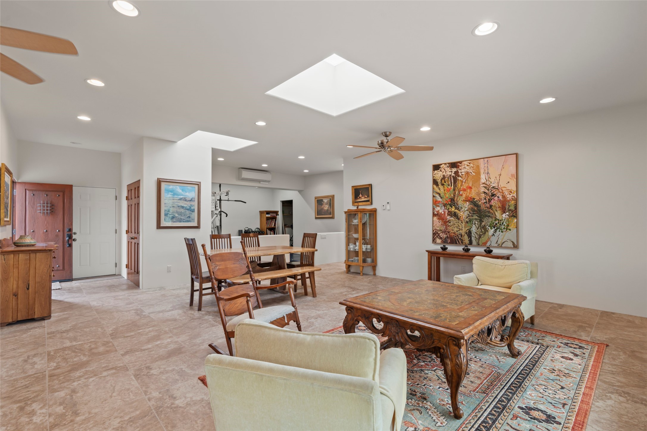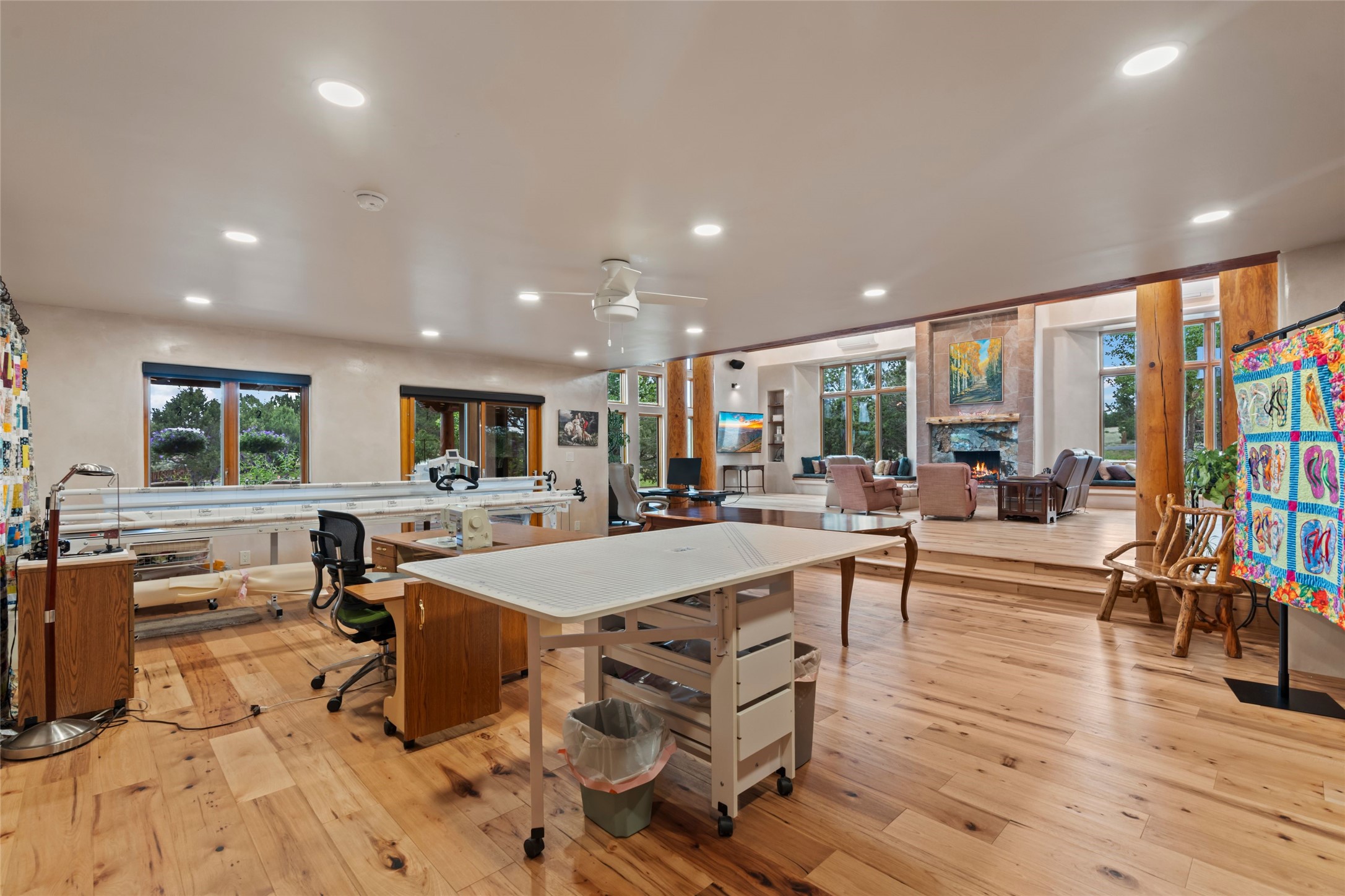 A true Santa Fe masterpiece, this luxurious estate seamlessly blends art, architecture, and nature on a serene 2.46-acre lot with breathtaking views of the Sangre de Cristo mountains. Designed for comfort, sustainability, and inspired living, this extraordinary property offers every amenity for the discerning homeowner.Notable features include double and single-car garages plus a large RV garage, ideal for car enthusiasts, adventure seekers or workshop. The 62-panel solar system and five 2,500-gallon interconnected buried cisterns support an eco-conscious lifestyle, while the extensive drip irrigation system nourishes a lush 1,000 sq. ft. irrigated vegetable garden, orchard (peach, apple, and plum trees), a berry patch bursting with blueberries, blackberries, and raspberries.Enjoy miles of hiking, biking, and horseback riding trails just across the street, or relax in your private oasis with green space bordering the eastern edge of the property, a tranquil water feature with Koi pond, and multiple covered outdoor entertaining spaces, including a plumbed gas fire pit and a fully insulated hot tub.Inside, comfort and luxury abound with radiant floor heating throughout, mini-split systems for cooling, and a security system with cameras. The heart of the home is the spectacular Great Hall, anchored by a gas fireplace, and offering soaring ceilings and an atmosphere of timeless elegance and opening to outdoor spaces. Additional highlights include a top-of-the-line chef's kitchen, butler's pantry, and a quilting/art studio.The estate also includes a charming 2-bedroom guest house and a spacious 2-bedroom studio, also with Sangre de Cristo mountains views. Perfect for guests, extended family, or creative workspaces.There is ample parking for guests and extra vehicles, this estate is ideal for entertaining or enjoying peaceful privacy and solitude. A rare opportunity to own a truly magical home that celebrates the best of indoor-outdoor living in Santa Fe.
