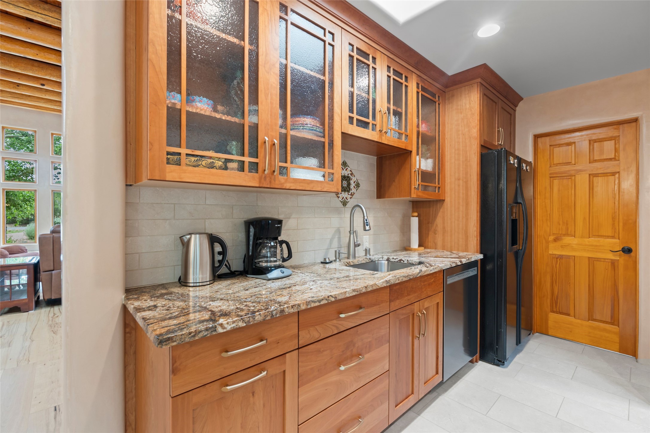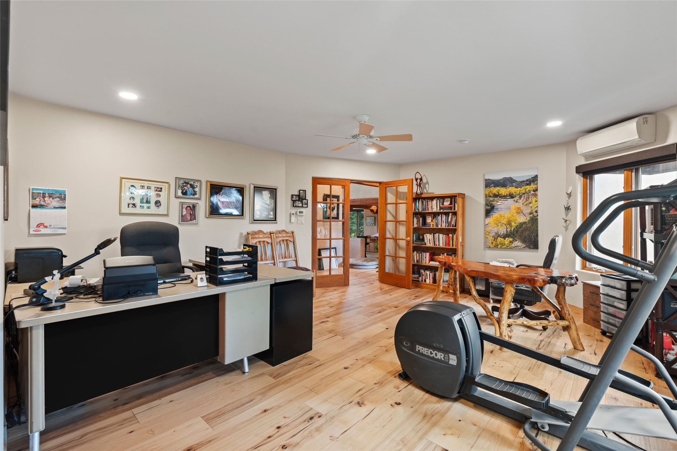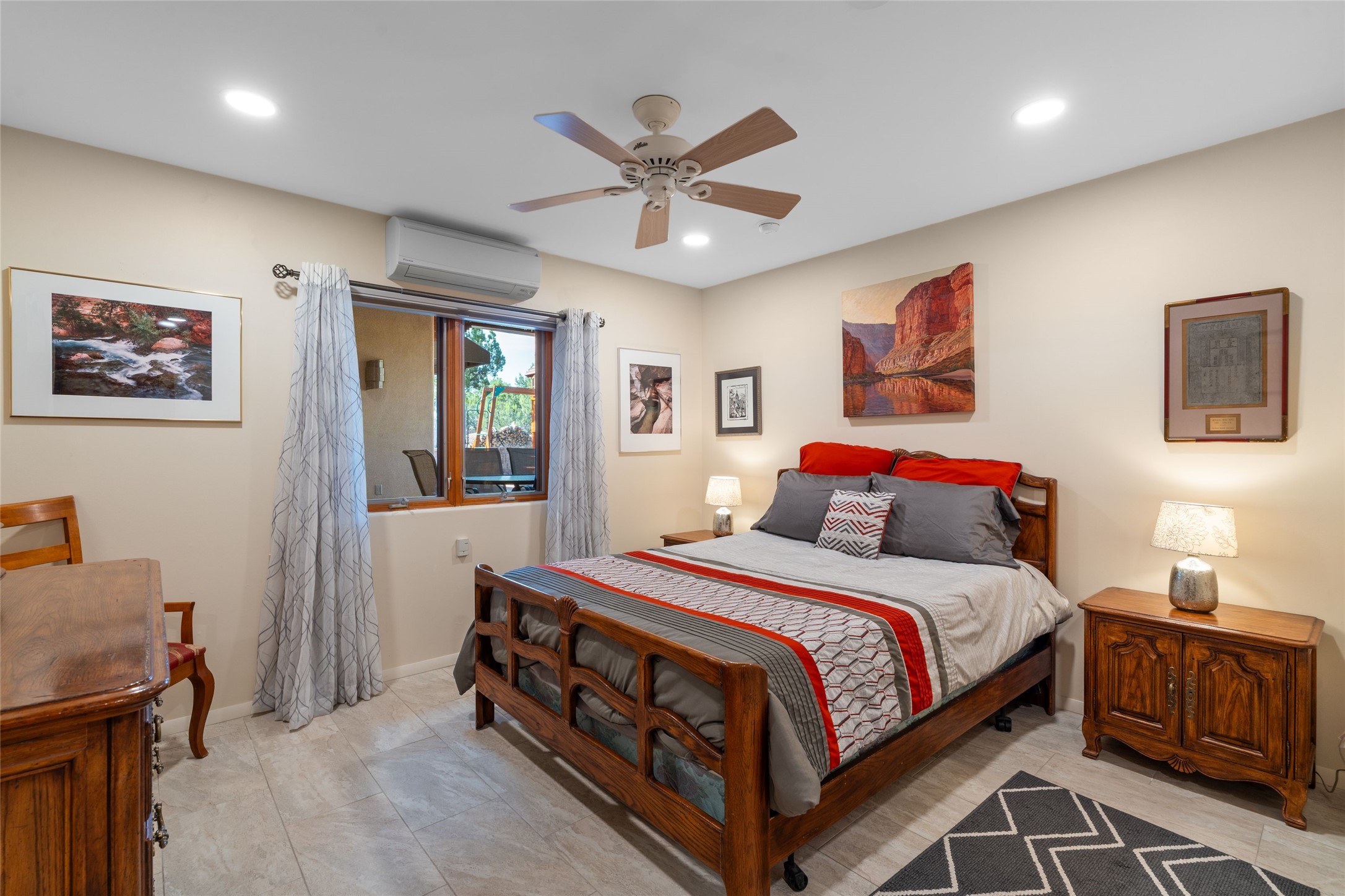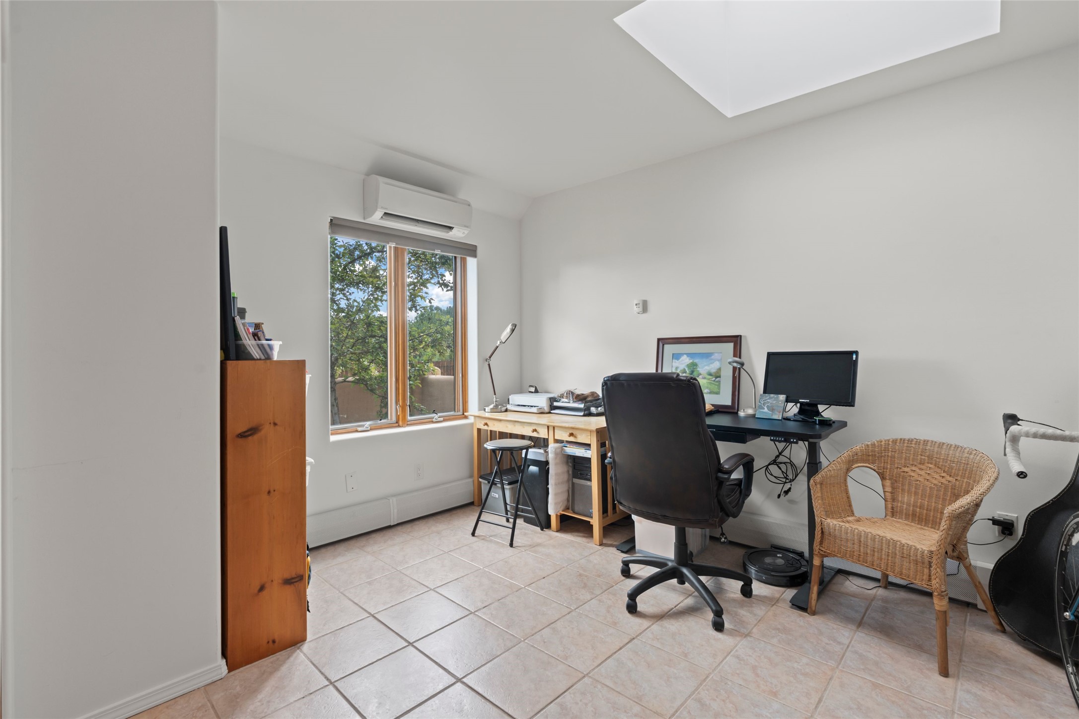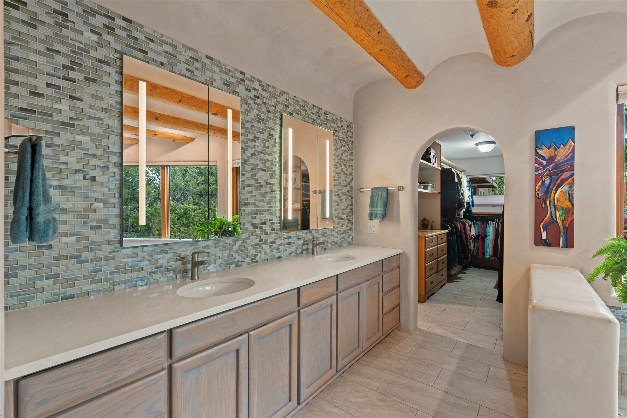 A true Santa Fe masterpiece, this luxurious estate seamlessly blends art, architecture, and nature on a serene 2.46-acre lot with breathtaking views of the Sangre de Cristo mountains. Designed for comfort, sustainability, and inspired living, this extraordinary property offers every amenity for the discerning homeowner.Notable features include double and single-car garages plus a large RV garage, ideal for car enthusiasts, adventure seekers or workshop. The 62-panel solar system and five 2,500-gallon interconnected buried cisterns support an eco-conscious lifestyle, while the extensive drip irrigation system nourishes a lush 1,000 sq. ft. irrigated vegetable garden, orchard (peach, apple, and plum trees), a berry patch bursting with blueberries, blackberries, and raspberries.Enjoy miles of hiking, biking, and horseback riding trails just across the street, or relax in your private oasis with green space bordering the eastern edge of the property, a tranquil water feature with Koi pond, and multiple covered outdoor entertaining spaces, including a plumbed gas fire pit and a fully insulated hot tub.Inside, comfort and luxury abound with radiant floor heating throughout, mini-split systems for cooling, and a security system with cameras. The heart of the home is the spectacular Great Hall, anchored by a gas fireplace, and offering soaring ceilings and an atmosphere of timeless elegance and opening to outdoor spaces. Additional highlights include a top-of-the-line chef's kitchen, butler's pantry, and a quilting/art studio.The estate also includes a charming 2-bedroom guest house and a spacious 2-bedroom studio, also with Sangre de Cristo mountains views. Perfect for guests, extended family, or creative workspaces.There is ample parking for guests and extra vehicles, this estate is ideal for entertaining or enjoying peaceful privacy and solitude. A rare opportunity to own a truly magical home that celebrates the best of indoor-outdoor living in Santa Fe.