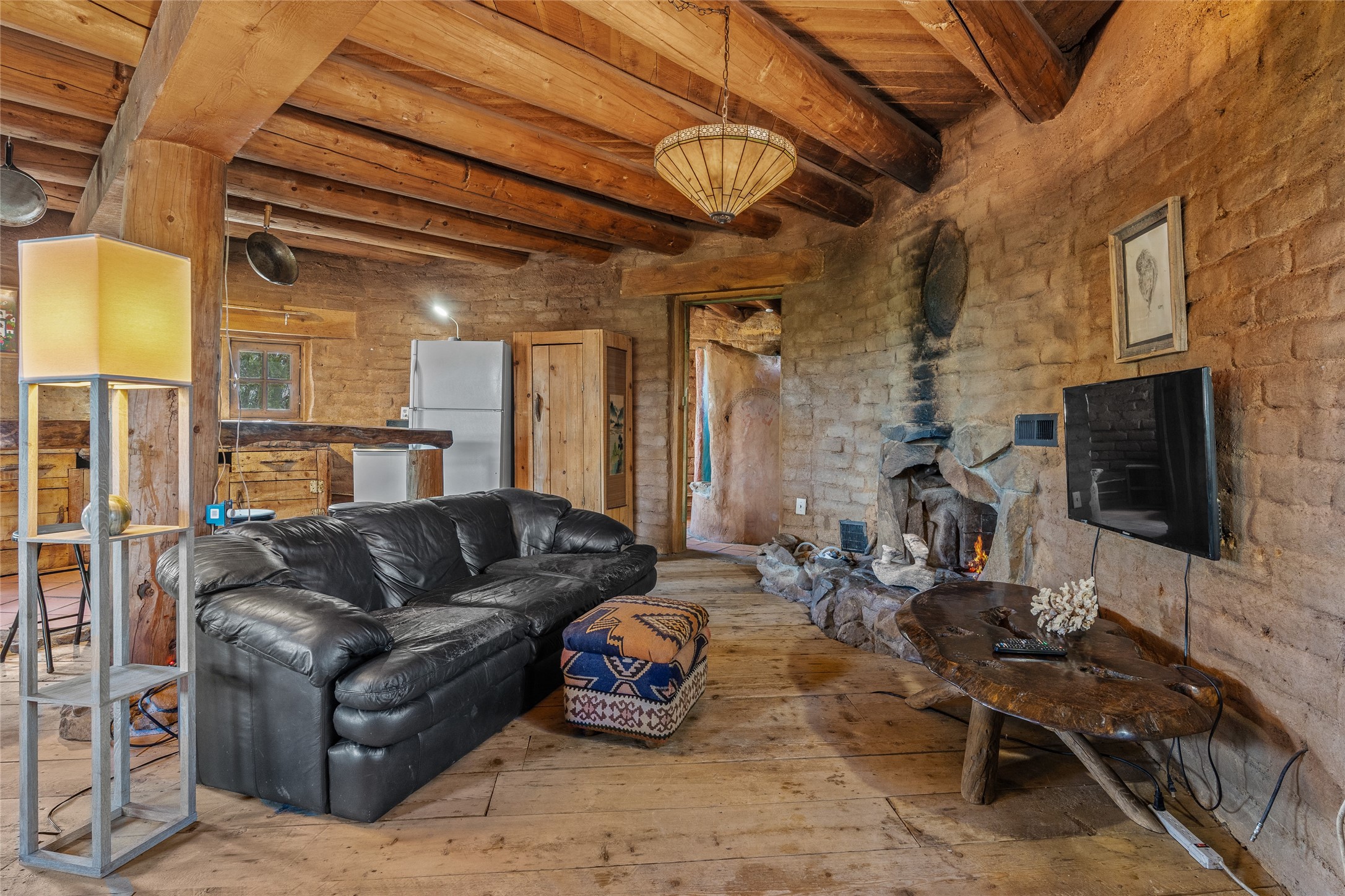 Revealing a sculptor's touch, this hand-built round adobe on the slopes of the Ortiz Mountains is ready for new energy. Nestled on 13.34 elevated acres with gentle, easy topography and breathtaking views, this one-bedroom, one-bath home offers a sanctuary from the world while being less than a quarter mile from pavement and approximately 30 minutes from Santa Fe. Unique features add warmth and character, including a spiral staircase, wide plank wood floors, hand-hewn counters, a stone sink, and viga ceilings. Outside, the upstairs decks, which currently need repair, offer some of the best views in the region. With wood heat, public electricity, a private well, and a newer septic system, this home is poised to provide a distinctive retreat. While completely charming, this home requires some repairs and upgrades and is priced accordingly. Please make an appointment to see.