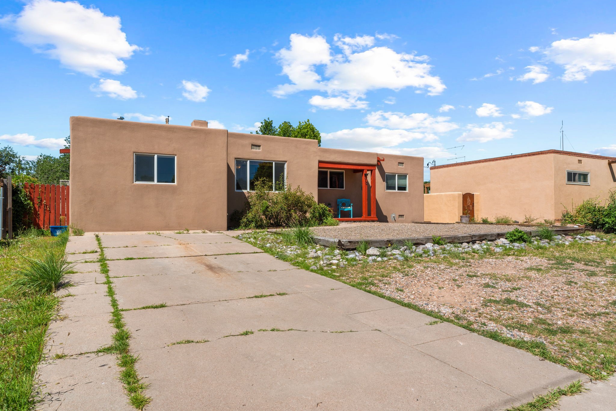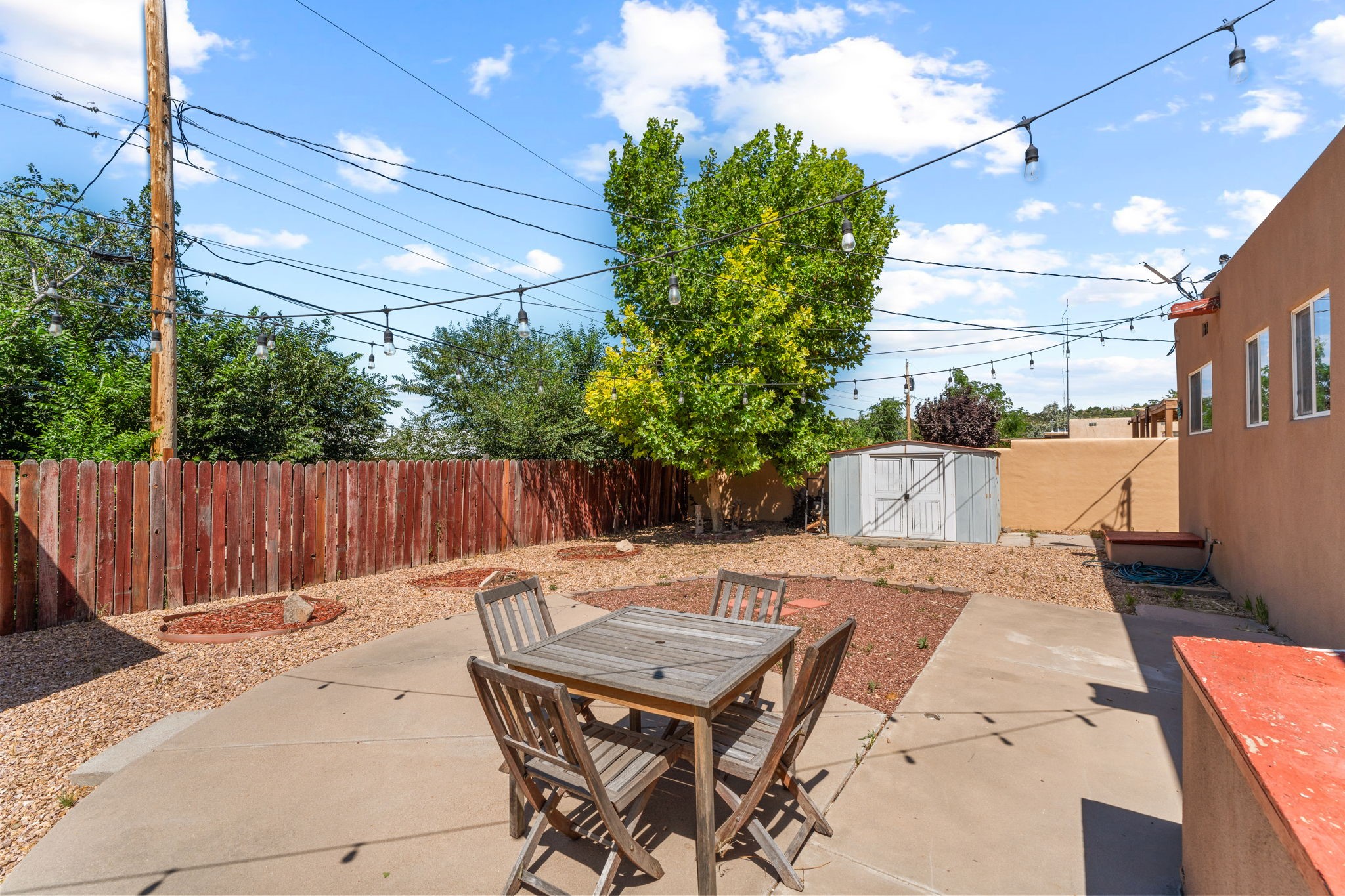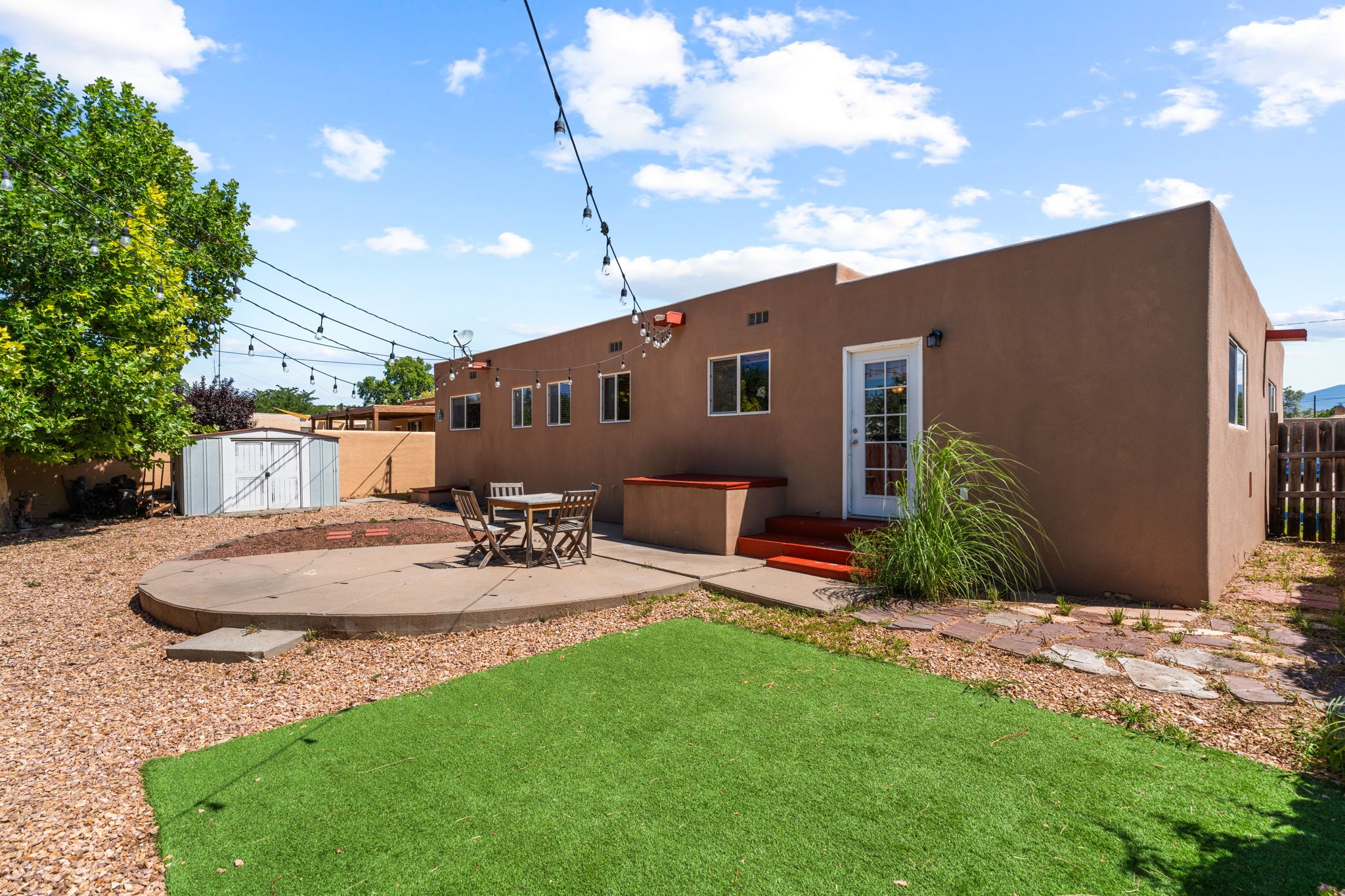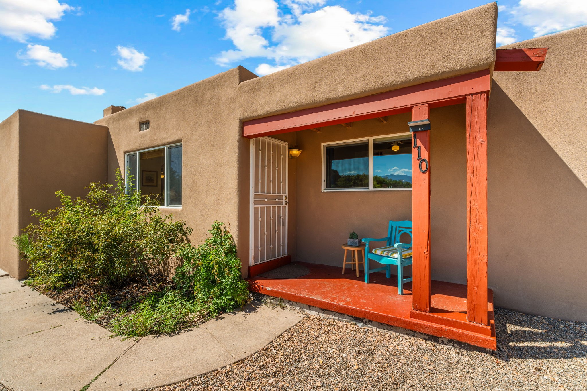 This light-filled and beautifully remodeled Stamm home offers captivating Sangre de Cristo mountain views and a seamless blend of classic charm and modern upgrades. The open floor plan centers around a spacious, completely updated kitchen featuring sleek cabinetry, stainless-steel appliances, and a generous butcher block island with ample storage--perfect for gathering and entertaining, with hardwood floors lending warmth throughout. The inviting living room boasts a cozy corner Kiva fireplace and a large picture window framing the unforgettable mountain vistas. The home offers three comfortable bedrooms, including a primary suite with a tastefully remodeled en suite bath. Central heating and A/C provide year-round comfort. Outside, the expansive and private back yard includes a large storage shed with shelving and a second smaller shed ideal for garden tools. With only one step throughout the entire home, accessibility is easy and effortless. Just moments from the Santa Fe River Trail, La Tierra trails and dog park, and within walking distance to local coffee shops and shopping, this property blends convenience, comfort, and natural beauty into a truly special place to call home.