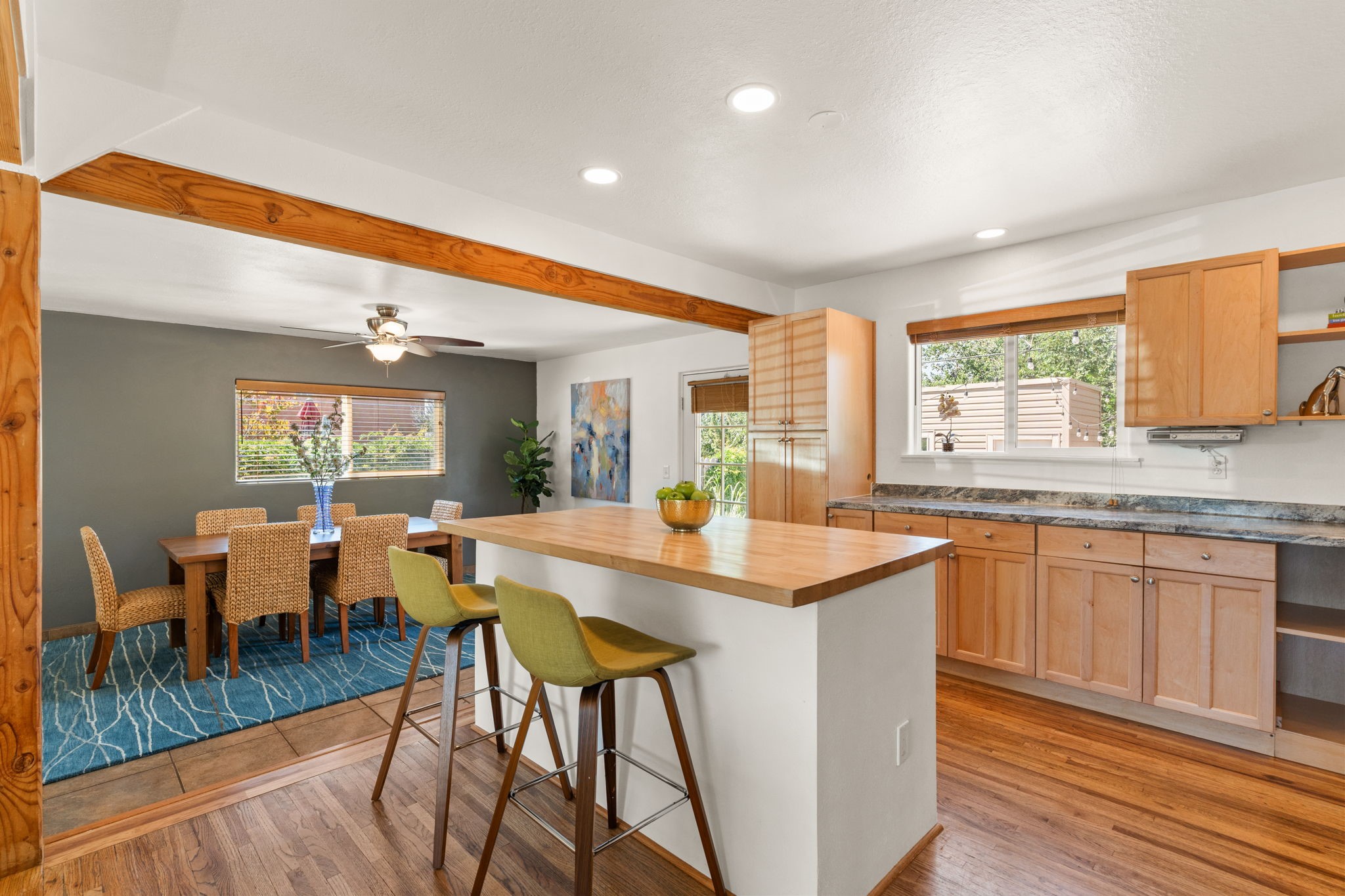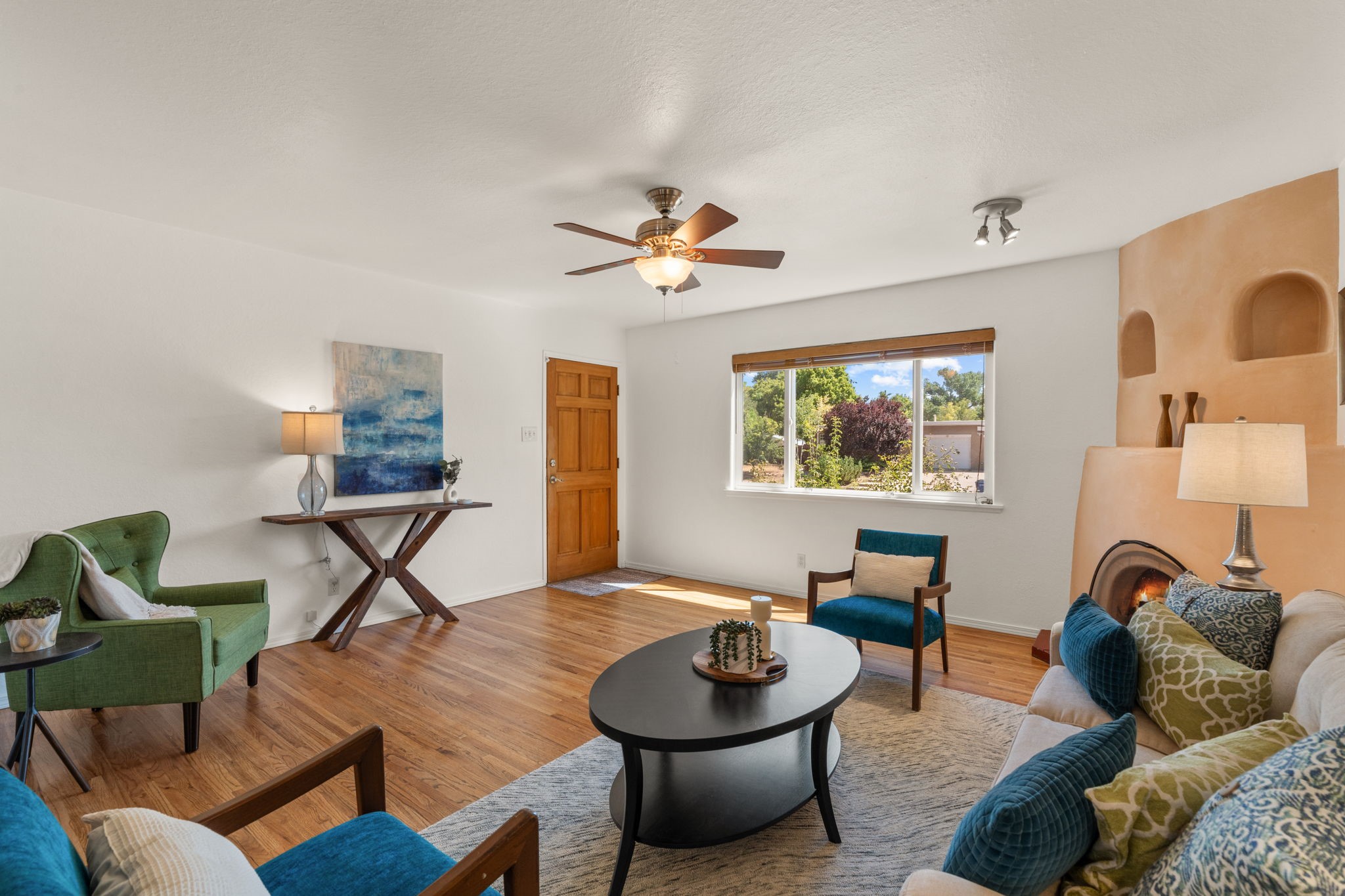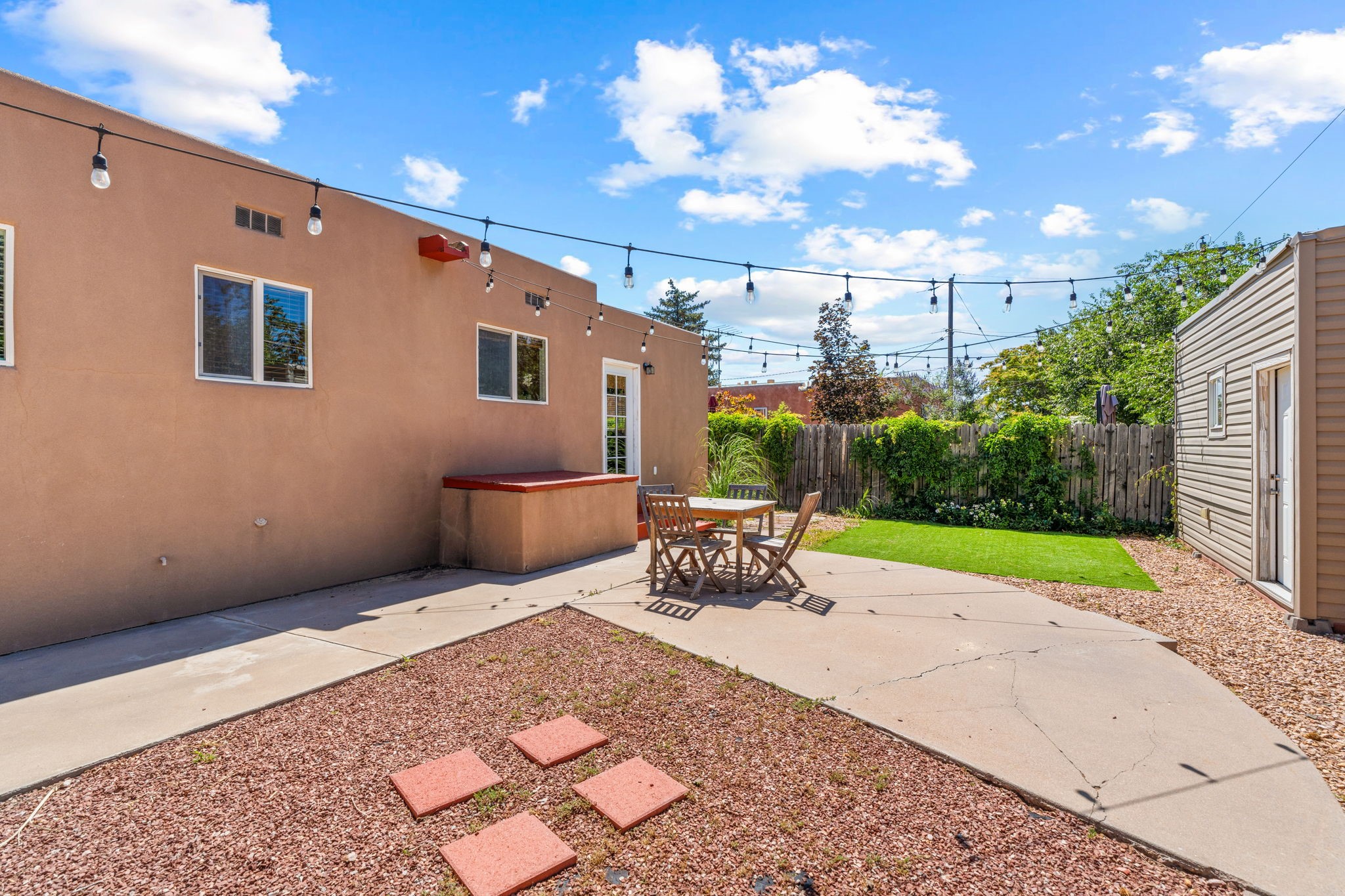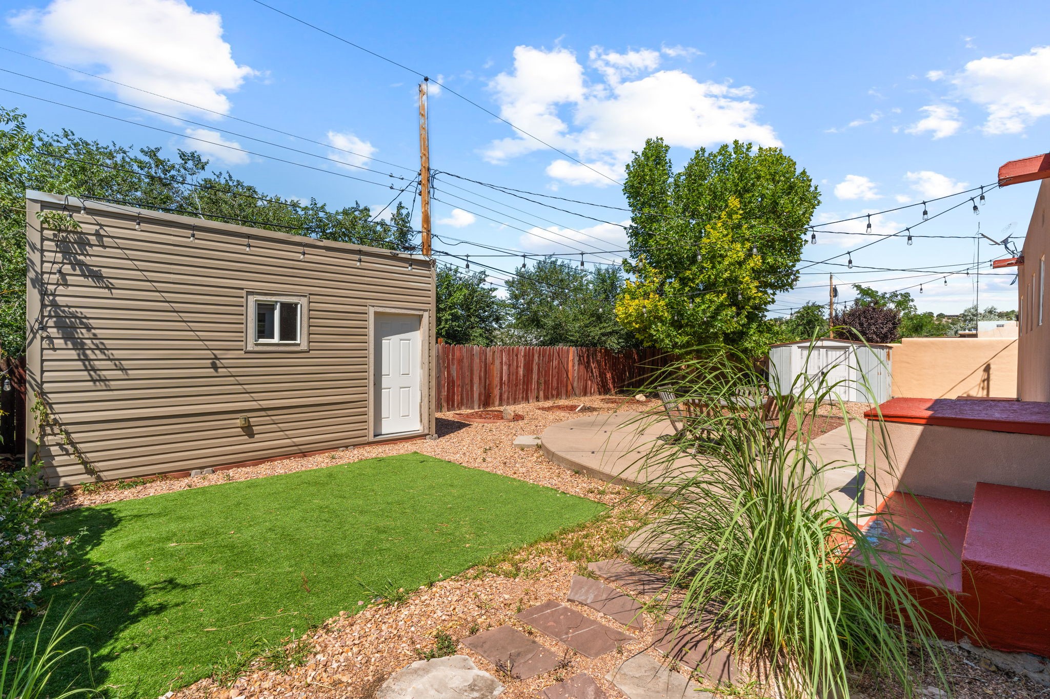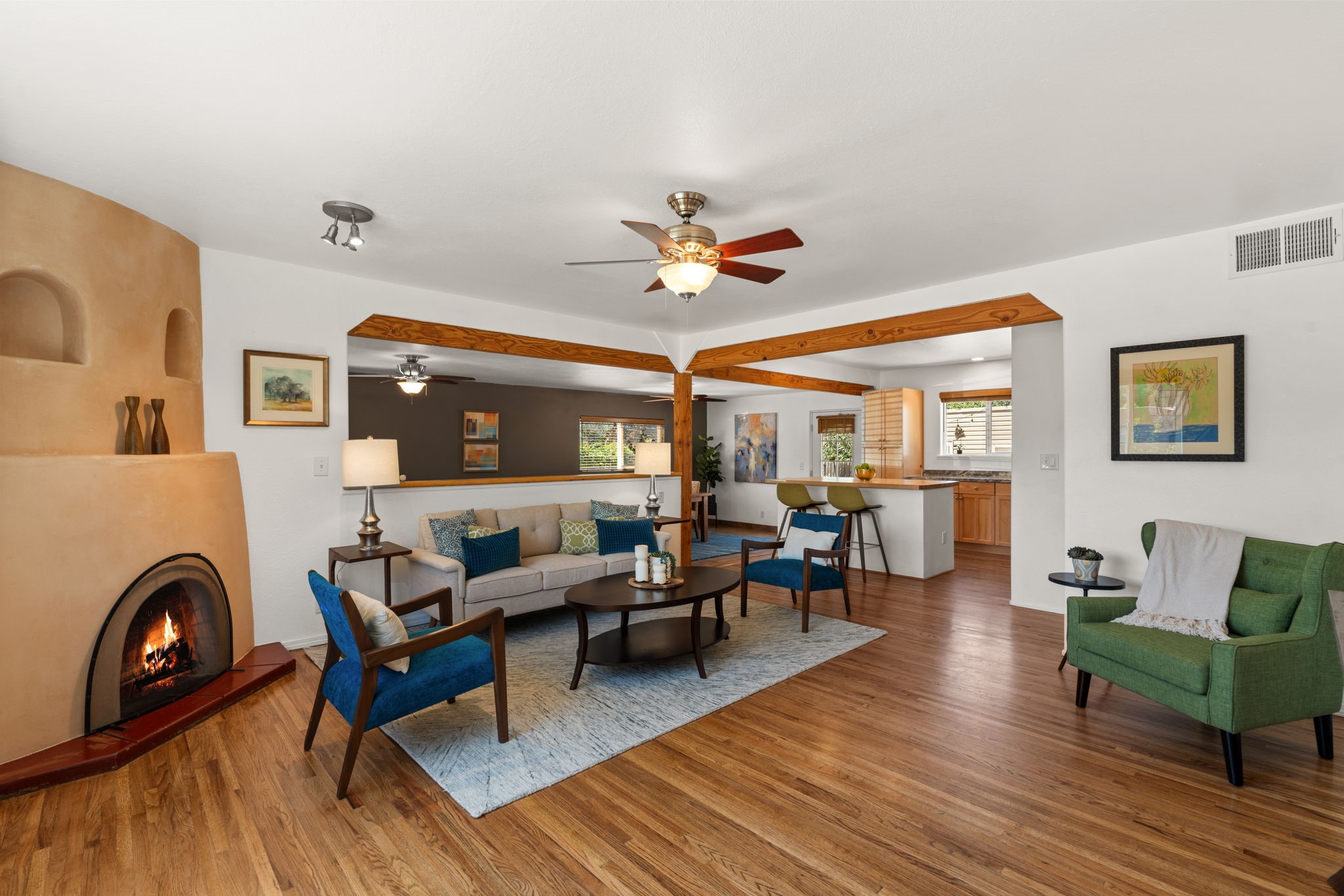 This light-filled and beautifully remodeled Stamm home offers captivating Sangre de Cristo mountain views and a seamless blend of classic charm and modern upgrades. The open floor plan centers around a spacious, completely updated kitchen featuring sleek cabinetry, stainless-steel appliances, and a generous butcher block island with ample storage--perfect for gathering and entertaining, with hardwood floors lending warmth throughout. The inviting living room boasts a cozy corner Kiva fireplace and a large picture window framing the unforgettable mountain vistas. The home offers three comfortable bedrooms, including a primary suite with a tastefully remodeled en suite bath. Central heating and A/C provide year-round comfort. Outside, the expansive and private back yard includes a large storage shed with shelving and a second smaller shed ideal for garden tools. With only one step throughout the entire home, accessibility is easy and effortless. Just moments from the Santa Fe River Trail, La Tierra trails and dog park, and within walking distance to local coffee shops and shopping, this property blends convenience, comfort, and natural beauty into a truly special place to call home.