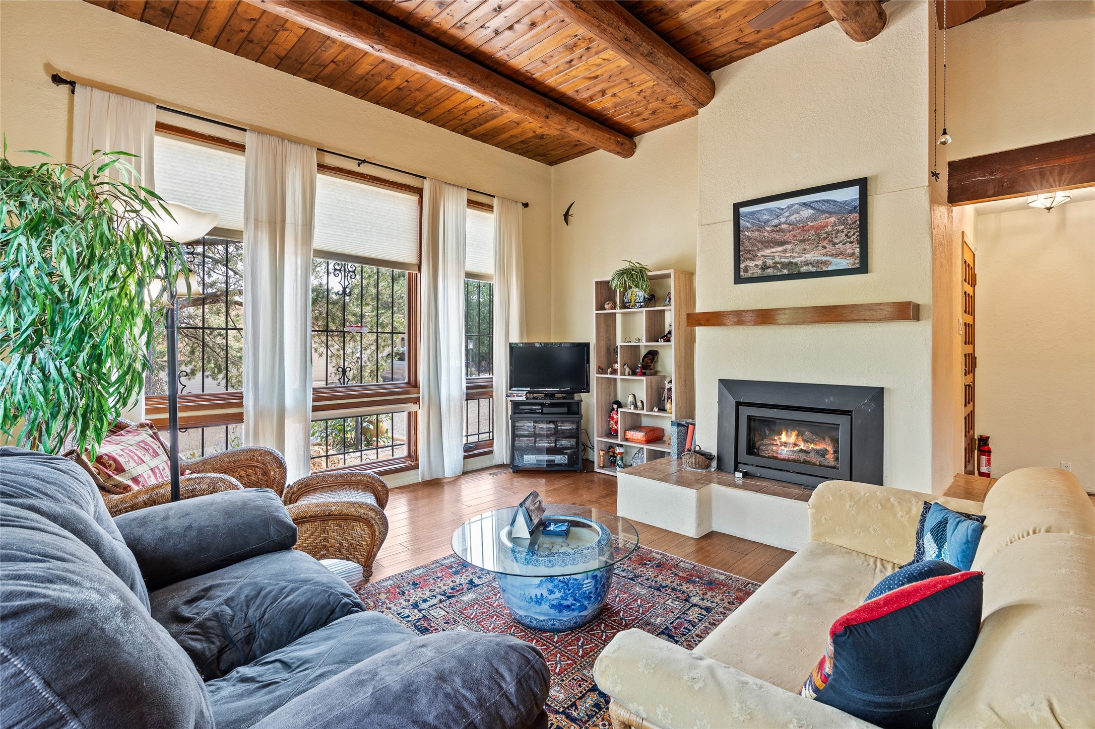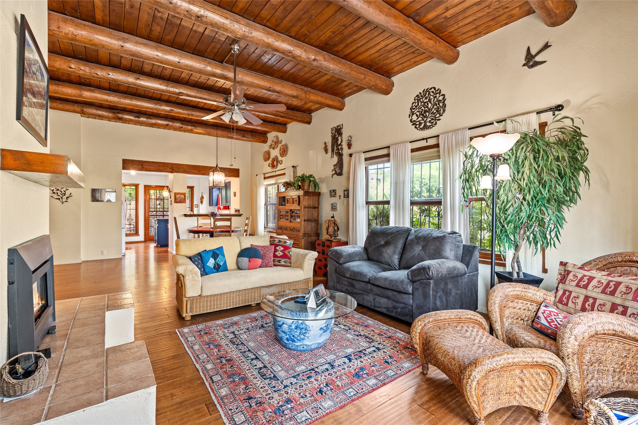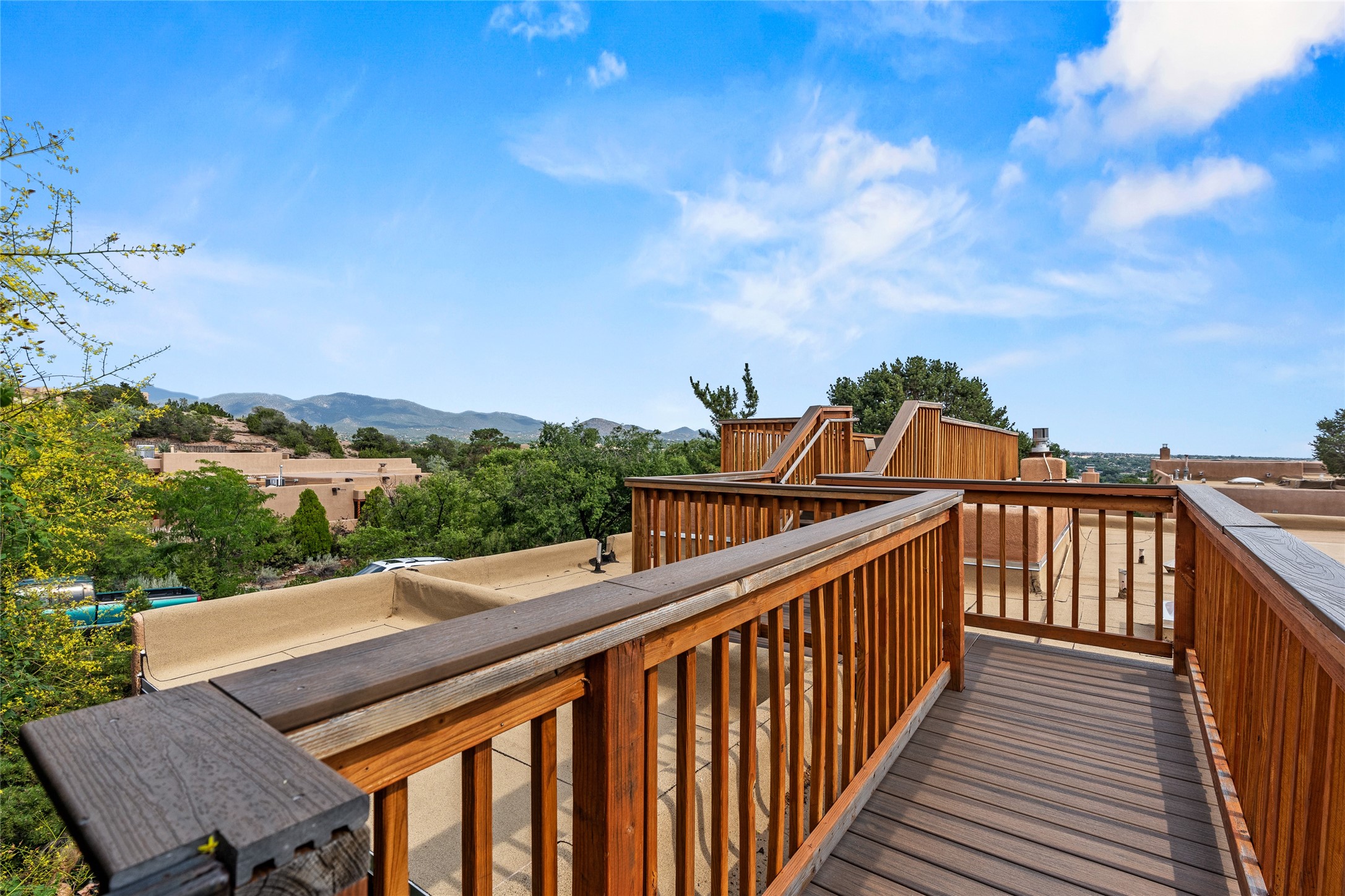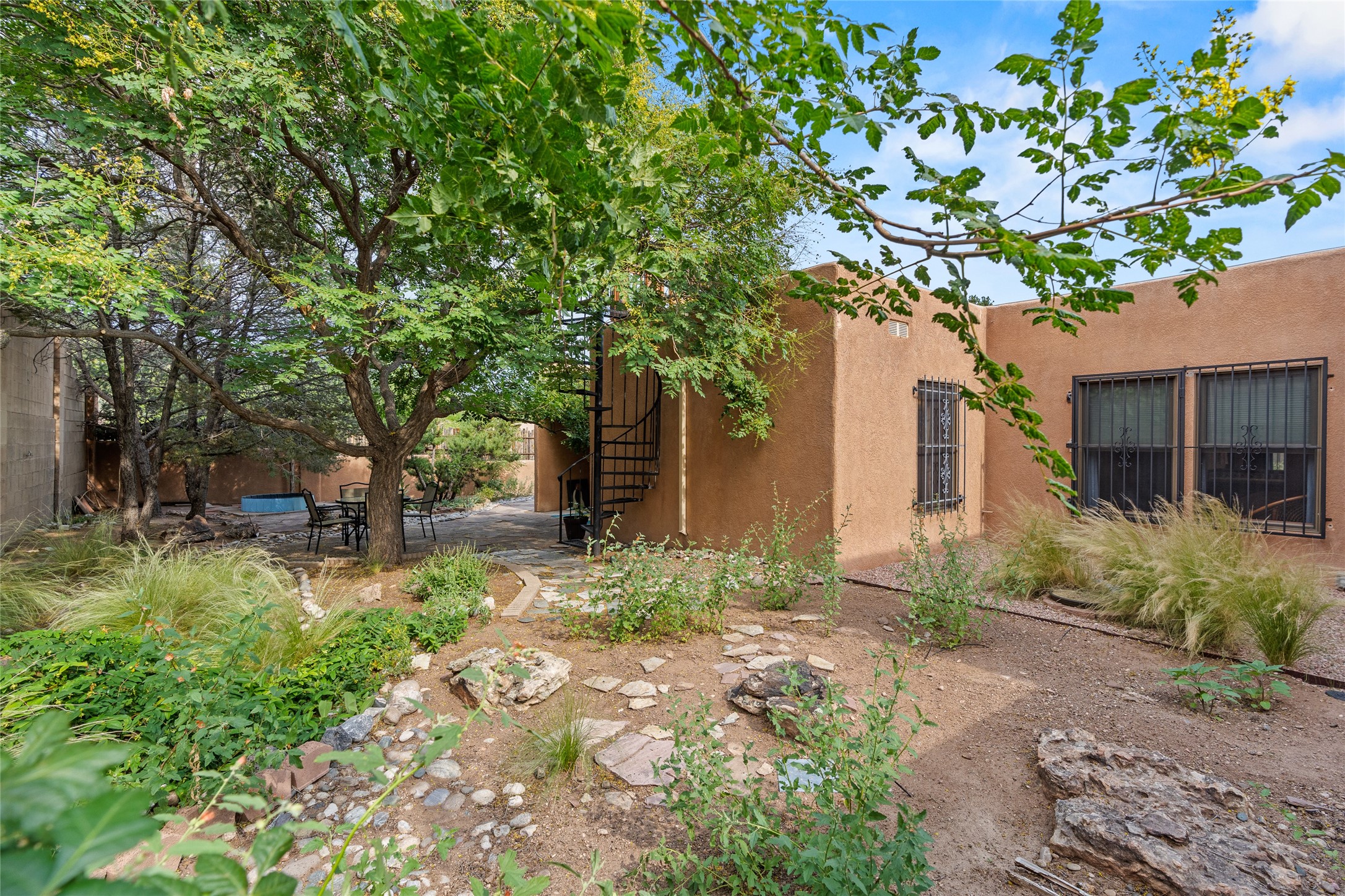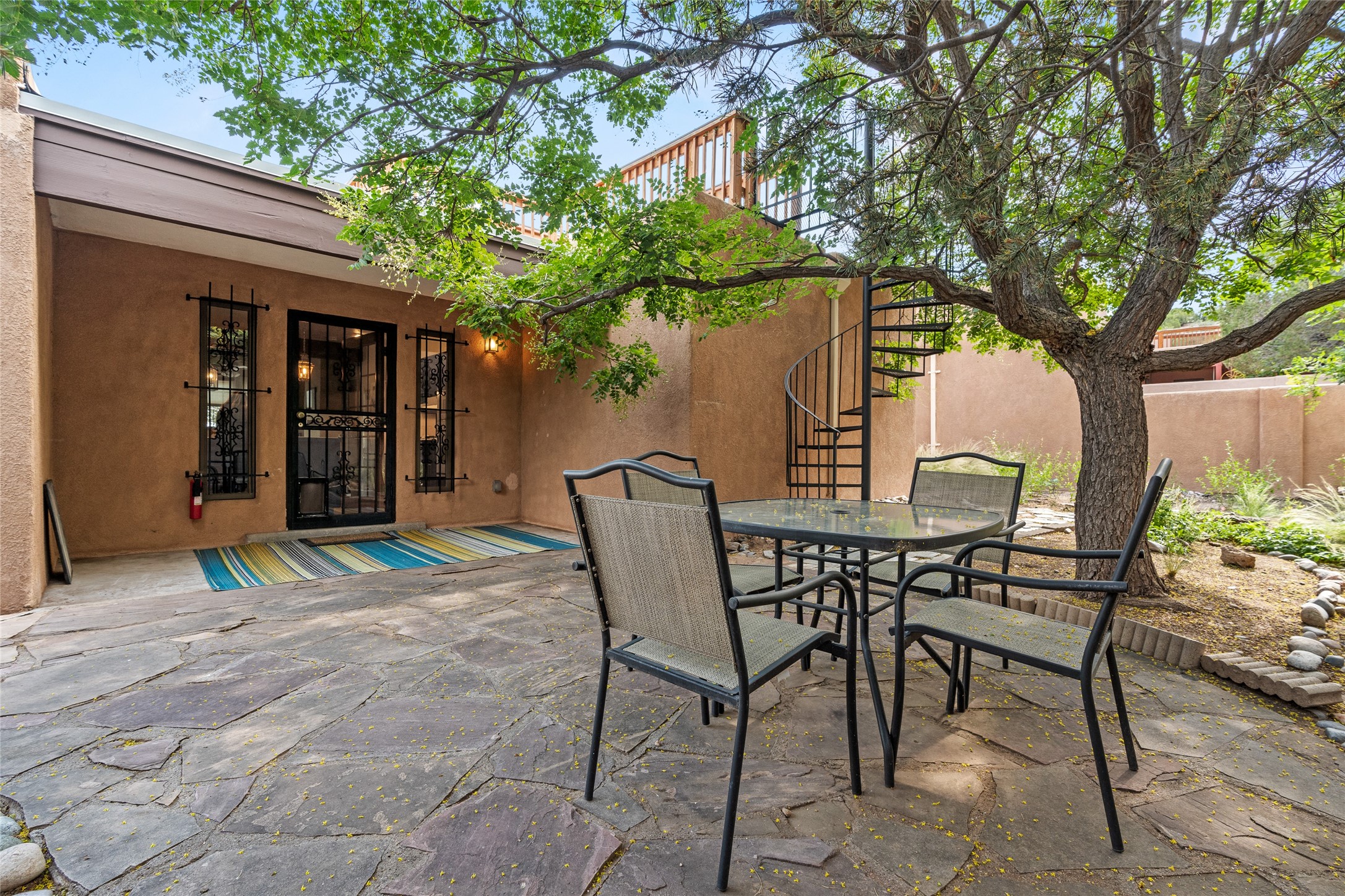 Located just minutes from downtown Santa Fe, the DeVargas Center, restaurants, and shopping, this beautiful 1,505 sqft townhouse offers comfort, style, and convenience. Featuring 2 bedrooms, 2 baths, and a 2 car garage this home includes a spacious primary ensuite with a walk-in closet, the guest bedroom also includes a walk-in closet and the guest bathroom has a soaking tub--perfect for relaxing after a long day. The living room welcomes you with tall ceilings, striking vigas, tongue-and-groove details, and a cozy fireplace, ideal for warm and inviting evenings. The bright, cheerful kitchen opens directly to the landscaped backyard, where you'll find a charming spiral staircase leading to the rooftop deck--offering sweeping views that make this home perfect for entertaining or enjoying a peaceful Santa Fe sunset. The front and back yards are landscaped and the back is enclosed with classic coyote fencing, providing privacy and a touch of Southwestern charm. Don't miss this opportunity to own a unique and inviting home in a prime location.