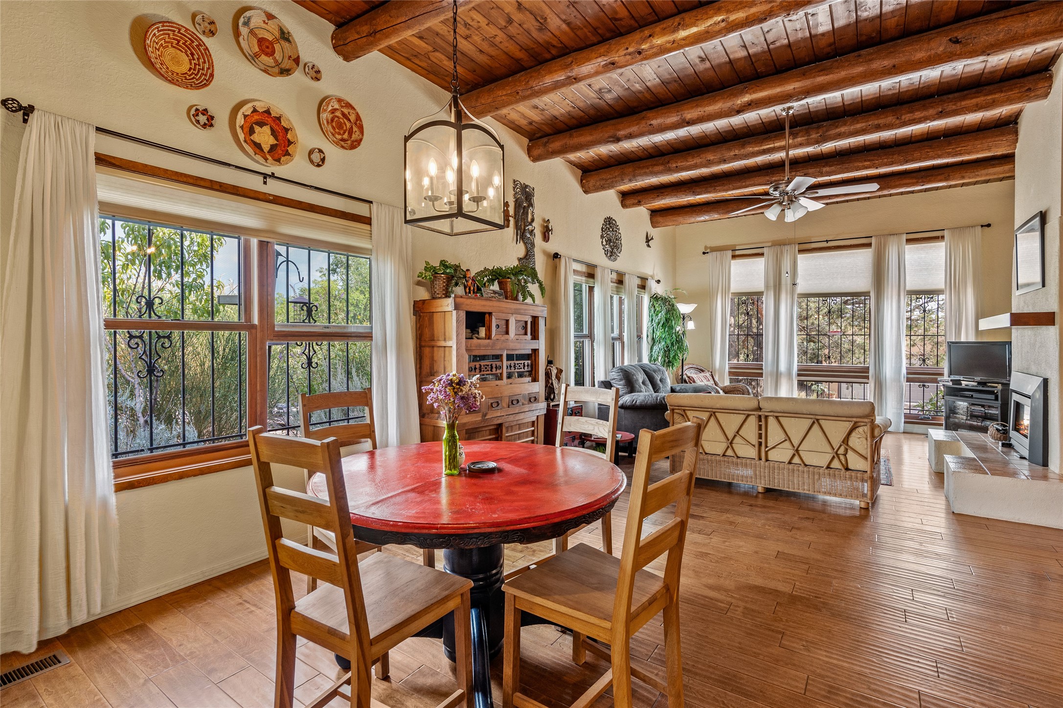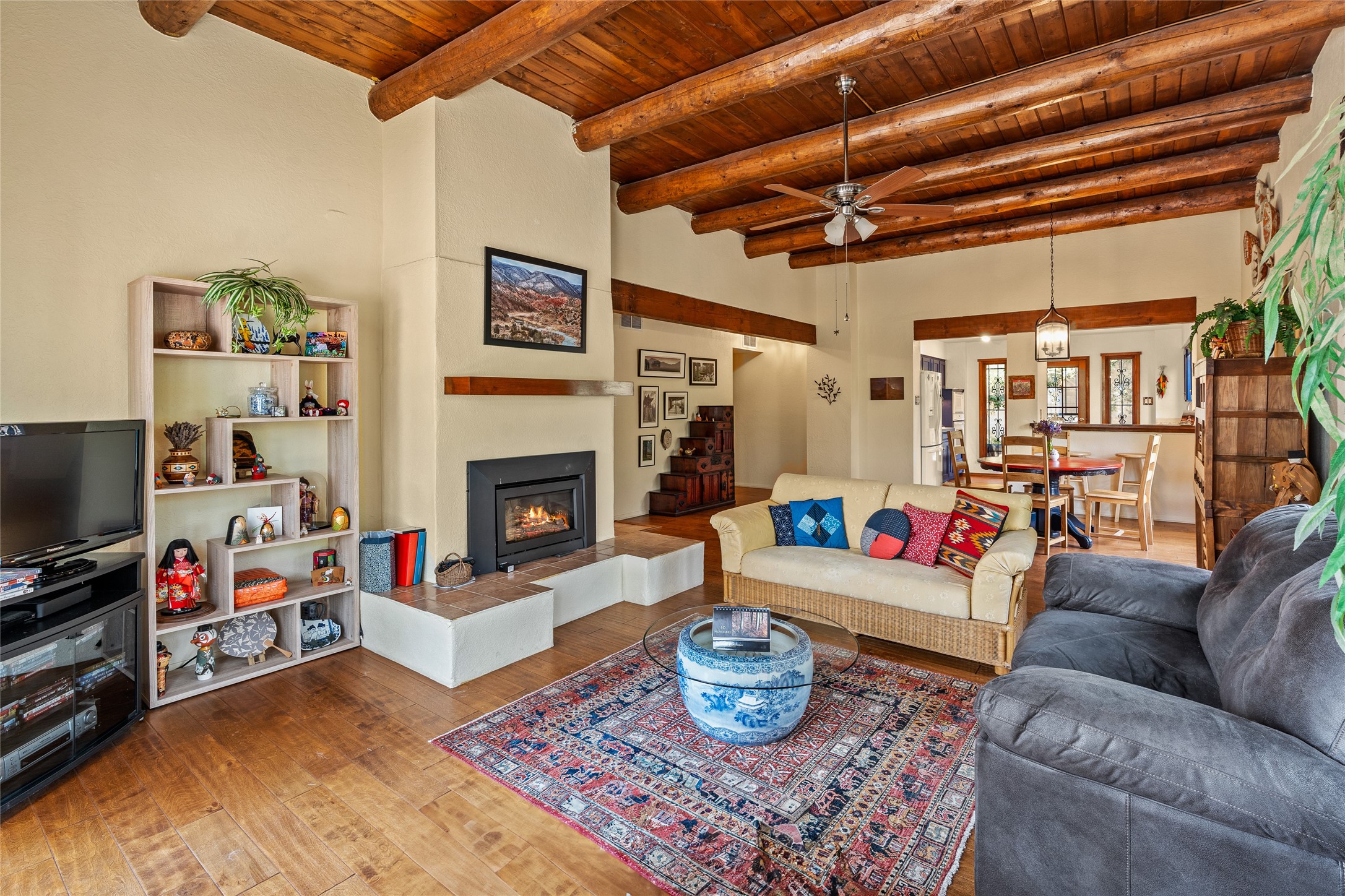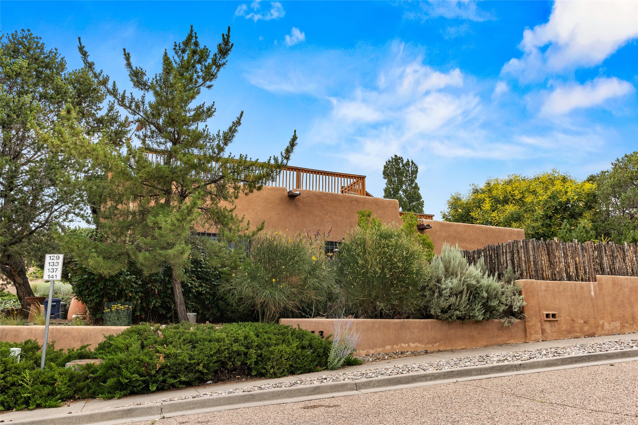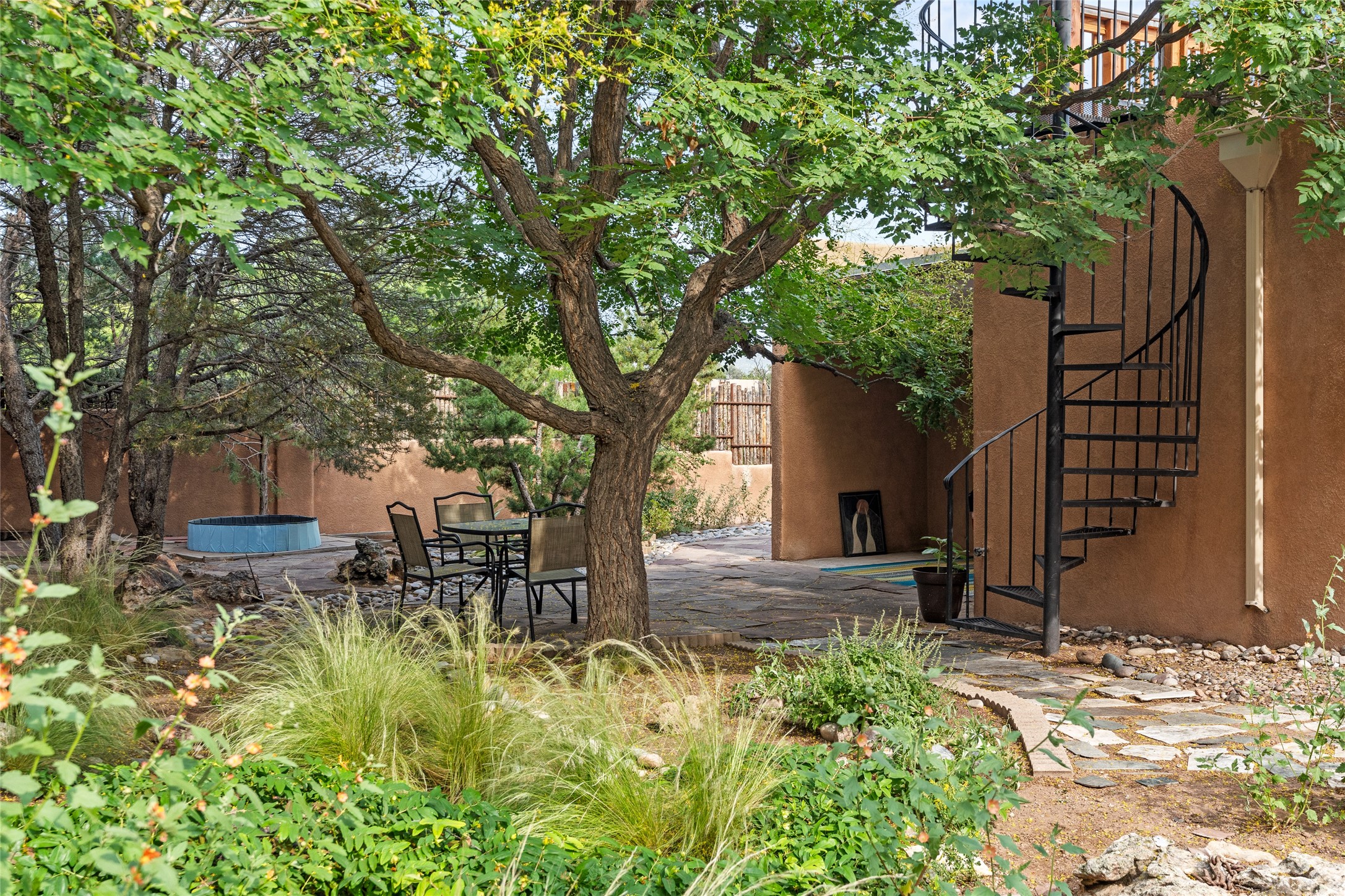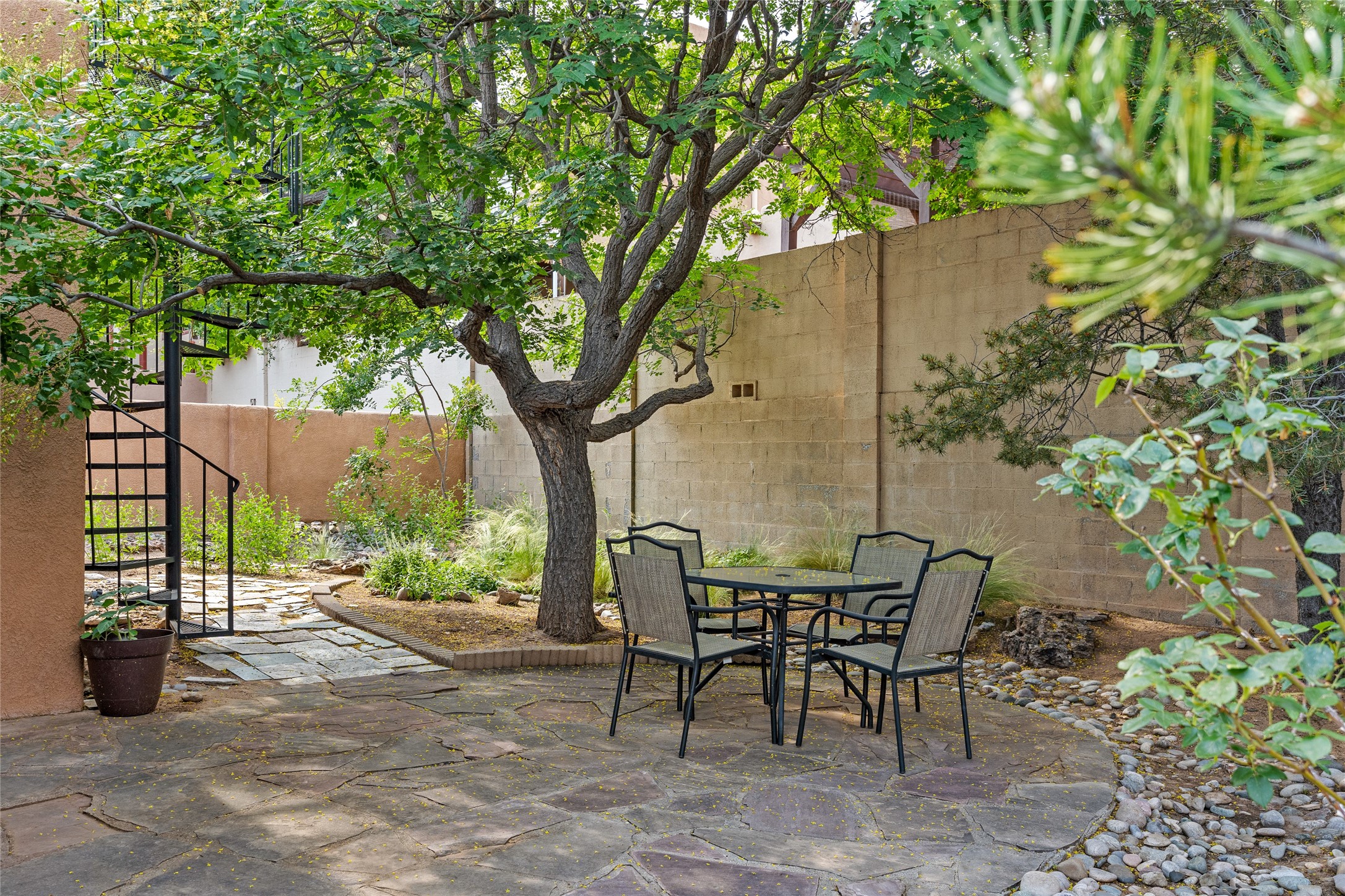 Located just minutes from downtown Santa Fe, the DeVargas Center, restaurants, and shopping, this beautiful 1,505 sqft townhouse offers comfort, style, and convenience. Featuring 2 bedrooms, 2 baths, and a 2 car garage this home includes a spacious primary ensuite with a walk-in closet, the guest bedroom also includes a walk-in closet and the guest bathroom has a soaking tub--perfect for relaxing after a long day. The living room welcomes you with tall ceilings, striking vigas, tongue-and-groove details, and a cozy fireplace, ideal for warm and inviting evenings. The bright, cheerful kitchen opens directly to the landscaped backyard, where you'll find a charming spiral staircase leading to the rooftop deck--offering sweeping views that make this home perfect for entertaining or enjoying a peaceful Santa Fe sunset. The front and back yards are landscaped and the back is enclosed with classic coyote fencing, providing privacy and a touch of Southwestern charm. Don't miss this opportunity to own a unique and inviting home in a prime location.