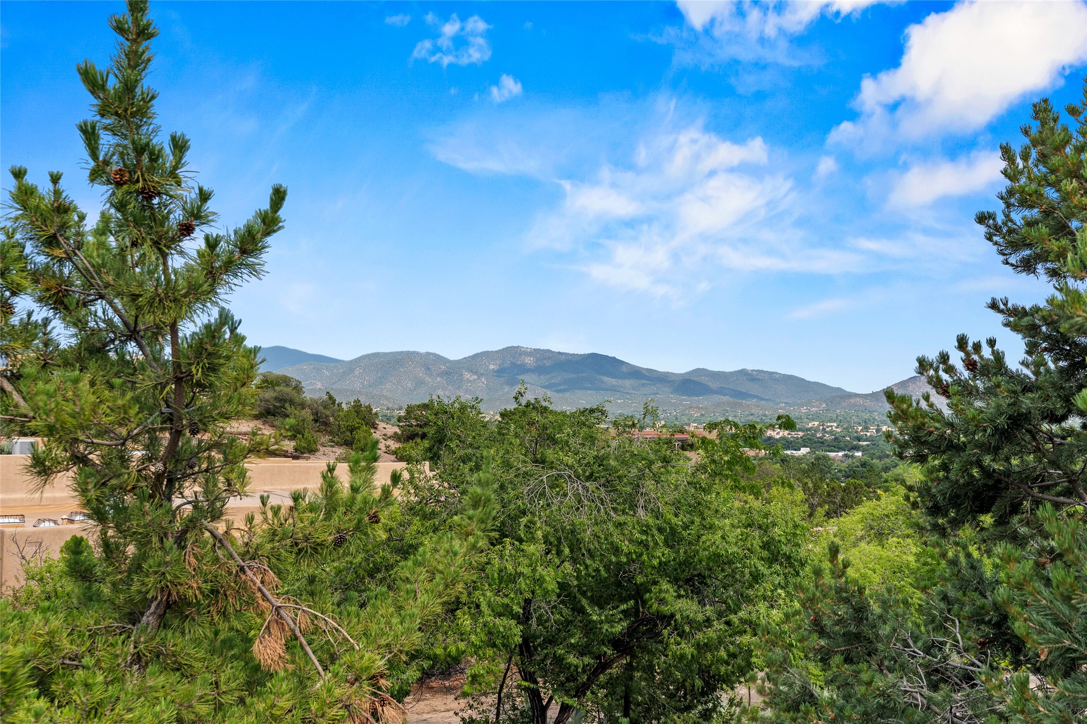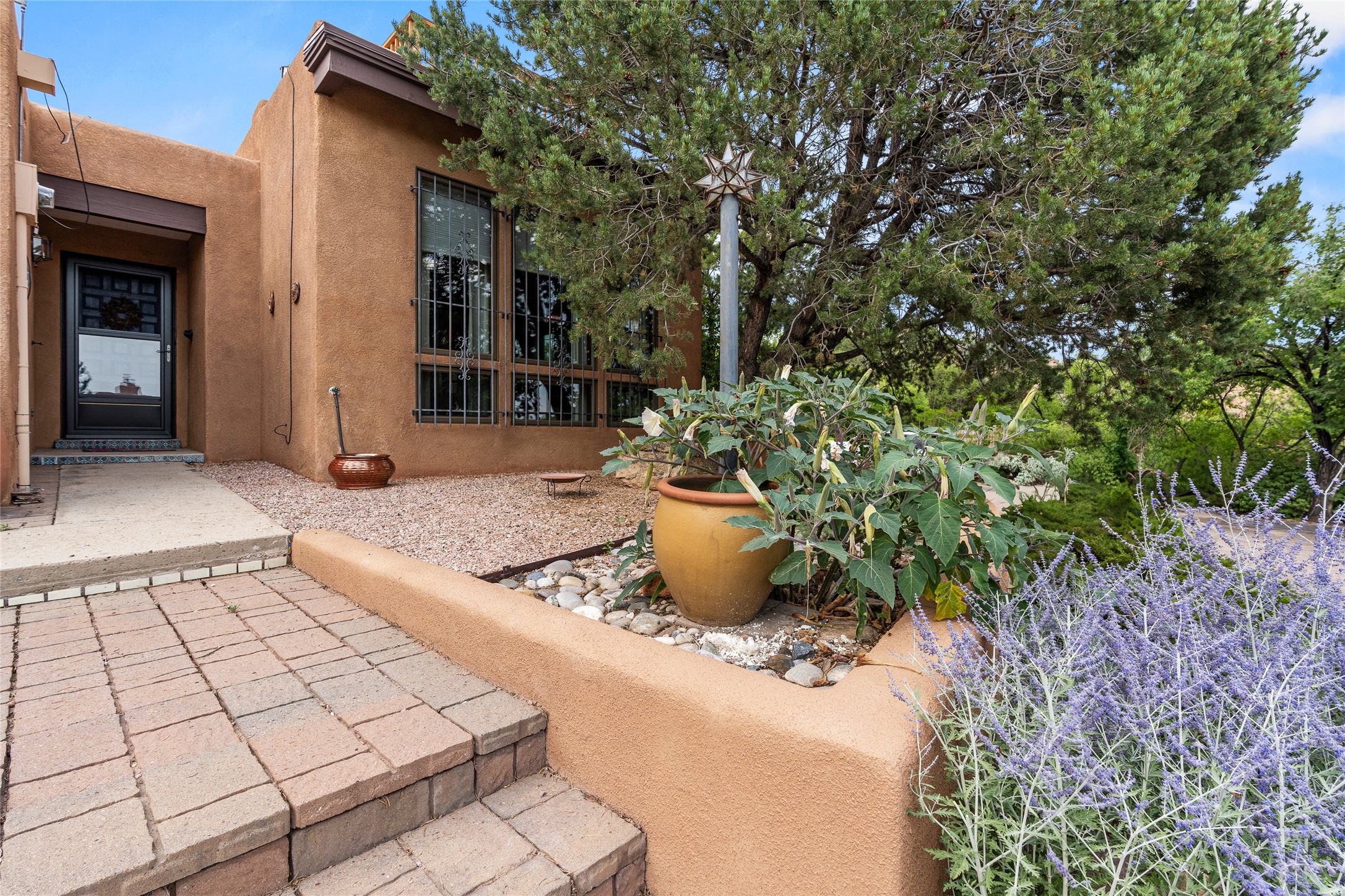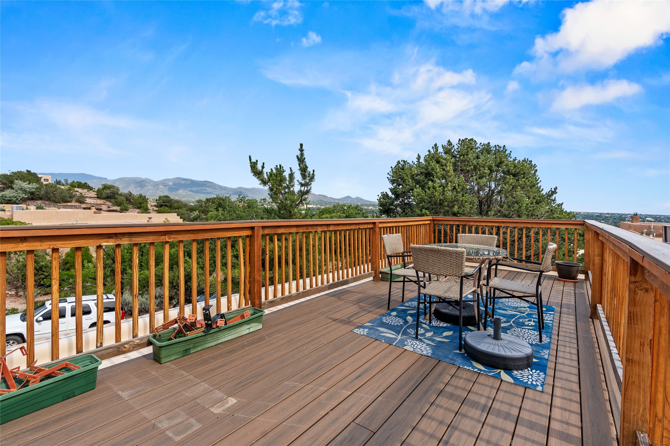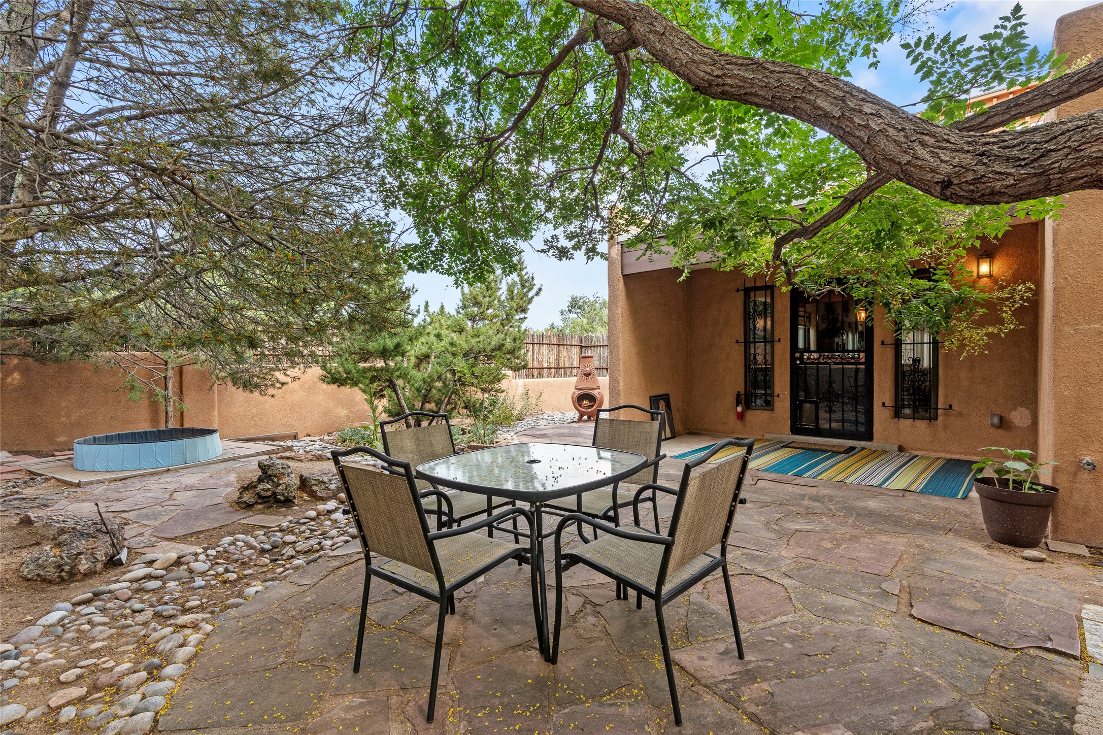 Located just minutes from downtown Santa Fe, the DeVargas Center, restaurants, and shopping, this beautiful 1,505 sqft townhouse offers comfort, style, and convenience. Featuring 2 bedrooms, 2 baths, and a 2 car garage this home includes a spacious primary ensuite with a walk-in closet, the guest bedroom also includes a walk-in closet and the guest bathroom has a soaking tub--perfect for relaxing after a long day. The living room welcomes you with tall ceilings, striking vigas, tongue-and-groove details, and a cozy fireplace, ideal for warm and inviting evenings. The bright, cheerful kitchen opens directly to the landscaped backyard, where you'll find a charming spiral staircase leading to the rooftop deck--offering sweeping views that make this home perfect for entertaining or enjoying a peaceful Santa Fe sunset. The front and back yards are landscaped and the back is enclosed with classic coyote fencing, providing privacy and a touch of Southwestern charm. Don't miss this opportunity to own a unique and inviting home in a prime location.
