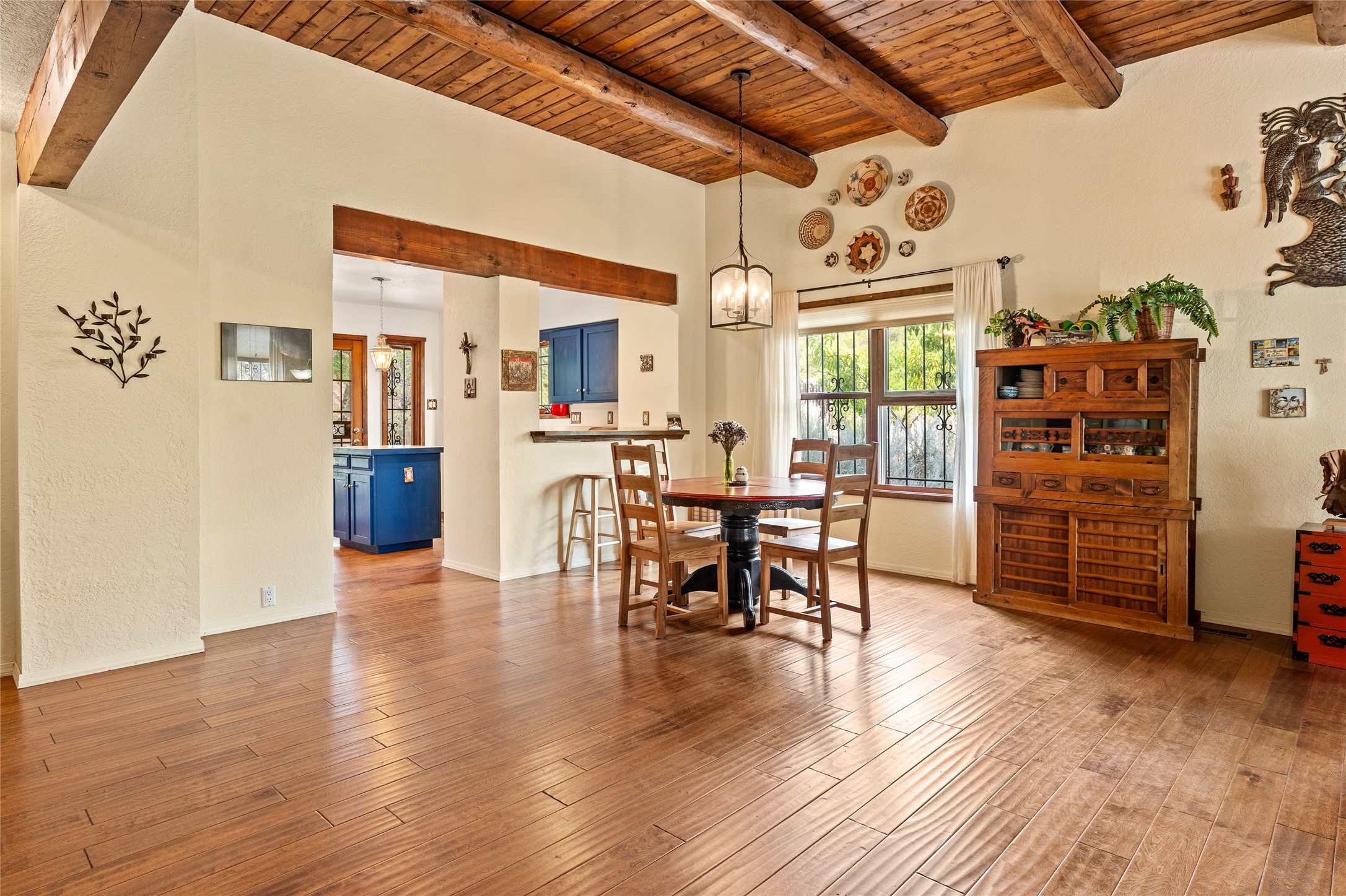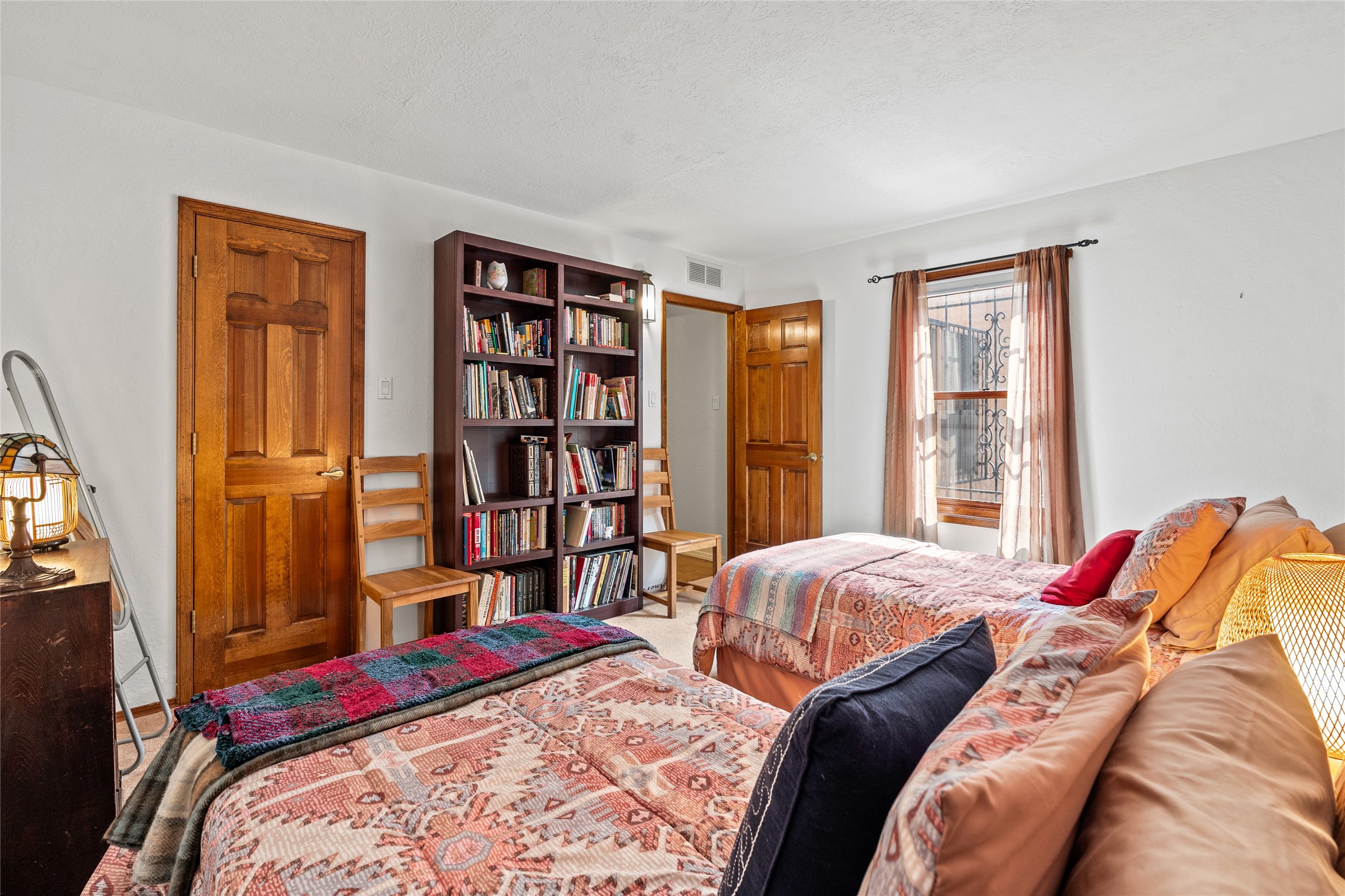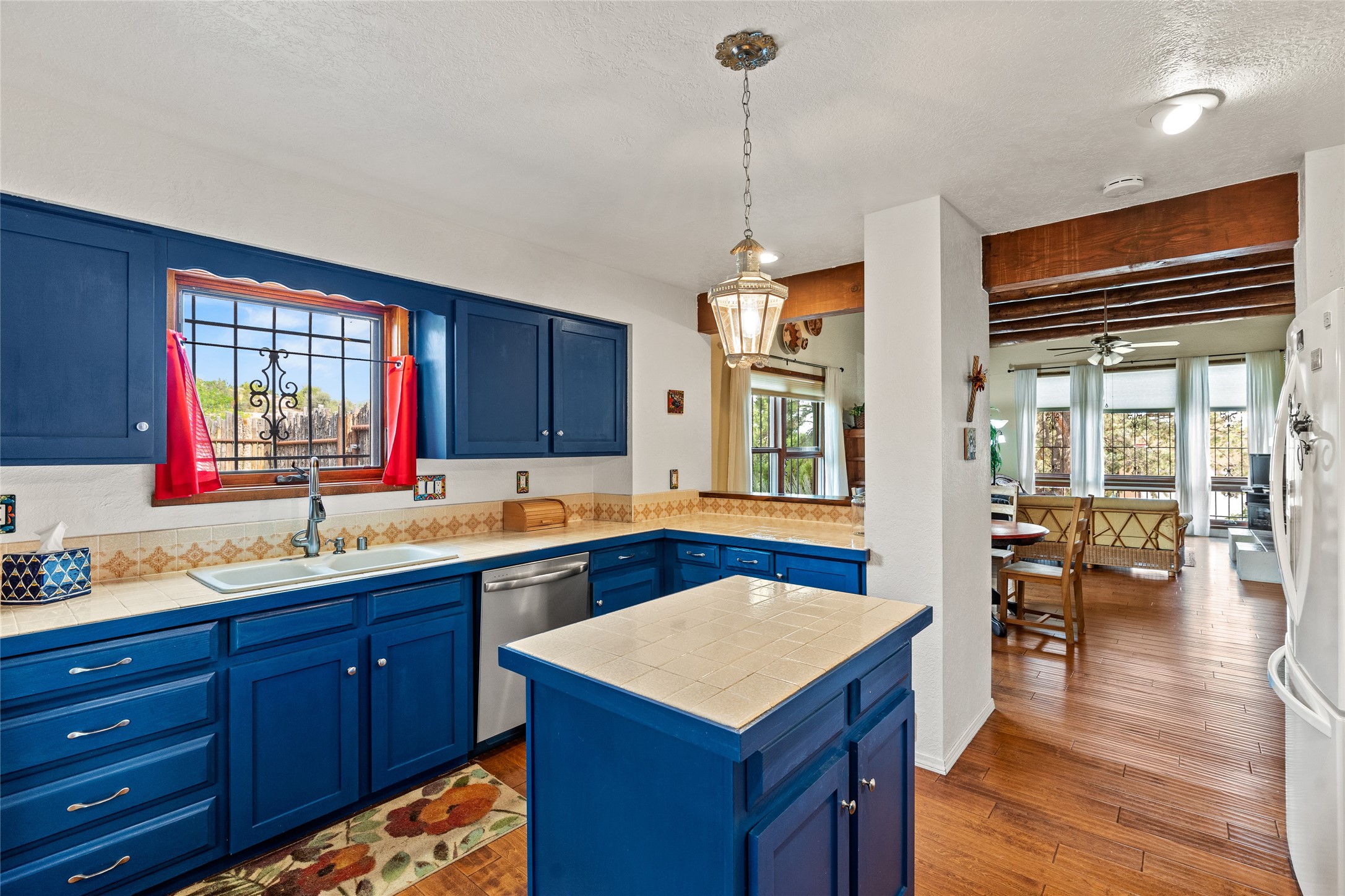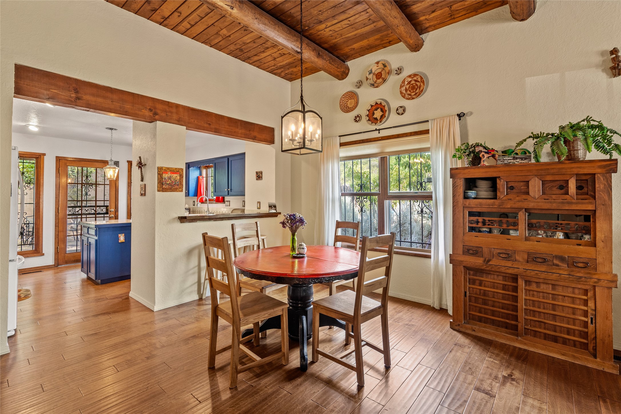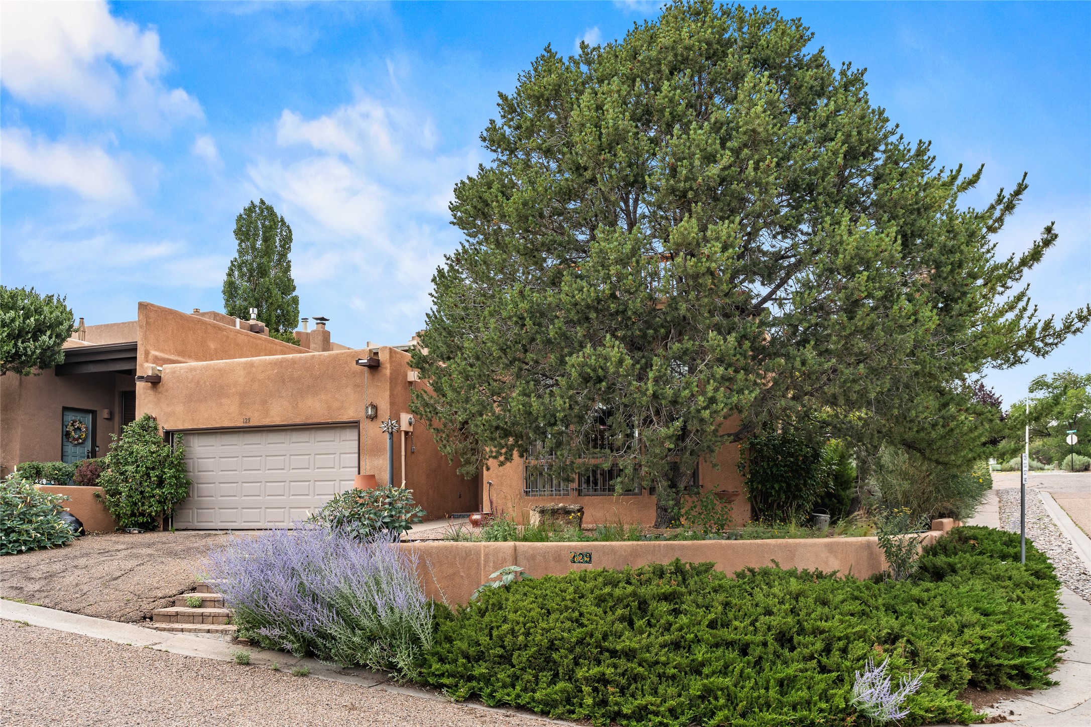 Located just minutes from downtown Santa Fe, the DeVargas Center, restaurants, and shopping, this beautiful 1,505 sqft townhouse offers comfort, style, and convenience. Featuring 2 bedrooms, 2 baths, and a 2 car garage this home includes a spacious primary ensuite with a walk-in closet, the guest bedroom also includes a walk-in closet and the guest bathroom has a soaking tub--perfect for relaxing after a long day. The living room welcomes you with tall ceilings, striking vigas, tongue-and-groove details, and a cozy fireplace, ideal for warm and inviting evenings. The bright, cheerful kitchen opens directly to the landscaped backyard, where you'll find a charming spiral staircase leading to the rooftop deck--offering sweeping views that make this home perfect for entertaining or enjoying a peaceful Santa Fe sunset. The front and back yards are landscaped and the back is enclosed with classic coyote fencing, providing privacy and a touch of Southwestern charm. Don't miss this opportunity to own a unique and inviting home in a prime location.