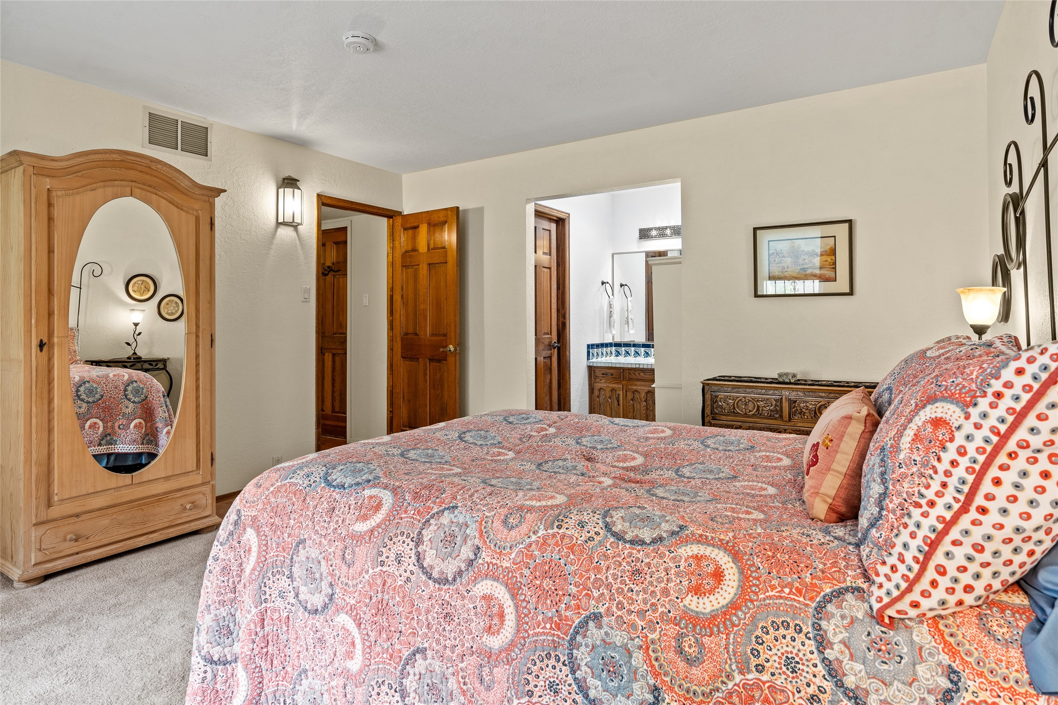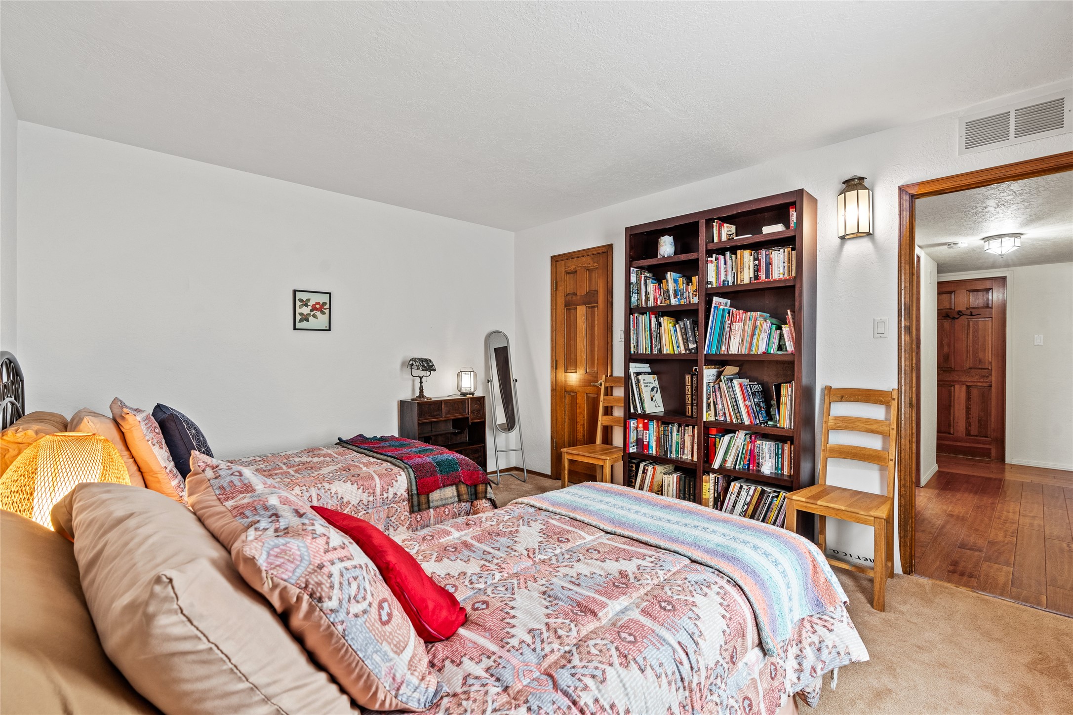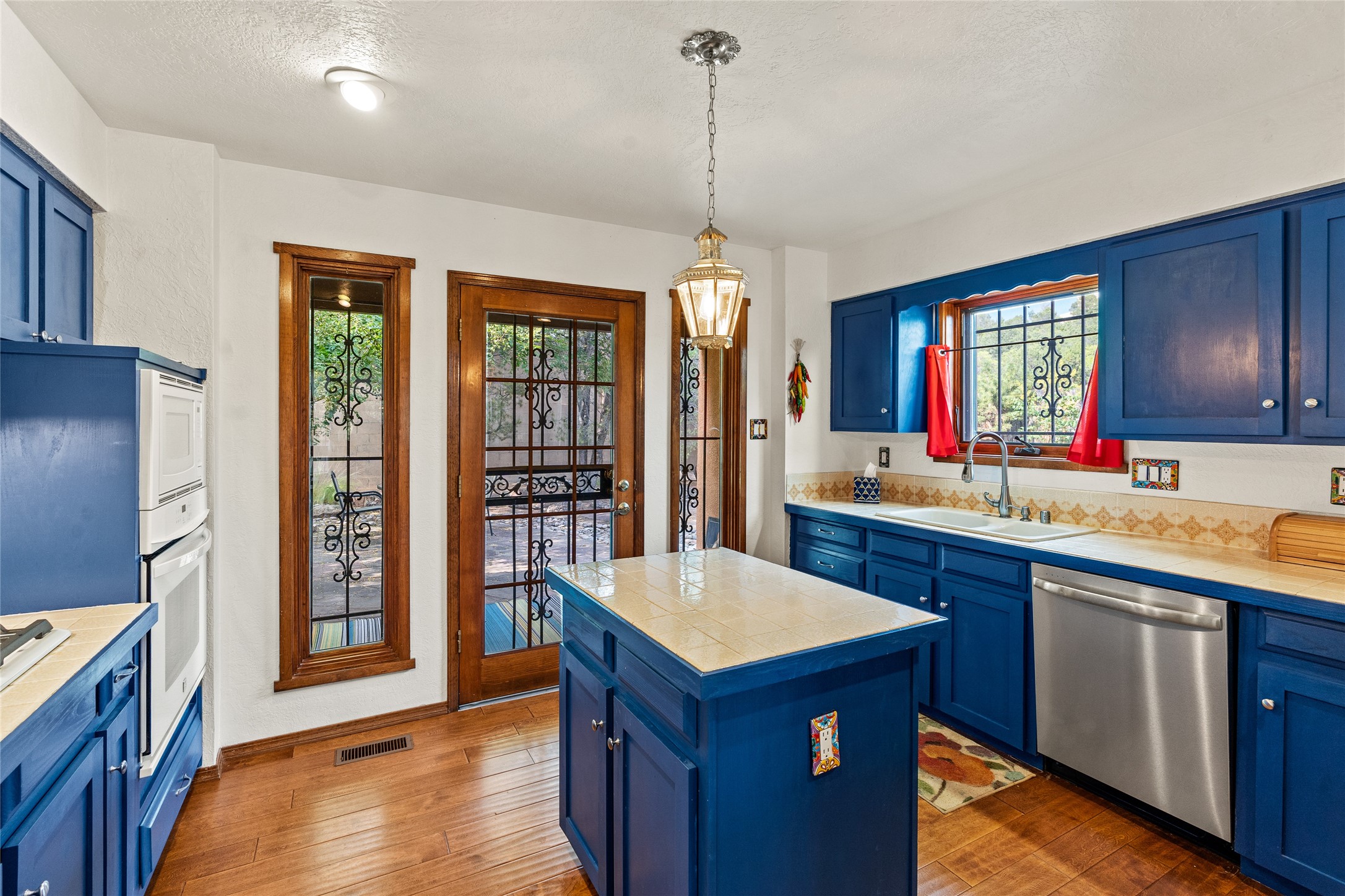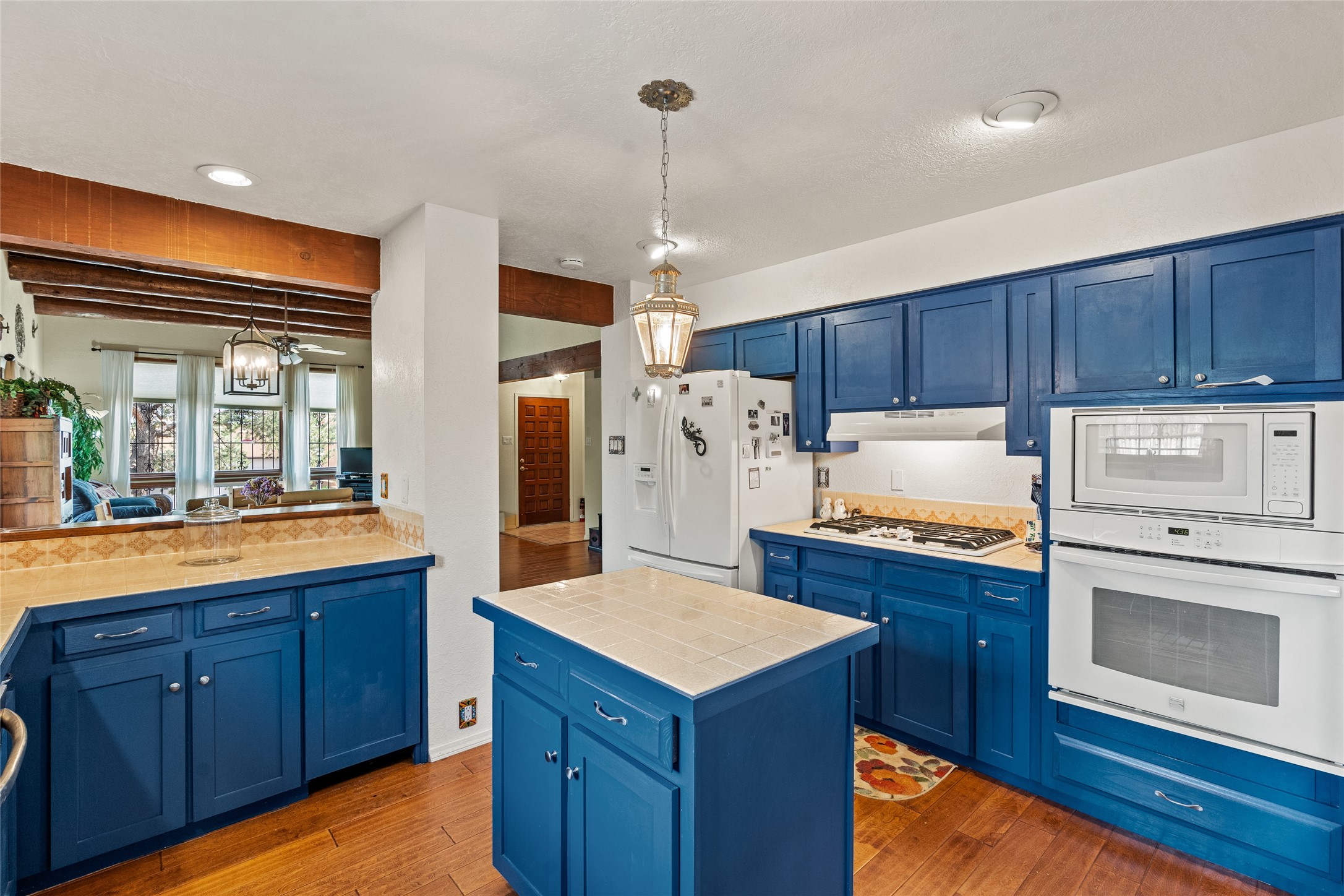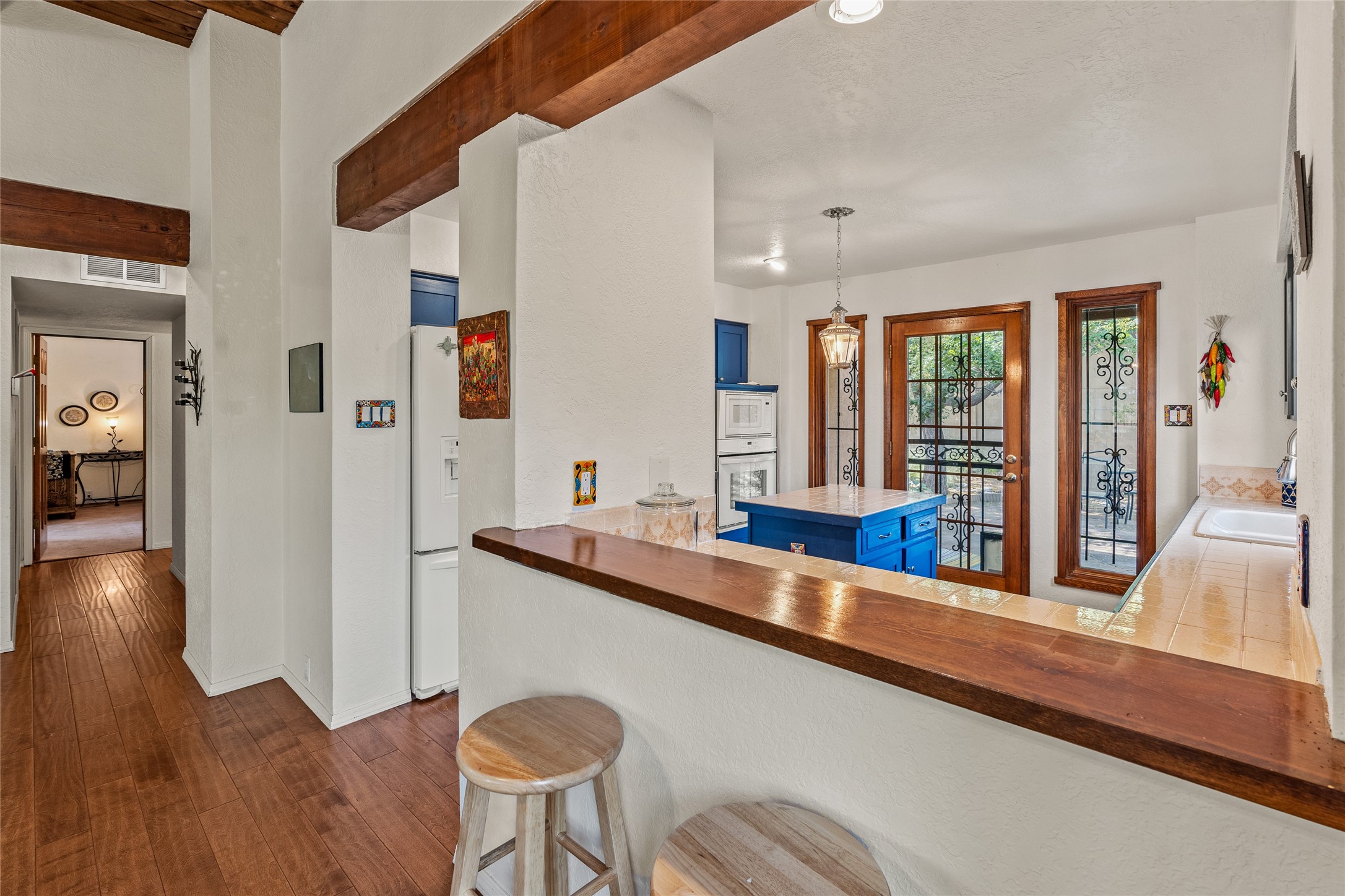 Located just minutes from downtown Santa Fe, the DeVargas Center, restaurants, and shopping, this beautiful 1,505 sqft townhouse offers comfort, style, and convenience. Featuring 2 bedrooms, 2 baths, and a 2 car garage this home includes a spacious primary ensuite with a walk-in closet, the guest bedroom also includes a walk-in closet and the guest bathroom has a soaking tub--perfect for relaxing after a long day. The living room welcomes you with tall ceilings, striking vigas, tongue-and-groove details, and a cozy fireplace, ideal for warm and inviting evenings. The bright, cheerful kitchen opens directly to the landscaped backyard, where you'll find a charming spiral staircase leading to the rooftop deck--offering sweeping views that make this home perfect for entertaining or enjoying a peaceful Santa Fe sunset. The front and back yards are landscaped and the back is enclosed with classic coyote fencing, providing privacy and a touch of Southwestern charm. Don't miss this opportunity to own a unique and inviting home in a prime location.