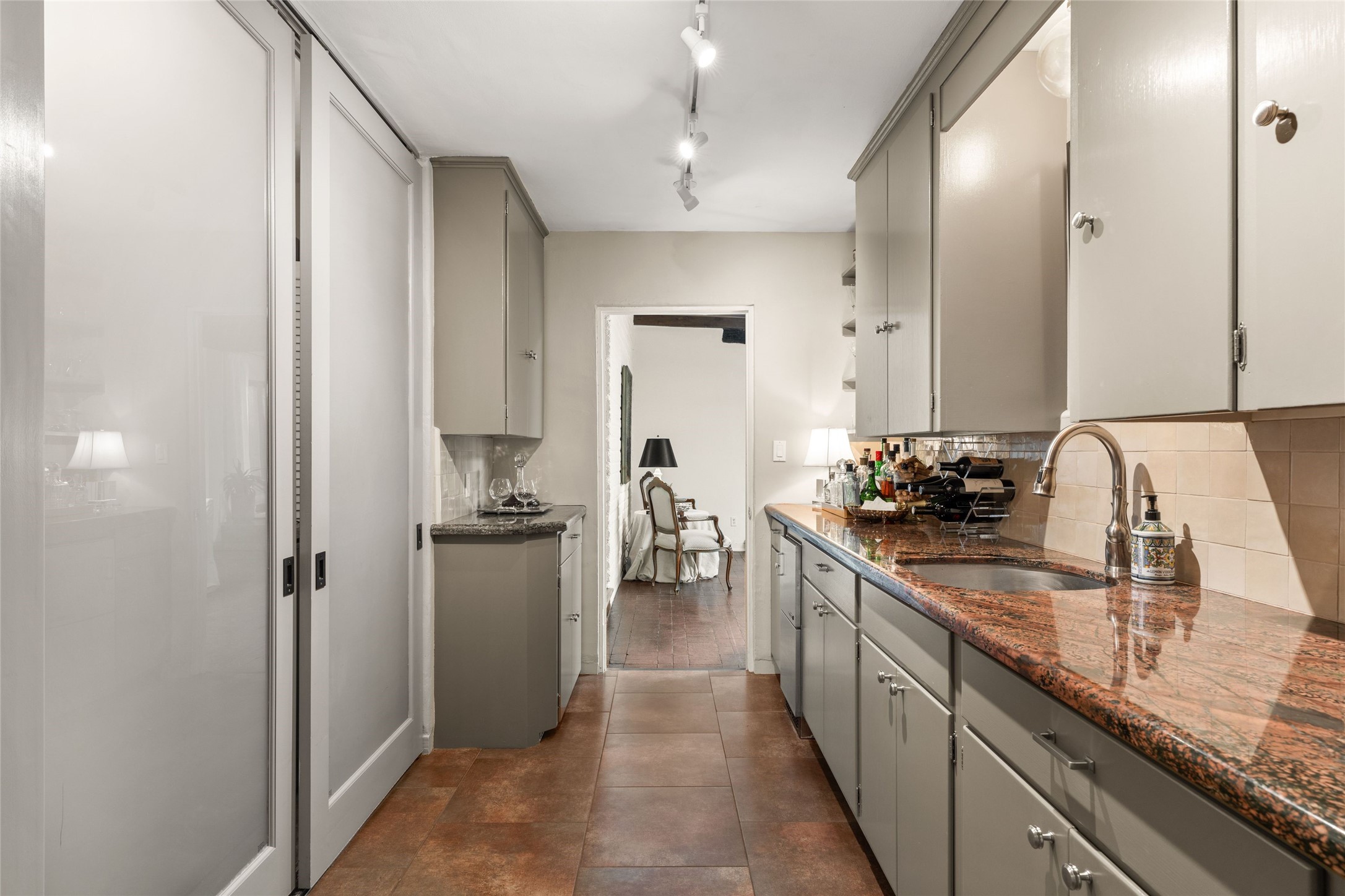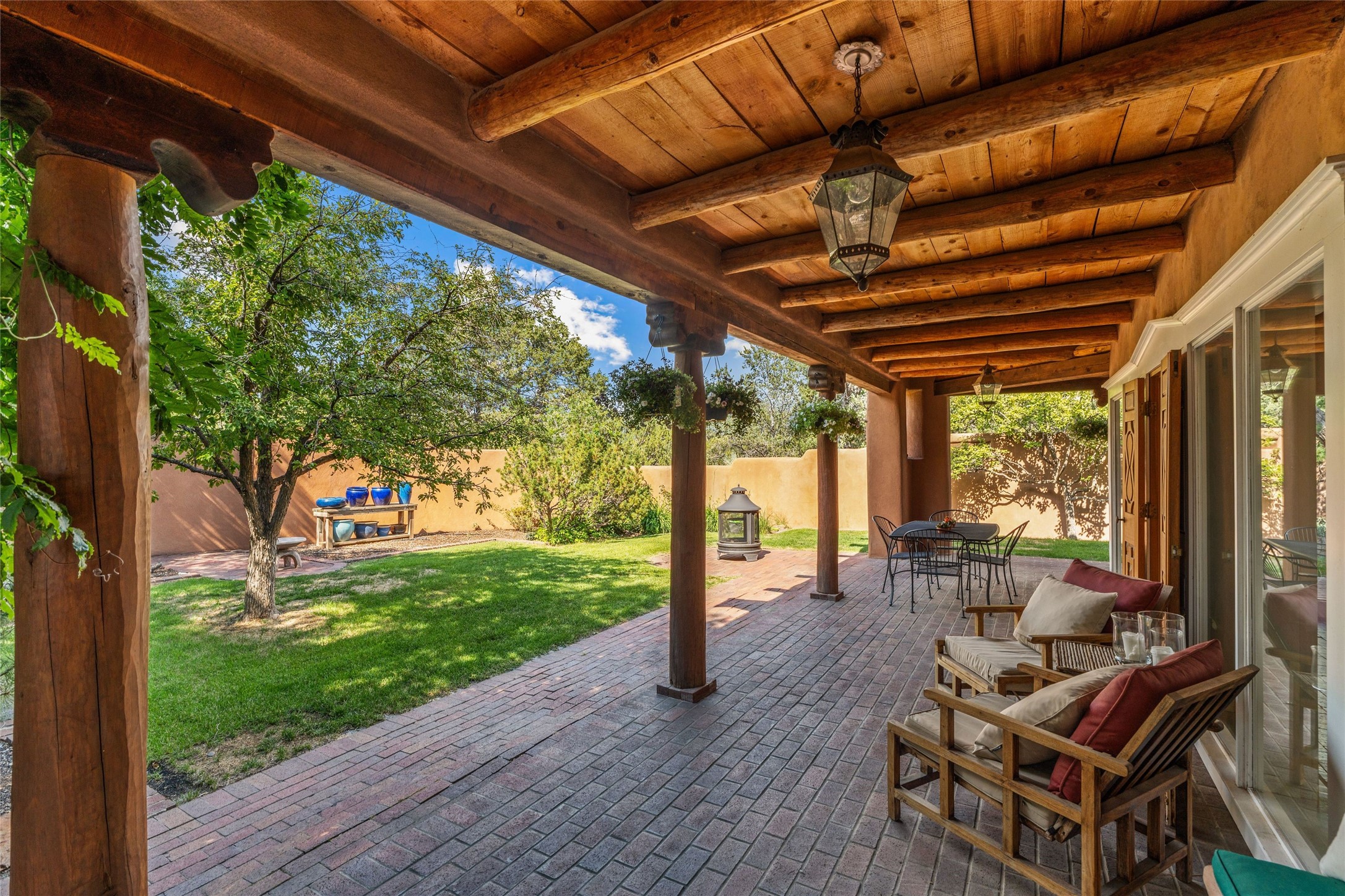 Classic Santa Fe 6 bedroom 5-bath estate in a country-like setting in a coveted location close to Museum Hill, the historic Plaza and Canyon Road. Sited on 1 acre with towering trees, this recently renovated property which includes an attached casita offers the rich combination of old-world elegance blended with iconic Southwestern architecture with brick flooring, beamed ceilings, and carefully-crafted, sculpted corbels. The graceful living room with beamed, brick floors and built-in bookshelves is enhanced by the warmth of a kiva fireplace. For friendly gatherings or formal occasions, the dining room with wall-to-wall windows and access to a back portal and peaceful yard will charm all. Culinary enthusiasts will appreciate the renovated French country kitchen with a breakfast area, large island, granite countertops, Electrolux 6-burner range, and a Subzero refrigerator. In addition, there is a generous butler's pantry with a sink and ice maker connected to the kitchen. The spacious primary suite showcases custom wall-to-wall bookshelves, an attached office, multiple dressing areas, closets and an incredible bath. On the lower level, you'll discover a den/media room with a wood burning fireplace, 2 bedrooms with shared bath and a 450 sq. ft. casita with mini kitchenette. Multi portals and outdoor areas provide opportunities for summer soirees and intimate al fresco meals. 2-car attached garage. An exceptional opportunity to own a home in this special area of town.