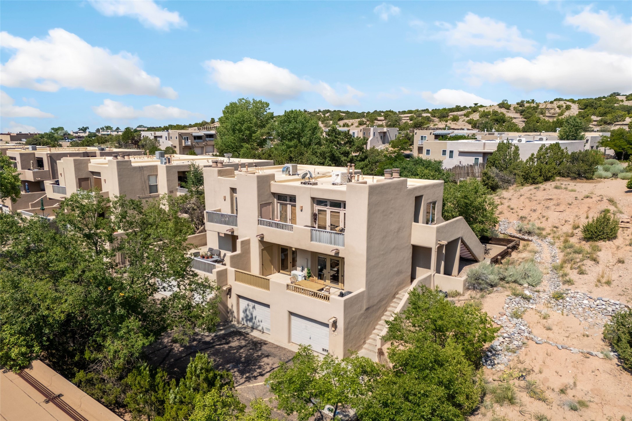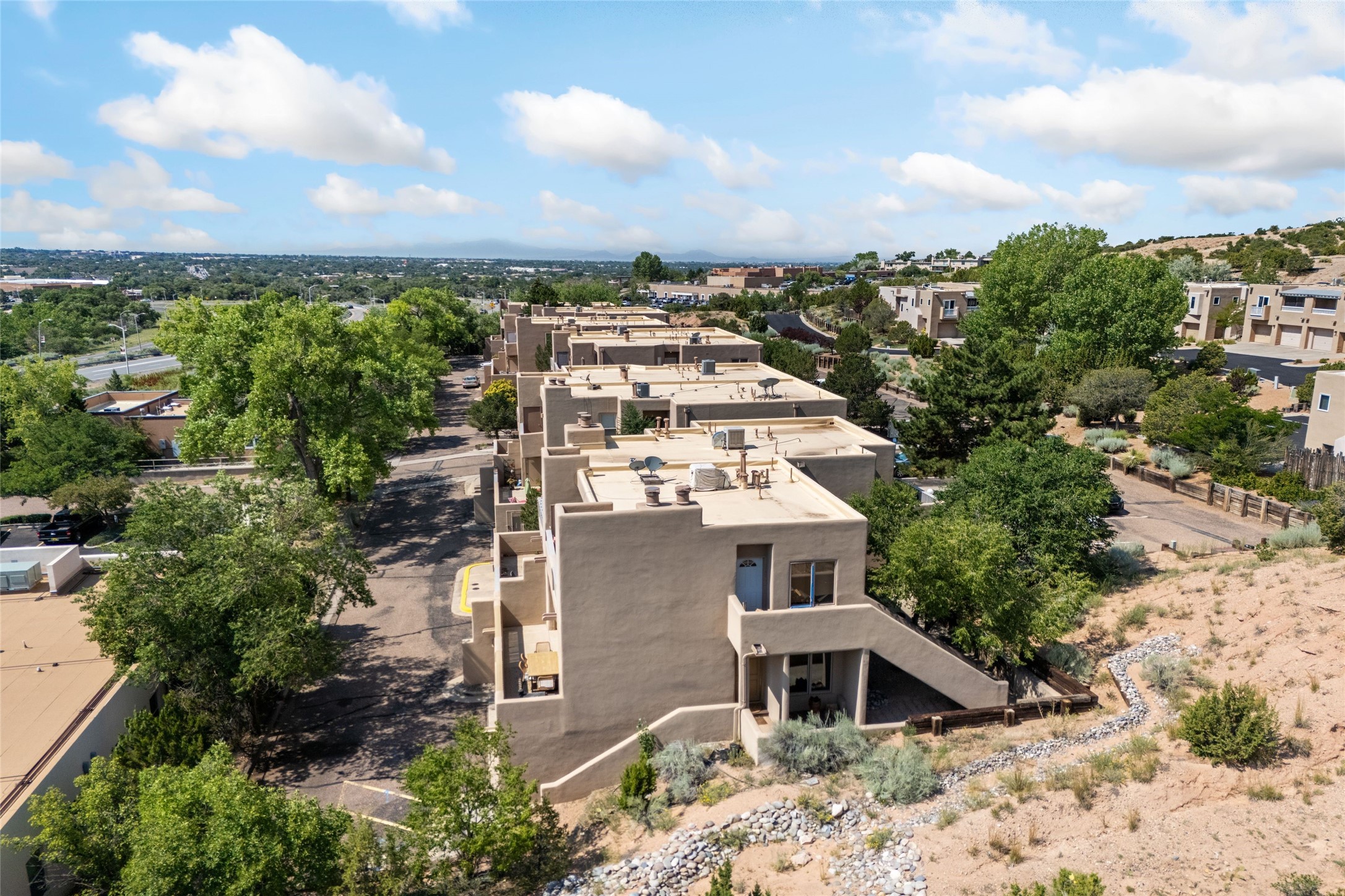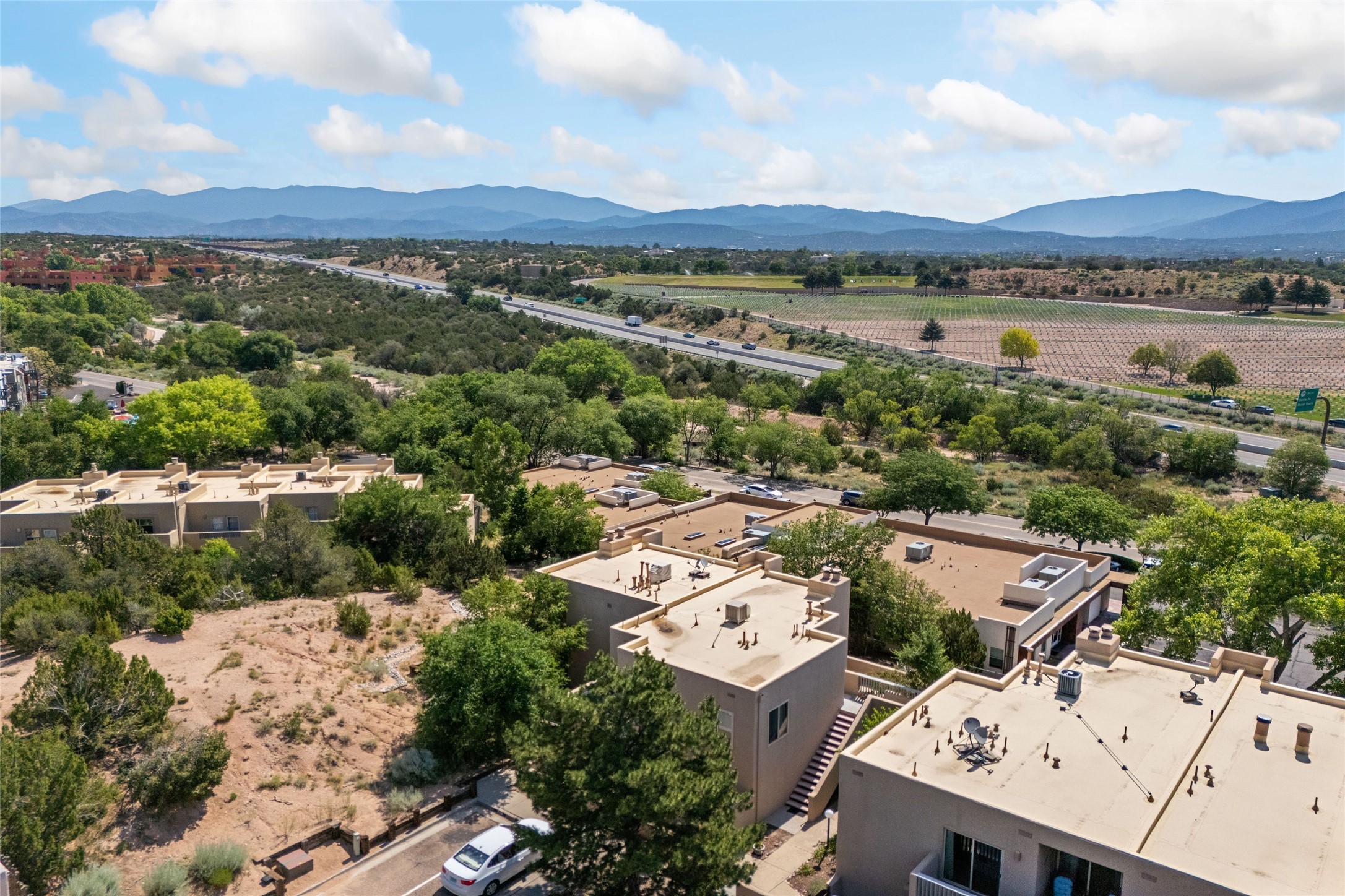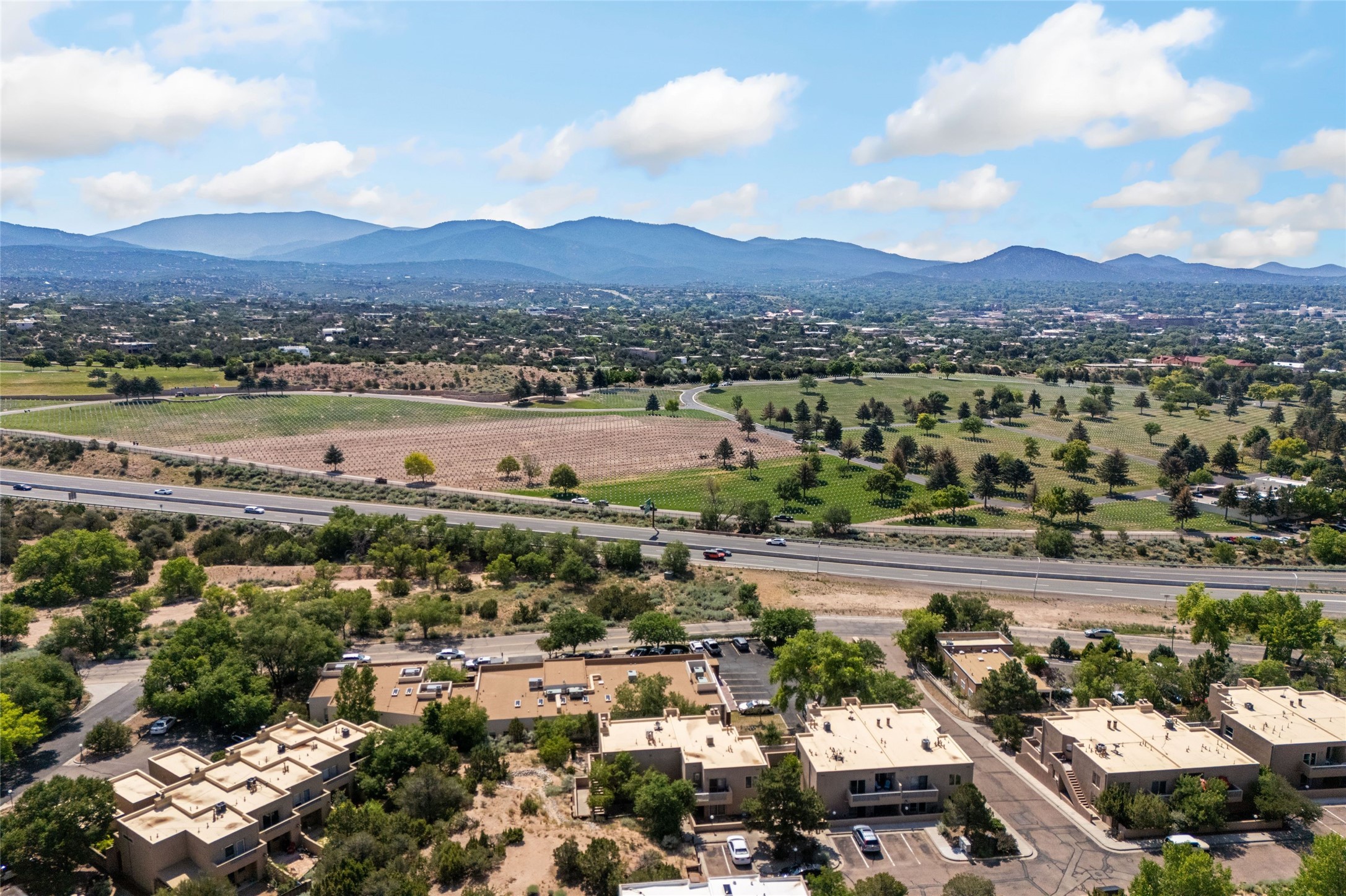 Charming 1-bedroom, 1-bath condo located in the convenient Viento del Norte Condominiums. This end unit offers a unique advantage with no neighbors on the north side, allowing for an abundance of natural light to fill your living space through extra windows. Bright and inviting interior flows seamlessly into a spacious balcony, nearly doubling your entertaining area. Imagine hosting friends and family as you enjoy the beautiful Santa Fe weather! The condo features elegant wood and tile floors, complemented by square-cut beamed ceilings that add a touch of rustic charm. The wood-framed glass doors enhance the open feel and bring the outdoors in. Create a relaxing atmosphere in the evenings by the stylish fireplace with glowing flames by touch of a button. The galley kitchen showcases white cabinets paired with butcher block countertops. A stacked washer/dryer is in the large pantry/storage area. This condo includes both assigned parking and a one-car garage downstairs, offering added value and ease. Just minutes from the Devargas Center and downtown Santa Fe. An ideal condo for a seasonal foothold in Santa Fe, a profitable rental property, or a carefree home in a prime part of Santa Fe.