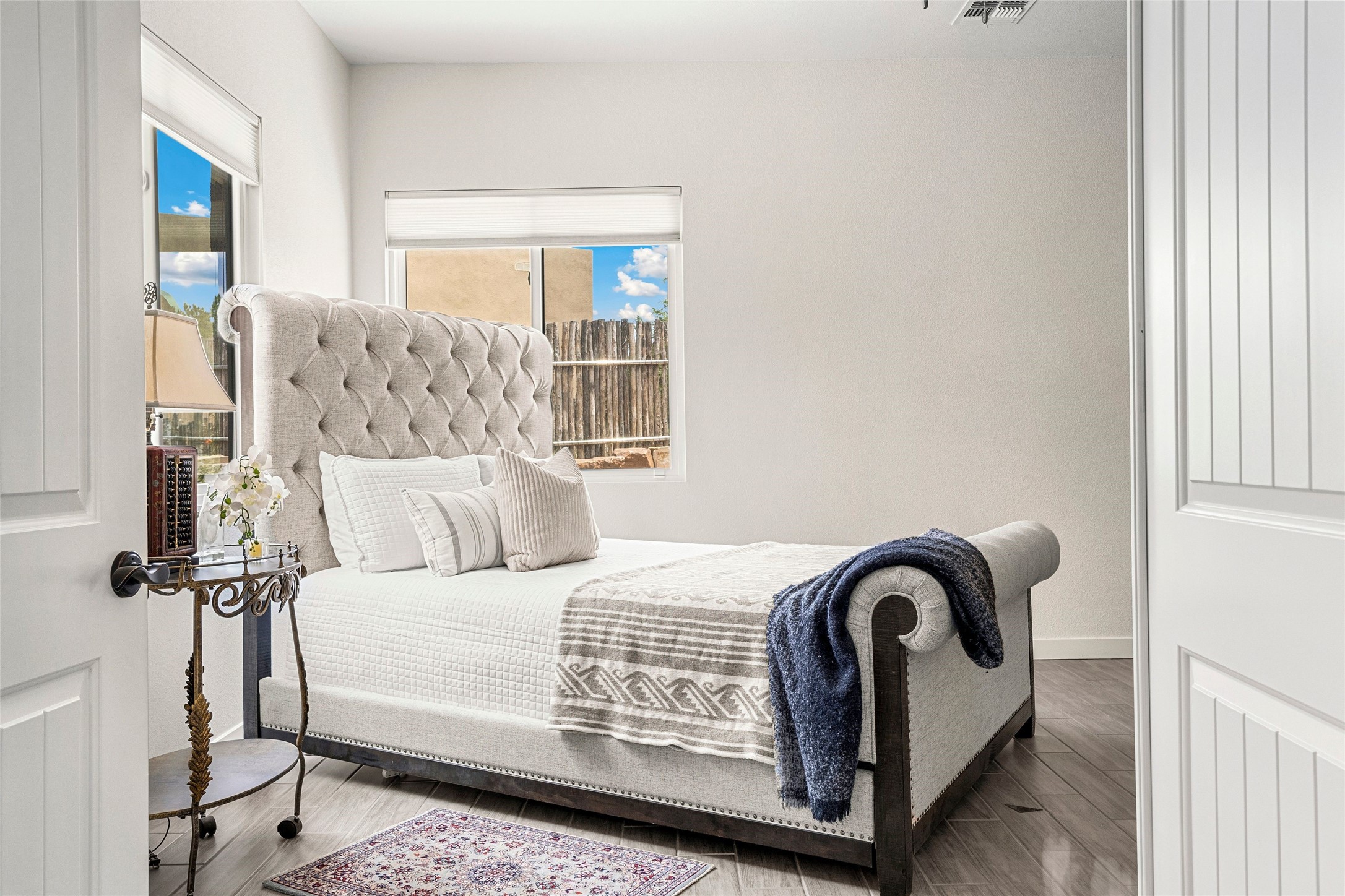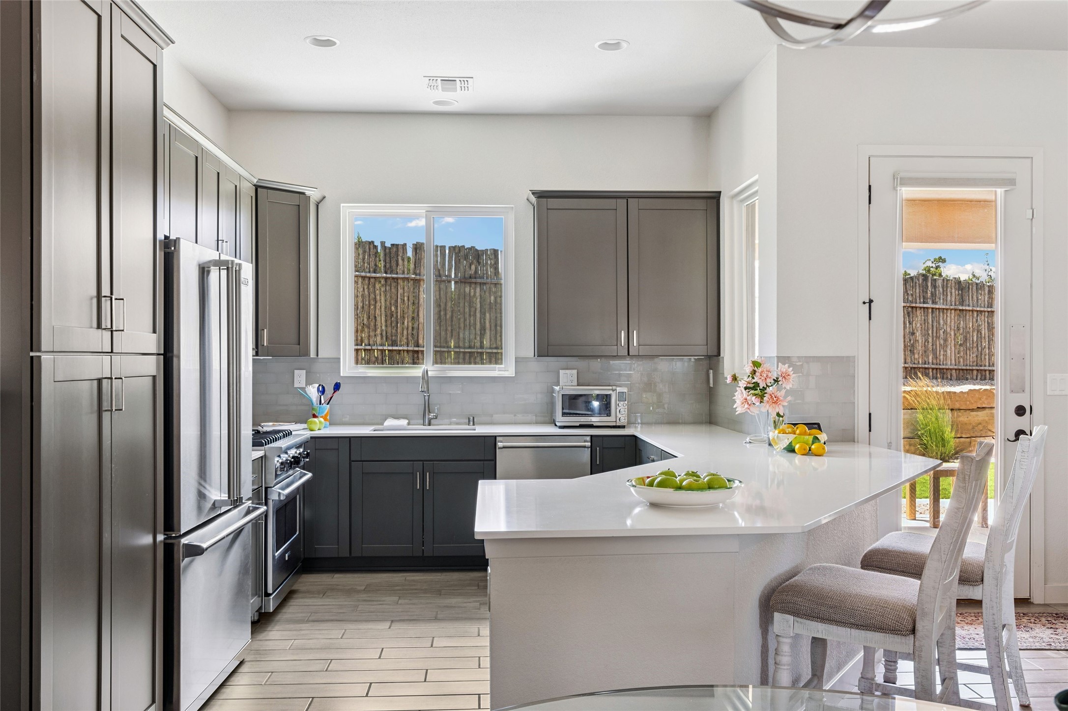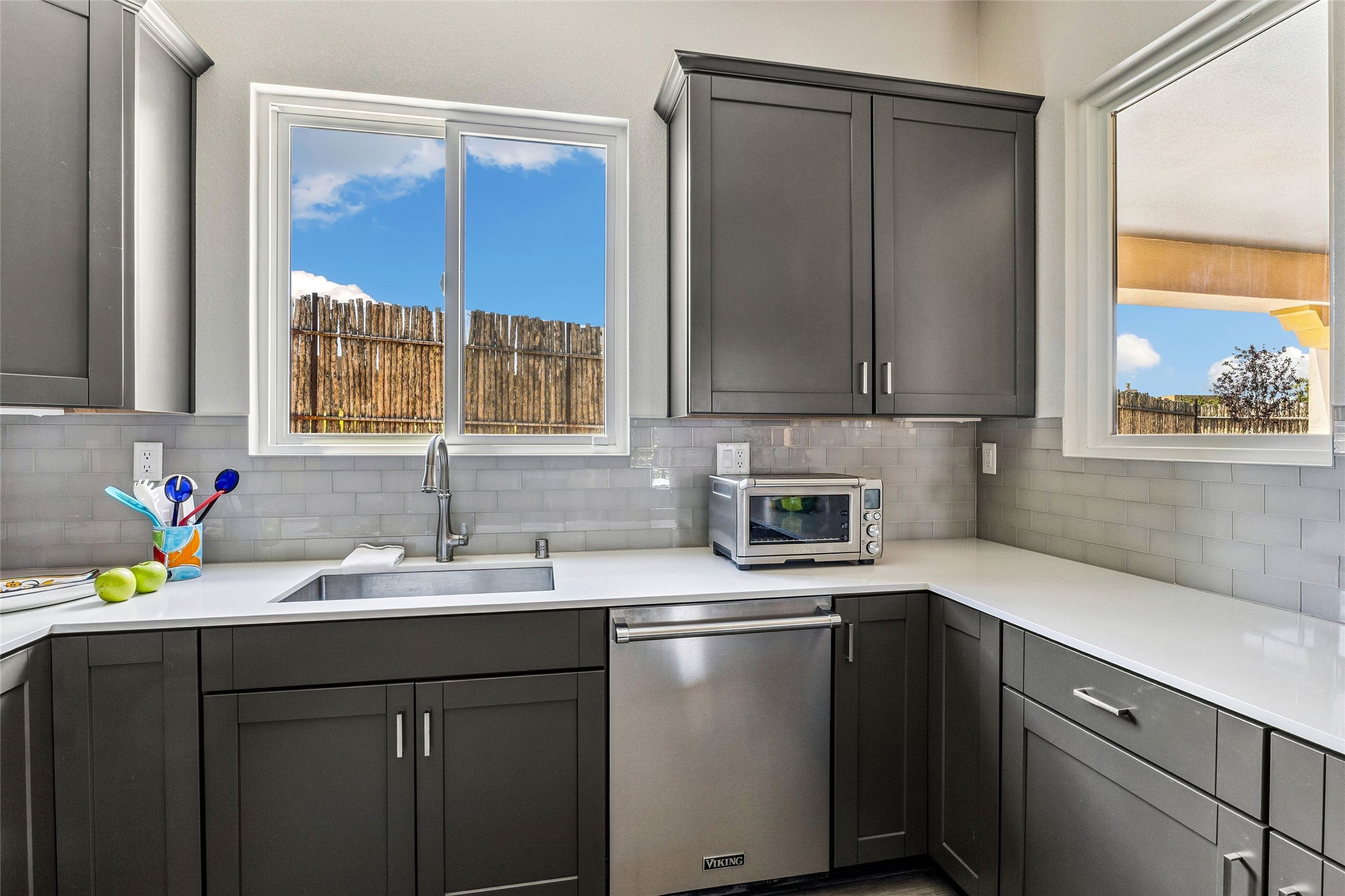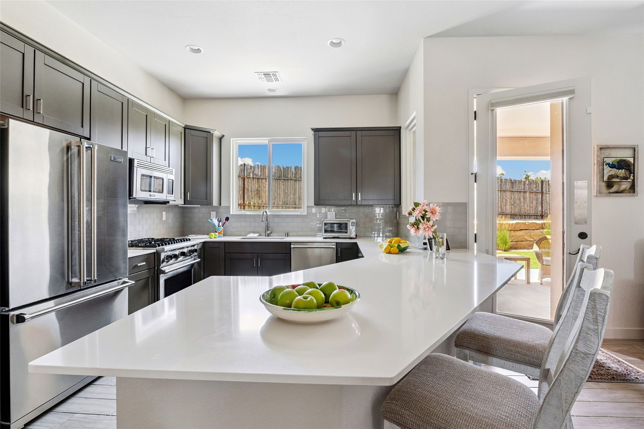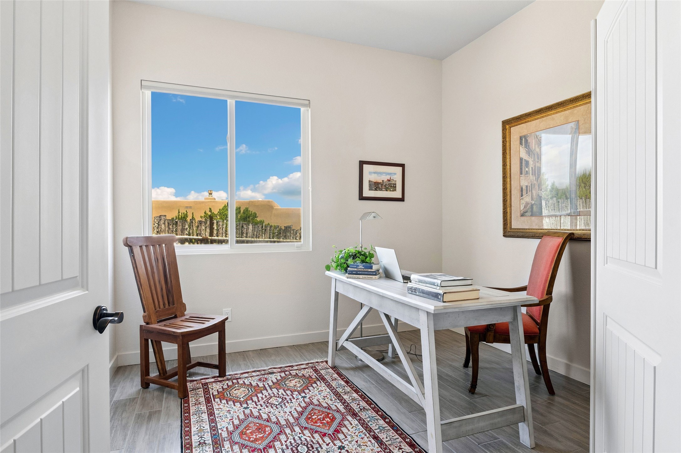 Contemporary Pueblo-Style Home with Casita, Viking Kitchen, and Mountain Views:Welcome to 9 Via Harena, a beautifully sited Contemporary Pueblo-style residence in the highly sought-after community of Tessera. Built in 2020 and originally the model home for the neighborhood, this thoughtfully designed property features a 3-bedroom, 2-bathroom main house and a separate 1-bedroom, 1-bathroom casita--ideal for guests, multi-generational living, or a private studio.Enjoy breathtaking Sangre de Cristo views from both the front portal and the casita, offering the perfect backdrop for morning coffee or evening gatherings. Inside, the open-concept living area is filled with natural light and clean, modern finishes. The kitchen is a standout, outfitted with premium Viking appliances and designed for both daily living and entertaining, with seamless flow to the dining and living areas.The spacious primary suite includes two walk-in closets and a generous en-suite bath. Two guest bedrooms share a nearby bath. The detached casita offers its own entrance, a bright and comfortable living space, and a bath--perfect for hosting guests or creating a private workspace.Since purchasing the home, the current owners have transformed the backyard into a beautifully landscaped, low-maintenance retreat with stone retaining walls and coyote fencing that blend naturally into the high desert surroundings. Additional features include a two-car garage, central HVAC, and easy access to walking trails and open space.Tessera is prized for its sweeping mountain views, access to an extensive trail system, and close proximity to Highway 599, the Santa Fe Plaza, and the Santa Fe County Regional Airport.Whether you're seeking a peaceful retreat or a refined space to entertain, 9 Via Harena offers exceptional comfort, style, and views in one of Santa Fe's most desirable neighborhoods.