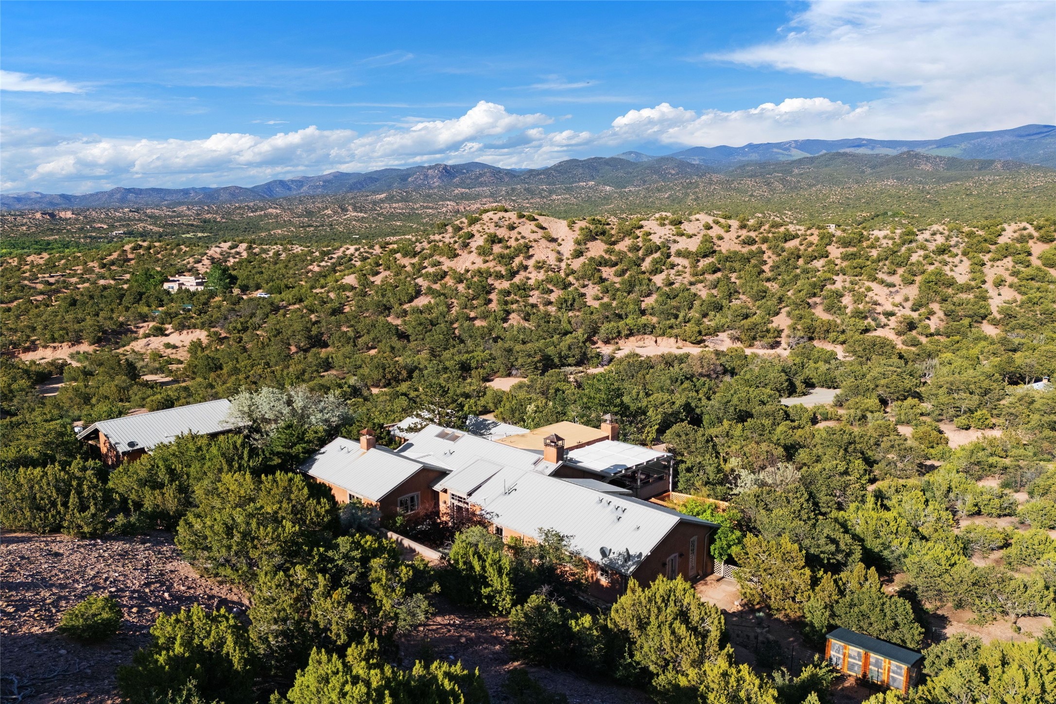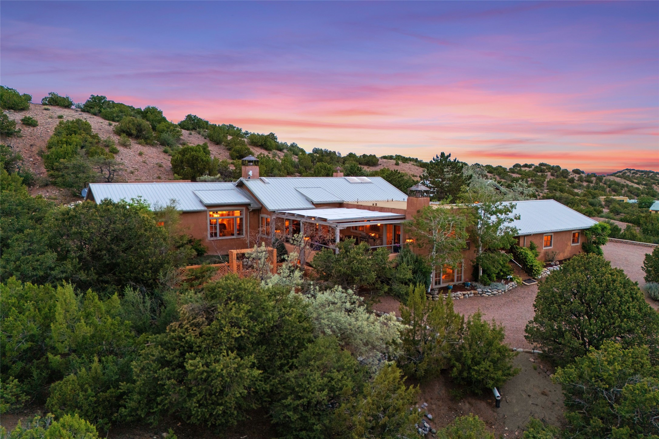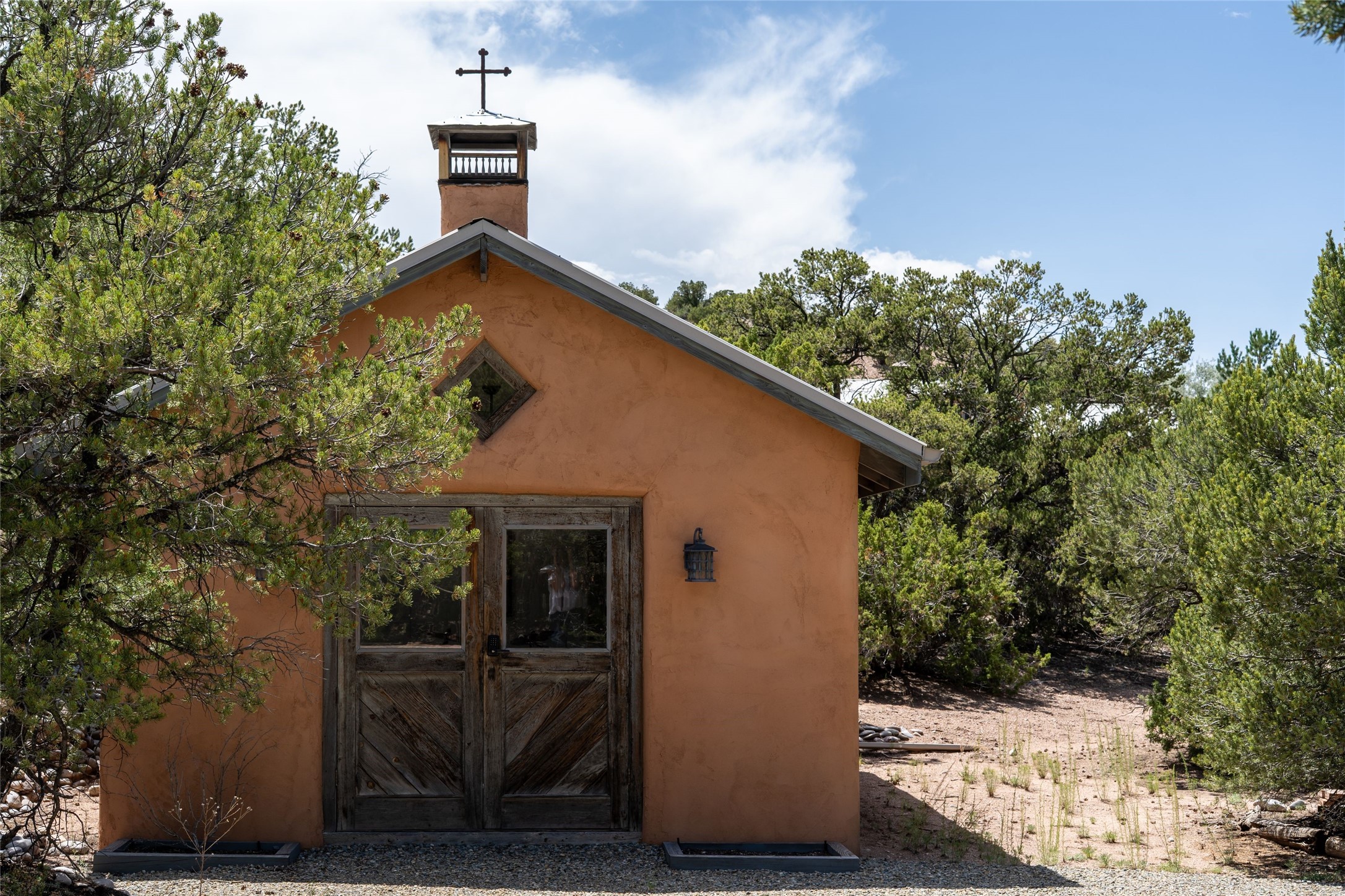 A magnificent European inspired estate sited on a hilltop, with breathtaking views of the Sangre de Cristo Mountains, and spanning 7.7 acres of lush sanctuary. This property features a stunning main house and charming detached casita and chapel that has been transformed into an artist/musician's studio. The main house, adorned with bespoke decor, offers 3 bedrooms, 3 full and 2 half baths, library and an office. Showcasing hand-painted 18th century French ceiling beams, arched stone columns, and a blend of wood and stone floors. Antique doors, stained glass skylights, and custom built-ins enhance the expansive living spaces. The spacious master suite includes a sitting area with majestic mountain views and a hand painted clawfoot soaking tub. The lower level offers comfortable guest or caretaker quarters with two distinct living areas, a full kitchen, an office, as well as private entrance through covered parking for privacy and convenience. The detached casita is complete with a kitchen, bedroom, bath, and a charming front porch with a breathtaking view to Taos. Recent upgrades include modern heating and cooling systems for both the main house and casita, along with new kitchens featuring updated counters and cabinetry. Experience total outdoor serenity from the oversized deck to the rose and vegetable gardens, just 8 minutes from downtown Santa Fe!