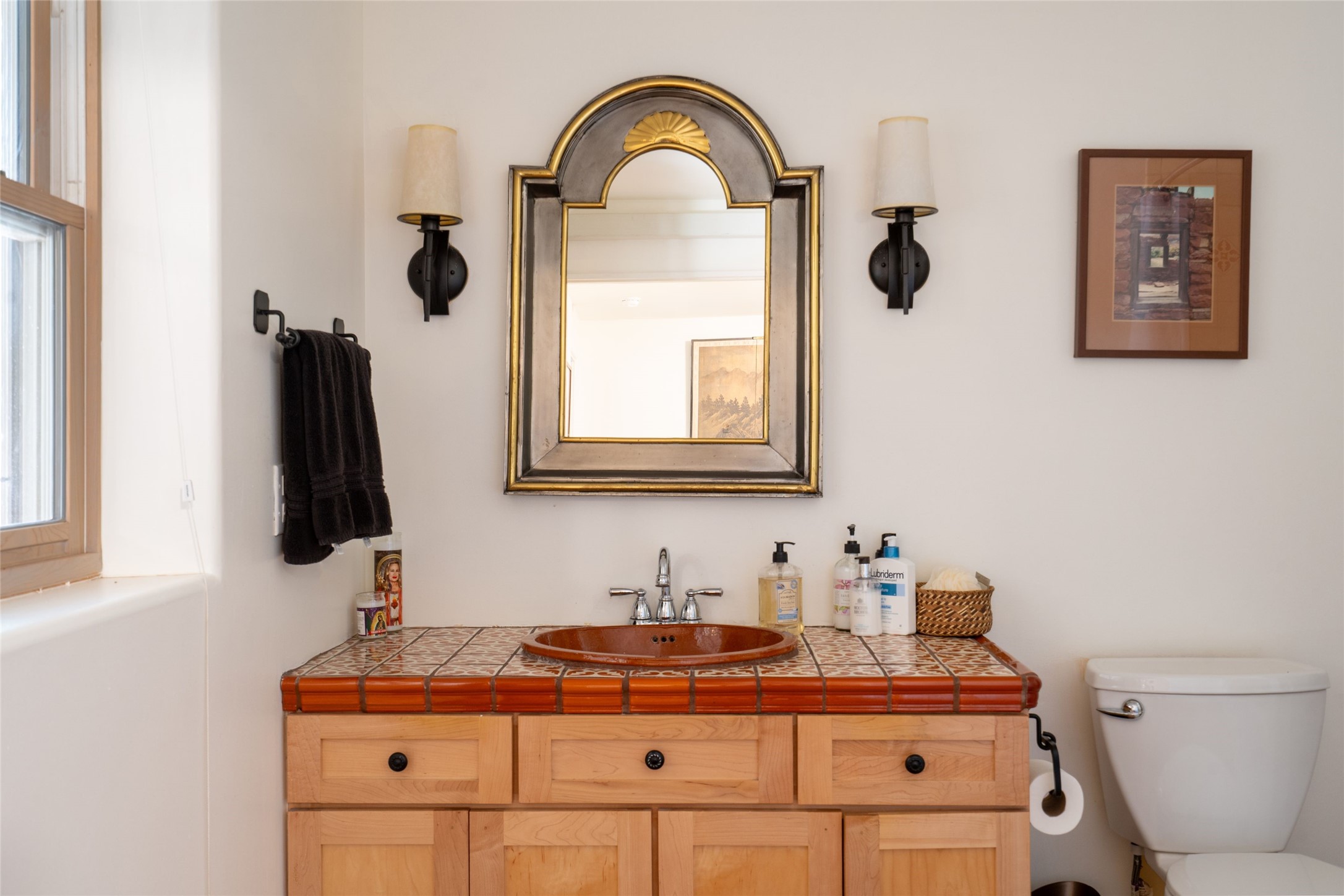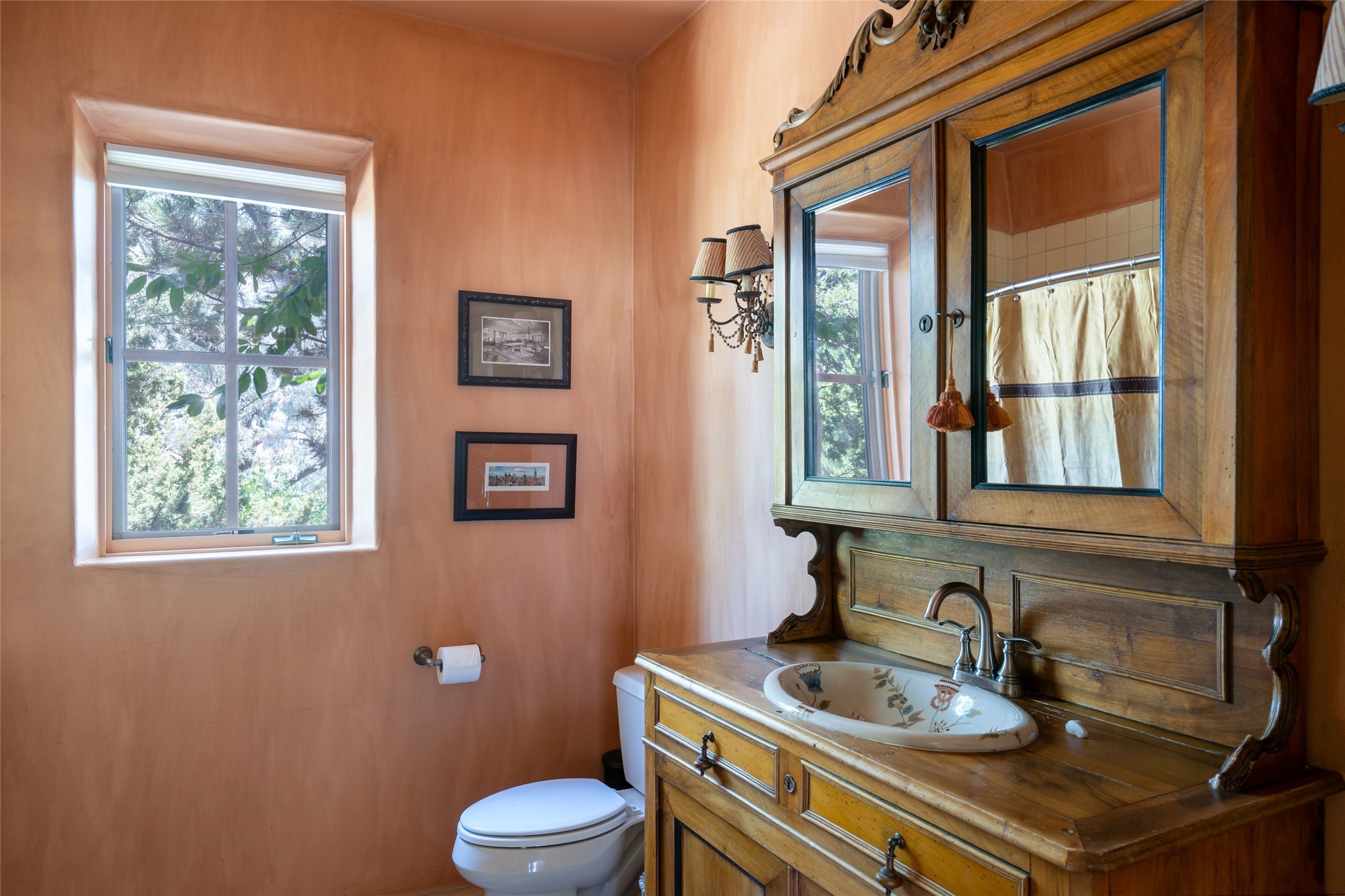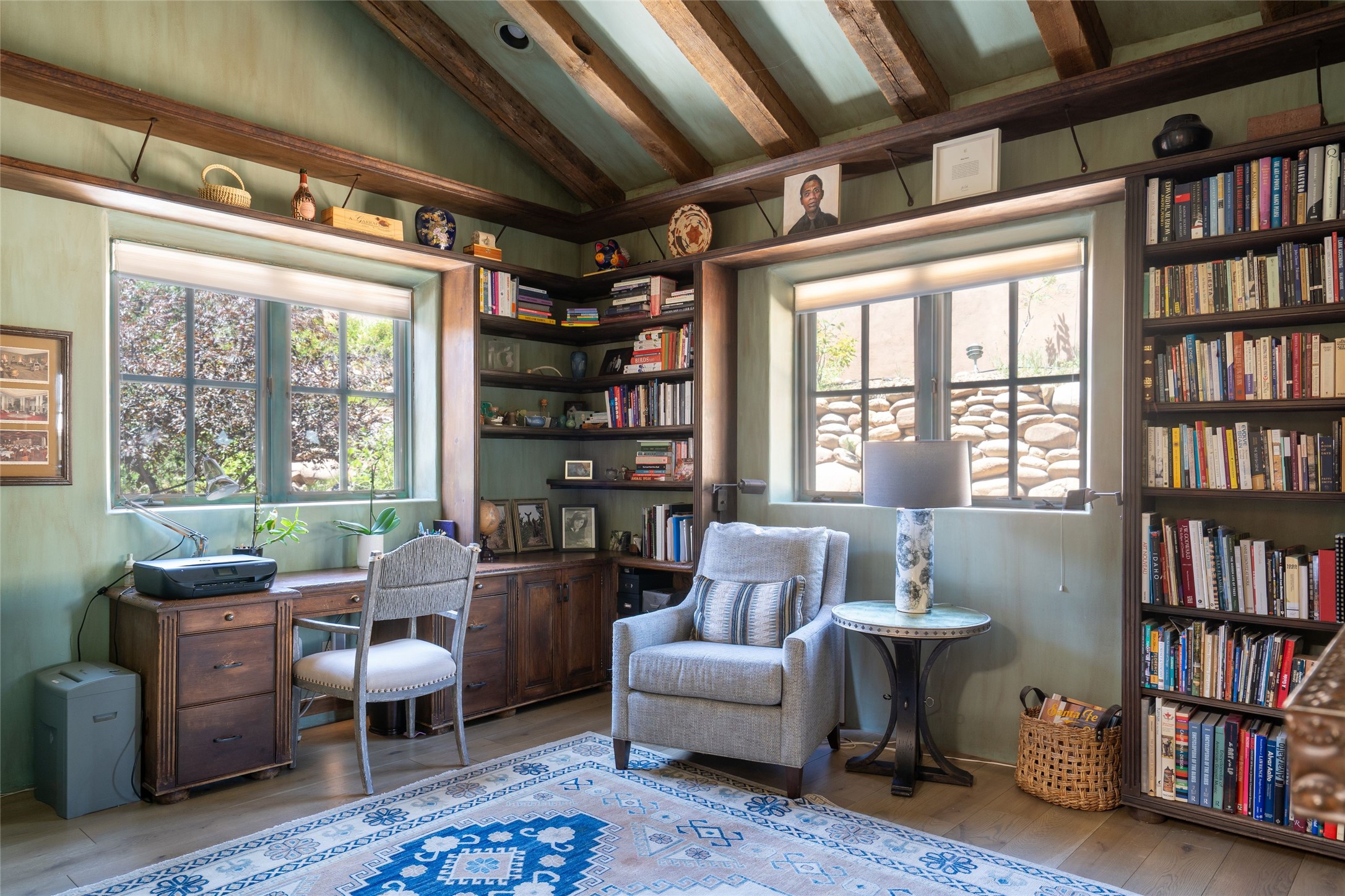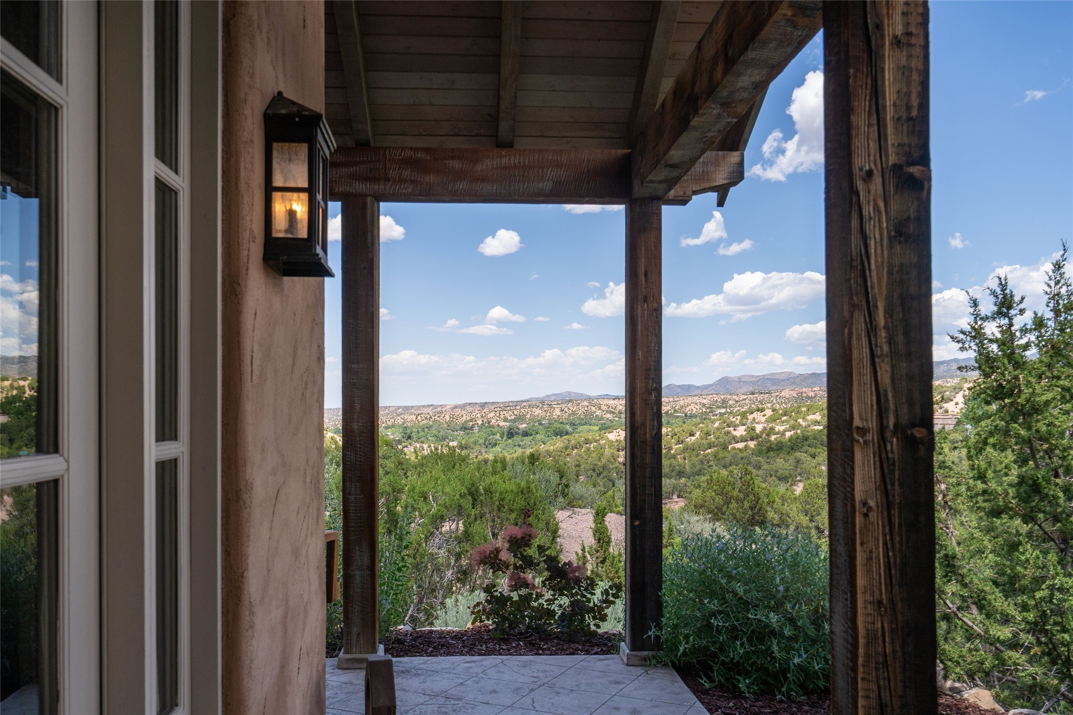A magnificent European inspired estate sited on a hilltop, with breathtaking views of the Sangre de Cristo Mountains, and spanning 7.7 acres of lush sanctuary. This property features a stunning main house and charming detached casita and chapel that has been transformed into an artist/musician's studio. The main house, adorned with bespoke decor, offers 3 bedrooms, 3 full and 2 half baths, library and an office. Showcasing hand-painted 18th century French ceiling beams, arched stone columns, and a blend of wood and stone floors. Antique doors, stained glass skylights, and custom built-ins enhance the expansive living spaces. The spacious master suite includes a sitting area with majestic mountain views and a hand painted clawfoot soaking tub. The lower level offers comfortable guest or caretaker quarters with two distinct living areas, a full kitchen, an office, as well as private entrance through covered parking for privacy and convenience. The detached casita is complete with a kitchen, bedroom, bath, and a charming front porch with a breathtaking view to Taos. Recent upgrades include modern heating and cooling systems for both the main house and casita, along with new kitchens featuring updated counters and cabinetry. Experience total outdoor serenity from the oversized deck to the rose and vegetable gardens, just 8 minutes from downtown Santa Fe!