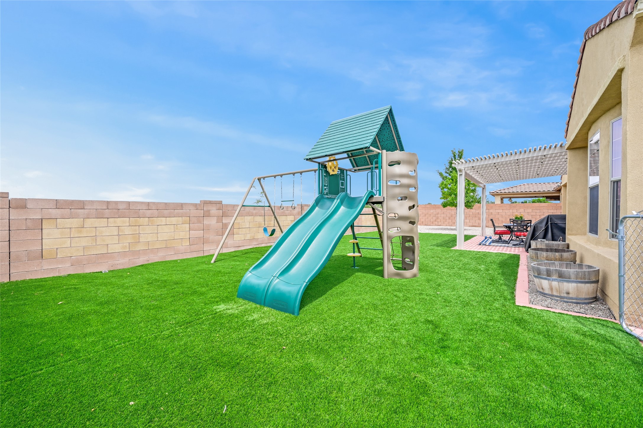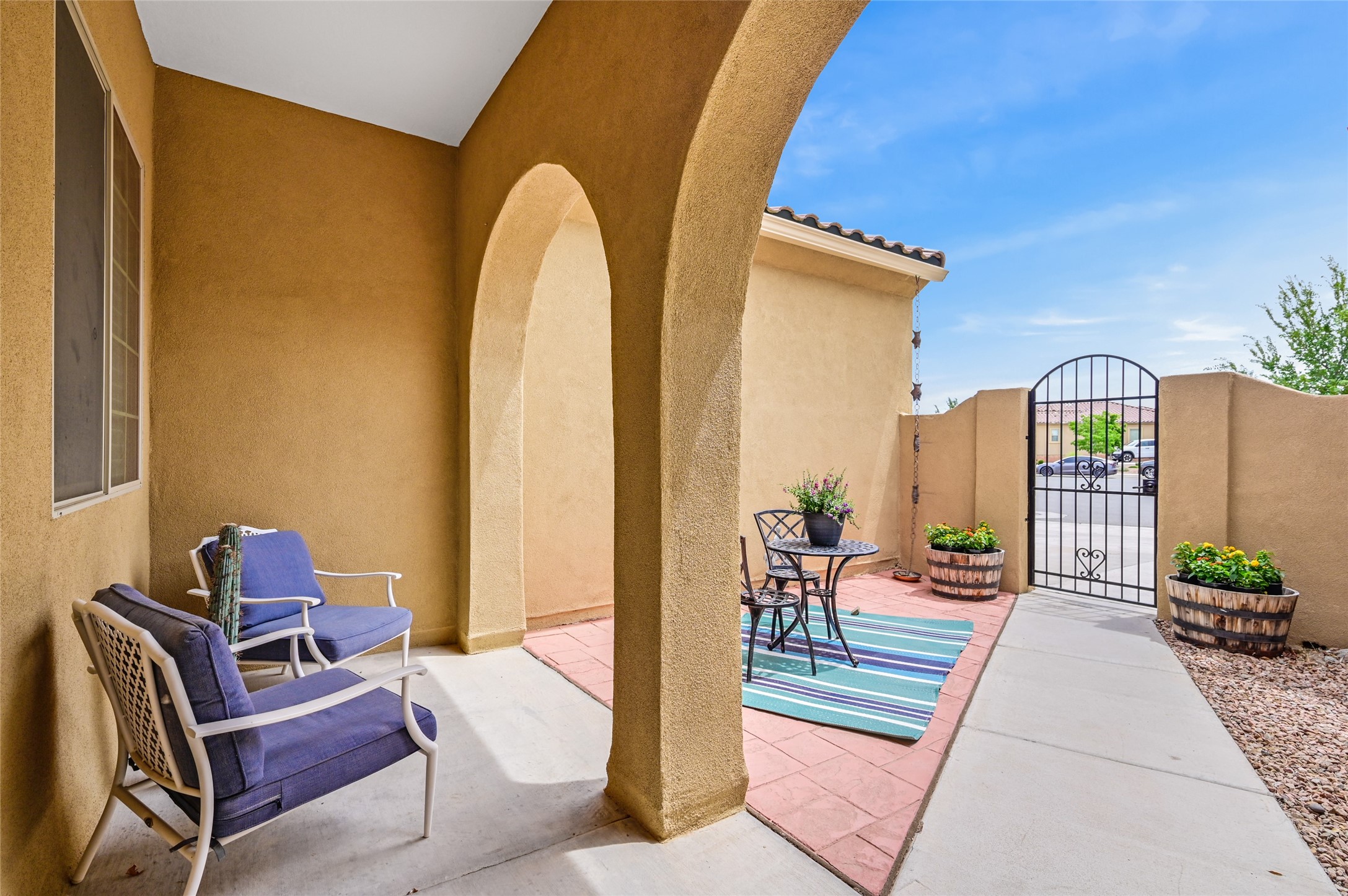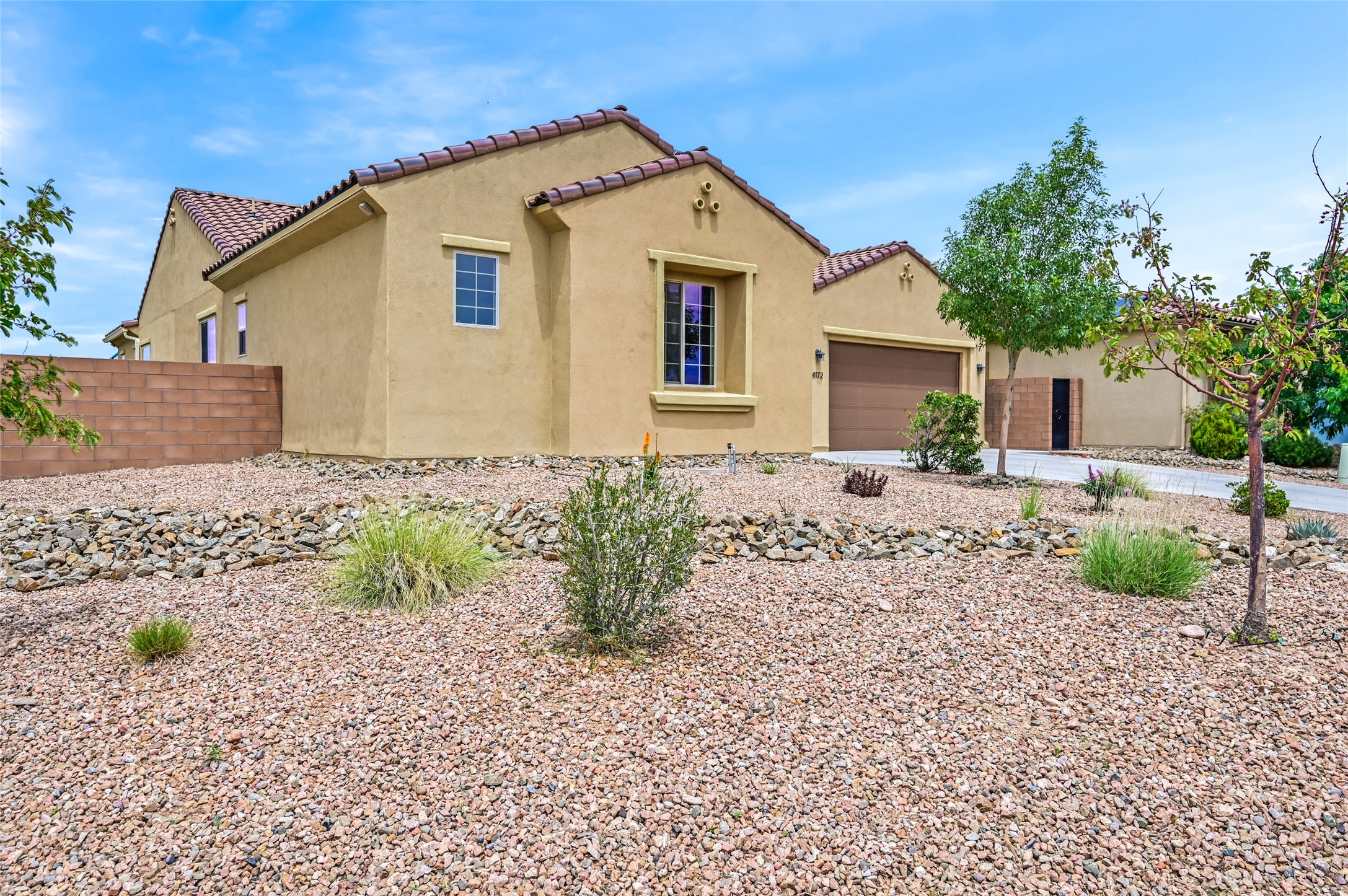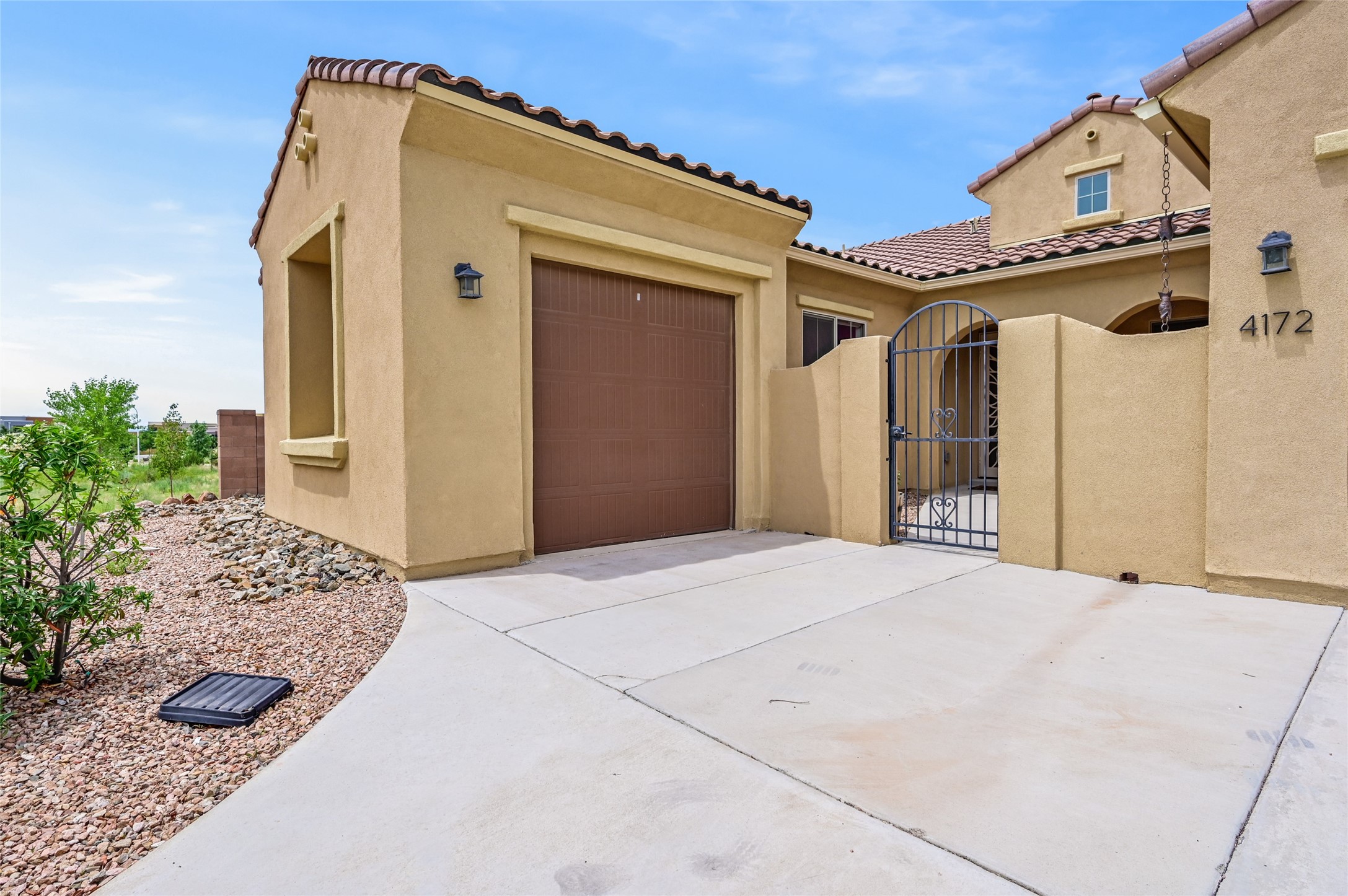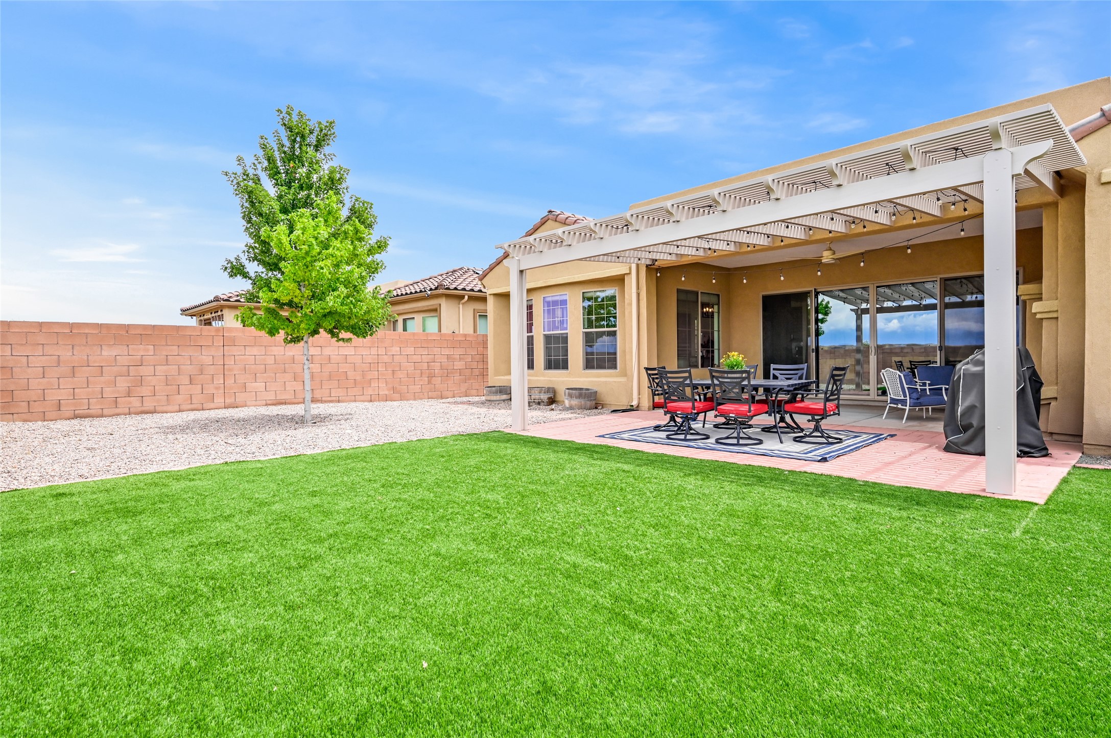 Located on a quiet cul-de-sac in Las Soleras, this 4-bedroom (or 3 bedroom + office), 2.5-bath home offers the perfect balance of comfort and convenience. Just over five years old, it sits next to a trail and the neighborhood park is across the street from the backyard wall. With only one neighbor, there's added privacy. You're minutes from I-25, shopping, restaurants, and Presbyterian Hospital. Inside, the home features high ceilings throughout, with an open-concept living room that includes a wood accent ceiling and large windows that fill the space with natural light. The kitchen is designed for gatherings, with a quartz countertop island, herringbone-patterned backsplash, and plenty of room to cook and connect. French doors lead to a private office, perfect for working from home. The spacious primary suite includes a walk-in closet and a spa-like bath with separate tub and shower. A 3-car garage includes an EV charger, storage room and sink. Out back, enjoy sunset views from a landscaped yard featuring turf, gravel, a pergola, and an outdoor fireplace--an ideal space for relaxing or entertaining. The home also includes a private courtyard entry, and fresh carpet and paint as of July 2025. This home checks all the boxes: great layout, natural light, indoor/outdoor flow, and a prime location near everyday essentials. Seller including 1 year home warranty.