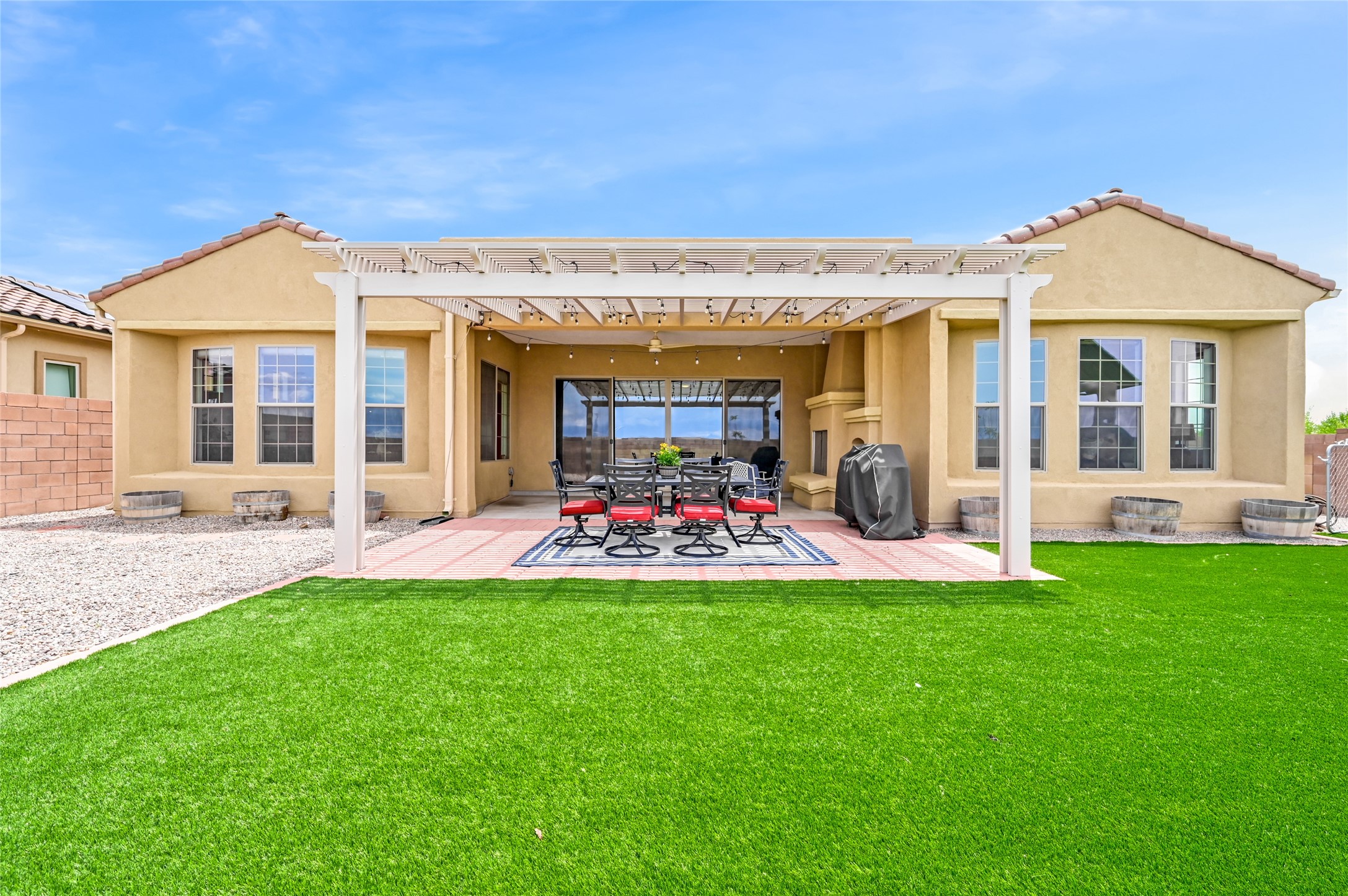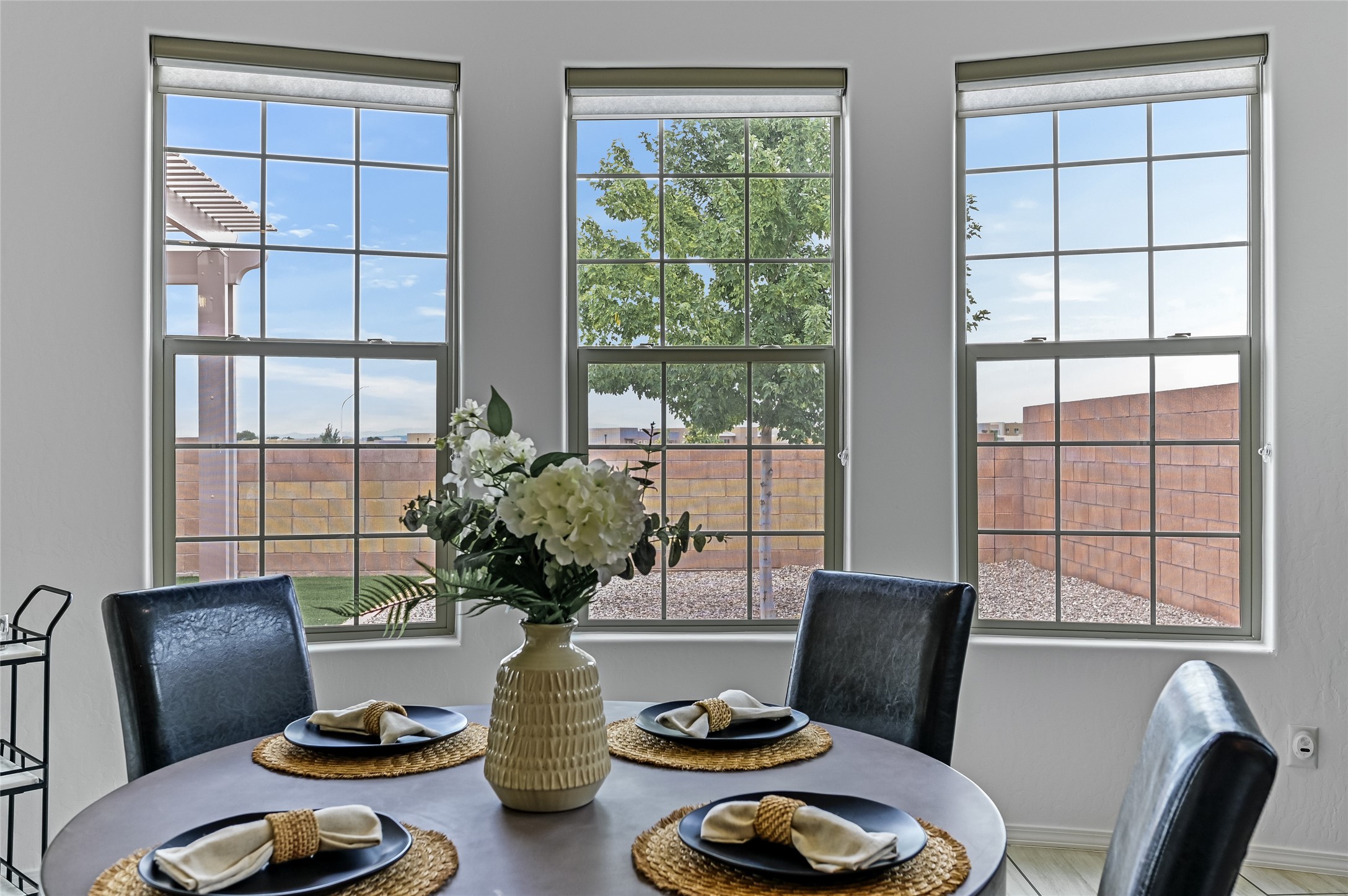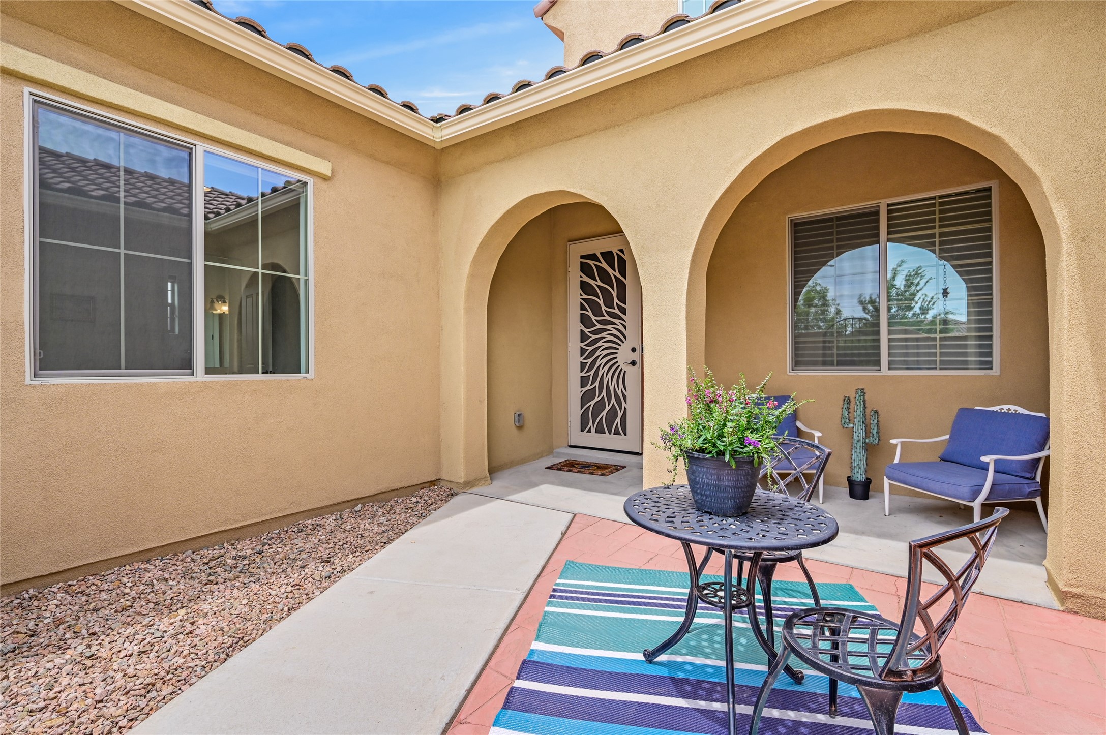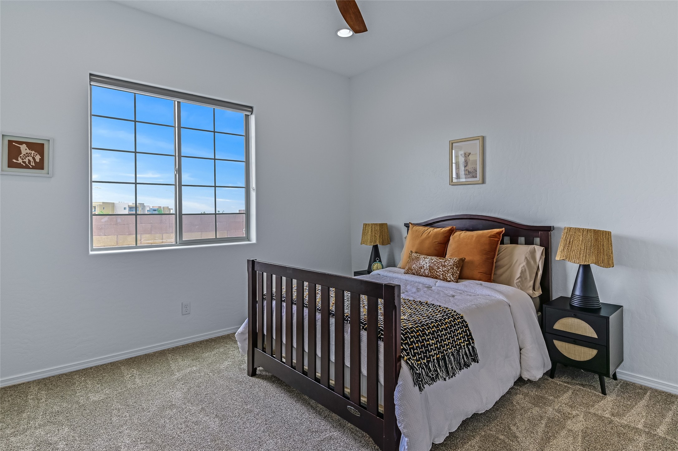 Located on a quiet cul-de-sac in Las Soleras, this 4-bedroom (or 3 bedroom + office), 2.5-bath home offers the perfect balance of comfort and convenience. Just over five years old, it sits next to a trail and the neighborhood park is across the street from the backyard wall. With only one neighbor, there's added privacy. You're minutes from I-25, shopping, restaurants, and Presbyterian Hospital. Inside, the home features high ceilings throughout, with an open-concept living room that includes a wood accent ceiling and large windows that fill the space with natural light. The kitchen is designed for gatherings, with a quartz countertop island, herringbone-patterned backsplash, and plenty of room to cook and connect. French doors lead to a private office, perfect for working from home. The spacious primary suite includes a walk-in closet and a spa-like bath with separate tub and shower. A 3-car garage includes an EV charger, storage room and sink. Out back, enjoy sunset views from a landscaped yard featuring turf, gravel, a pergola, and an outdoor fireplace--an ideal space for relaxing or entertaining. The home also includes a private courtyard entry, and fresh carpet and paint as of July 2025. This home checks all the boxes: great layout, natural light, indoor/outdoor flow, and a prime location near everyday essentials. Seller including 1 year home warranty.