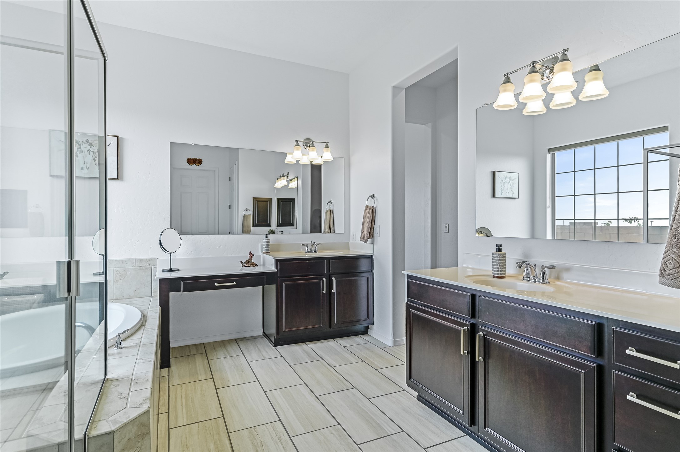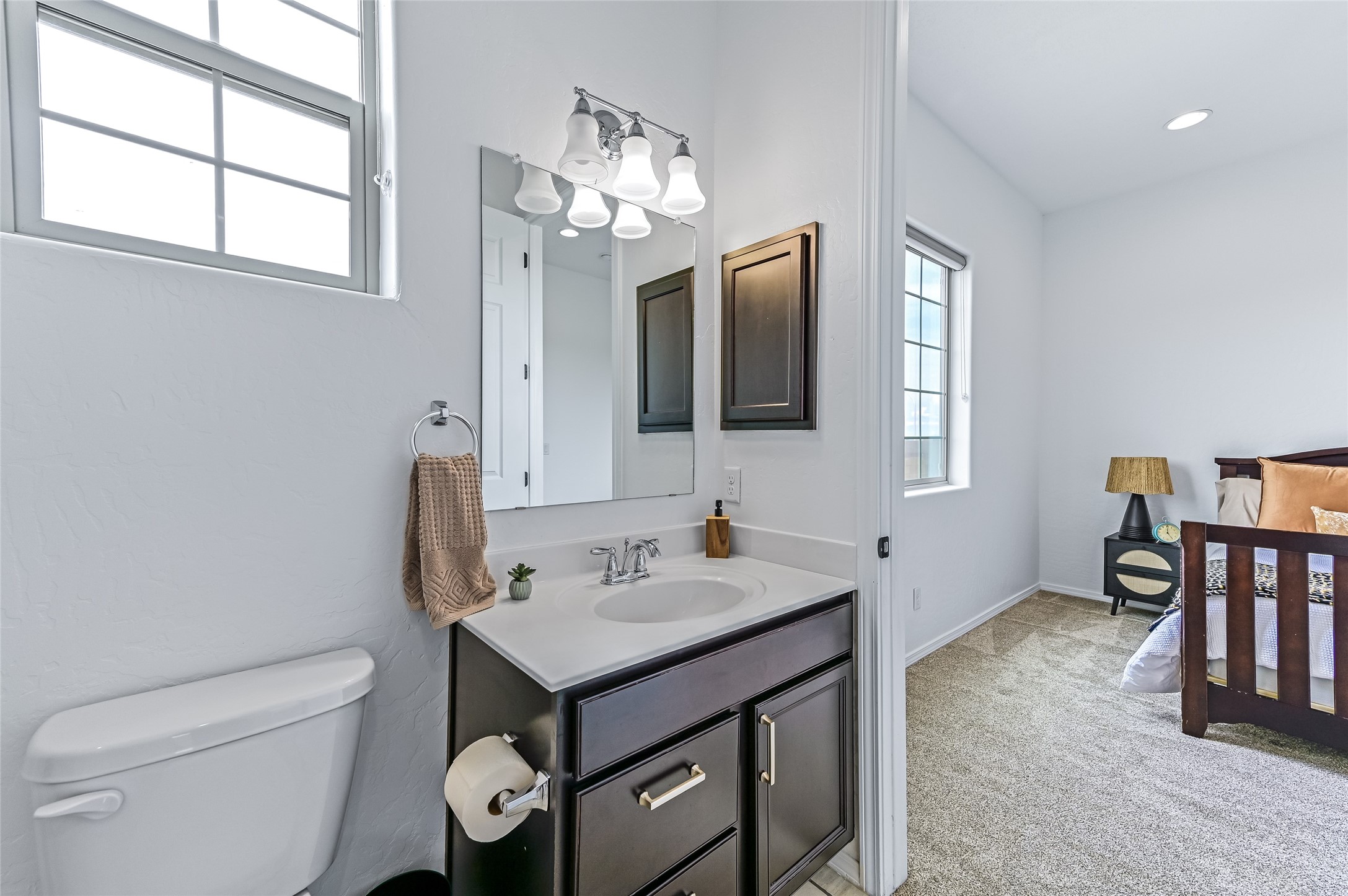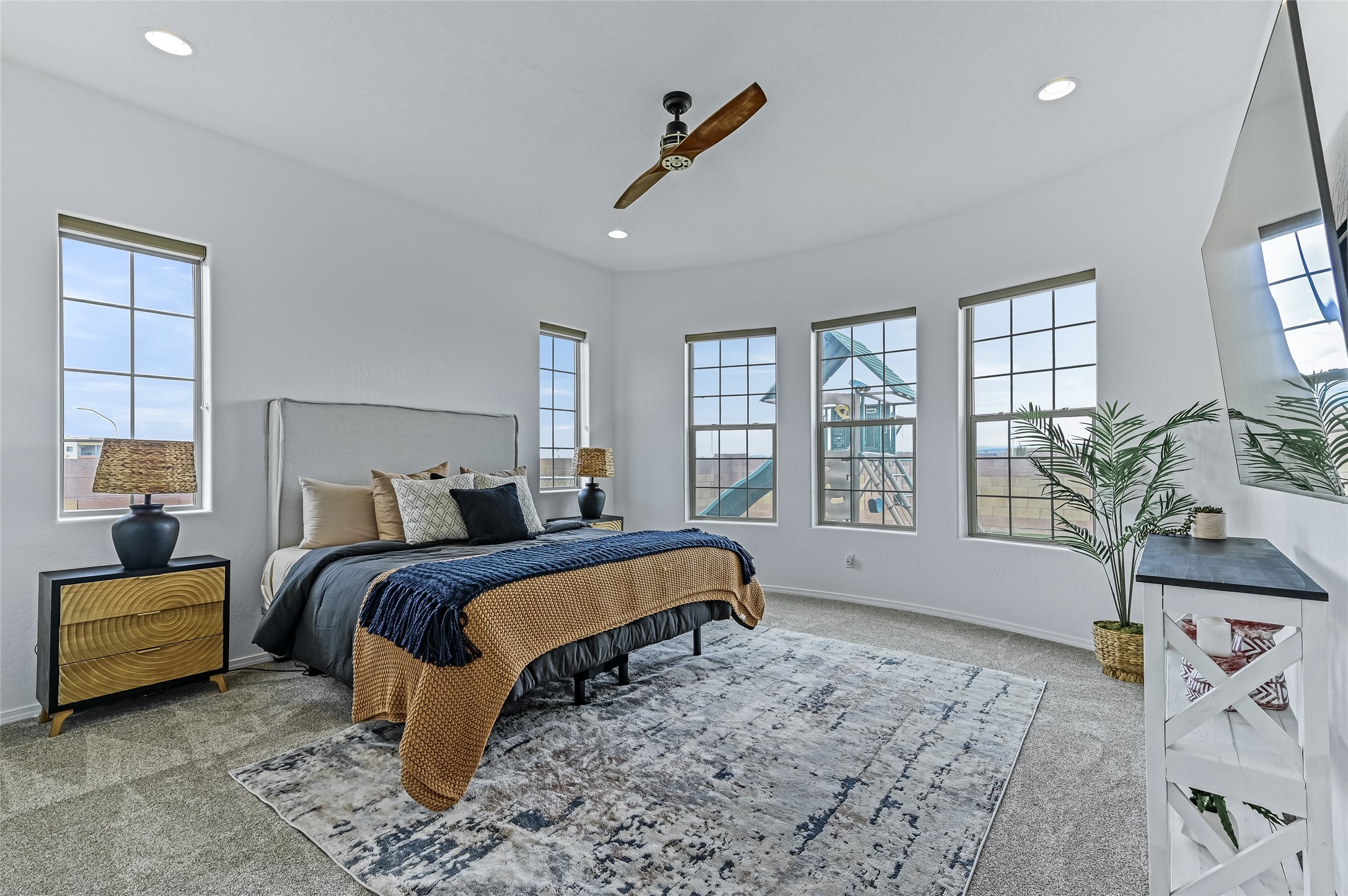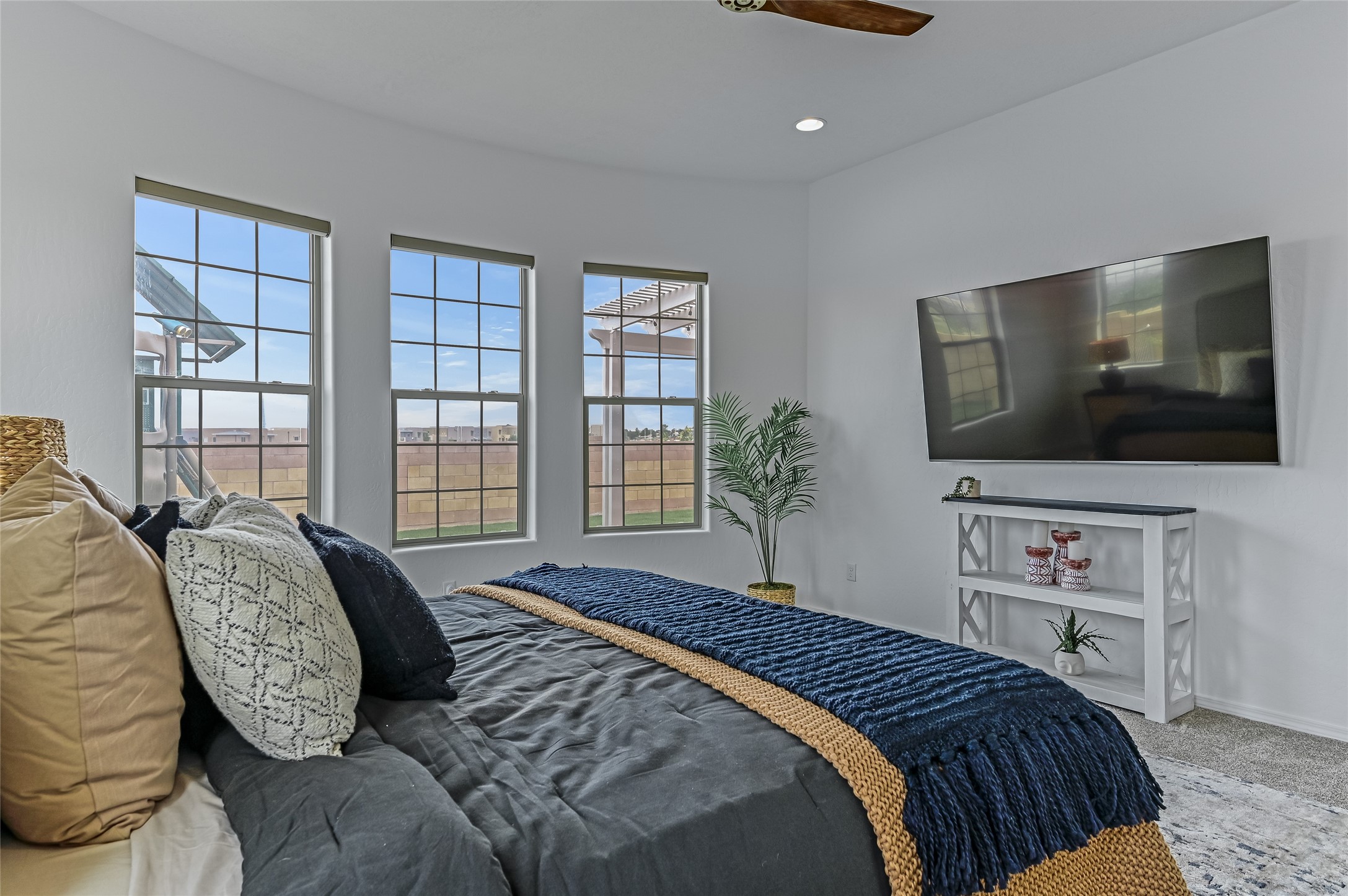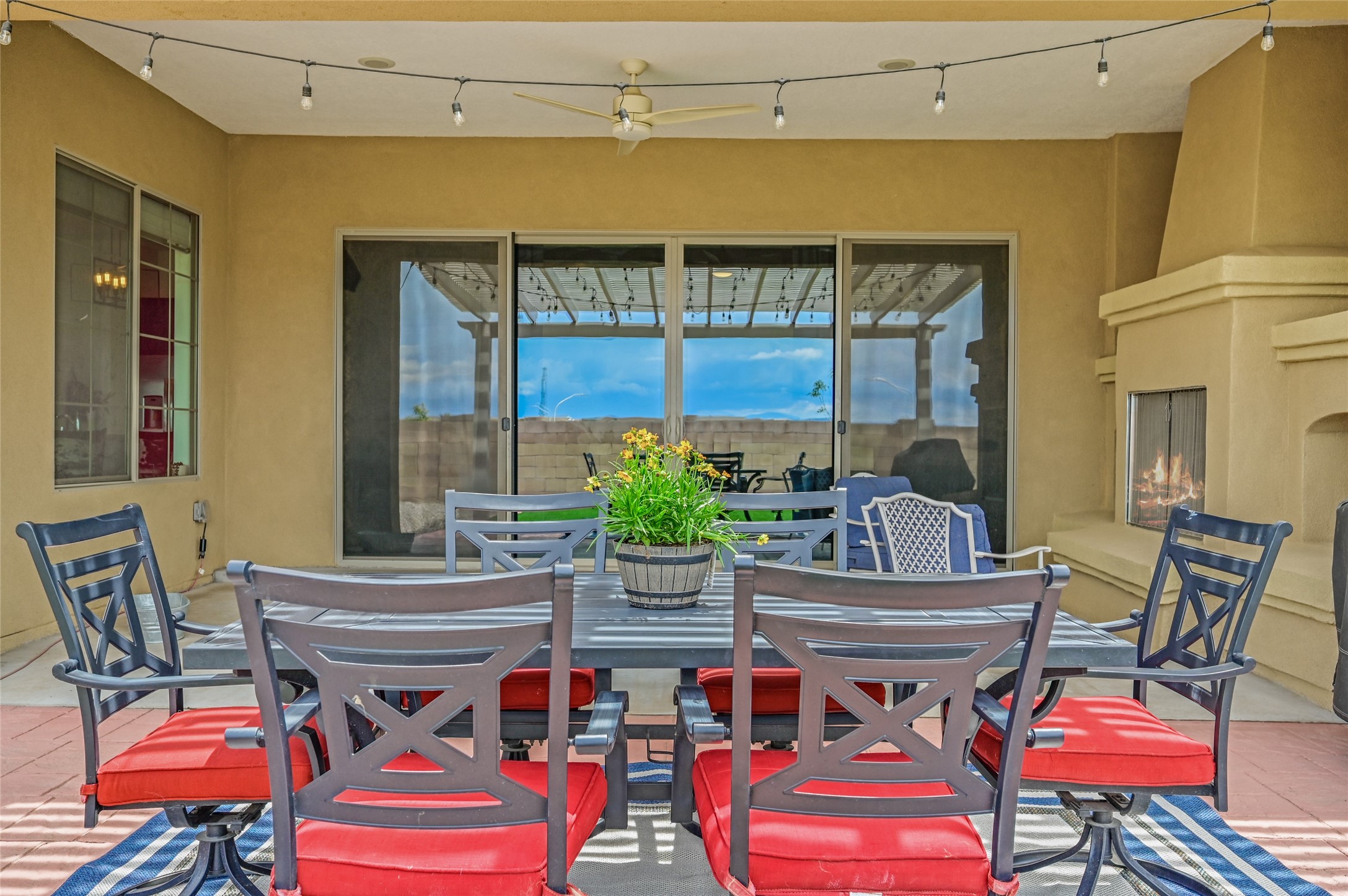 Located on a quiet cul-de-sac in Las Soleras, this 4-bedroom (or 3 bedroom + office), 2.5-bath home offers the perfect balance of comfort and convenience. Just over five years old, it sits next to a trail and the neighborhood park is across the street from the backyard wall. With only one neighbor, there's added privacy. You're minutes from I-25, shopping, restaurants, and Presbyterian Hospital. Inside, the home features high ceilings throughout, with an open-concept living room that includes a wood accent ceiling and large windows that fill the space with natural light. The kitchen is designed for gatherings, with a quartz countertop island, herringbone-patterned backsplash, and plenty of room to cook and connect. French doors lead to a private office, perfect for working from home. The spacious primary suite includes a walk-in closet and a spa-like bath with separate tub and shower. A 3-car garage includes an EV charger, storage room and sink. Out back, enjoy sunset views from a landscaped yard featuring turf, gravel, a pergola, and an outdoor fireplace--an ideal space for relaxing or entertaining. The home also includes a private courtyard entry, and fresh carpet and paint as of July 2025. This home checks all the boxes: great layout, natural light, indoor/outdoor flow, and a prime location near everyday essentials. Seller including 1 year home warranty.