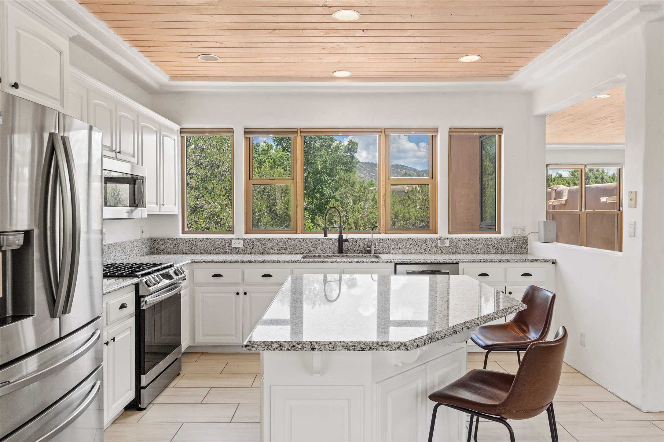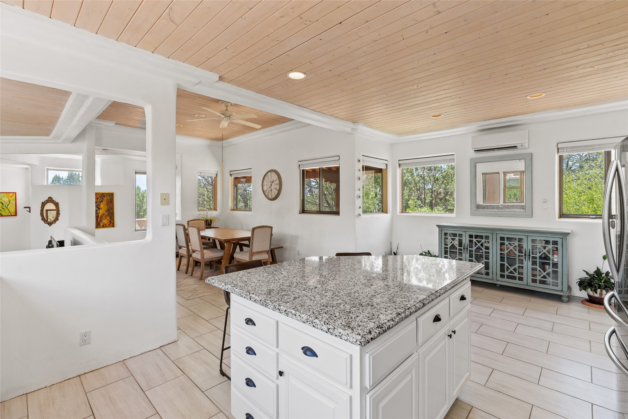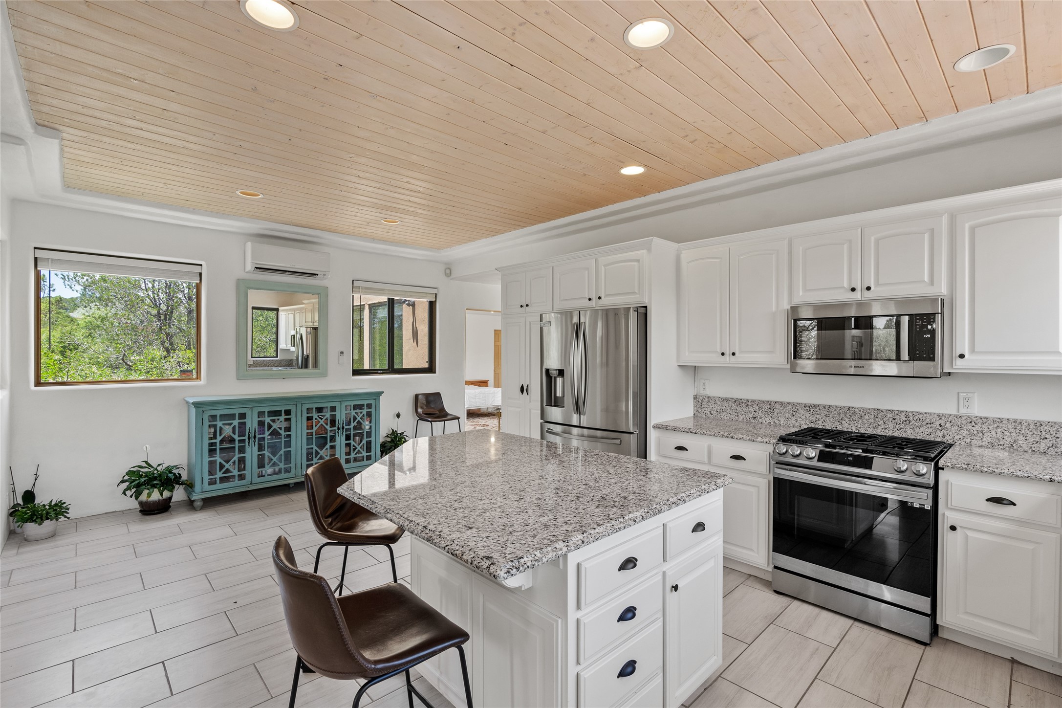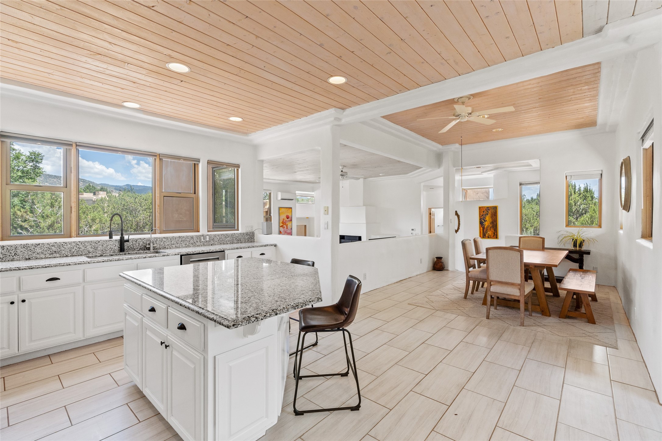 Located on over an acre with unbeatable access to all that Santa Fe has to offer, this beautifully updated home offers views of Sun andMoon Mountains and an open, flexible layout ideal for modern living. Tongue-and-groove ceilings with recessed lighting run throughout themain living areas, complementing the abundant natural light that pours in through large windows. The updated kitchen features new granitecountertops, newer Bosch and Samsung appliances, plus a RO filtration in the kitchen. The kitchen flows seamlessly into the open-conceptliving and dining spaces. Two cozy fireplaces create warmth and ambiance, while radiant heating and mini splits provide efficient heatingand cooling year-round. With three spacious bedrooms--including two that function well as primary suites. A standout feature is theattached studio with its own entrance, carport, skylights, and plentiful windows--perfect for an art space, home office, or guest retreat.Outside, the expansive lot offers endless possibilities for gardening, recreation, or expansion. Just a 5-minute walk from Christus St.Vincent Regional Medical Center and only 10 minutes to the historic Santa Fe Plaza, this home combines peaceful privacy with centralconvenience. Don't miss this rare opportunity to own a flexible, light-filled property in one of Santa Fe's most desirable locations.