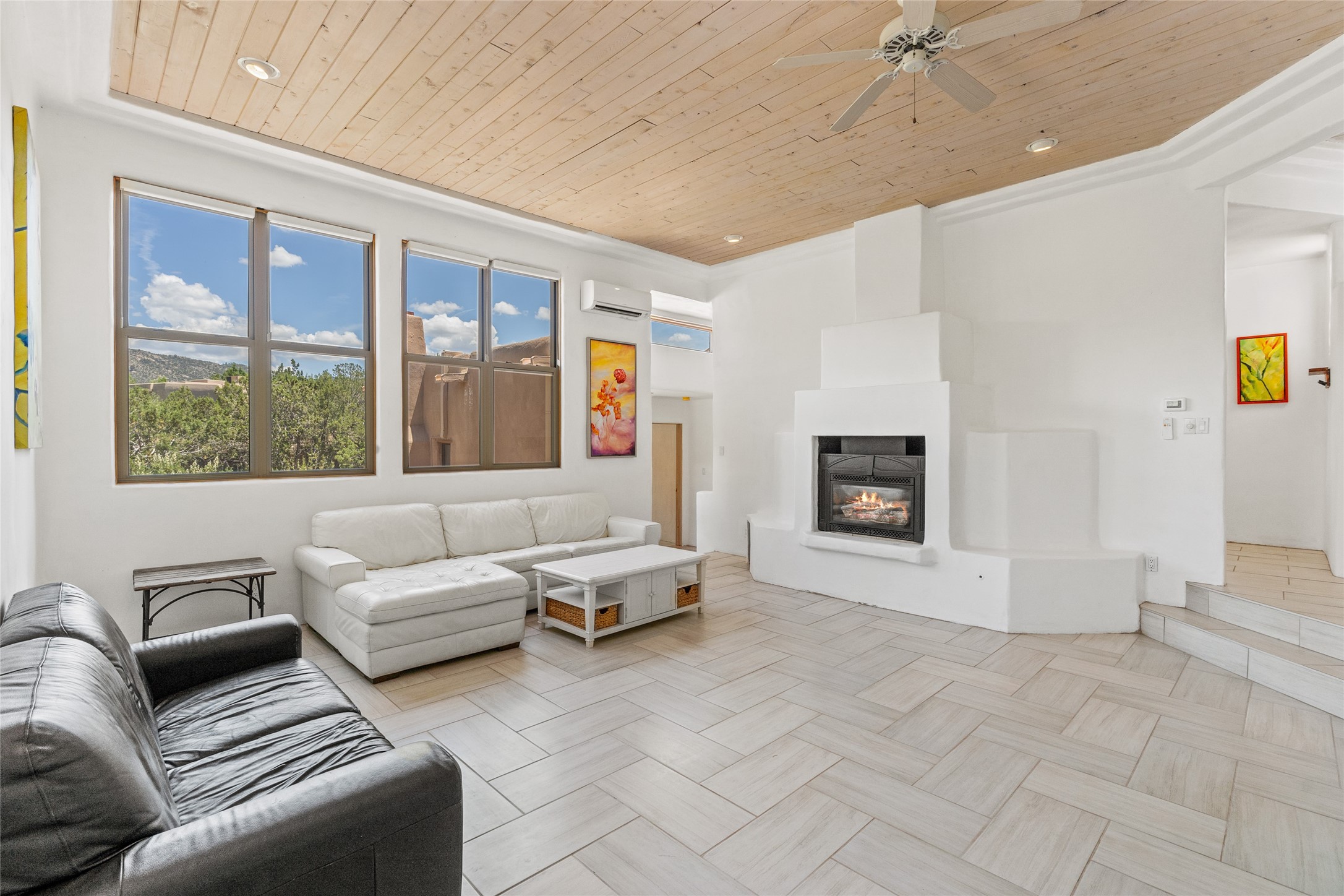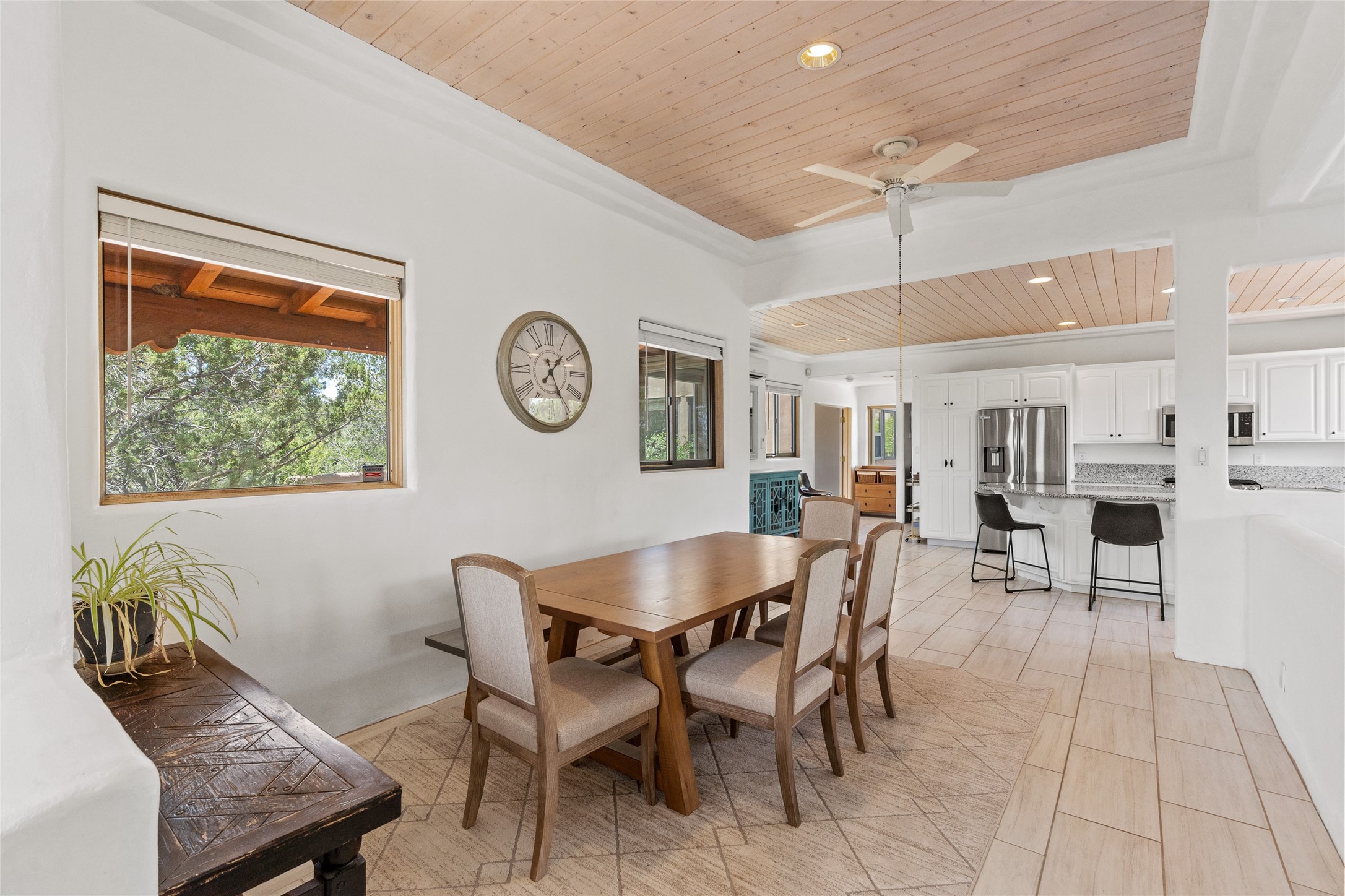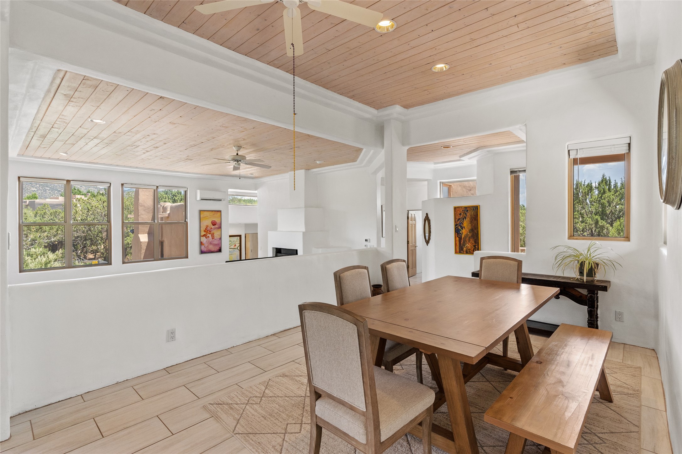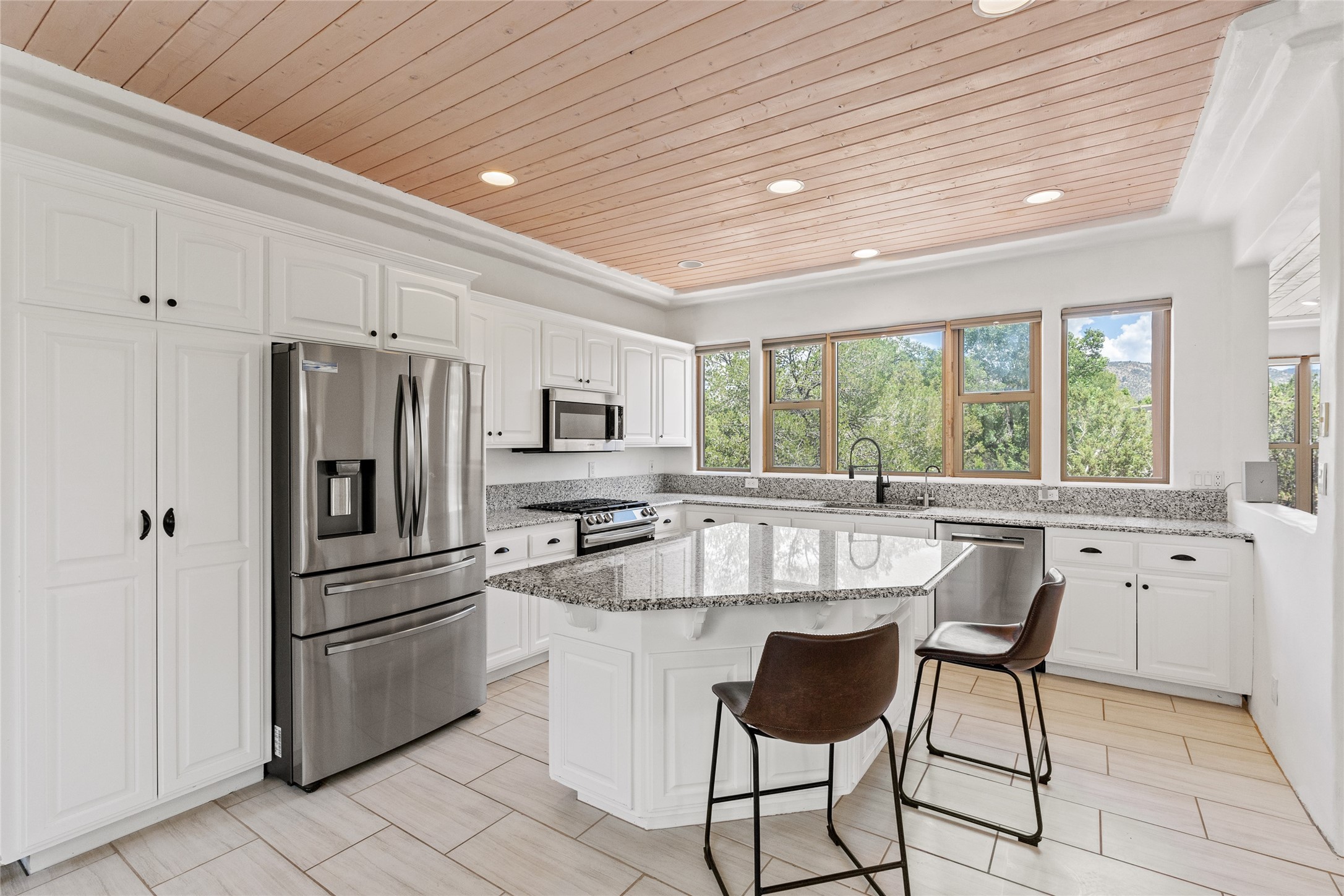 Located on over an acre with unbeatable access to all that Santa Fe has to offer, this beautifully updated home offers views of Sun andMoon Mountains and an open, flexible layout ideal for modern living. Tongue-and-groove ceilings with recessed lighting run throughout themain living areas, complementing the abundant natural light that pours in through large windows. The updated kitchen features new granitecountertops, newer Bosch and Samsung appliances, plus a RO filtration in the kitchen. The kitchen flows seamlessly into the open-conceptliving and dining spaces. Two cozy fireplaces create warmth and ambiance, while radiant heating and mini splits provide efficient heatingand cooling year-round. With three spacious bedrooms--including two that function well as primary suites. A standout feature is theattached studio with its own entrance, carport, skylights, and plentiful windows--perfect for an art space, home office, or guest retreat.Outside, the expansive lot offers endless possibilities for gardening, recreation, or expansion. Just a 5-minute walk from Christus St.Vincent Regional Medical Center and only 10 minutes to the historic Santa Fe Plaza, this home combines peaceful privacy with centralconvenience. Don't miss this rare opportunity to own a flexible, light-filled property in one of Santa Fe's most desirable locations.