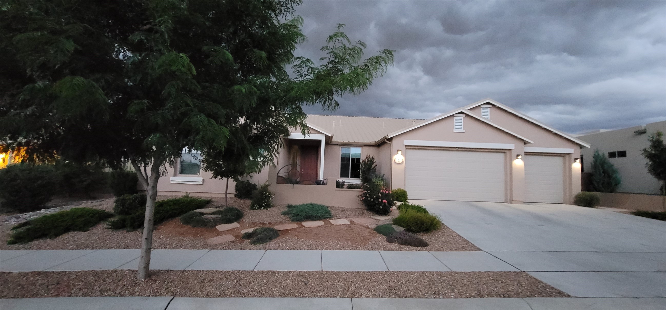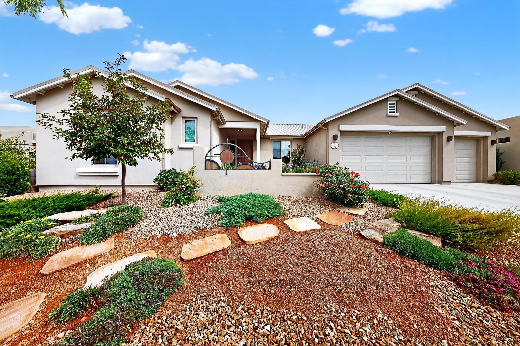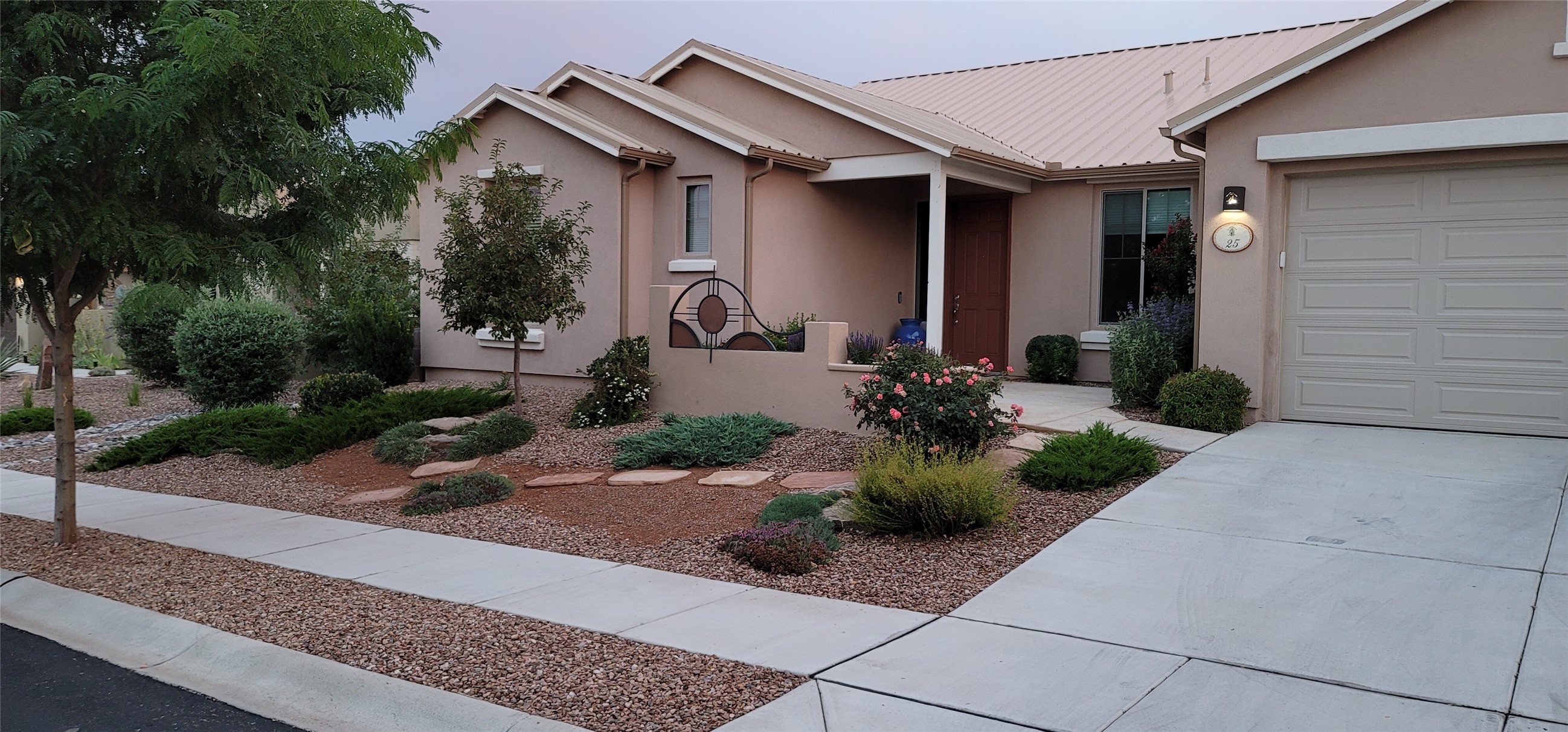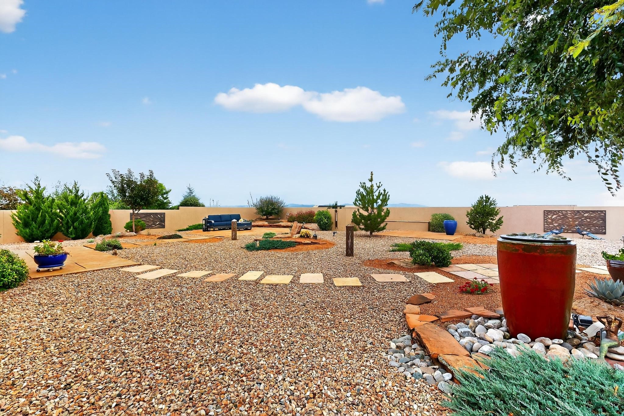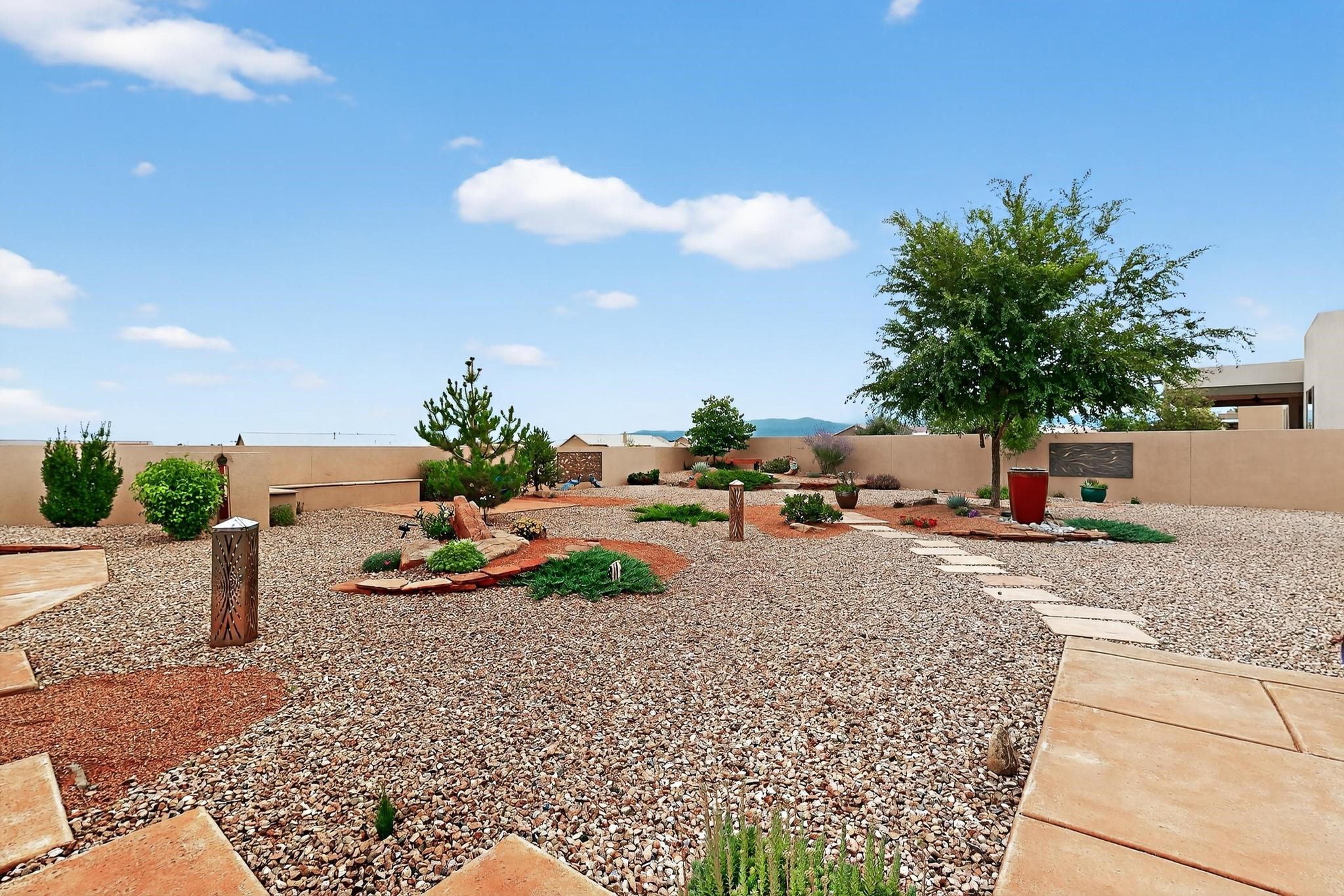 A stunning property on a quarter acre in prestigious Rancho Viejo. A breathtaking view of the mountains, beautiful landscaping, and flavors of Santa Fe inside makes this a home you will love. The Elegancia design has an open floor plan; split bedroom layout between primary bedroom and two guest rooms; and a large office/den. The kitchen is spacious with stainless steel appliances and pantry. The laundry room includes a full-size washer and dryer and sink. There are 2 bathrooms and a fun powder room. The kitchen, 2 bathrooms and laundry include plenty of counter space, storage, and granite countertops. The home includes a custom bar area. The vigas in the great room and primary bedroom, niches and a covered patio portal provide the feeling of timeless Santa Fe charm. The finished 3 car garage and instant hot water throughout the house provides added convenience. The full wall of windows in the great room provides a constant breathtaking view and motorized sunshades allow the view to shine through. Step outside to picturesque landscaping that includes pathways, seating areas, bubbling birdbath, and creative lighting. This is perfect place to enjoy the serenity of the beautiful Santa Fe skies and sunsets. Rancho Viejo provides 500 acres of green space, parks, and over 12 miles of walking and bike trails. Conveniently located by Santa Fe Community College, shopping, restaurants, and 15 minutes to the SF Plaza.