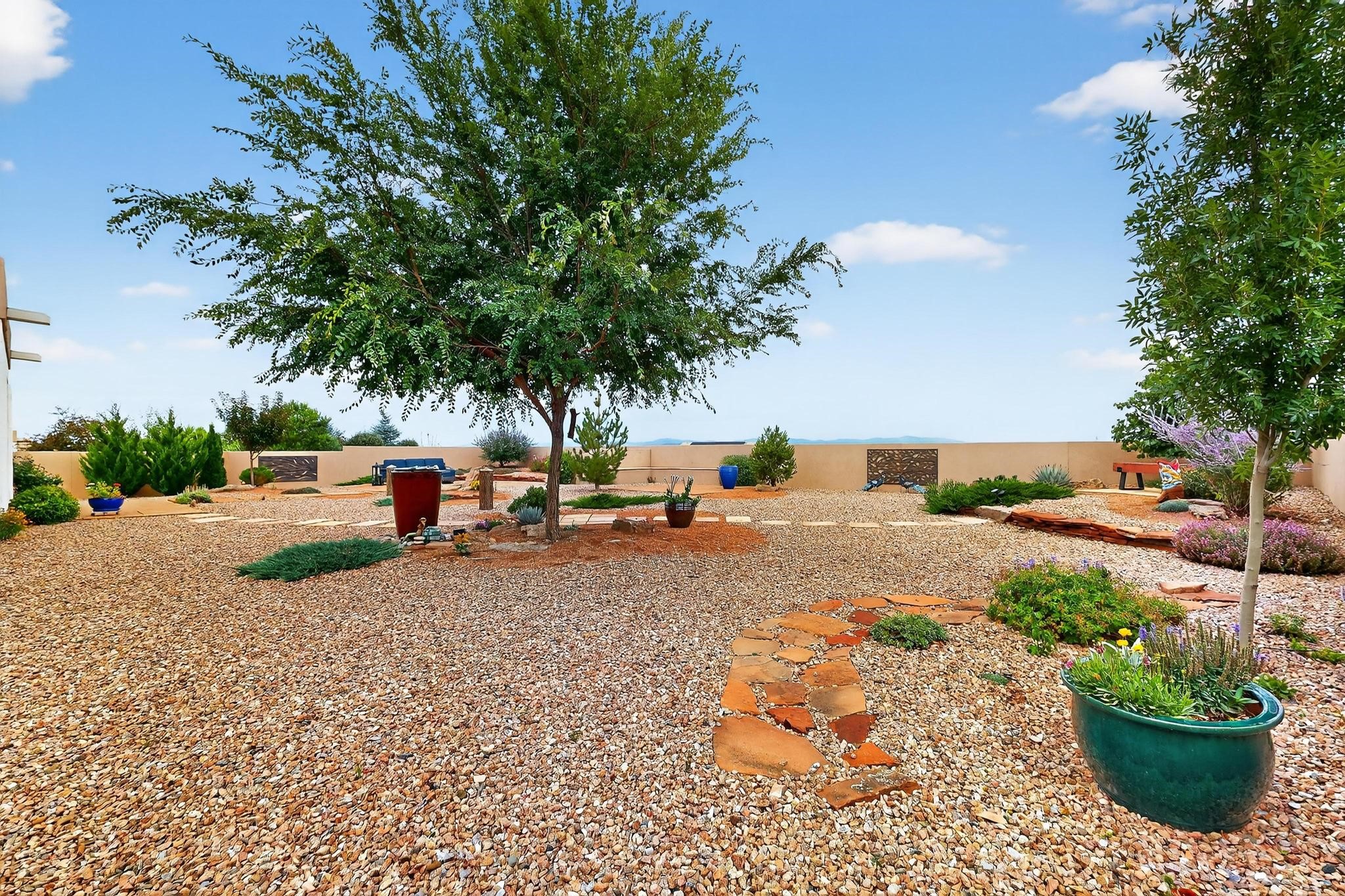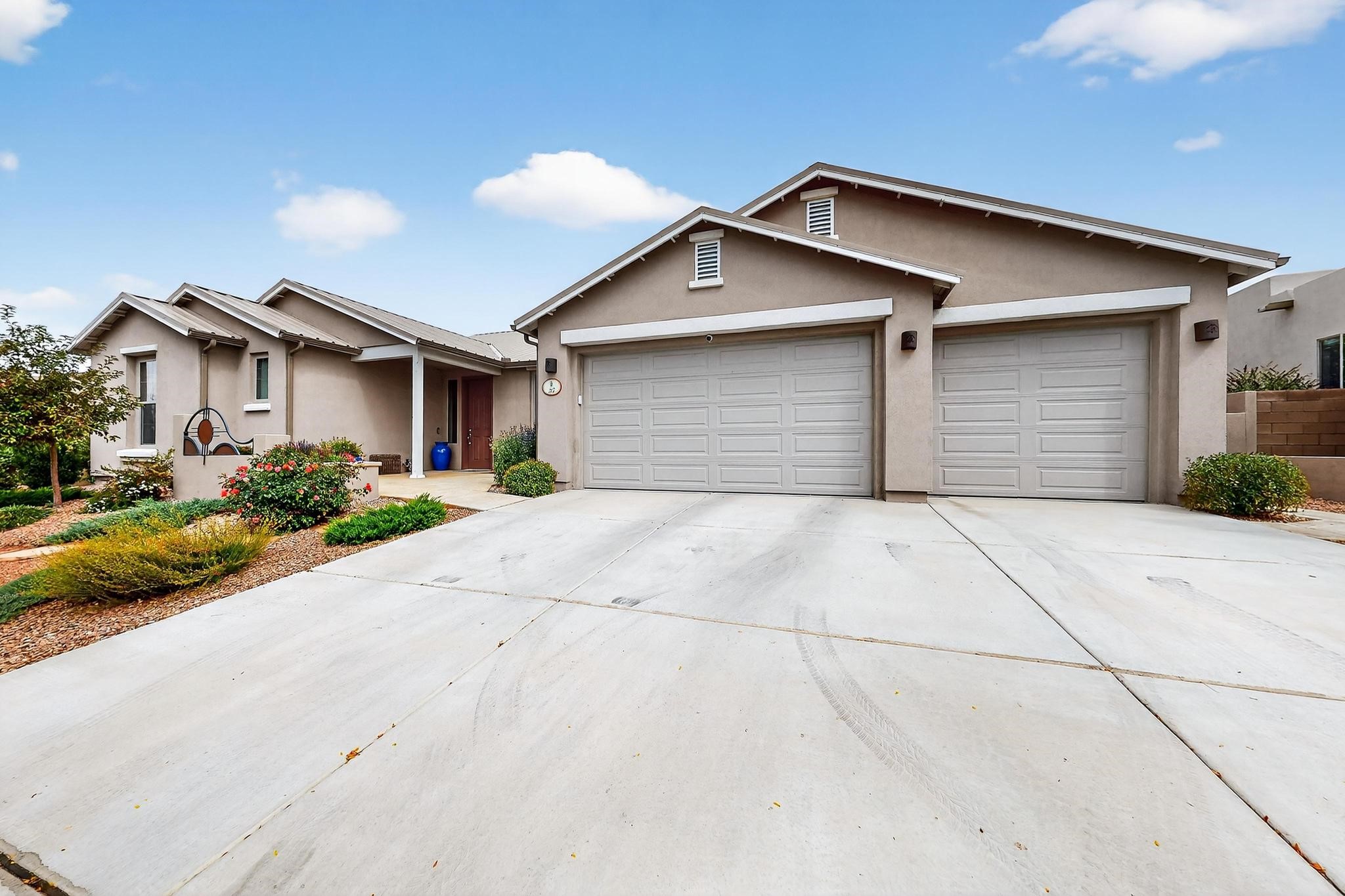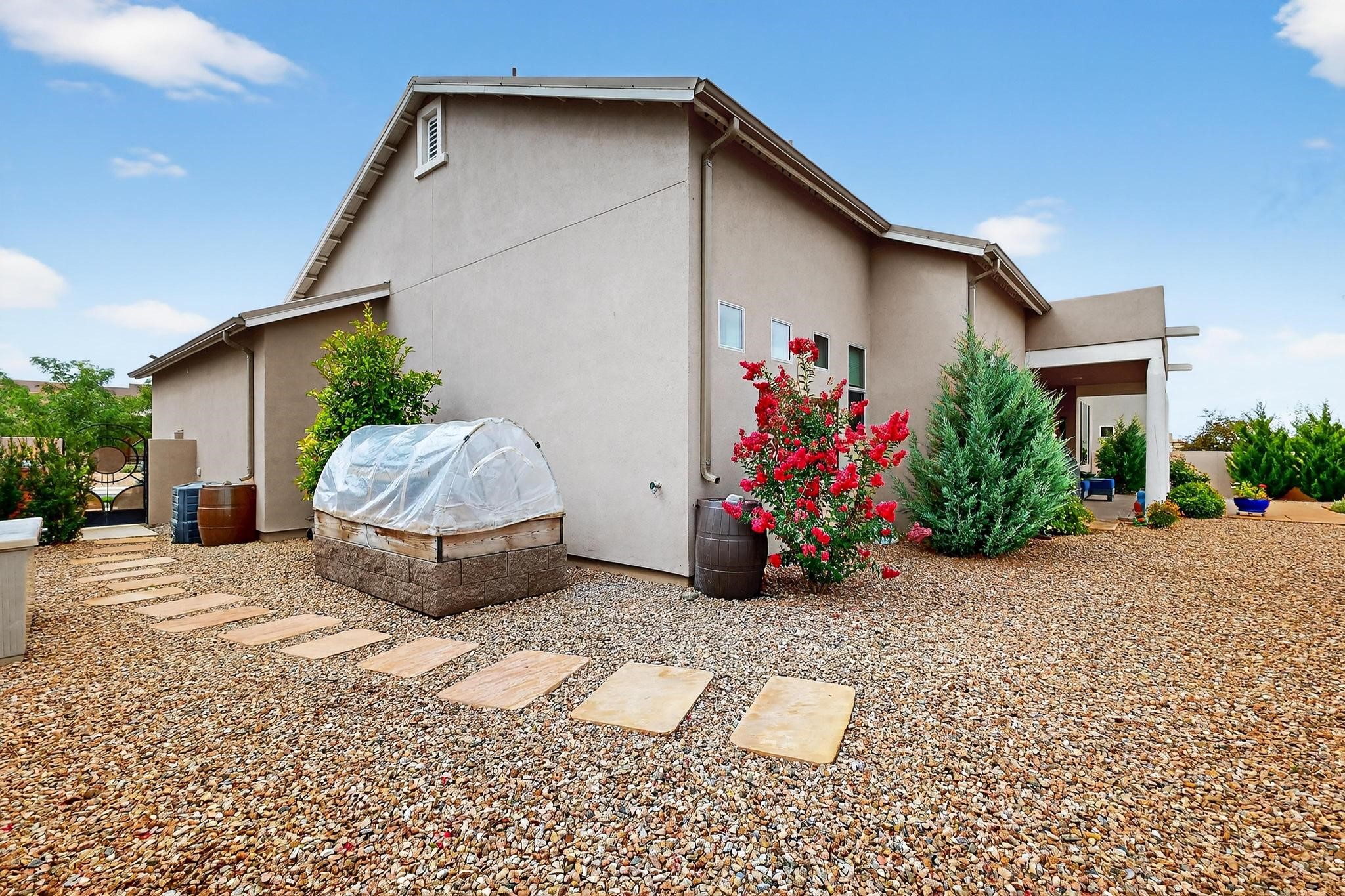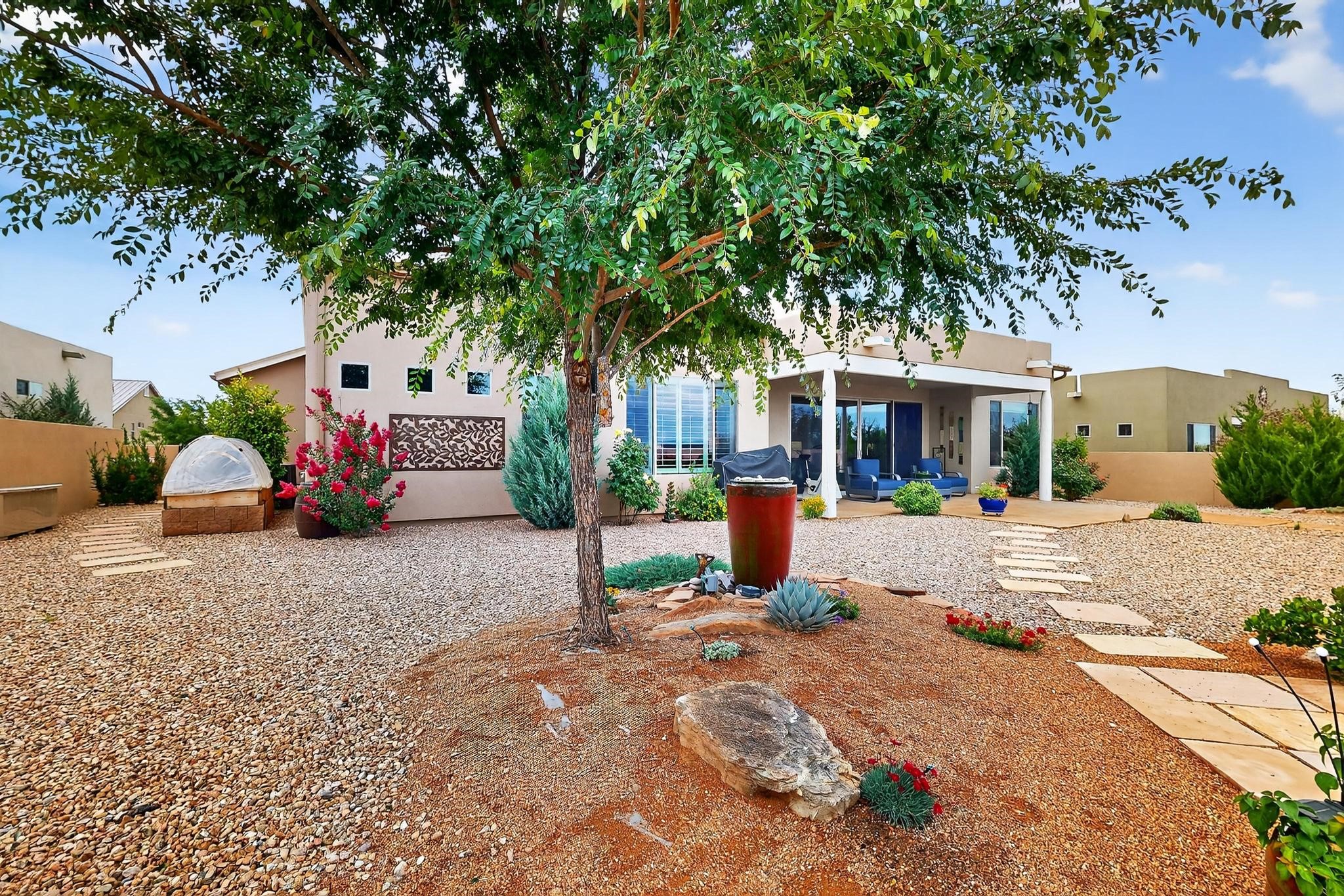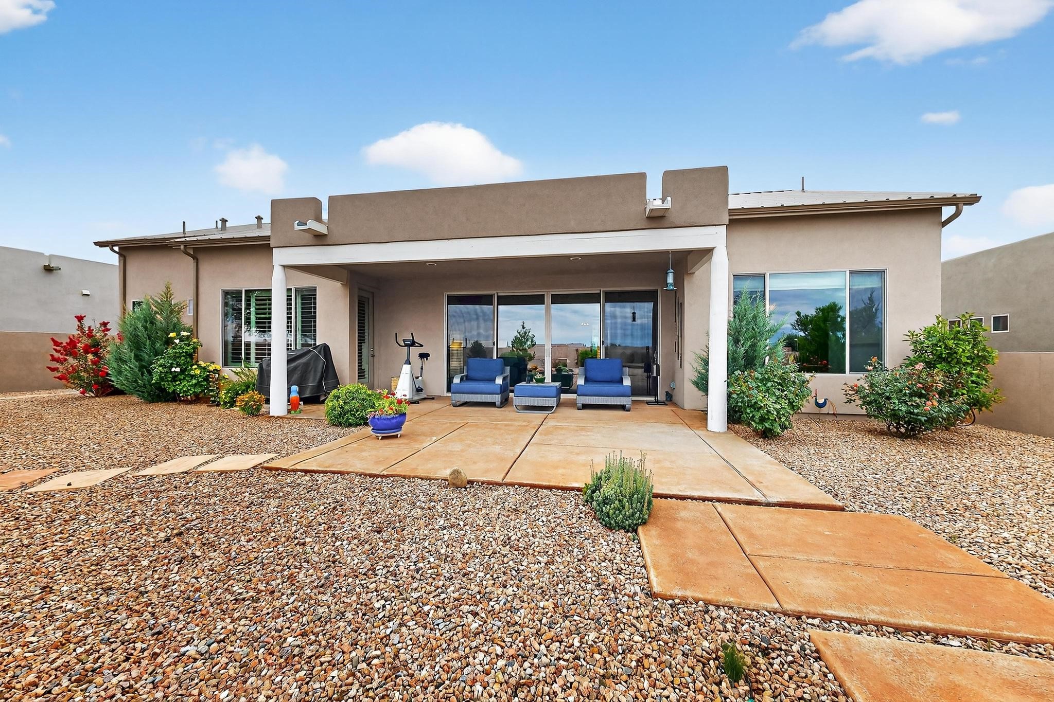 A stunning property on a quarter acre in prestigious Rancho Viejo. A breathtaking view of the mountains, beautiful landscaping, and flavors of Santa Fe inside makes this a home you will love. The Elegancia design has an open floor plan; split bedroom layout between primary bedroom and two guest rooms; and a large office/den. The kitchen is spacious with stainless steel appliances and pantry. The laundry room includes a full-size washer and dryer and sink. There are 2 bathrooms and a fun powder room. The kitchen, 2 bathrooms and laundry include plenty of counter space, storage, and granite countertops. The home includes a custom bar area. The vigas in the great room and primary bedroom, niches and a covered patio portal provide the feeling of timeless Santa Fe charm. The finished 3 car garage and instant hot water throughout the house provides added convenience. The full wall of windows in the great room provides a constant breathtaking view and motorized sunshades allow the view to shine through. Step outside to picturesque landscaping that includes pathways, seating areas, bubbling birdbath, and creative lighting. This is perfect place to enjoy the serenity of the beautiful Santa Fe skies and sunsets. Rancho Viejo provides 500 acres of green space, parks, and over 12 miles of walking and bike trails. Conveniently located by Santa Fe Community College, shopping, restaurants, and 15 minutes to the SF Plaza.