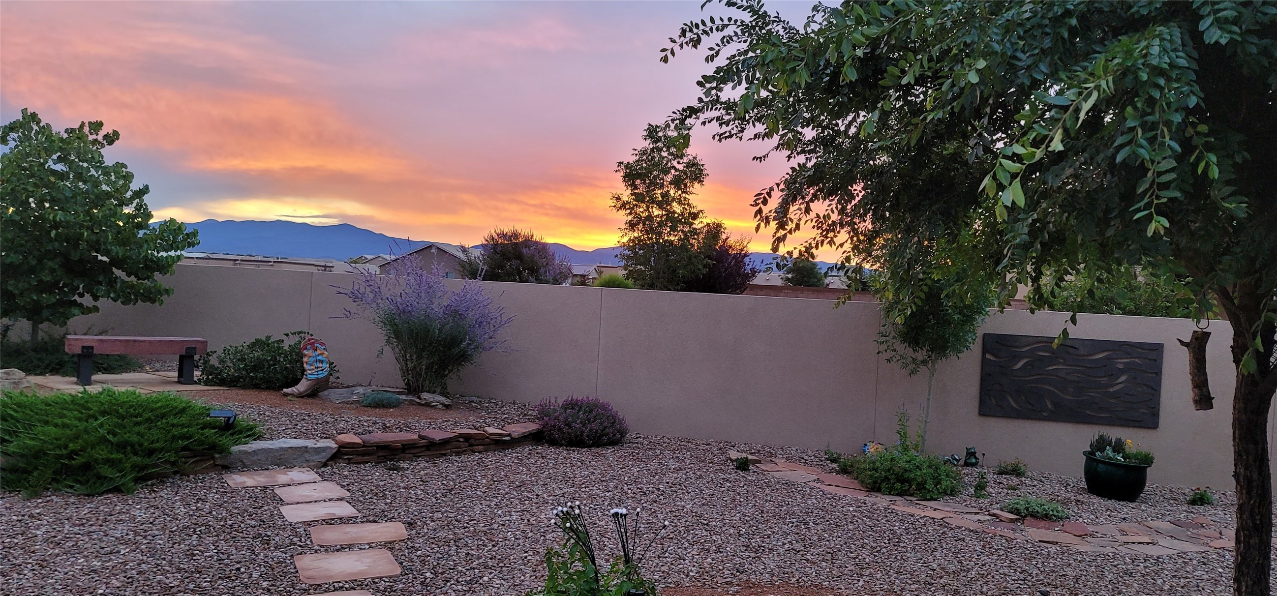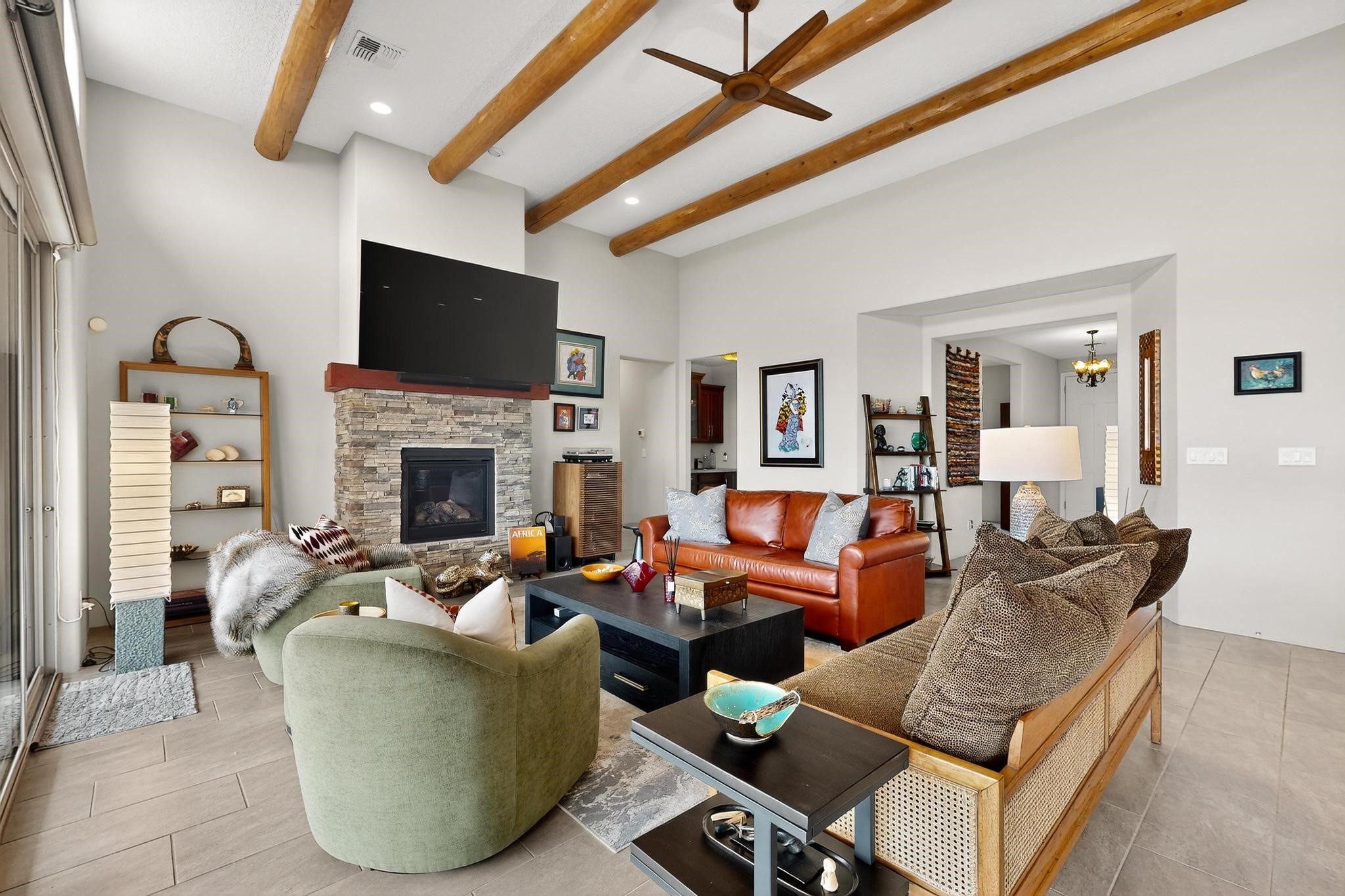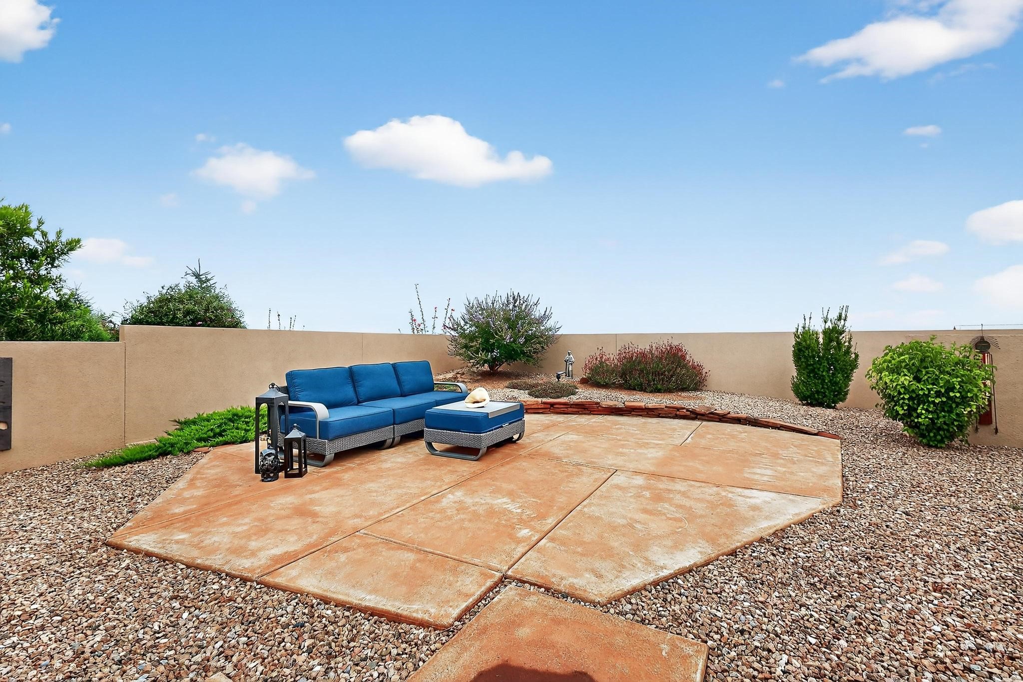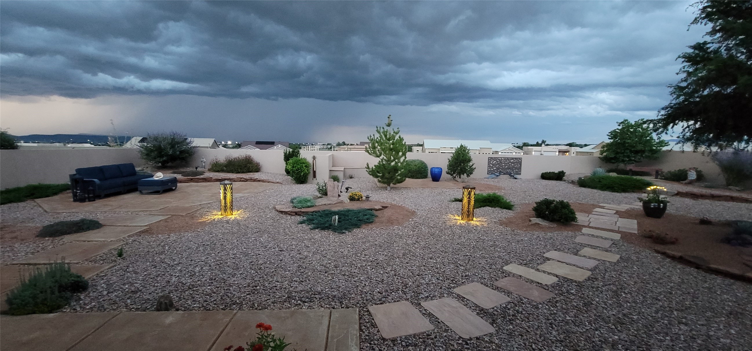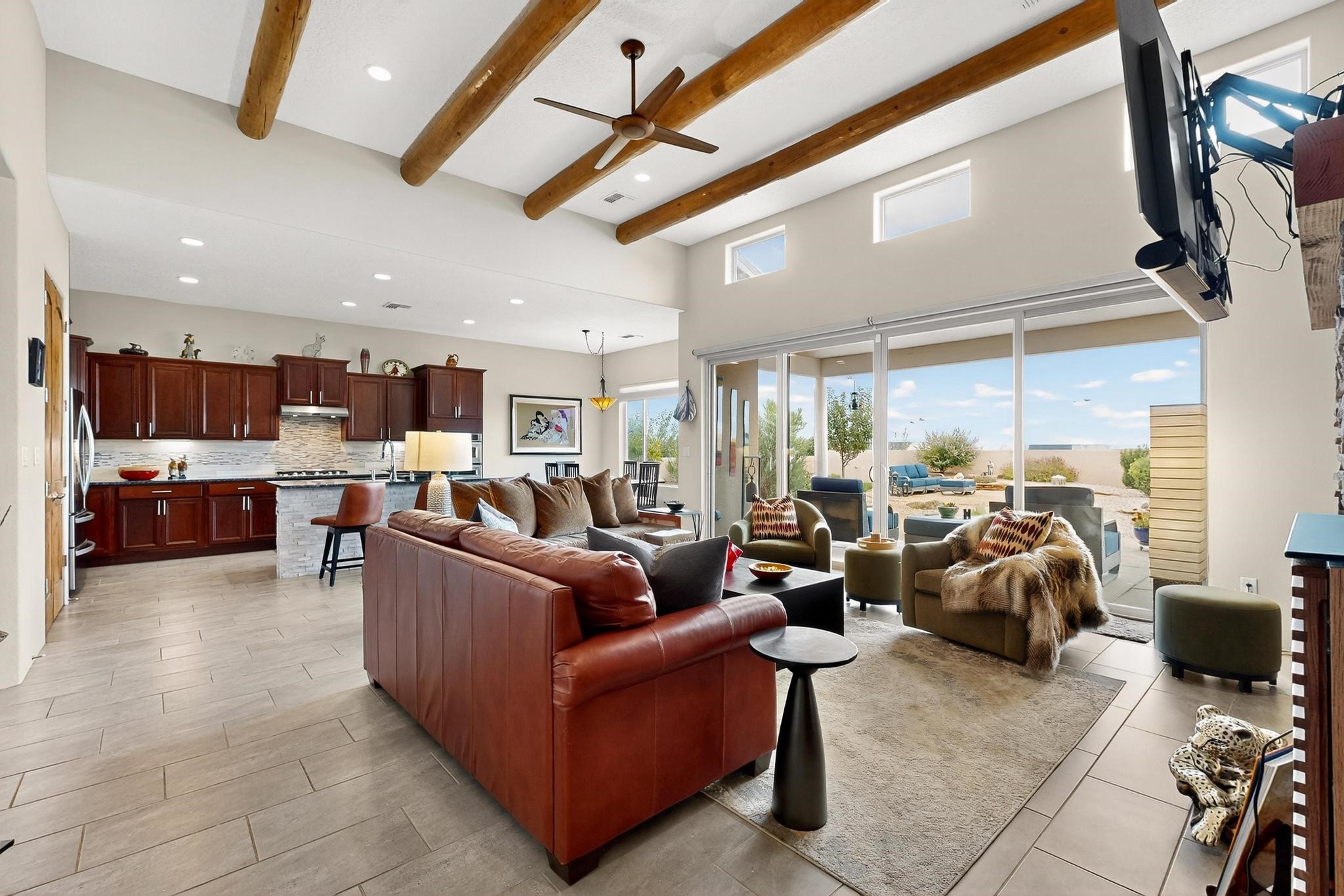 A stunning property on a quarter acre in prestigious Rancho Viejo. A breathtaking view of the mountains, beautiful landscaping, and flavors of Santa Fe inside makes this a home you will love. The Elegancia design has an open floor plan; split bedroom layout between primary bedroom and two guest rooms; and a large office/den. The kitchen is spacious with stainless steel appliances and pantry. The laundry room includes a full-size washer and dryer and sink. There are 2 bathrooms and a fun powder room. The kitchen, 2 bathrooms and laundry include plenty of counter space, storage, and granite countertops. The home includes a custom bar area. The vigas in the great room and primary bedroom, niches and a covered patio portal provide the feeling of timeless Santa Fe charm. The finished 3 car garage and instant hot water throughout the house provides added convenience. The full wall of windows in the great room provides a constant breathtaking view and motorized sunshades allow the view to shine through. Step outside to picturesque landscaping that includes pathways, seating areas, bubbling birdbath, and creative lighting. This is perfect place to enjoy the serenity of the beautiful Santa Fe skies and sunsets. Rancho Viejo provides 500 acres of green space, parks, and over 12 miles of walking and bike trails. Conveniently located by Santa Fe Community College, shopping, restaurants, and 15 minutes to the SF Plaza.