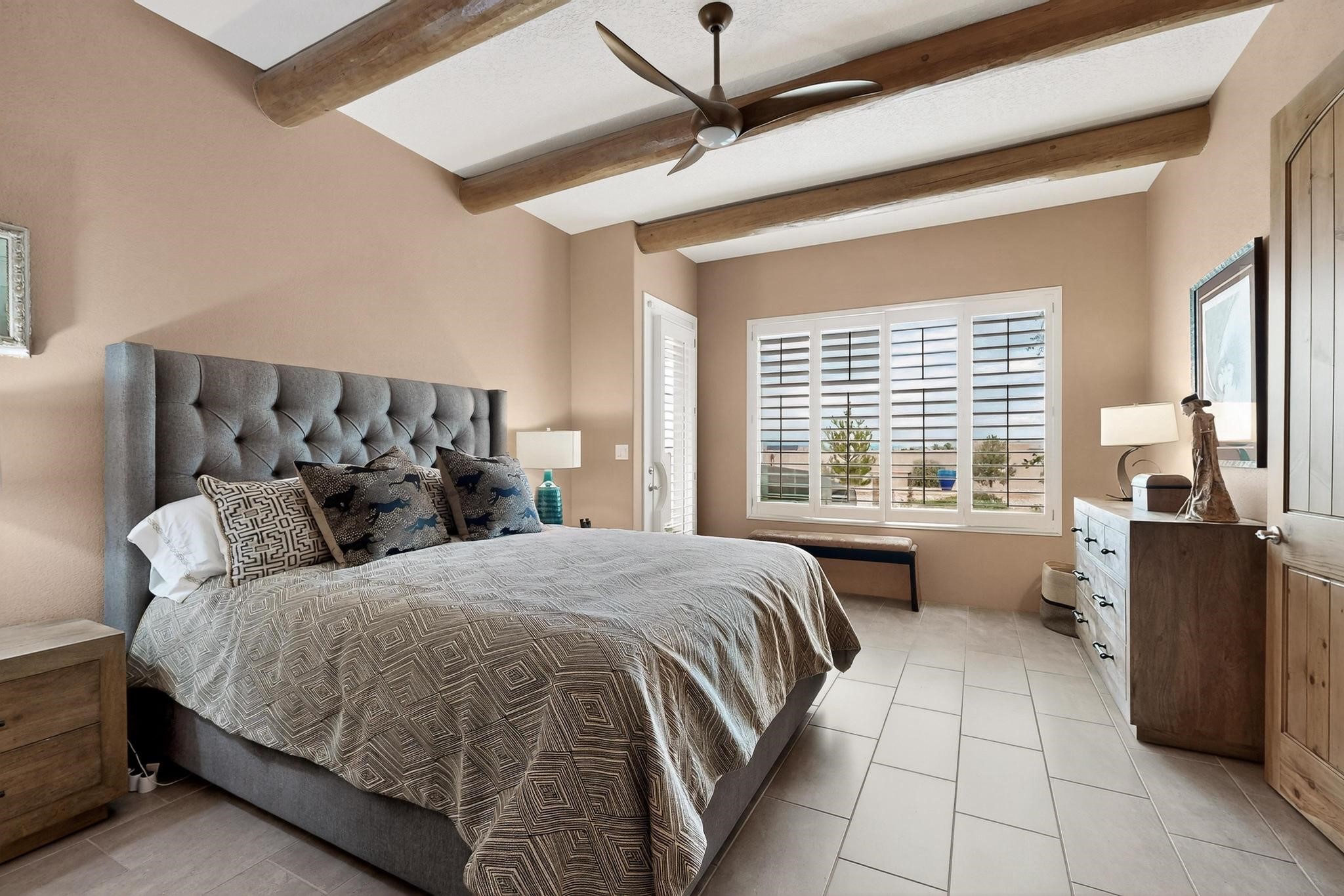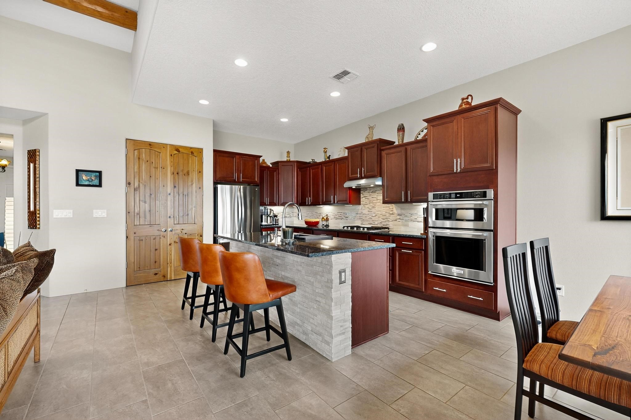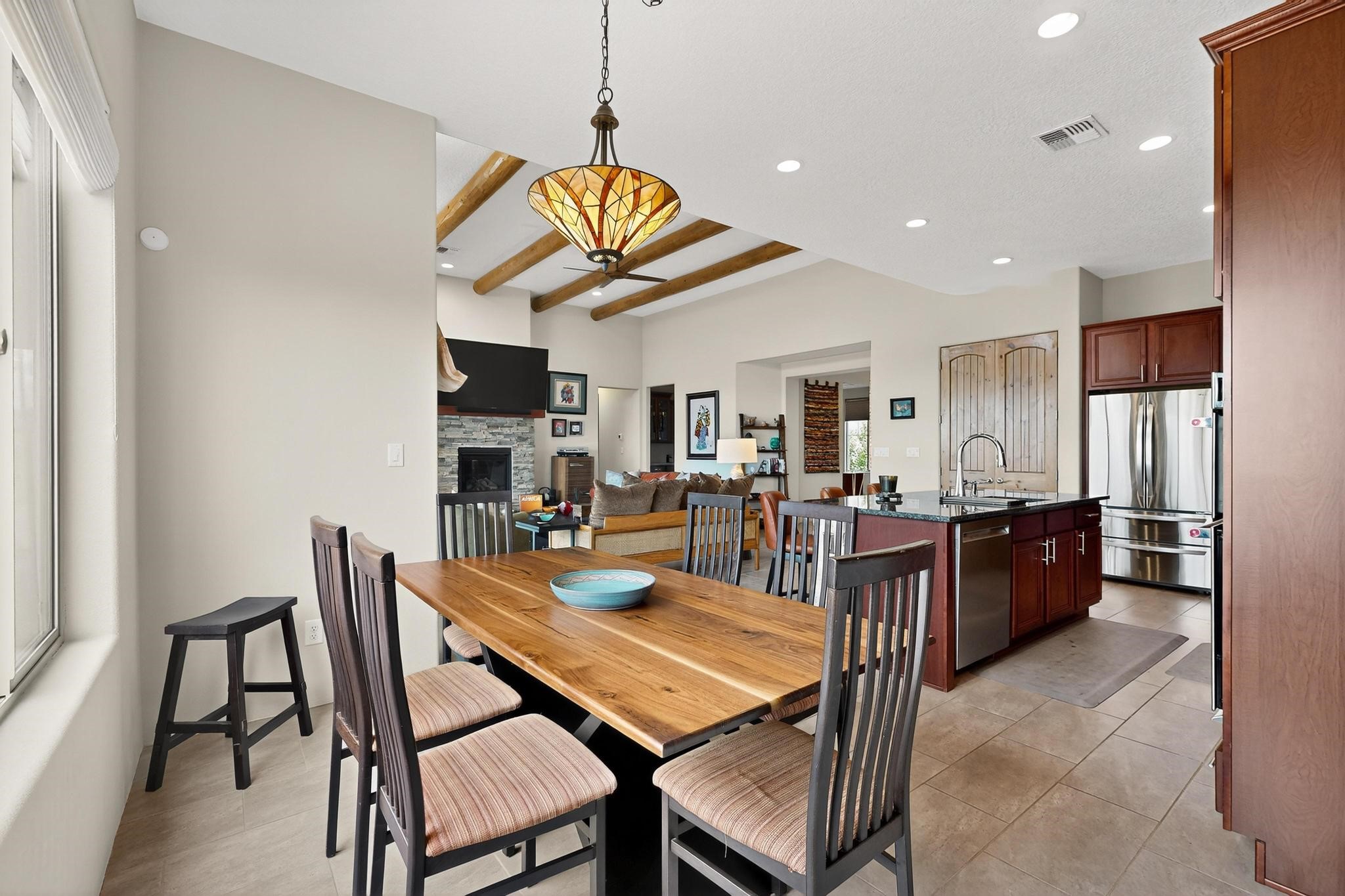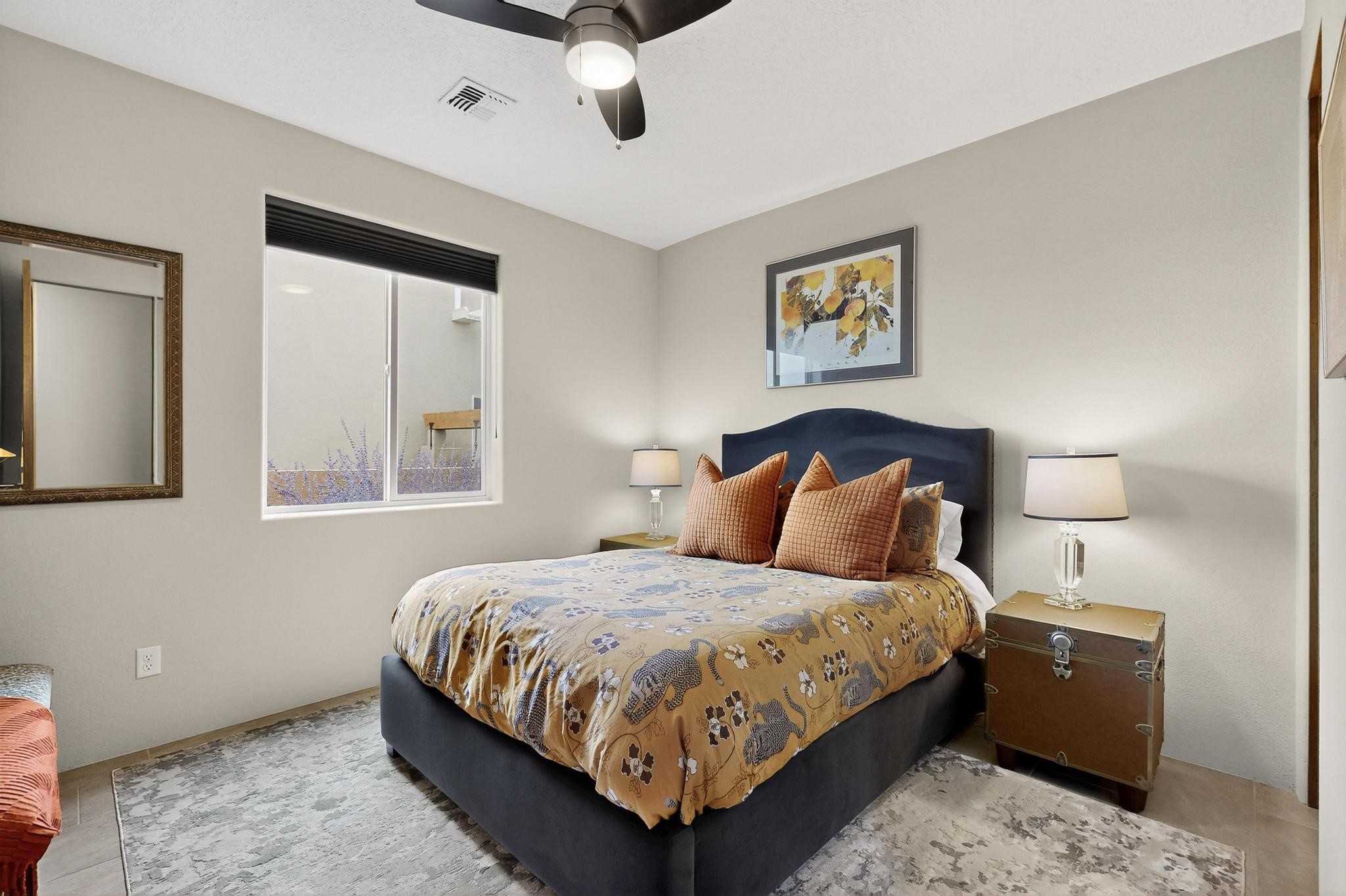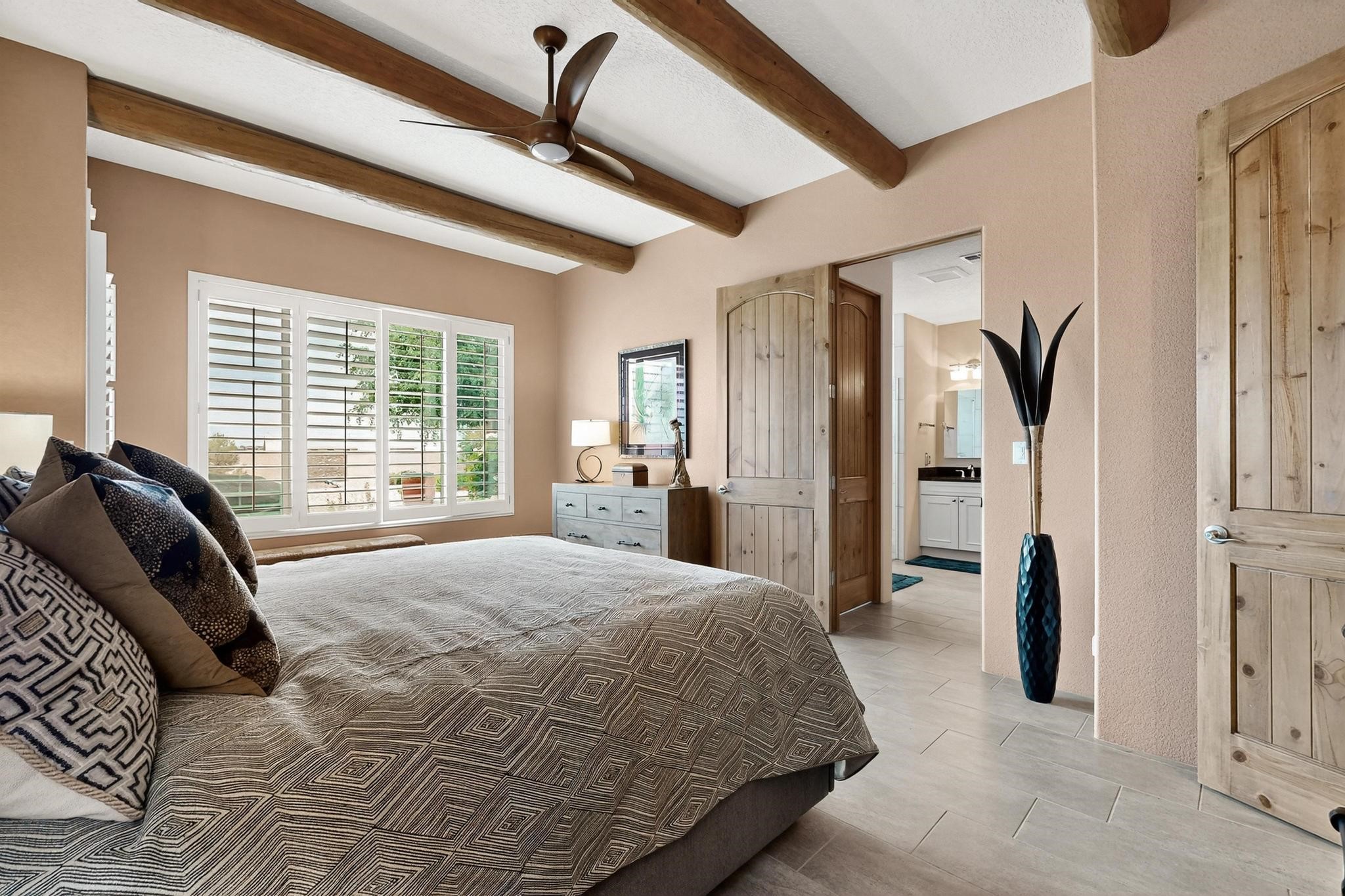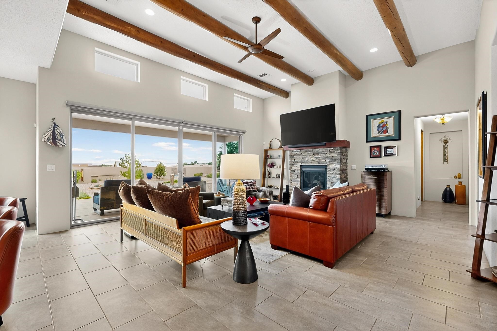 A stunning property on a quarter acre in prestigious Rancho Viejo. A breathtaking view of the mountains, beautiful landscaping, and flavors of Santa Fe inside makes this a home you will love. The Elegancia design has an open floor plan; split bedroom layout between primary bedroom and two guest rooms; and a large office/den. The kitchen is spacious with stainless steel appliances and pantry. The laundry room includes a full-size washer and dryer and sink. There are 2 bathrooms and a fun powder room. The kitchen, 2 bathrooms and laundry include plenty of counter space, storage, and granite countertops. The home includes a custom bar area. The vigas in the great room and primary bedroom, niches and a covered patio portal provide the feeling of timeless Santa Fe charm. The finished 3 car garage and instant hot water throughout the house provides added convenience. The full wall of windows in the great room provides a constant breathtaking view and motorized sunshades allow the view to shine through. Step outside to picturesque landscaping that includes pathways, seating areas, bubbling birdbath, and creative lighting. This is perfect place to enjoy the serenity of the beautiful Santa Fe skies and sunsets. Rancho Viejo provides 500 acres of green space, parks, and over 12 miles of walking and bike trails. Conveniently located by Santa Fe Community College, shopping, restaurants, and 15 minutes to the SF Plaza.