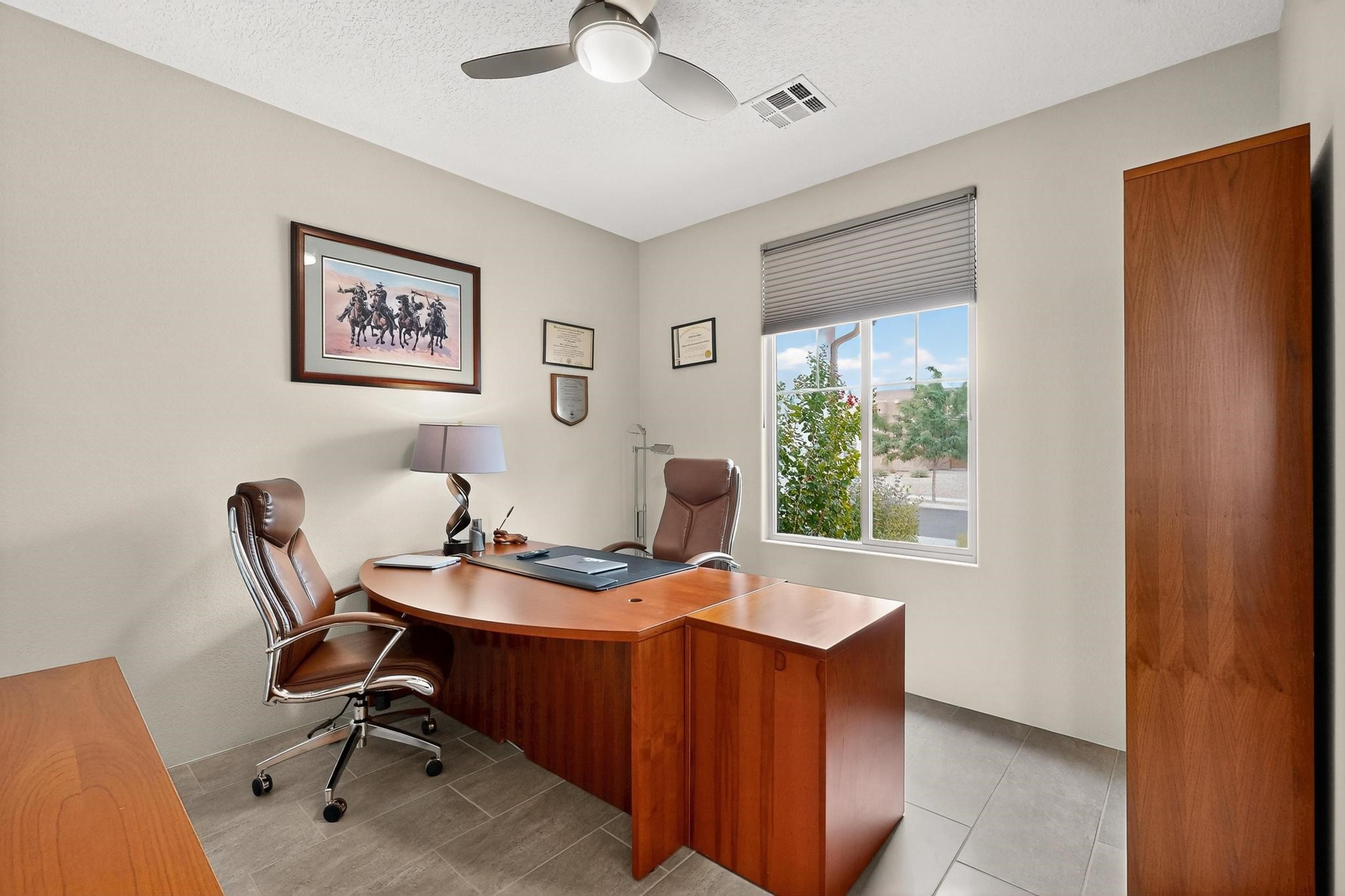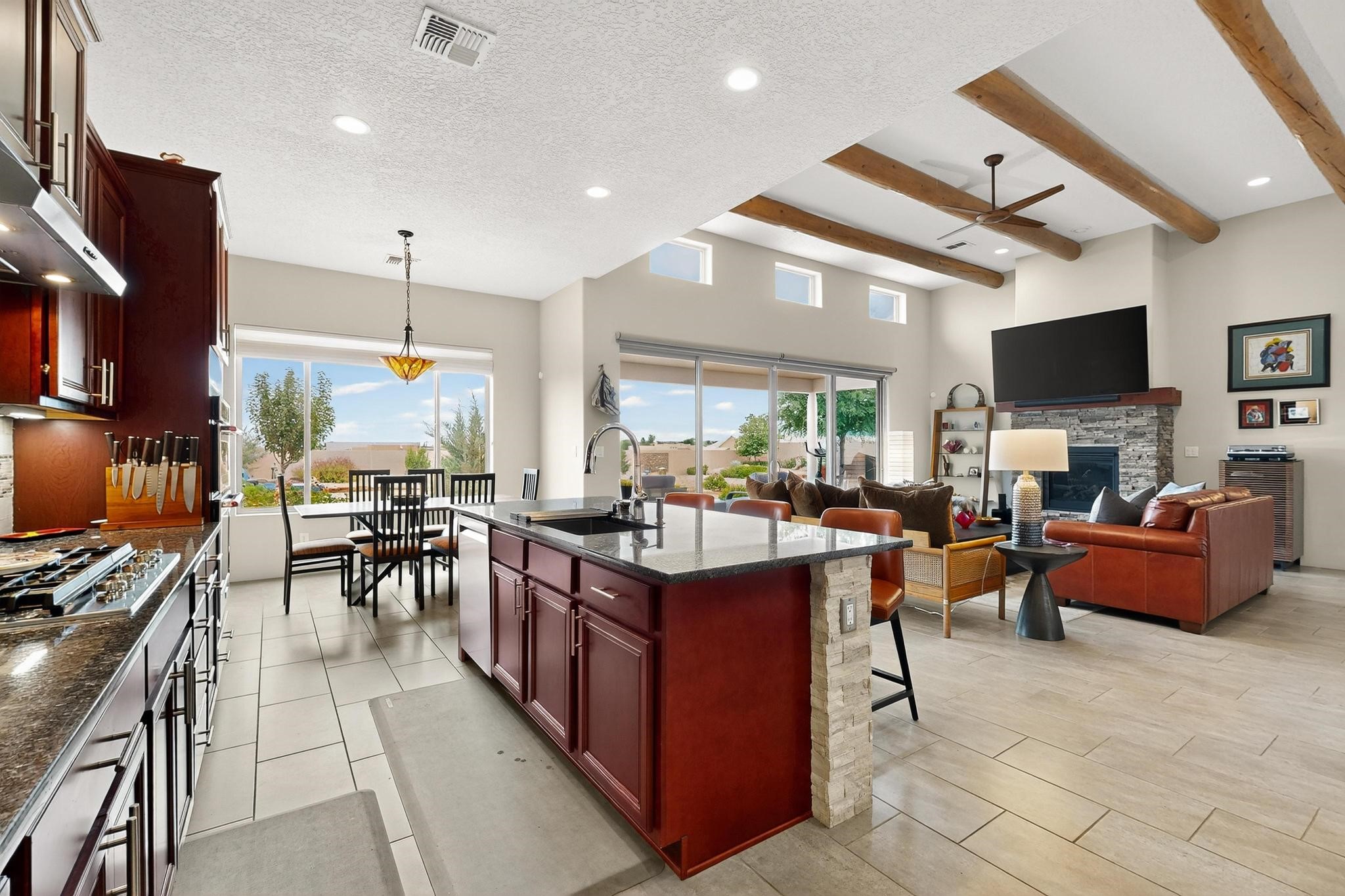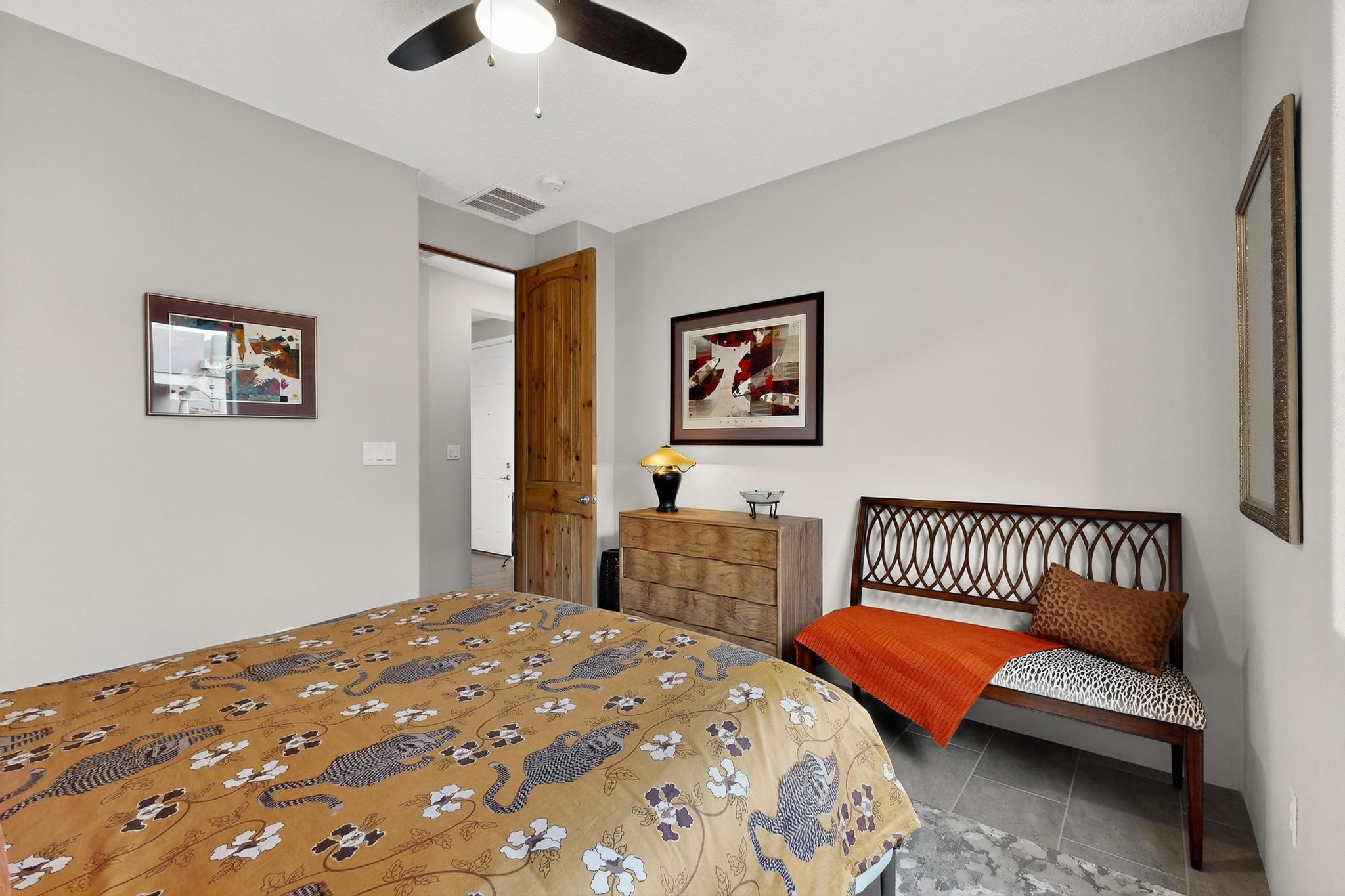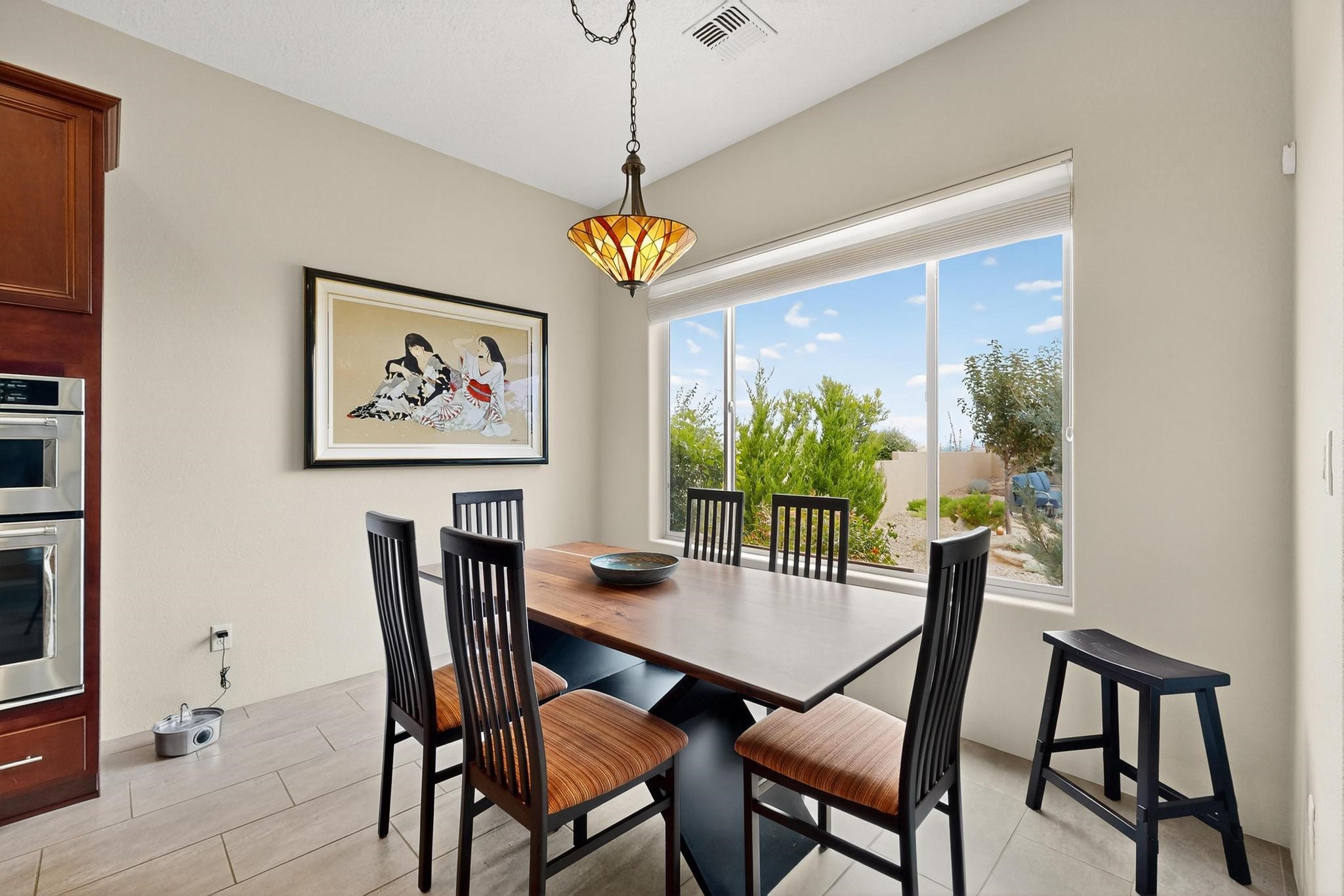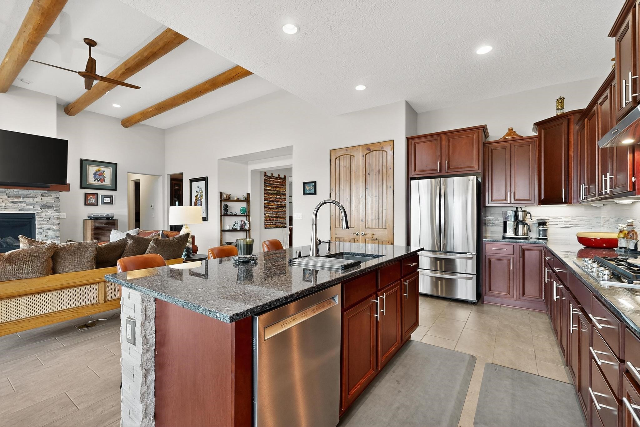 A stunning property on a quarter acre in prestigious Rancho Viejo. A breathtaking view of the mountains, beautiful landscaping, and flavors of Santa Fe inside makes this a home you will love. The Elegancia design has an open floor plan; split bedroom layout between primary bedroom and two guest rooms; and a large office/den. The kitchen is spacious with stainless steel appliances and pantry. The laundry room includes a full-size washer and dryer and sink. There are 2 bathrooms and a fun powder room. The kitchen, 2 bathrooms and laundry include plenty of counter space, storage, and granite countertops. The home includes a custom bar area. The vigas in the great room and primary bedroom, niches and a covered patio portal provide the feeling of timeless Santa Fe charm. The finished 3 car garage and instant hot water throughout the house provides added convenience. The full wall of windows in the great room provides a constant breathtaking view and motorized sunshades allow the view to shine through. Step outside to picturesque landscaping that includes pathways, seating areas, bubbling birdbath, and creative lighting. This is perfect place to enjoy the serenity of the beautiful Santa Fe skies and sunsets. Rancho Viejo provides 500 acres of green space, parks, and over 12 miles of walking and bike trails. Conveniently located by Santa Fe Community College, shopping, restaurants, and 15 minutes to the SF Plaza.