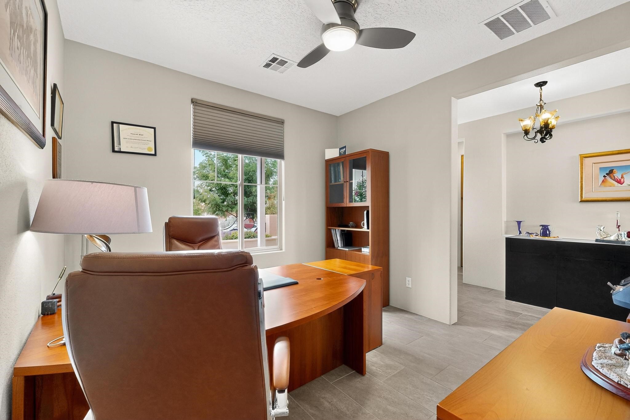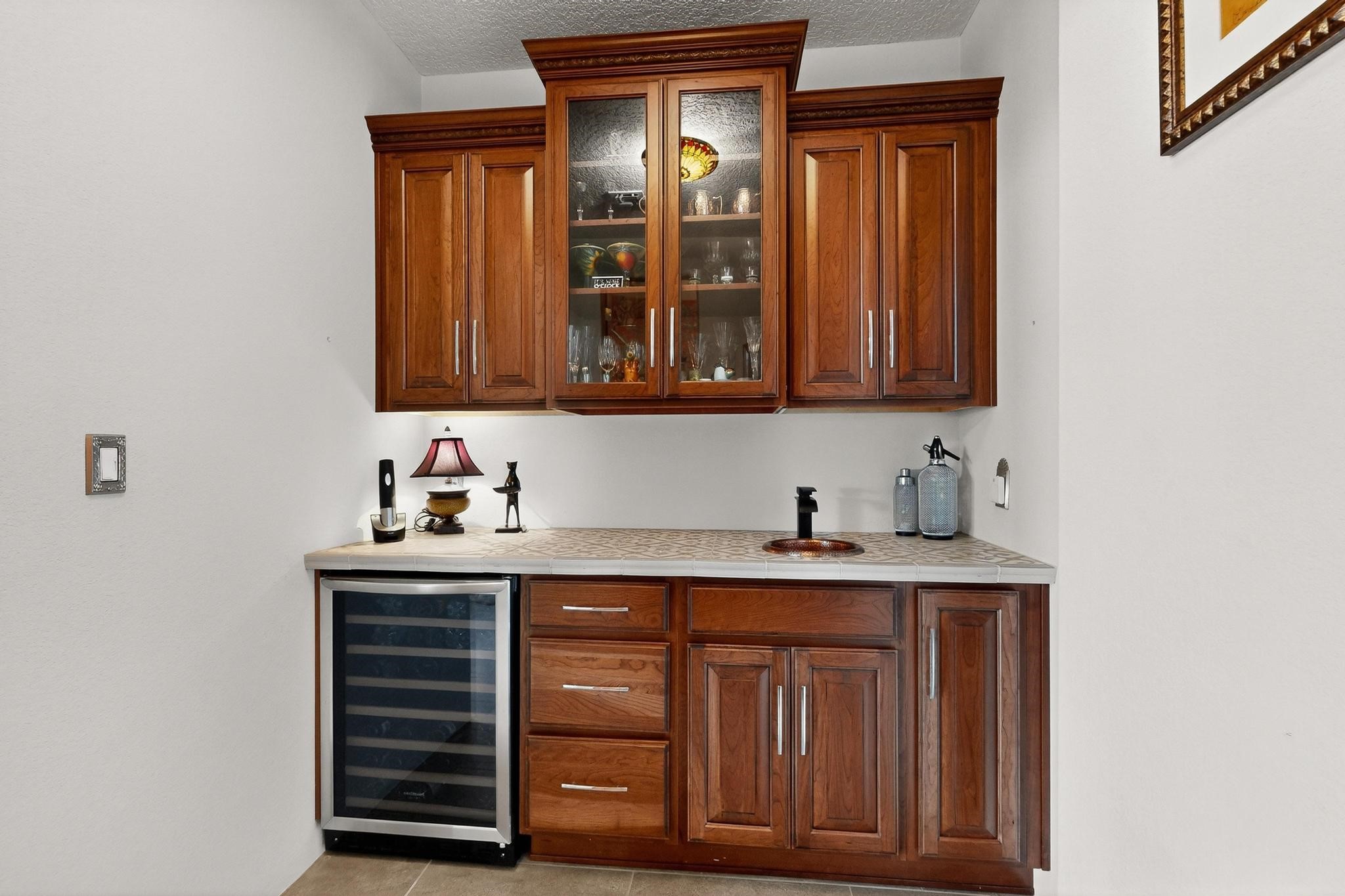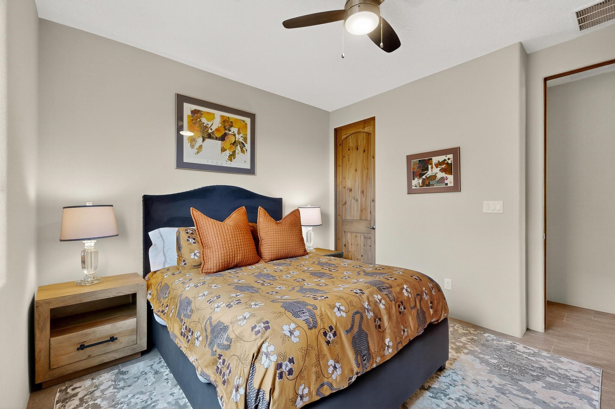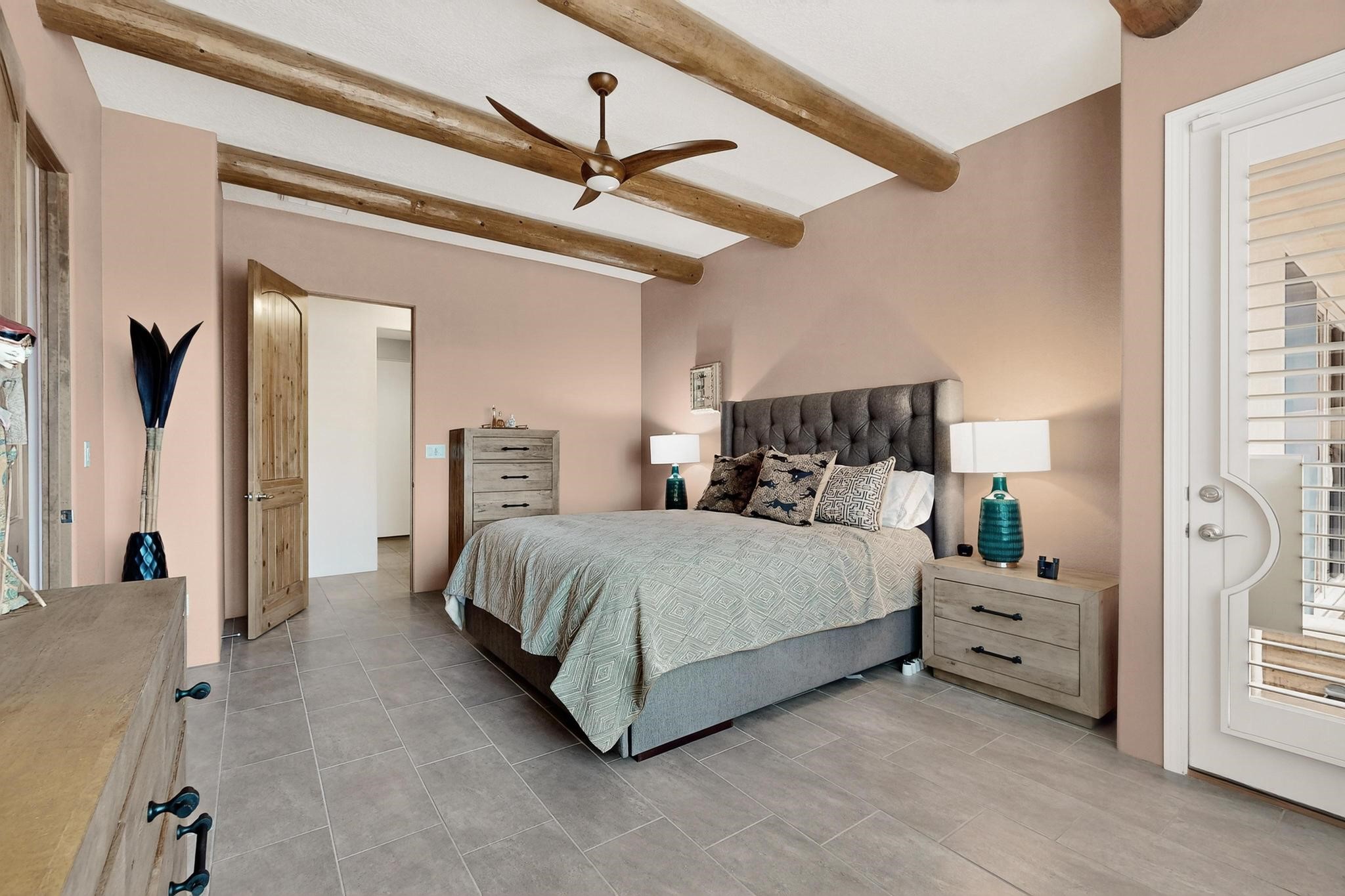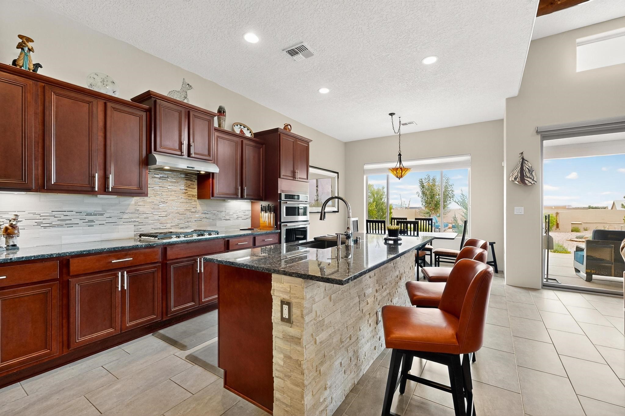 A stunning property on a quarter acre in prestigious Rancho Viejo. A breathtaking view of the mountains, beautiful landscaping, and flavors of Santa Fe inside makes this a home you will love. The Elegancia design has an open floor plan; split bedroom layout between primary bedroom and two guest rooms; and a large office/den. The kitchen is spacious with stainless steel appliances and pantry. The laundry room includes a full-size washer and dryer and sink. There are 2 bathrooms and a fun powder room. The kitchen, 2 bathrooms and laundry include plenty of counter space, storage, and granite countertops. The home includes a custom bar area. The vigas in the great room and primary bedroom, niches and a covered patio portal provide the feeling of timeless Santa Fe charm. The finished 3 car garage and instant hot water throughout the house provides added convenience. The full wall of windows in the great room provides a constant breathtaking view and motorized sunshades allow the view to shine through. Step outside to picturesque landscaping that includes pathways, seating areas, bubbling birdbath, and creative lighting. This is perfect place to enjoy the serenity of the beautiful Santa Fe skies and sunsets. Rancho Viejo provides 500 acres of green space, parks, and over 12 miles of walking and bike trails. Conveniently located by Santa Fe Community College, shopping, restaurants, and 15 minutes to the SF Plaza.