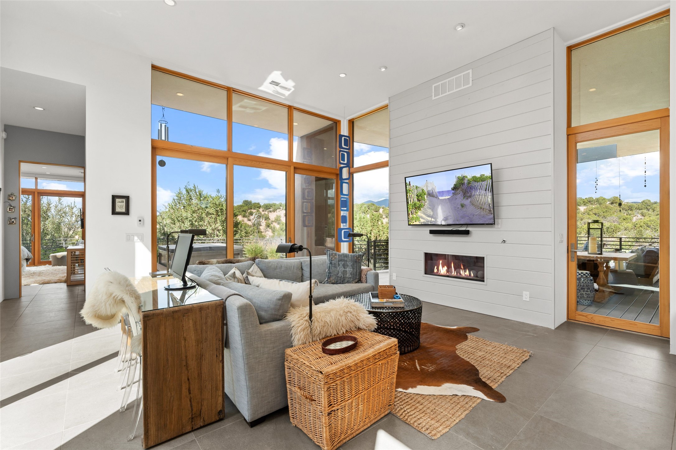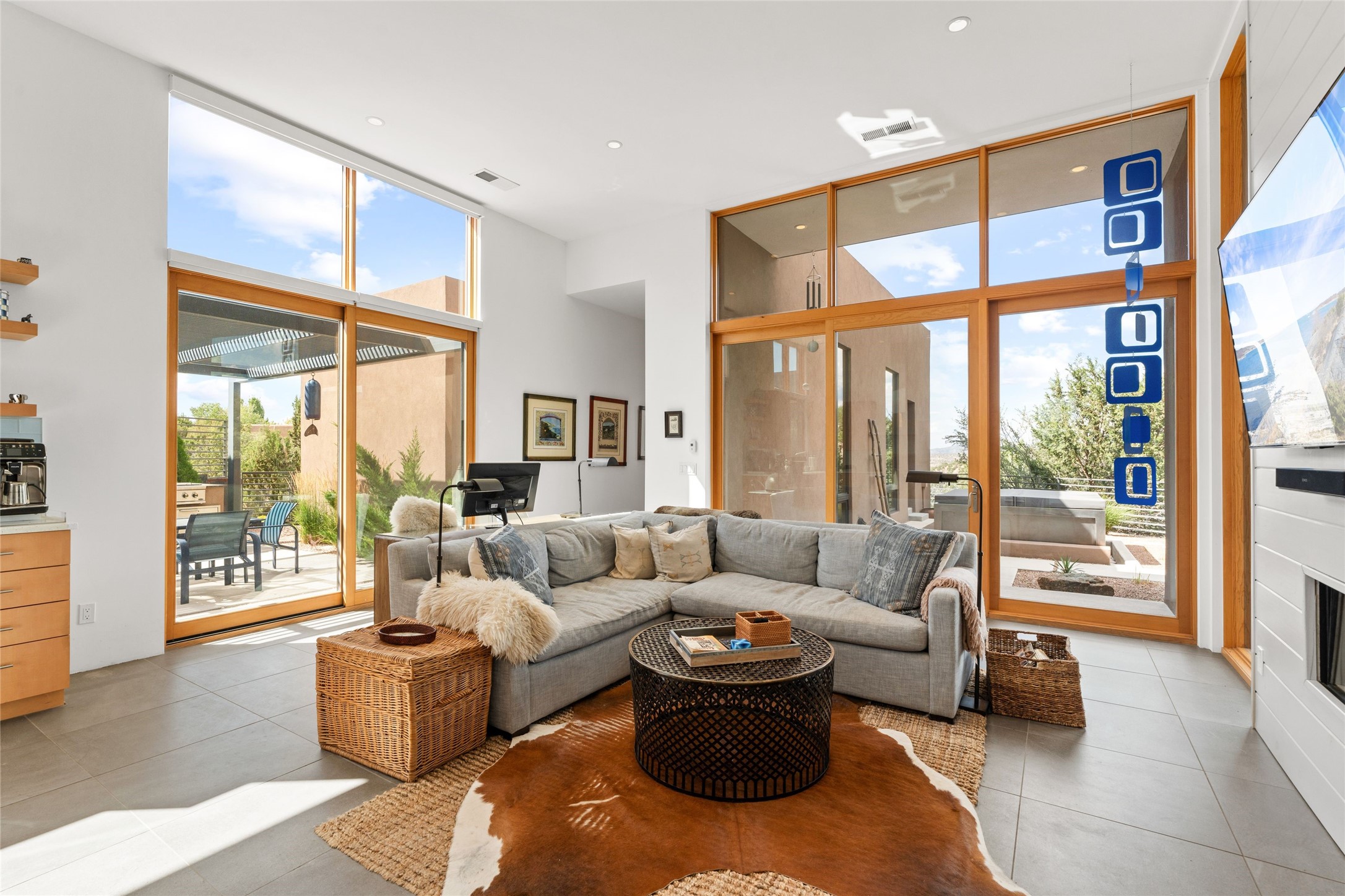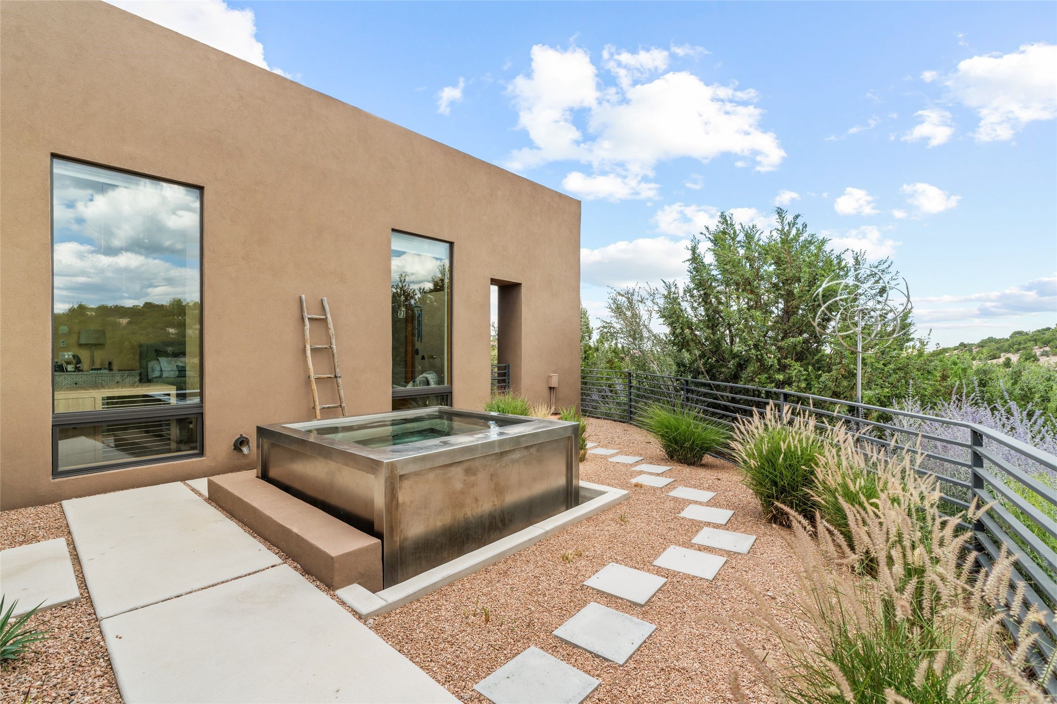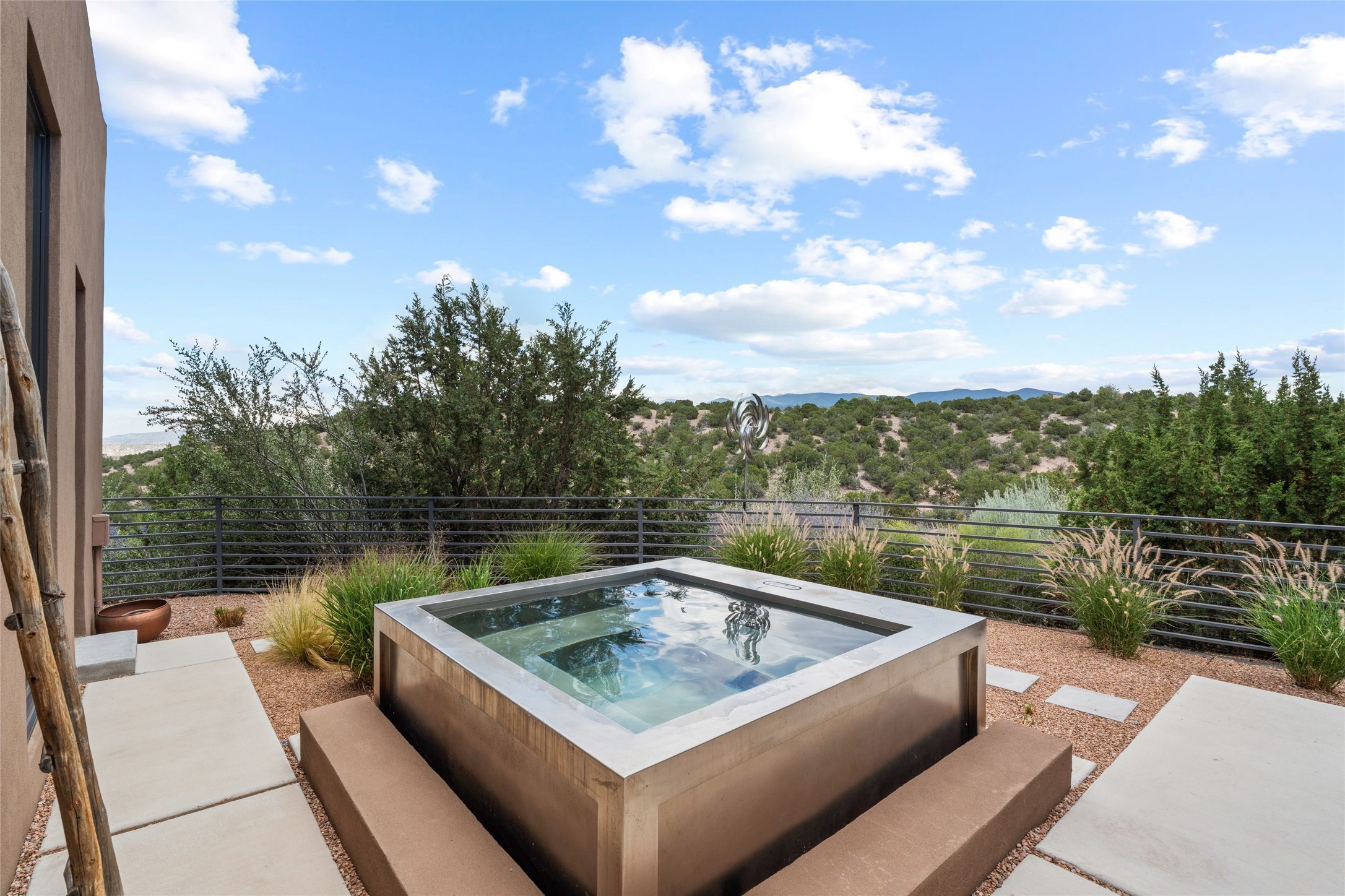 Welcome to the Opera House. Just a stones throw to the entrance to the world renowned Santa Fe Opera is this stunning soft contemporary home situated on a beautiful view lot that boasts expansive private views of the Sangre de Christo Mountain range and the Badlands to the north. This light filled home is a dream residence for the most discriminating Buyer. Top of the line quality abounds in every area from landscaping, custom rock retaining walls, and a stone drive way that greet your guests arrival. Extensive native plant landscaping compliments every entry for a dramatic effect. Custom outdoor kitchen is a entertaining dream plus a fully covered deck that faces the north east off both living areas. The home offers a split floor plan, each bedroom with their own ensuite bath and privacy. The 2 living areas have soaring floor to ceiling windows with unobstructed views. Top of the line appliances, cabinetry that grace the kitchen great room area for a spacious and relaxed environment. Custom hot tub, a bonus, overlooking the mountains and natural landscape and offering a starlit New Mexico sky for your evening relaxation. Impeccably maintained, one of a kind, this this property is a special offering.