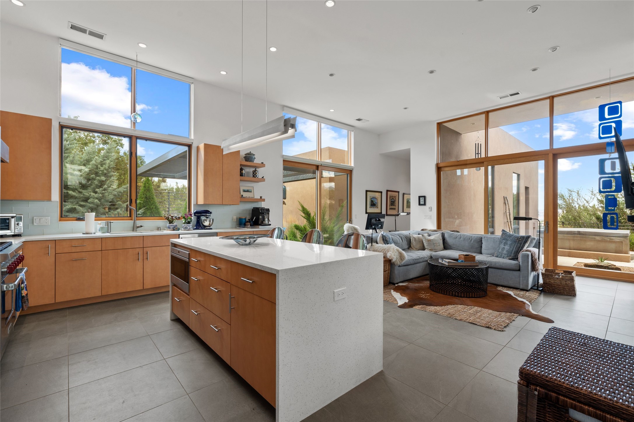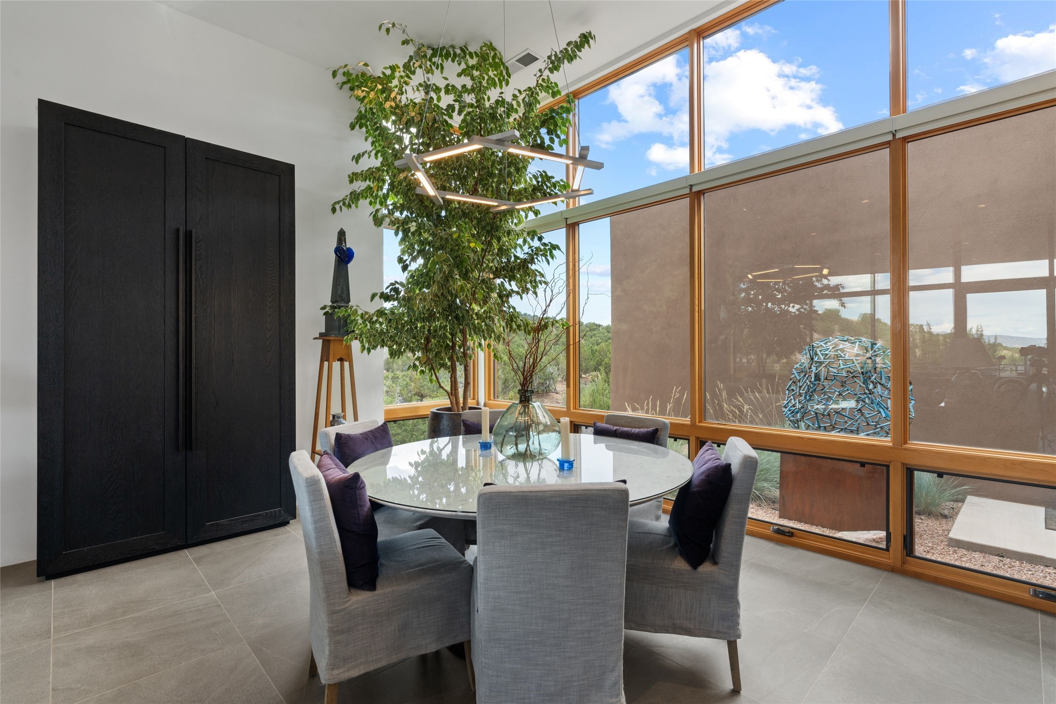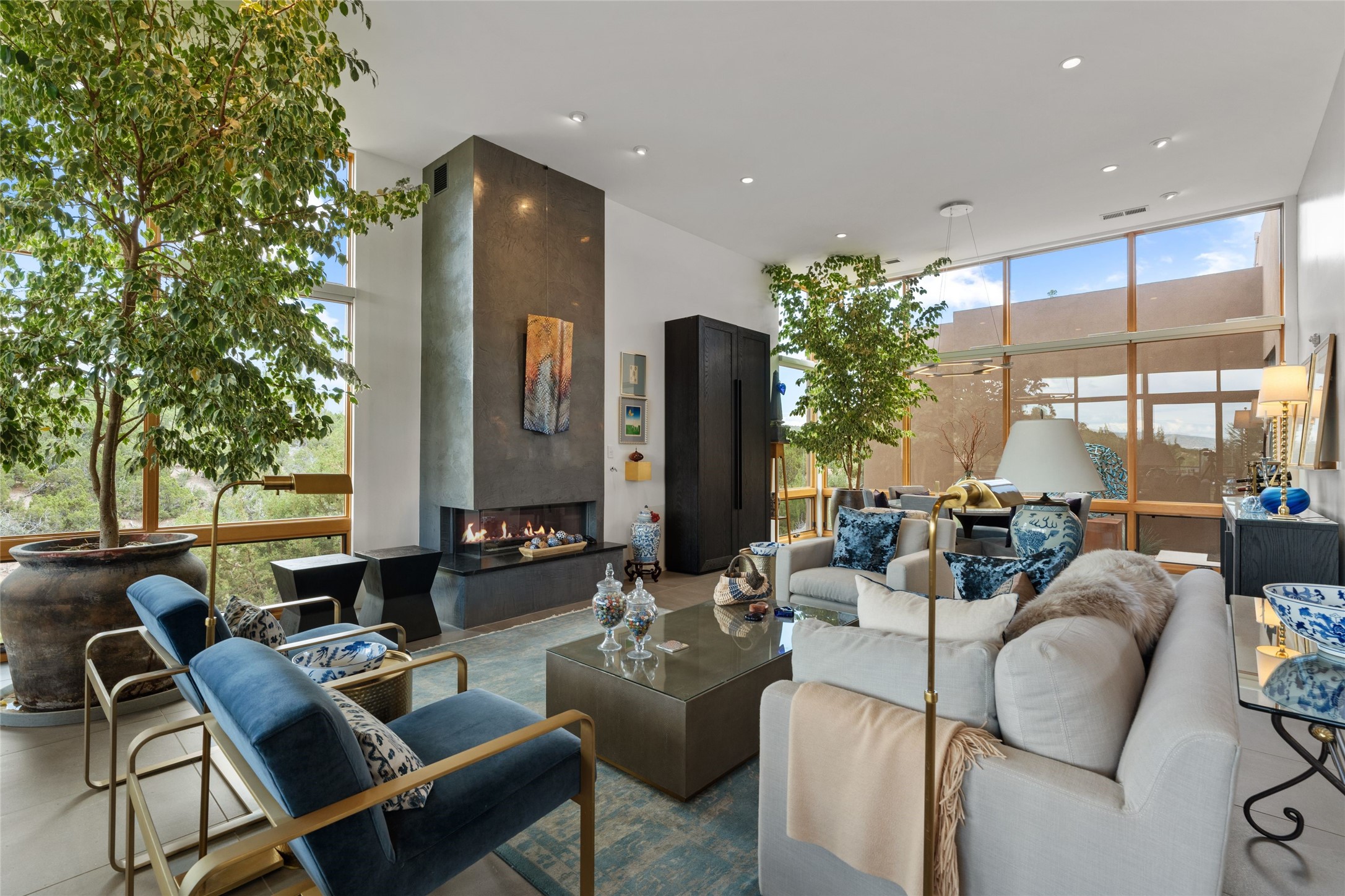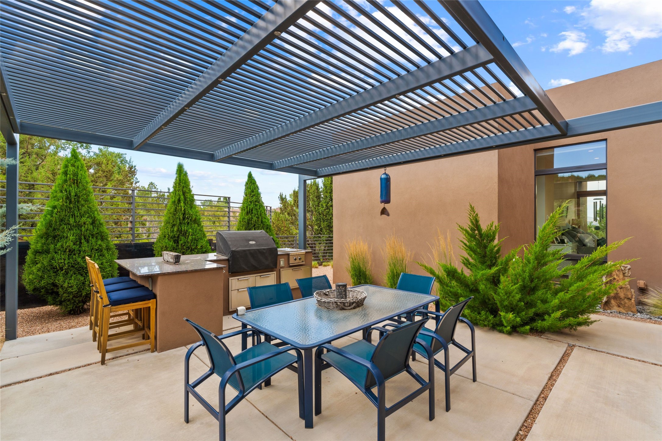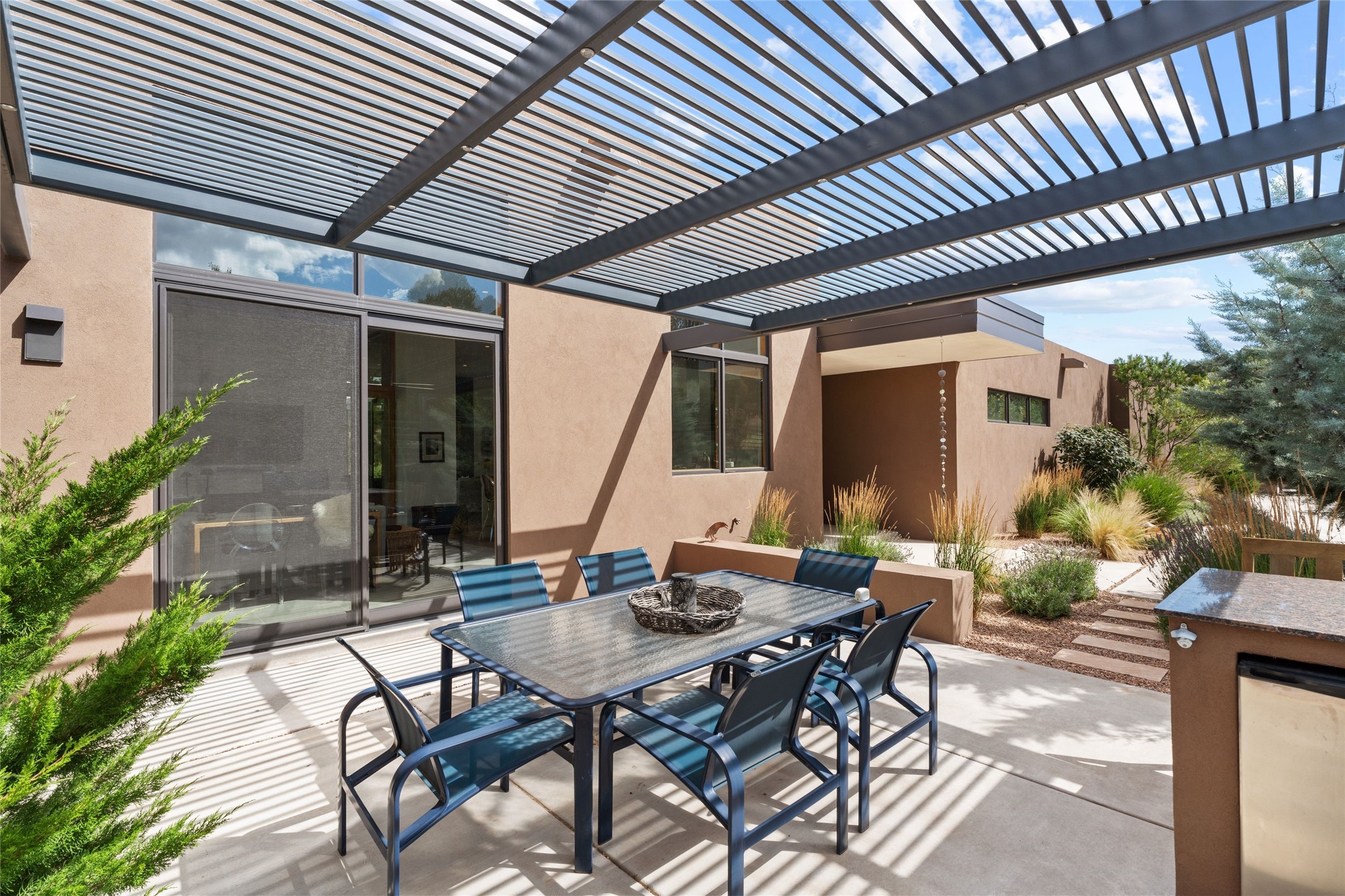 Welcome to the Opera House. Just a stones throw to the entrance to the world renowned Santa Fe Opera is this stunning soft contemporary home situated on a beautiful view lot that boasts expansive private views of the Sangre de Christo Mountain range and the Badlands to the north. This light filled home is a dream residence for the most discriminating Buyer. Top of the line quality abounds in every area from landscaping, custom rock retaining walls, and a stone drive way that greet your guests arrival. Extensive native plant landscaping compliments every entry for a dramatic effect. Custom outdoor kitchen is a entertaining dream plus a fully covered deck that faces the north east off both living areas. The home offers a split floor plan, each bedroom with their own ensuite bath and privacy. The 2 living areas have soaring floor to ceiling windows with unobstructed views. Top of the line appliances, cabinetry that grace the kitchen great room area for a spacious and relaxed environment. Custom hot tub, a bonus, overlooking the mountains and natural landscape and offering a starlit New Mexico sky for your evening relaxation. Impeccably maintained, one of a kind, this this property is a special offering.